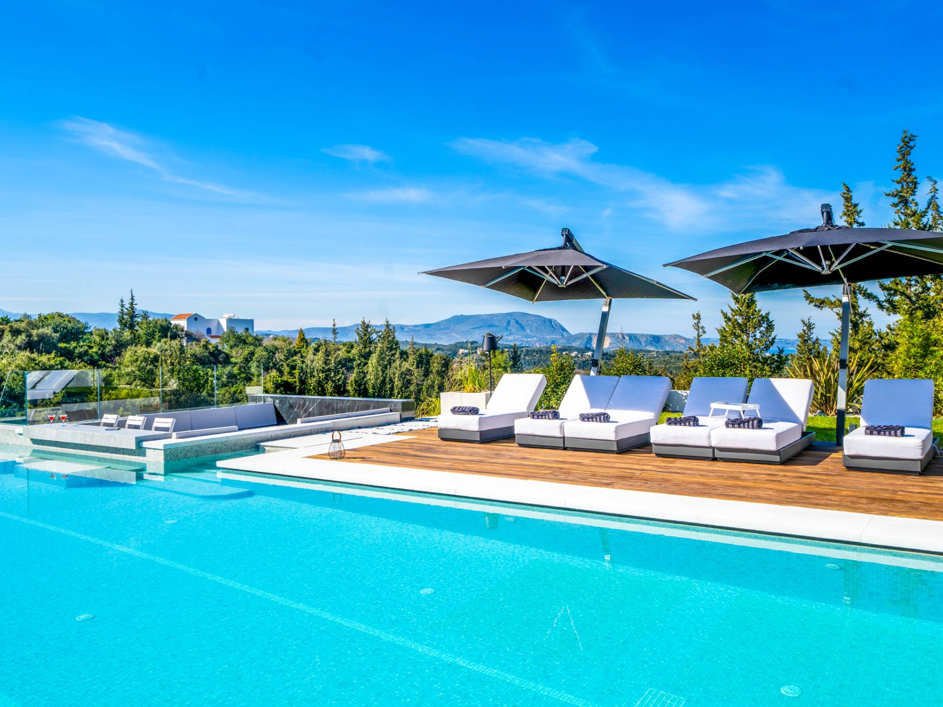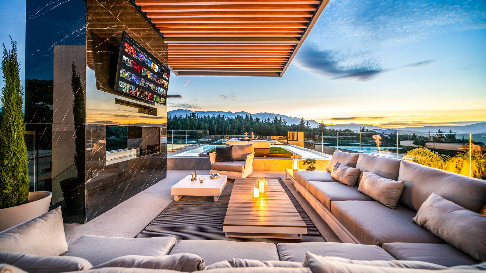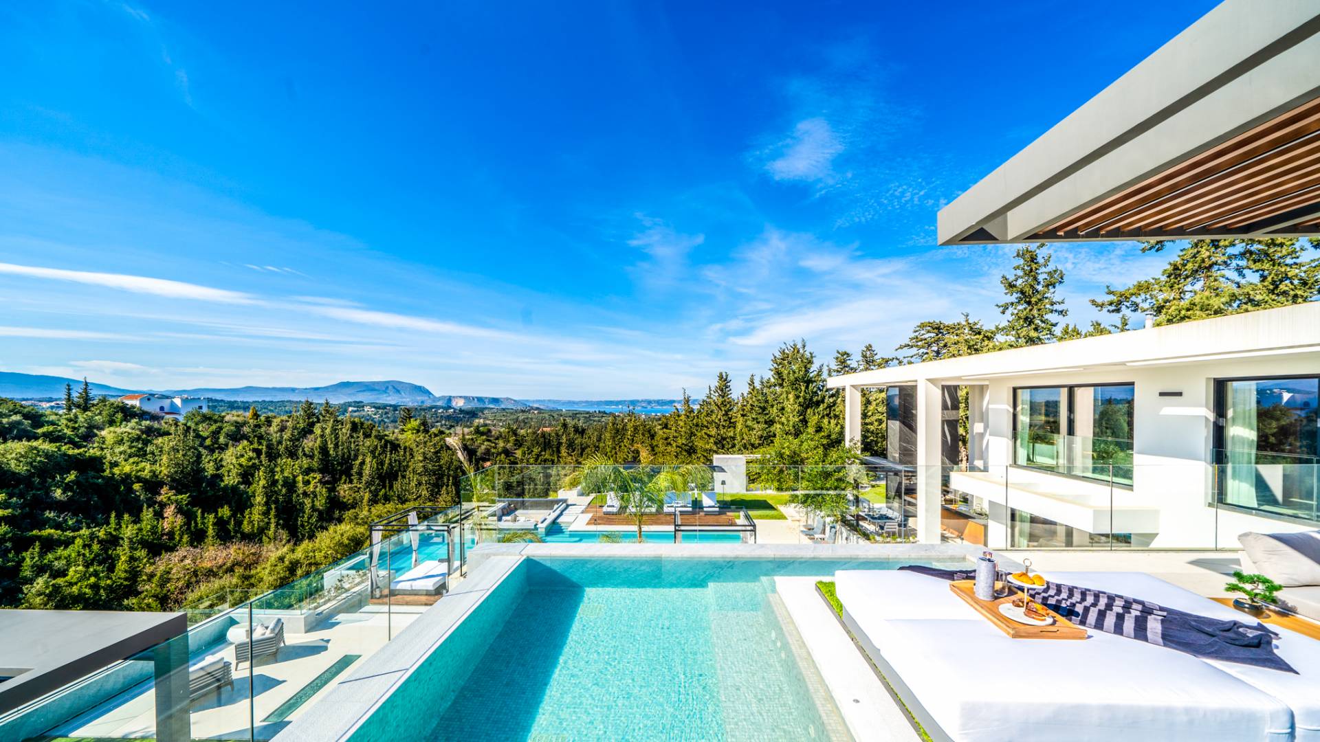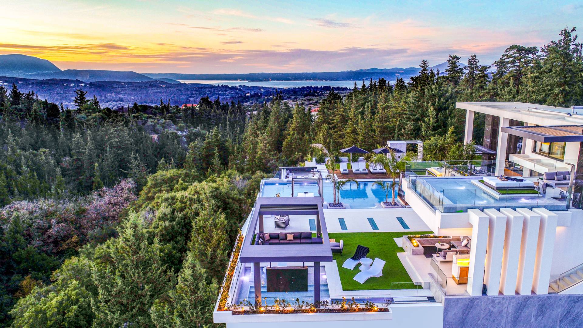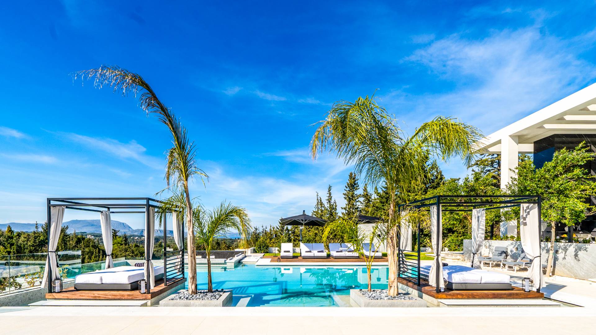Außen: Die One Villa verfügt über eine Vielzahl großzügiger Terrassen, auf denen die Gäste speisen, faulenzen, sich sonnen und den sensationellen Blick auf das Meer und die Landschaft genießen können.