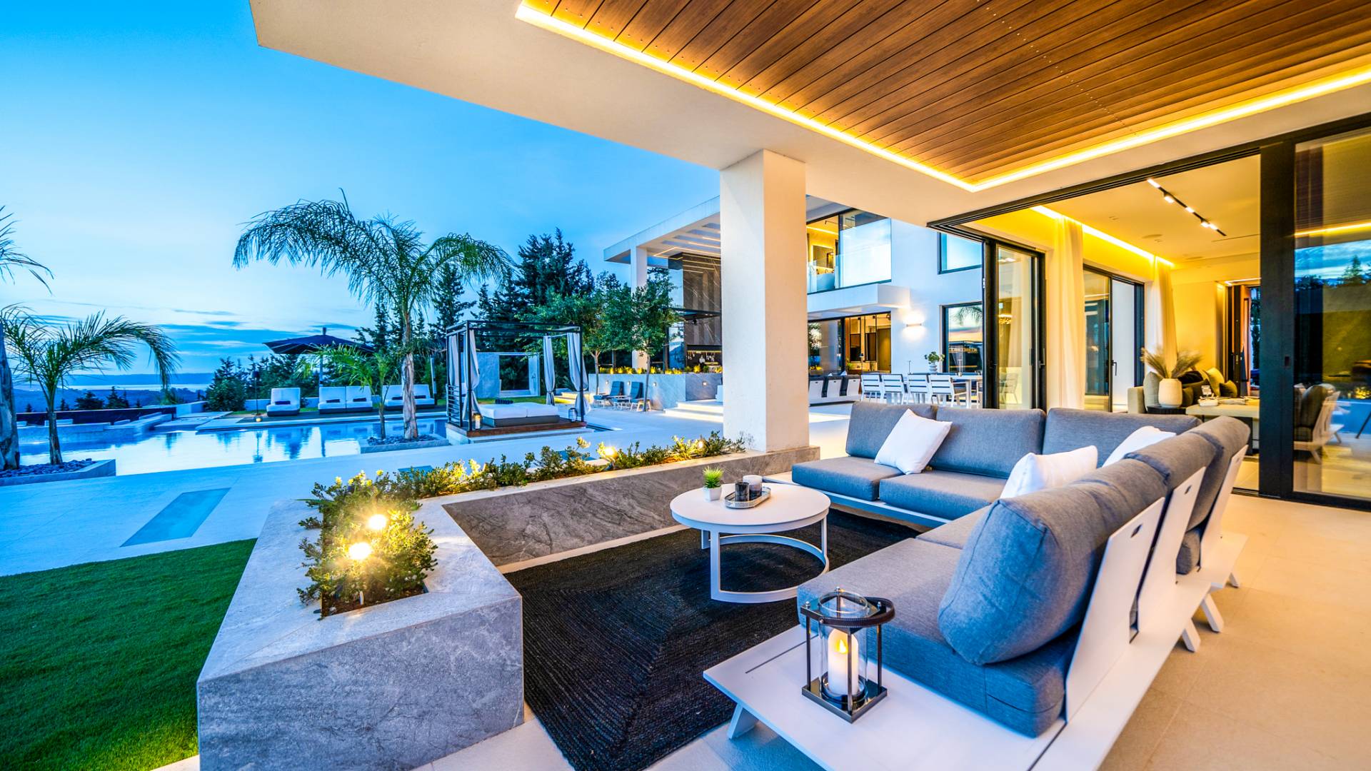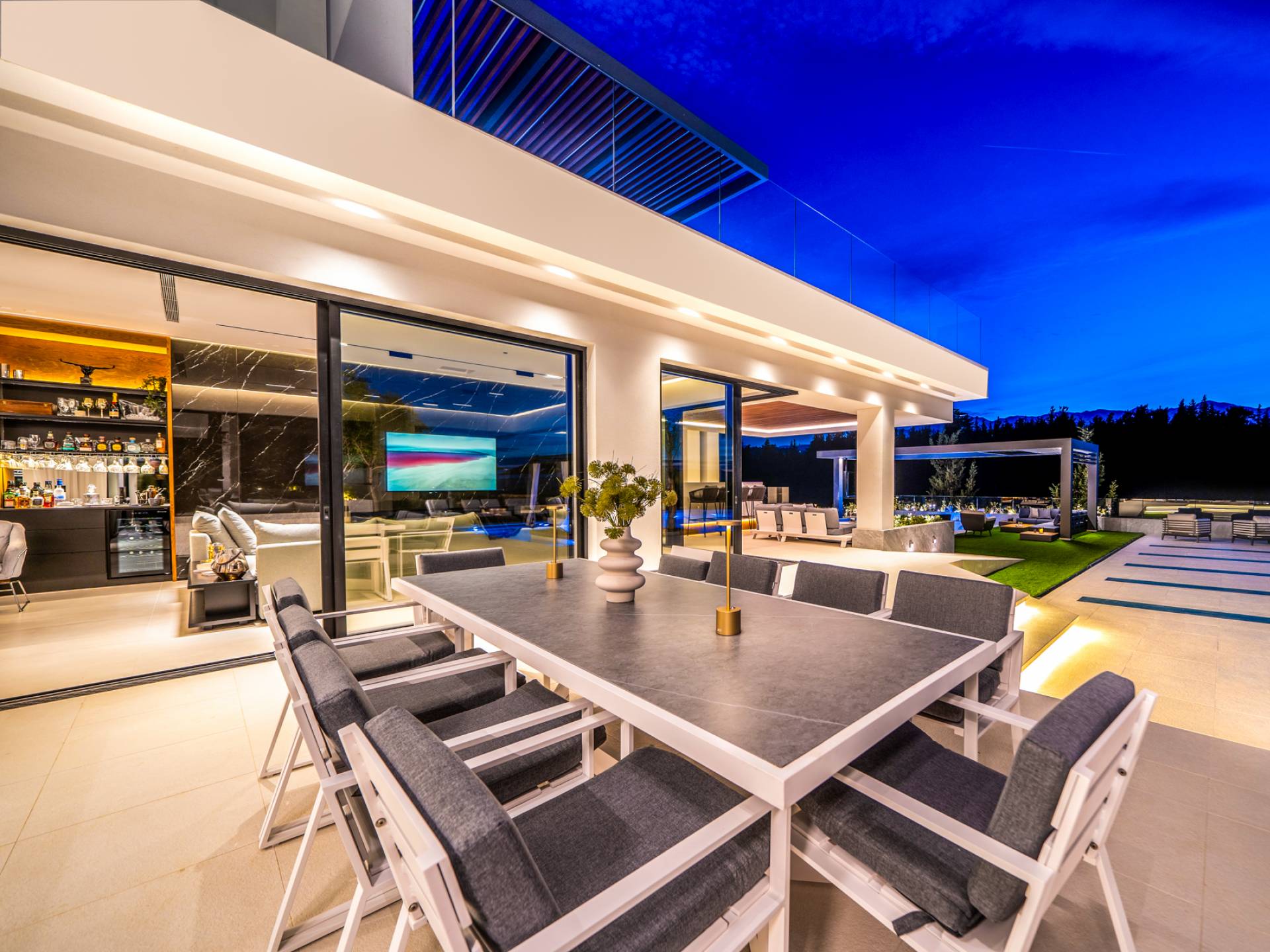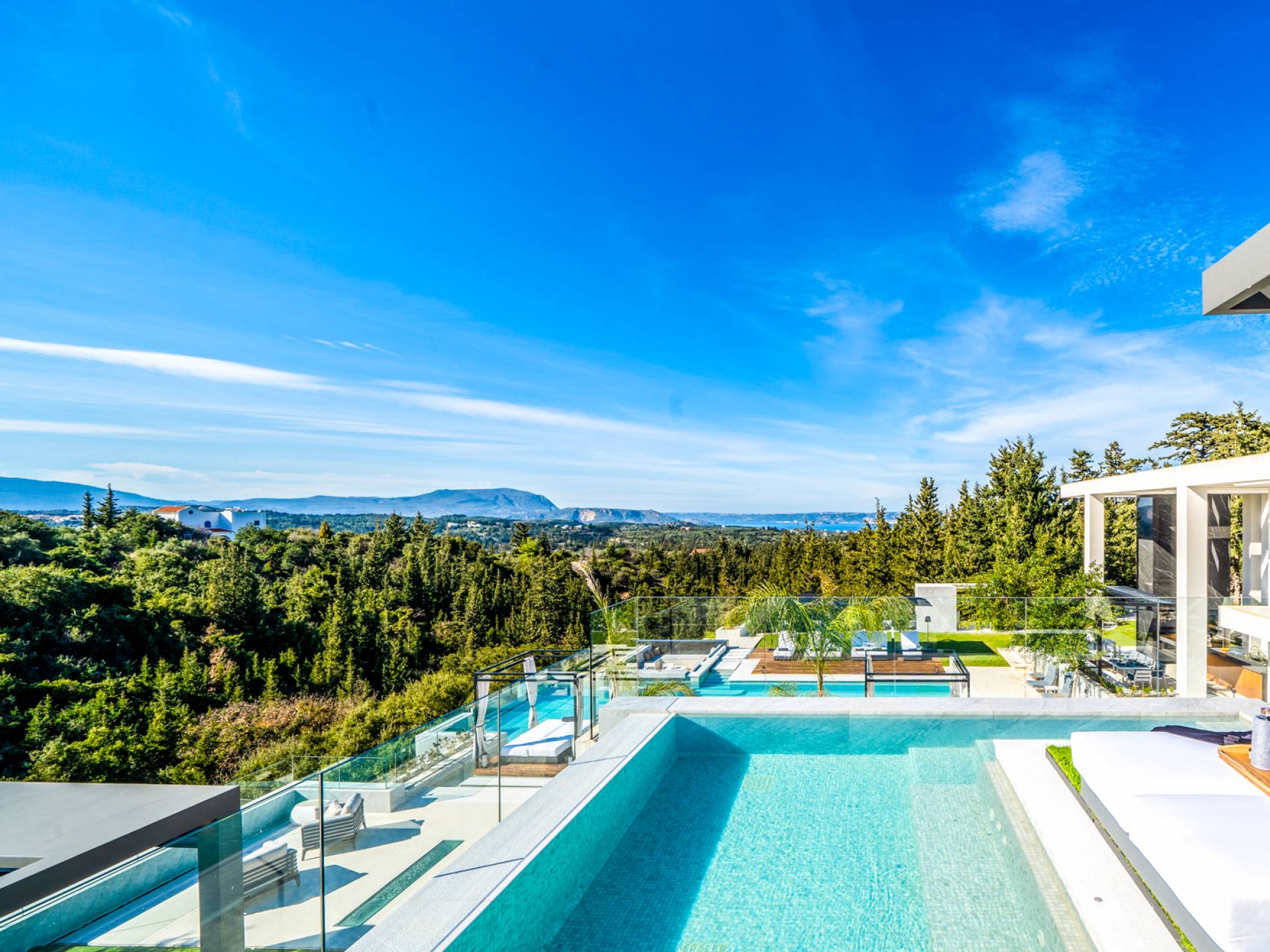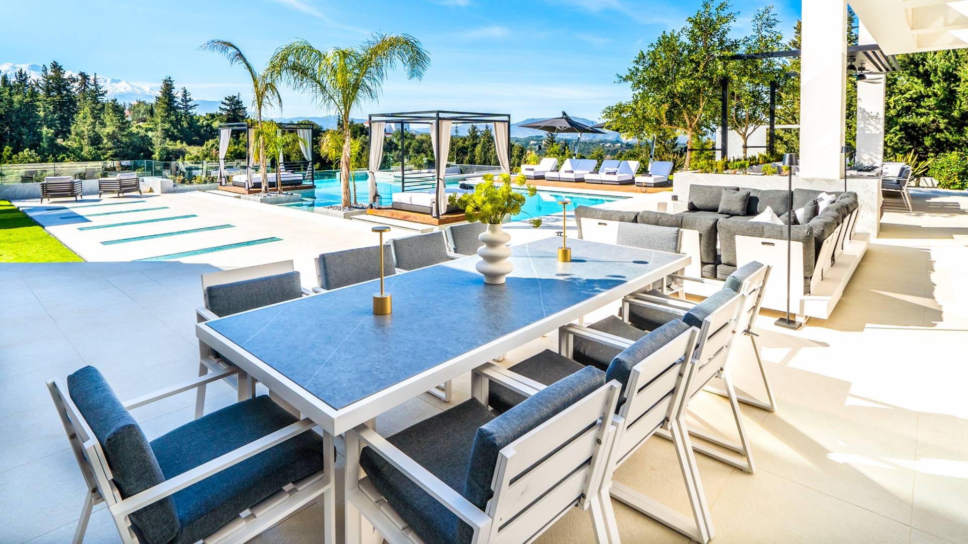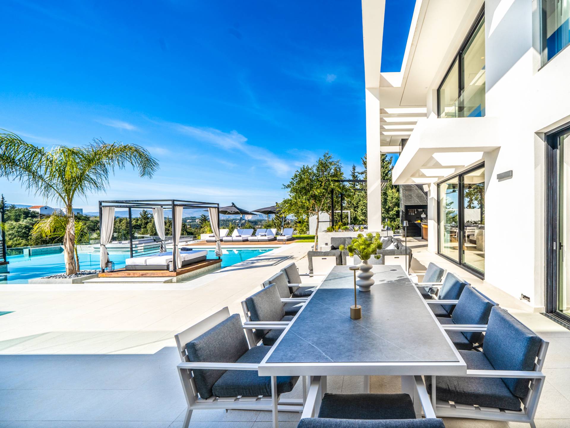 Außen: Die One Villa verfügt über eine Vielzahl großzügiger Terrassen, auf denen die Gäste speisen, faulenzen, sich sonnen und den sensationellen Blick auf das Meer und die Landschaft genießen können.
