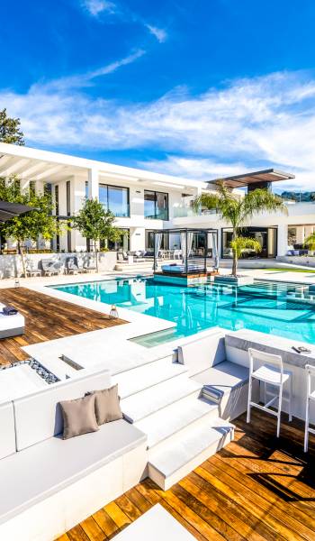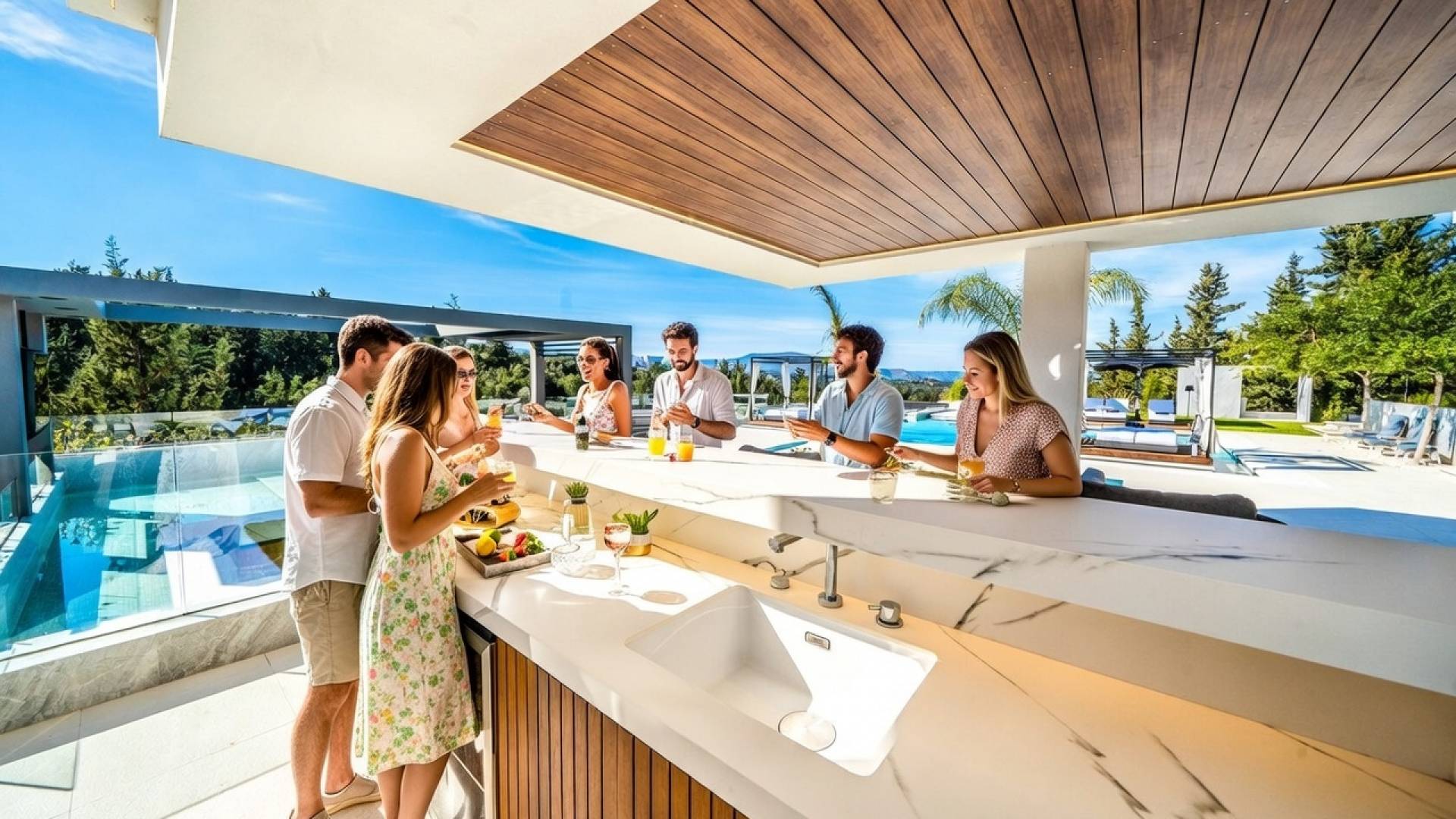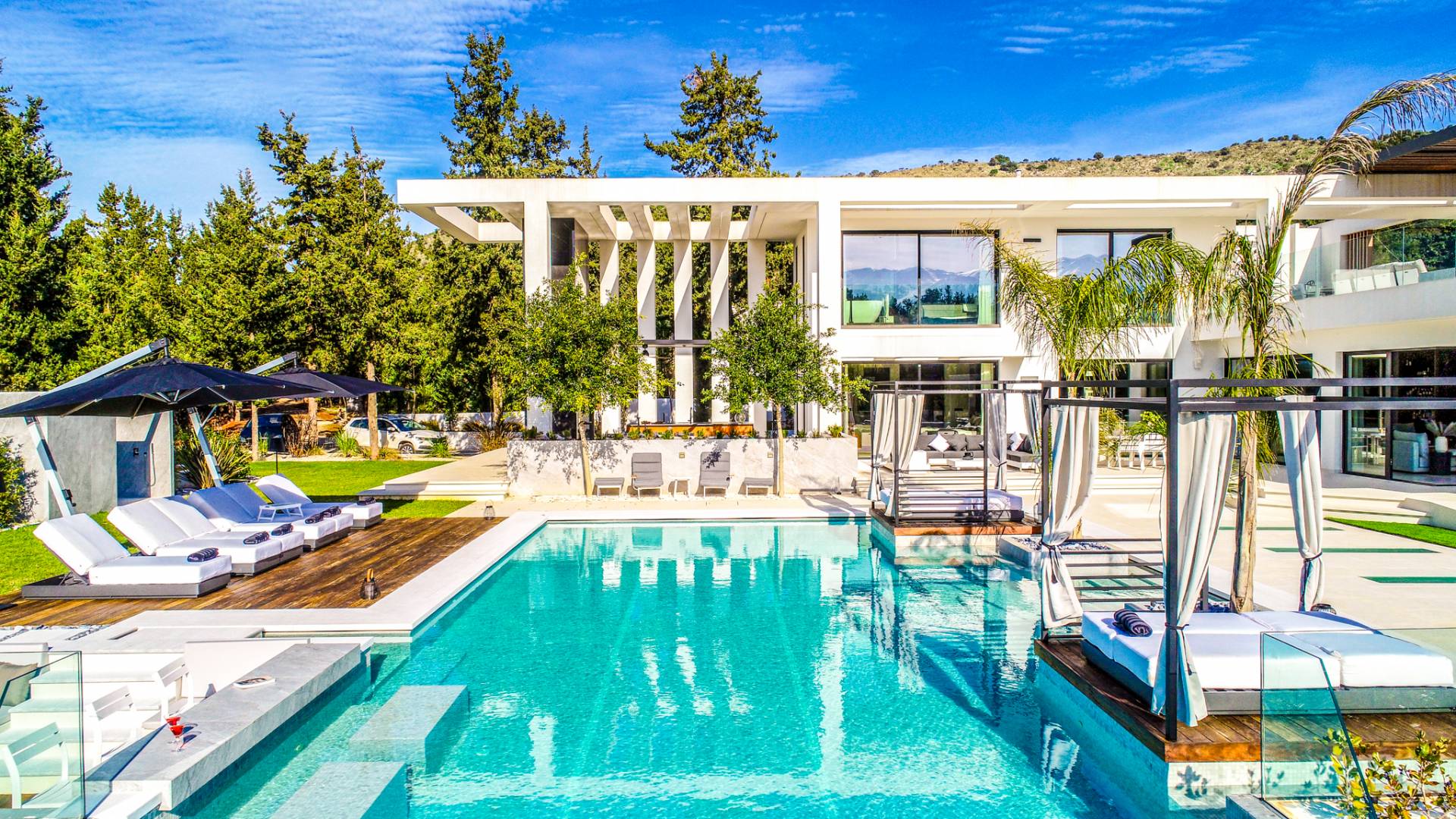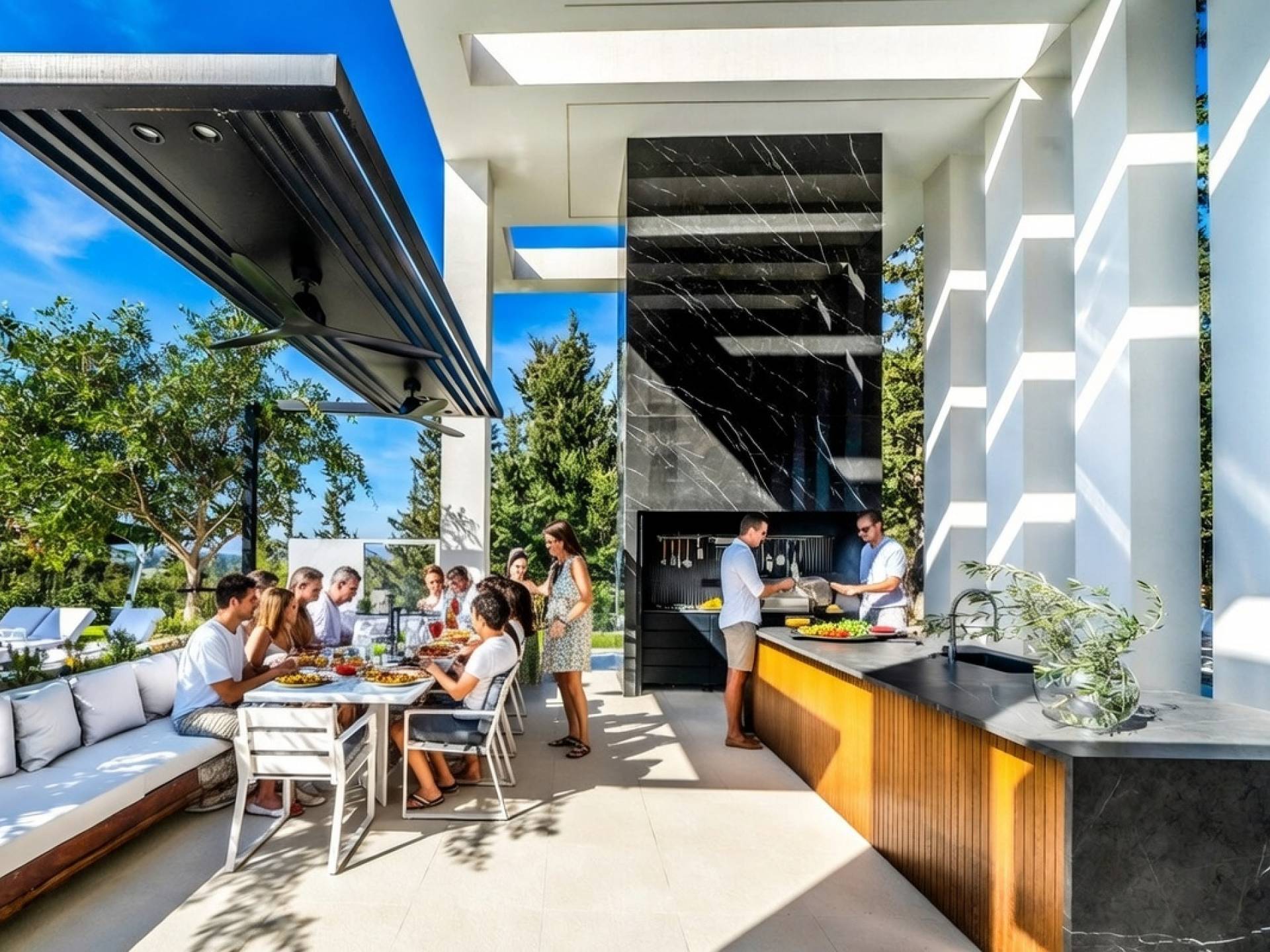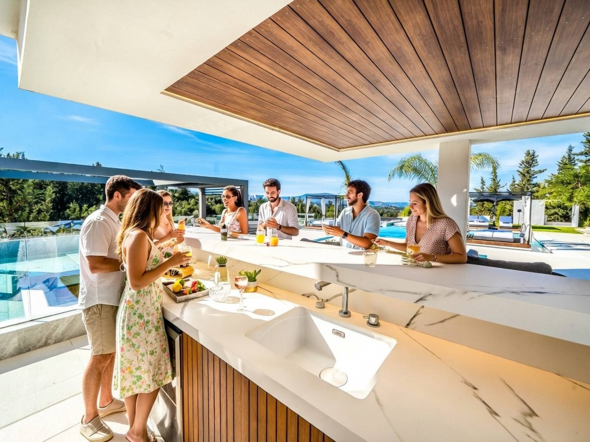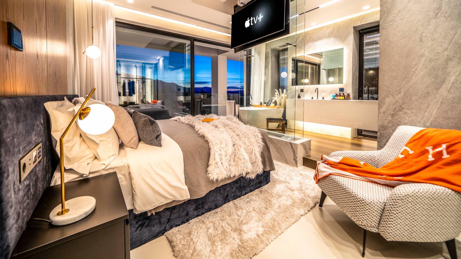 Diese exquisite Unterkunft auf 3 Ebenen verkörpert die Essenz stilvollen Wohnens und verfügt über 3 luxuriöse Schlafzimmer mit eigenem Bad sowie 3 Swimmingpools mit Whirlpool und Heimkino im Freien und sorgt für einen unvergesslichen Aufenthalt für bis zu 6 Gäste. Die Annehmlichkeiten der Luxusmiete decken selbst den anspruchsvollsten Besucher ab und bieten allen Komfort, den man von einer modernen Luxusresidenz erwarten würde, und noch mehr. Alles wurde entworfen und gefertigt, um Ihnen ein luxuriöses und unvergessliches Aufenthaltserlebnis zu bieten.