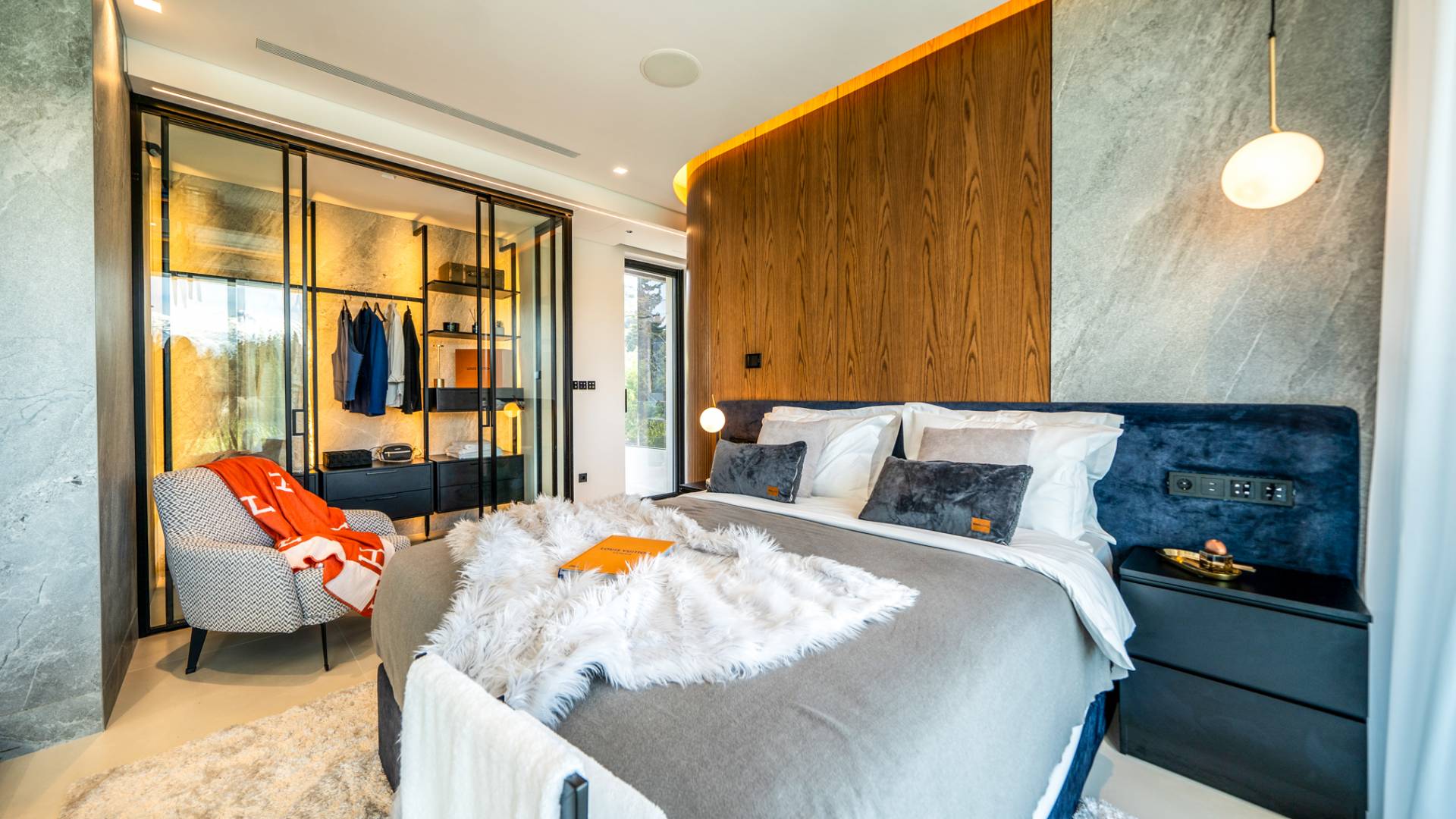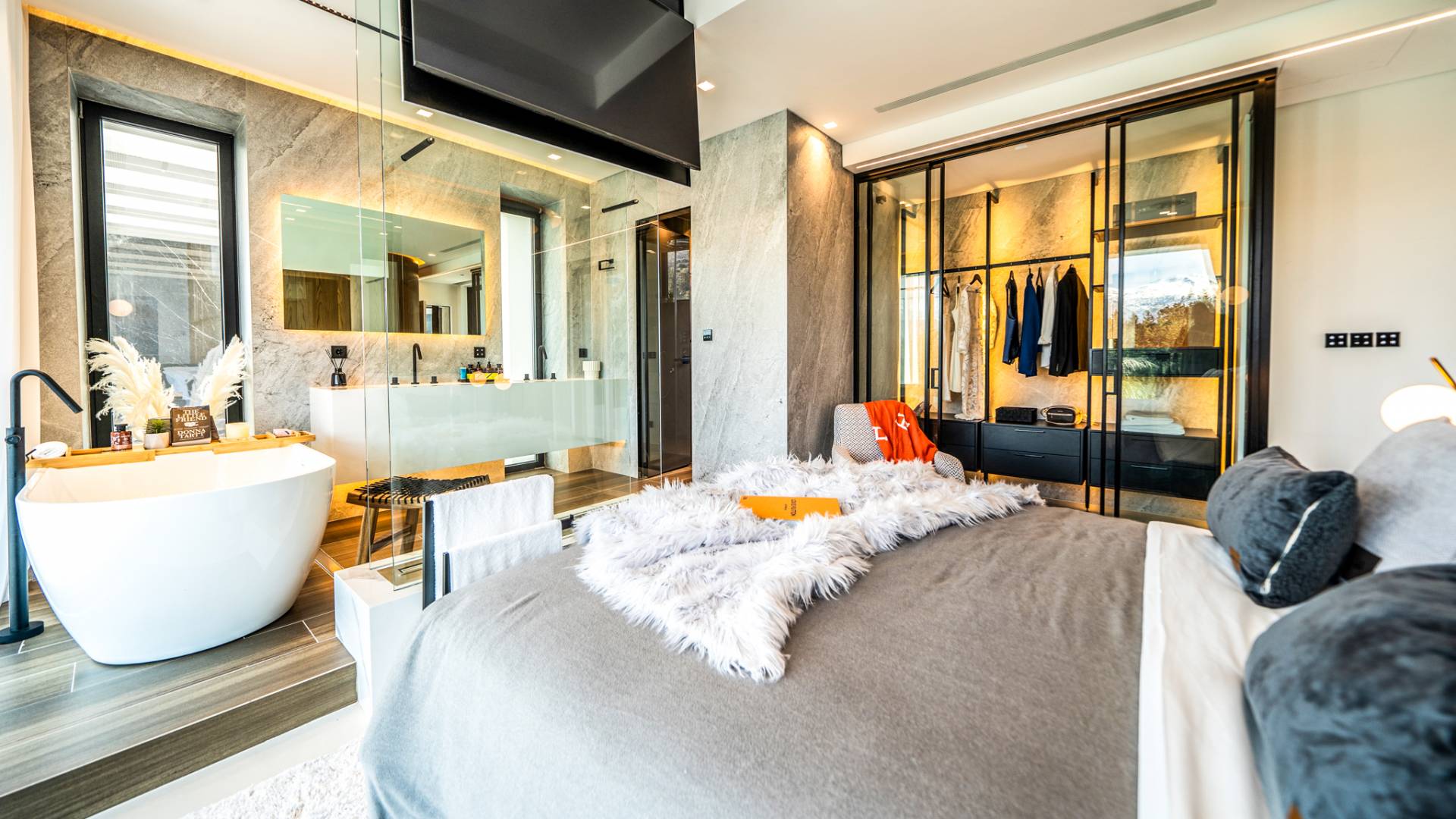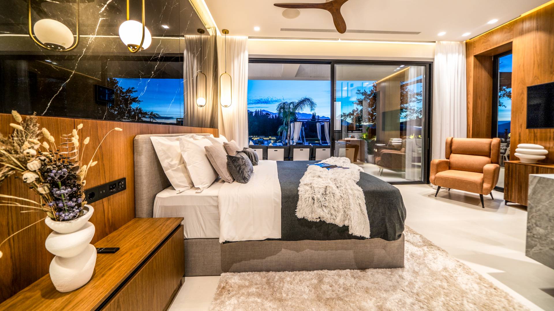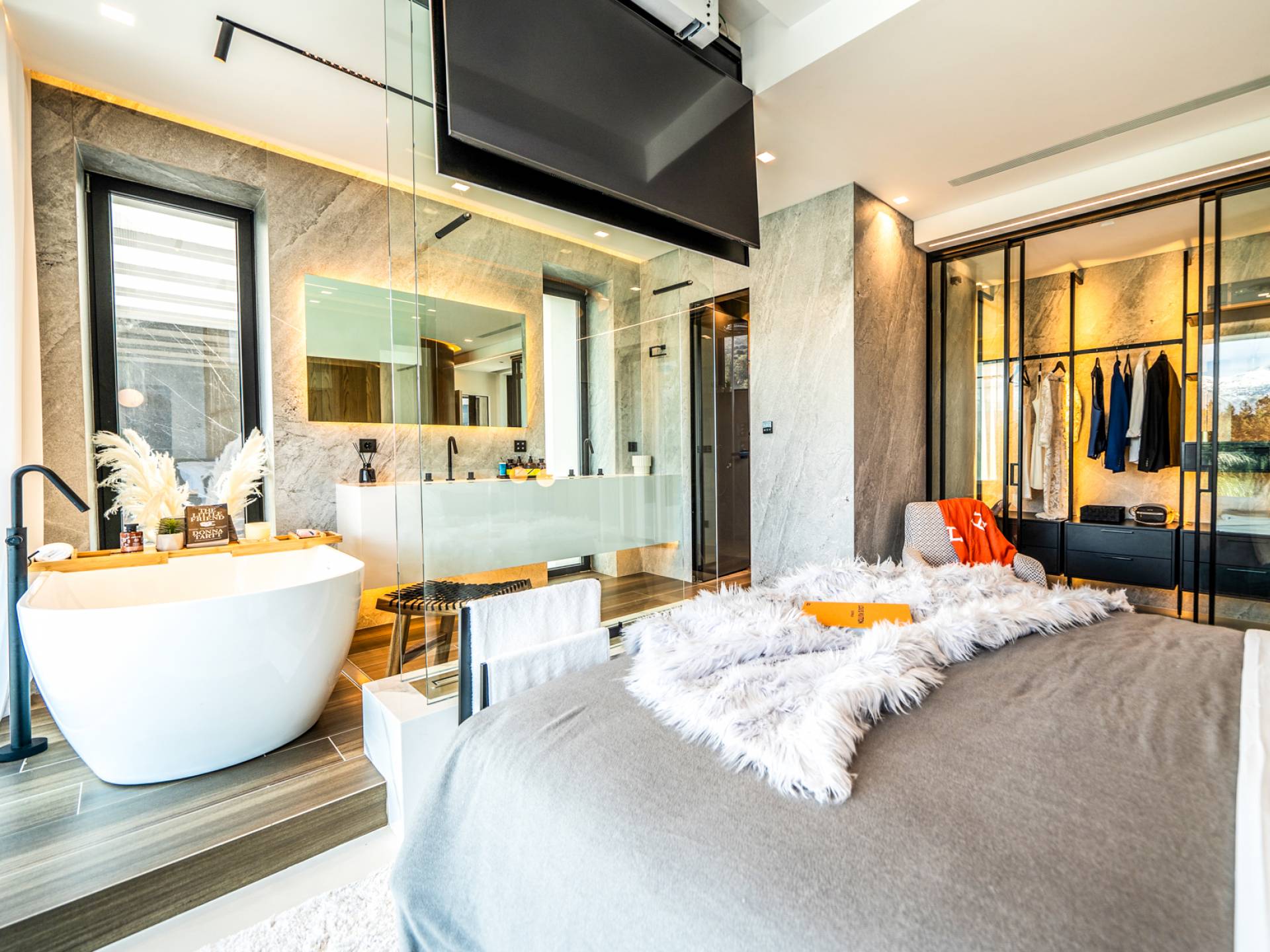 In einer Atmosphäre von Luxus und Entspannung, die Ihnen einen perfekten Urlaub garantiert, bietet die Villa Platz für bis zu 6 Personen in 3 eleganten Zimmern, die alle mit Geschmack und Liebe zum Detail eingerichtet und mit einem eigenen Badezimmer mit Dusche ausgestattet sind. ein Smart-TV und große Fenster mit herrlichem Blick auf die Natur rund um die Villa und die Pools. Der 135 m² große Balkon führt zu einem privaten Pool-Whirlpool mit freiem Blick auf das Meer.