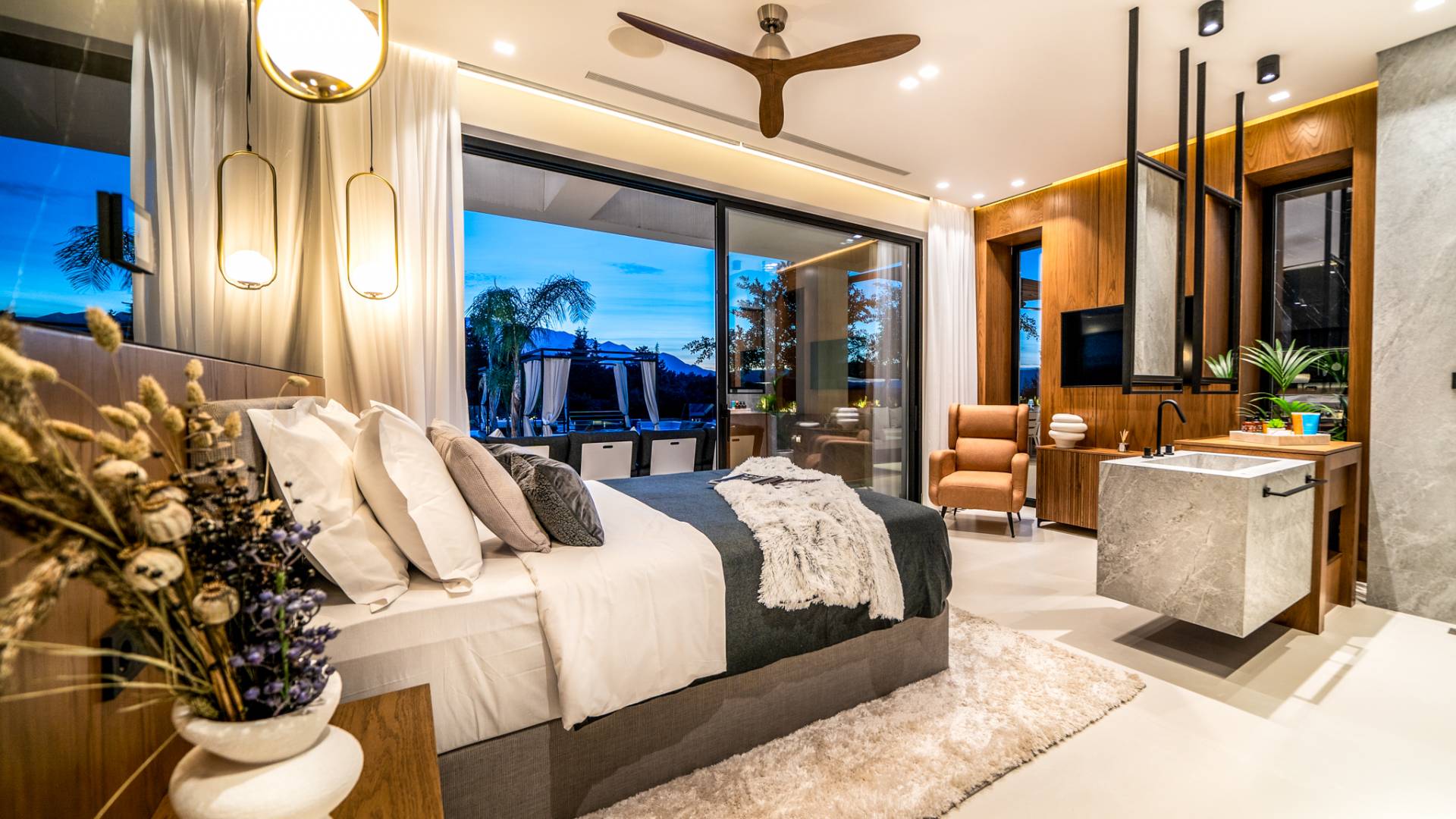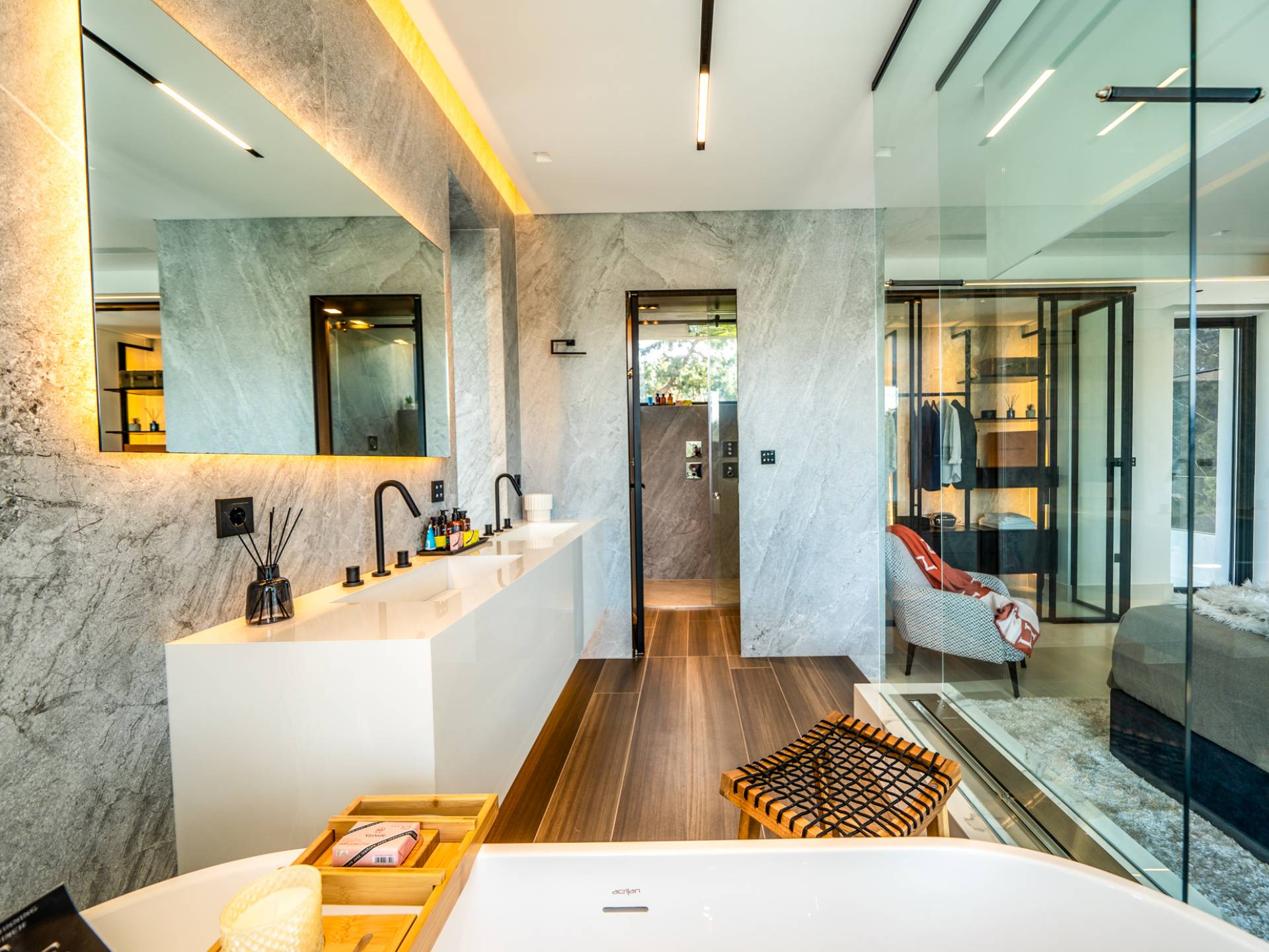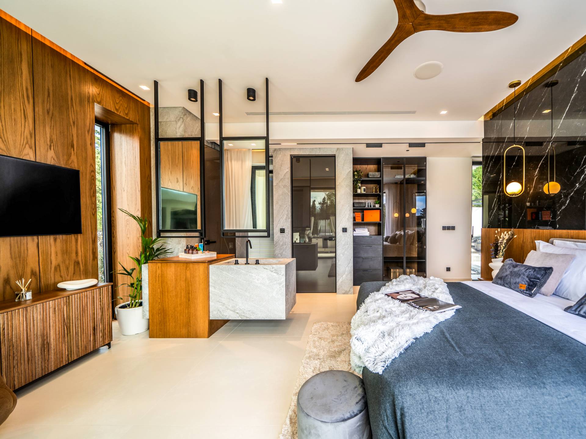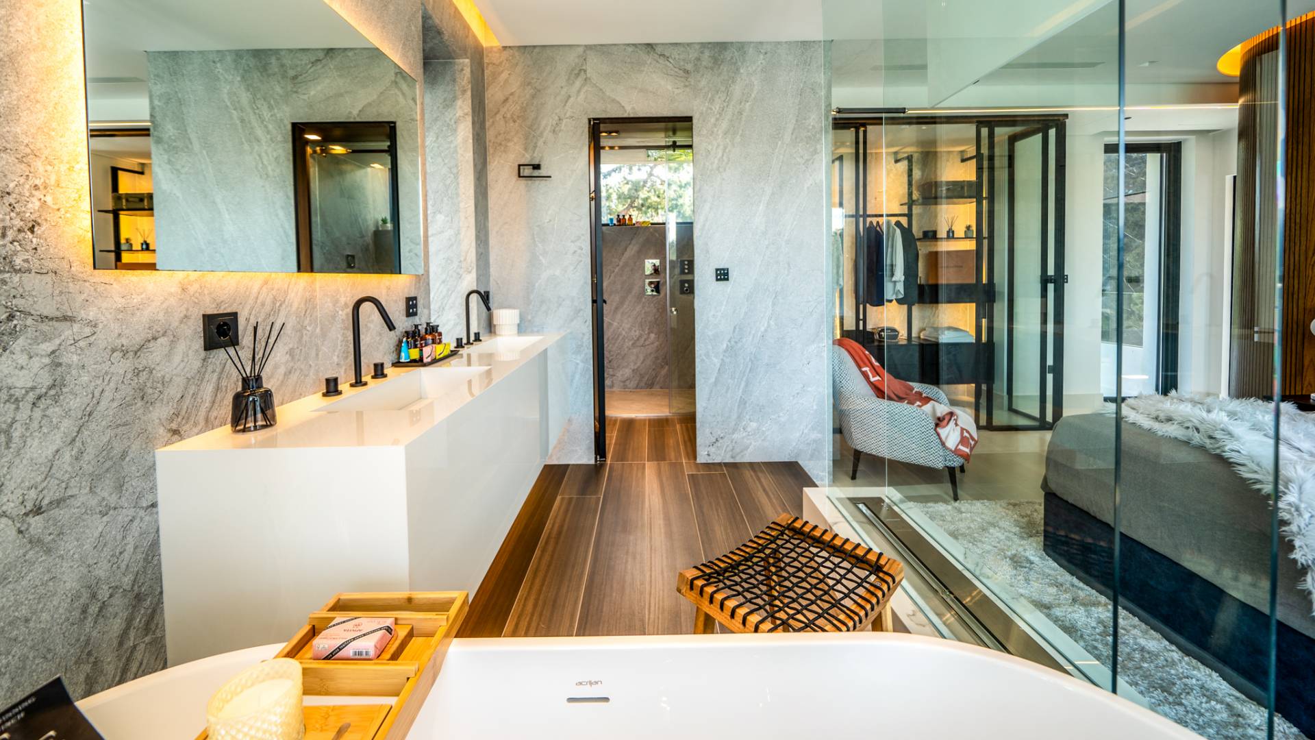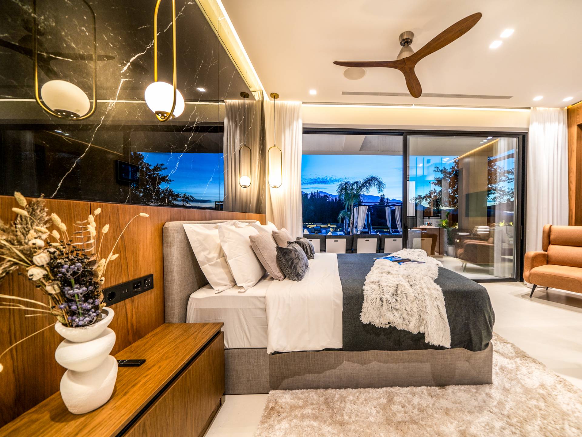 Wenn Sie ins Haus gehen, können Sie die erdigen Farben, die breiten Glastüren und -fenster und das moderne Dekor erleben, das sich in die Villa einfügt und eine beruhigende Umgebung schafft, die einen schönen Kontrast zum strahlenden Azurblau und den üppigen Grüntönen der Gegend bildet.