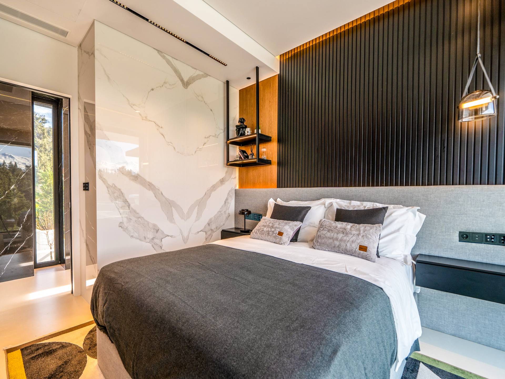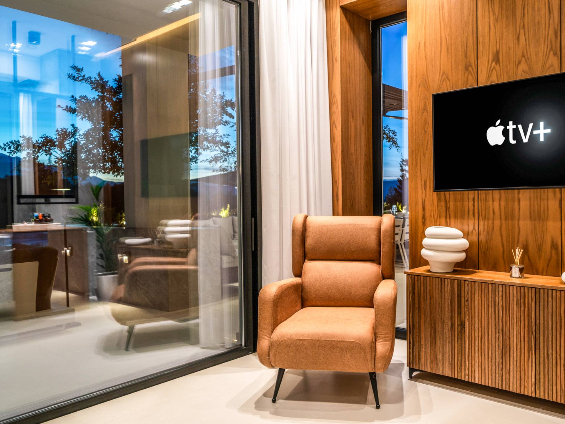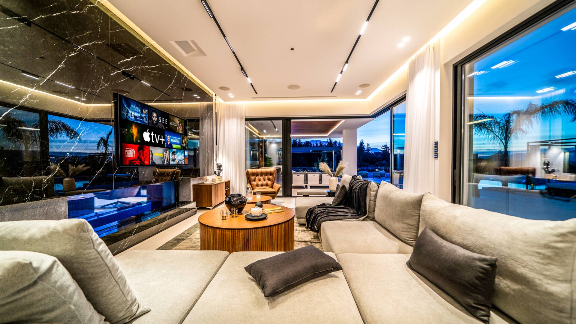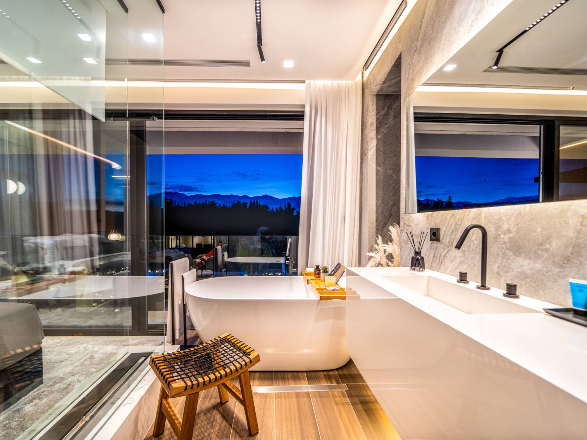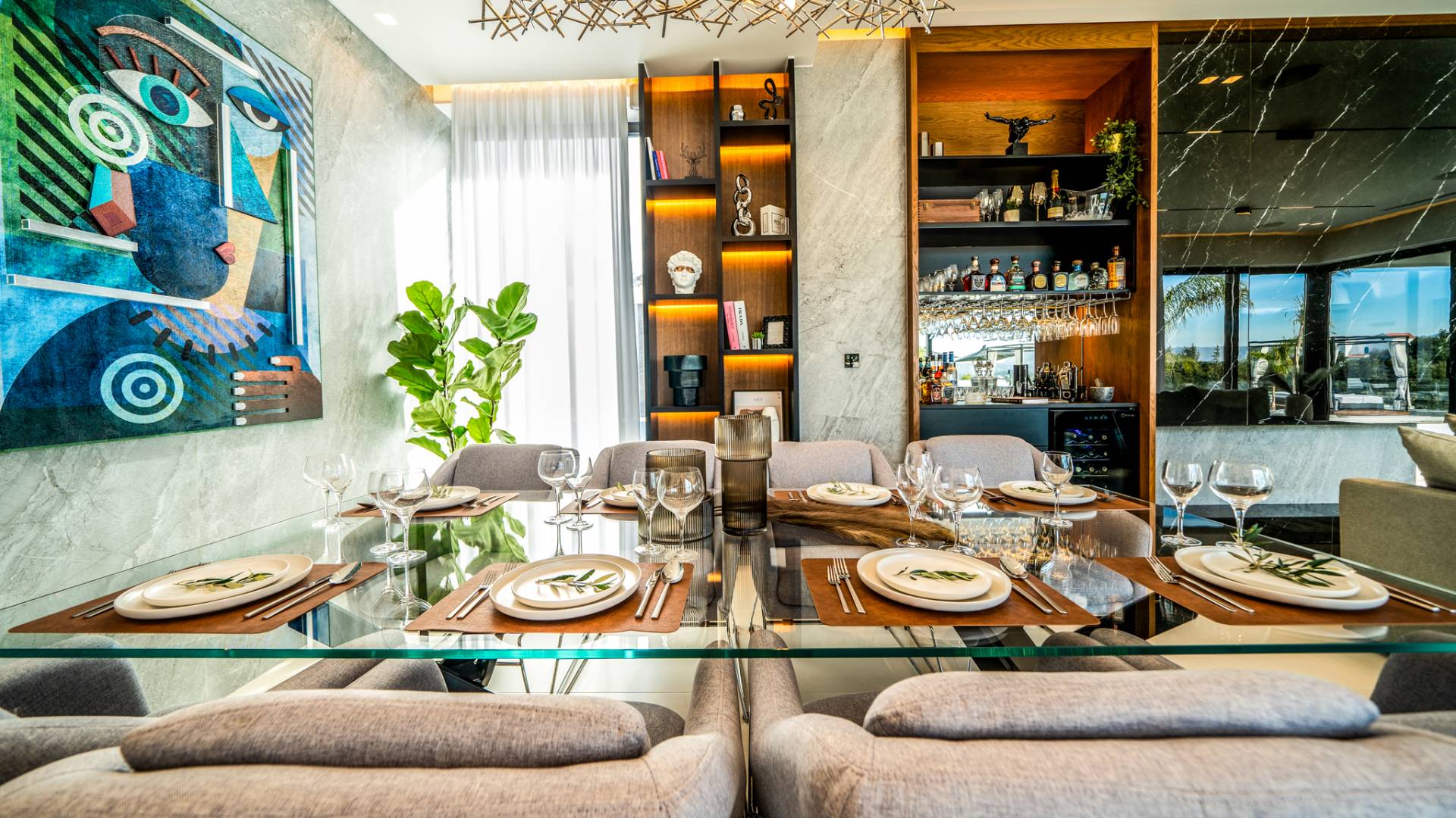 Wenn Sie ins Haus gehen, können Sie die erdigen Farben, die breiten Glastüren und -fenster und das moderne Dekor erleben, das sich in die Villa einfügt und eine beruhigende Umgebung schafft, die einen schönen Kontrast zum strahlenden Azurblau und den üppigen Grüntönen der Gegend bildet.