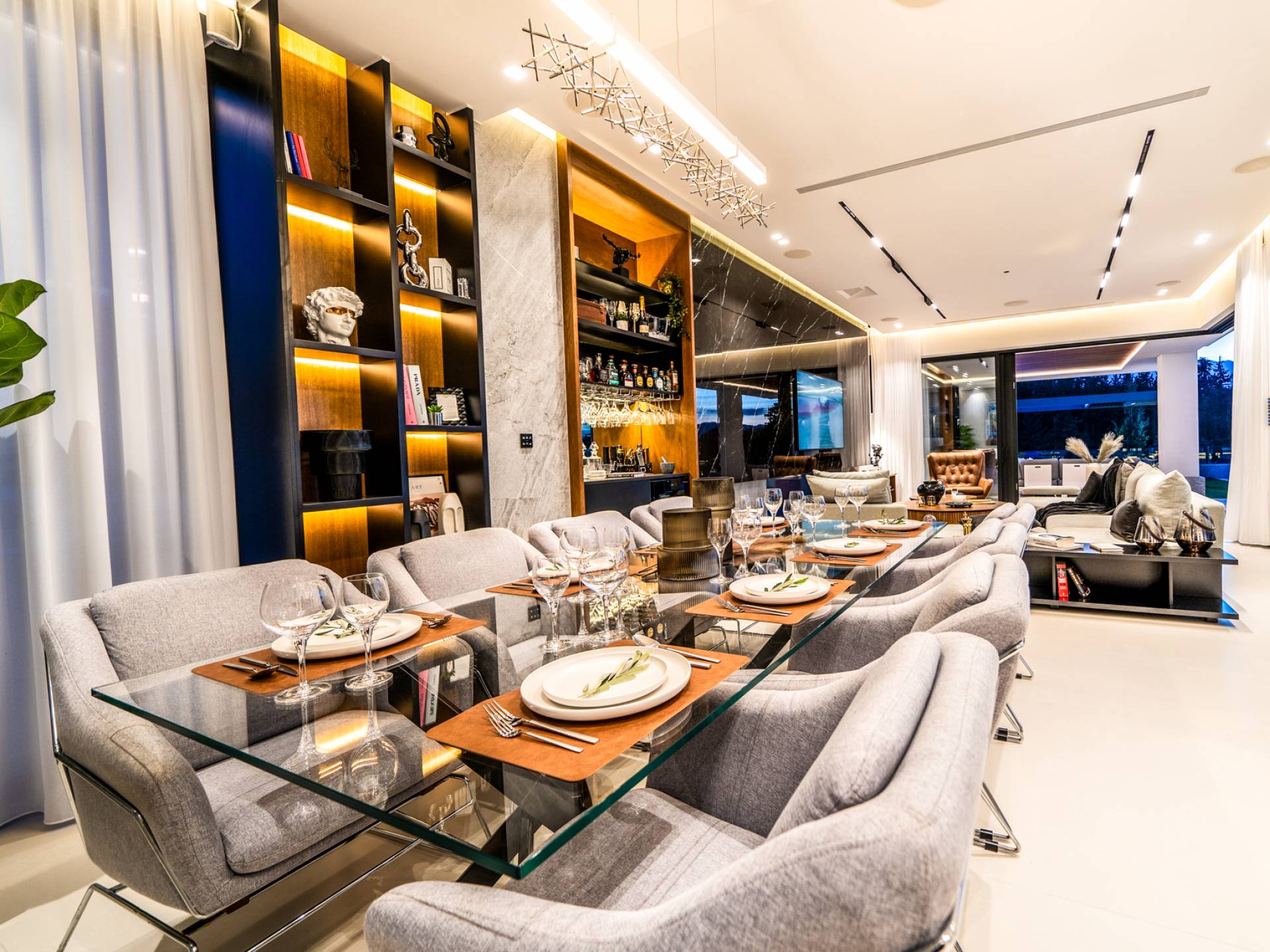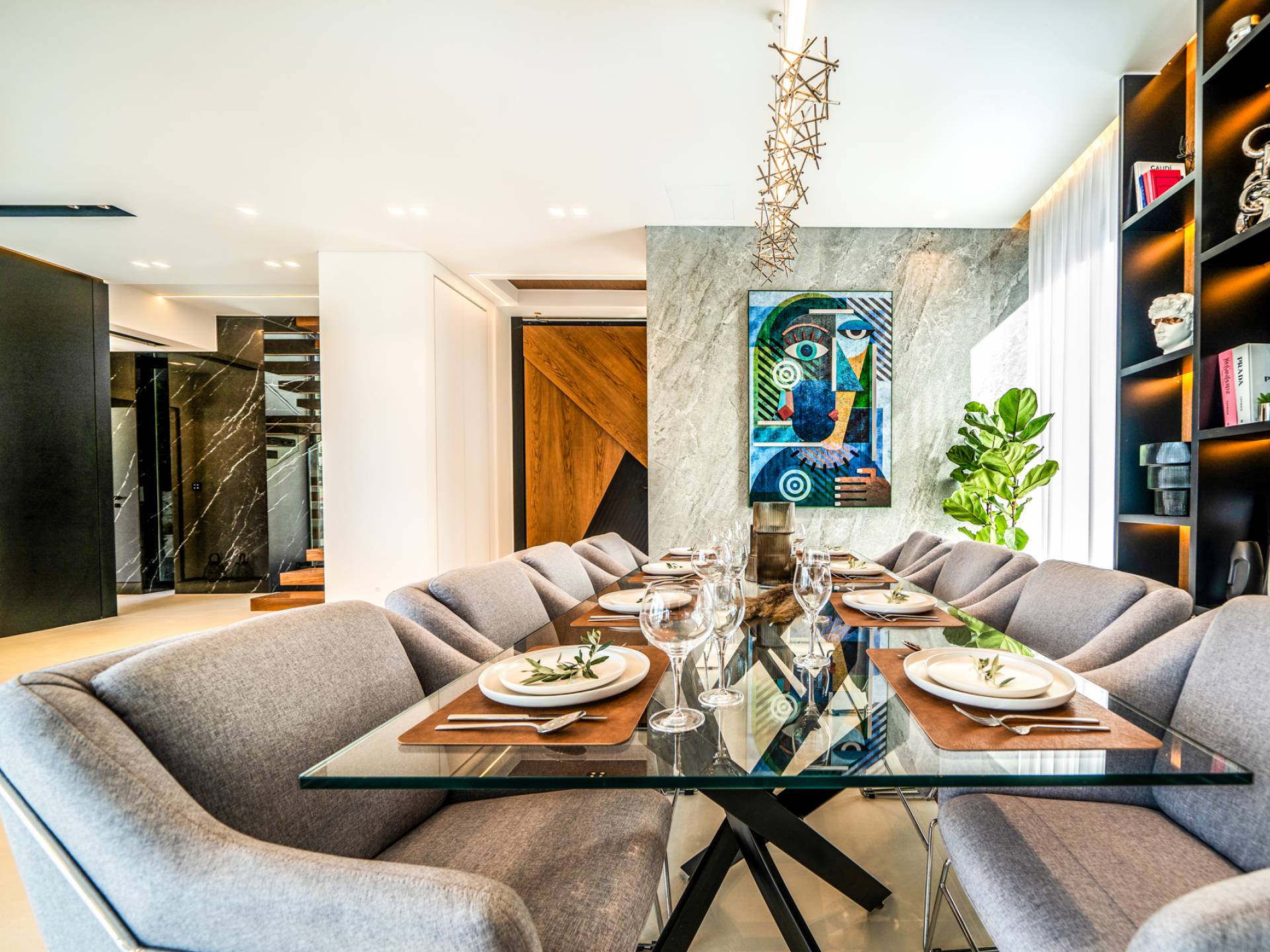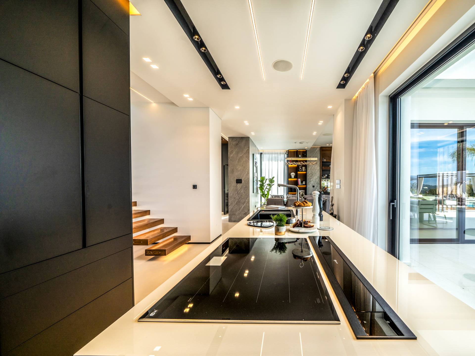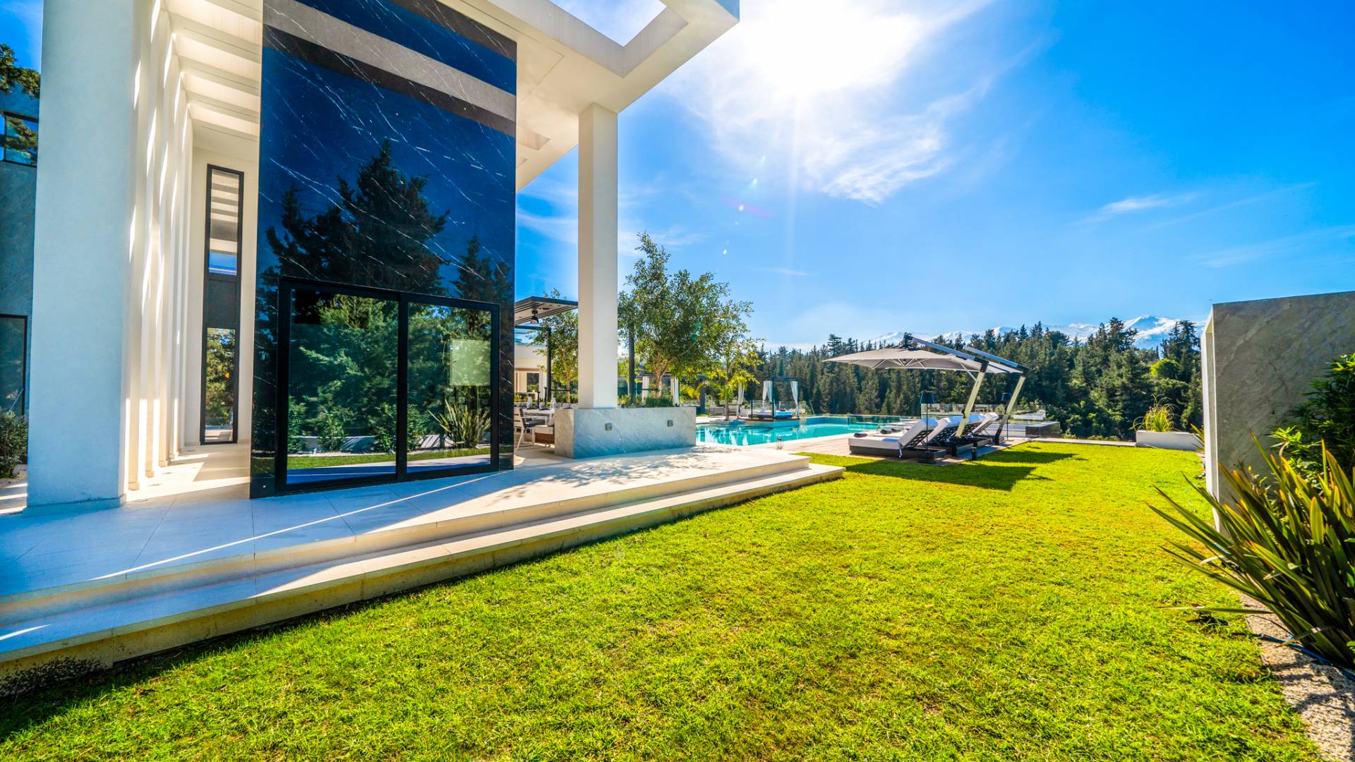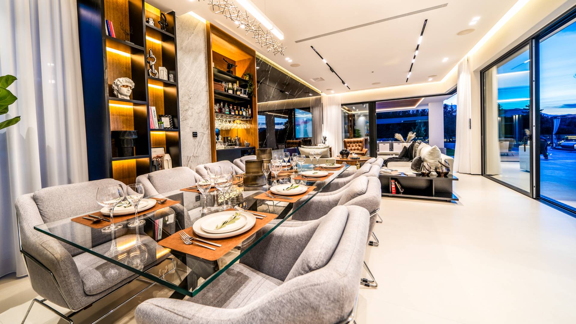 Wenn Sie ins Haus gehen, können Sie die erdigen Farben, die breiten Glastüren und -fenster und das moderne Dekor erleben, das sich in die Villa einfügt und eine beruhigende Umgebung schafft, die einen schönen Kontrast zum strahlenden Azurblau und den üppigen Grüntönen der Gegend bildet.
