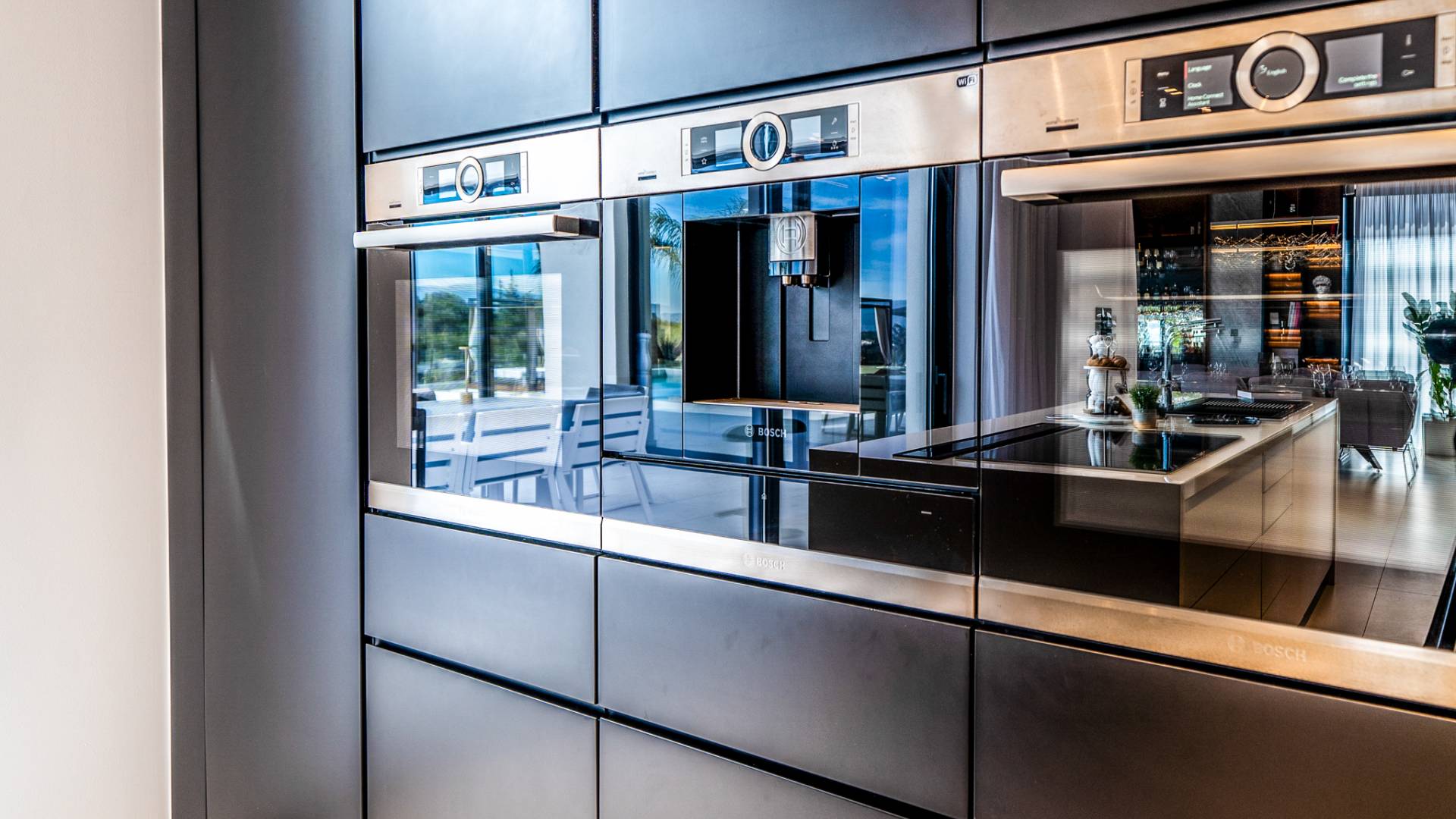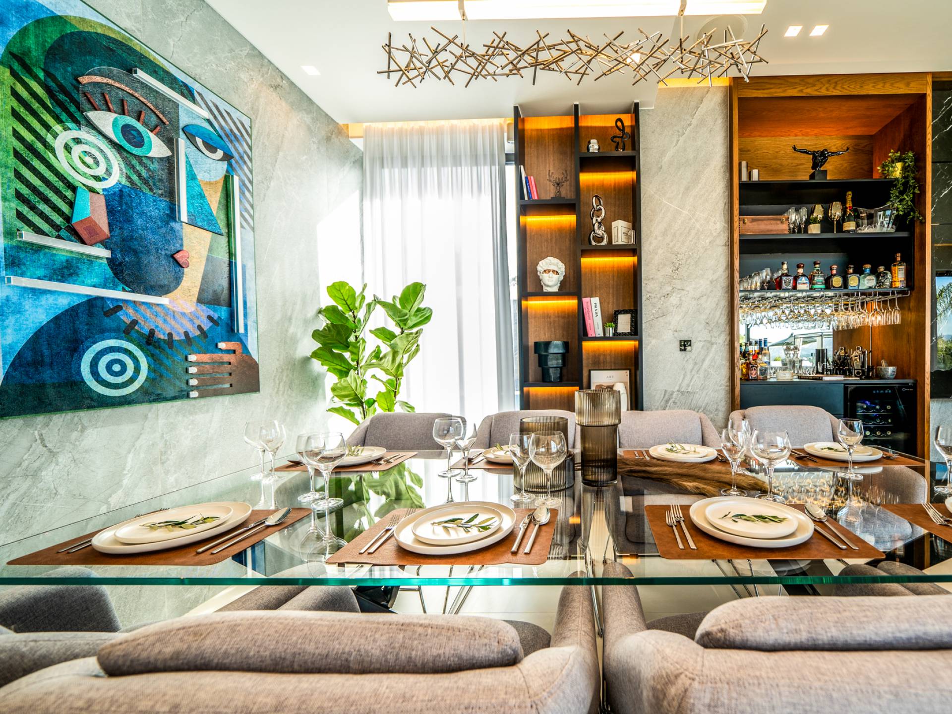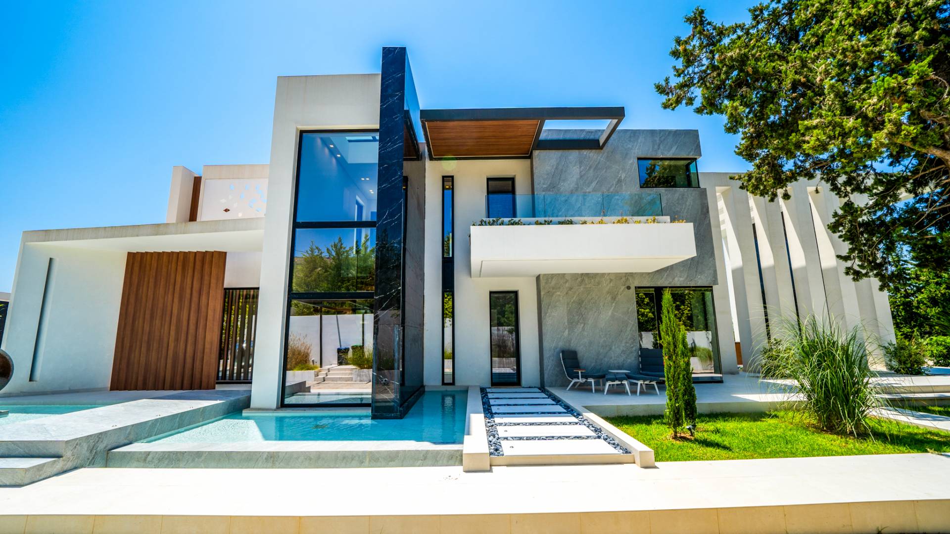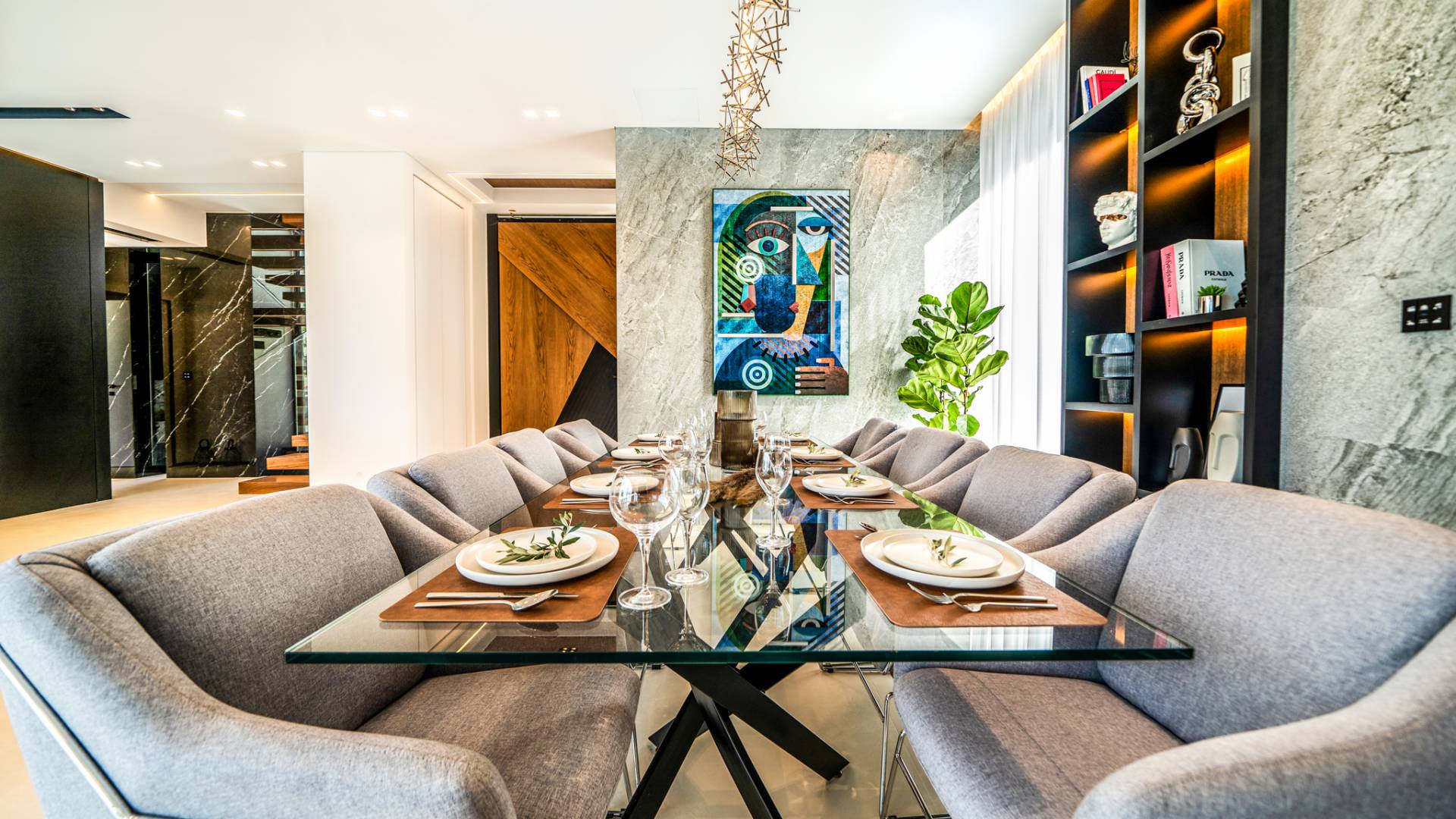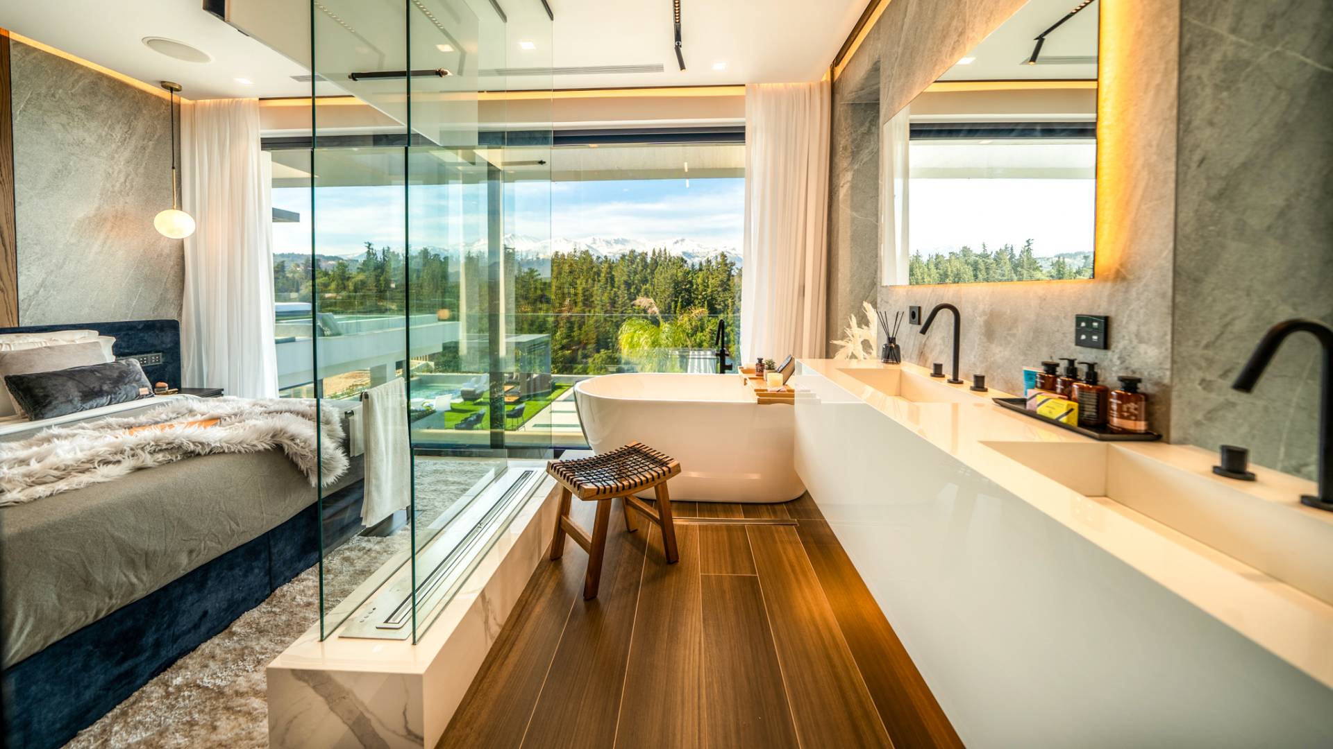 Wenn Sie ins Haus gehen, können Sie die erdigen Farben, die breiten Glastüren und -fenster und das moderne Dekor erleben, das sich in die Villa einfügt und eine beruhigende Umgebung schafft, die einen schönen Kontrast zum strahlenden Azurblau und den üppigen Grüntönen der Gegend bildet.