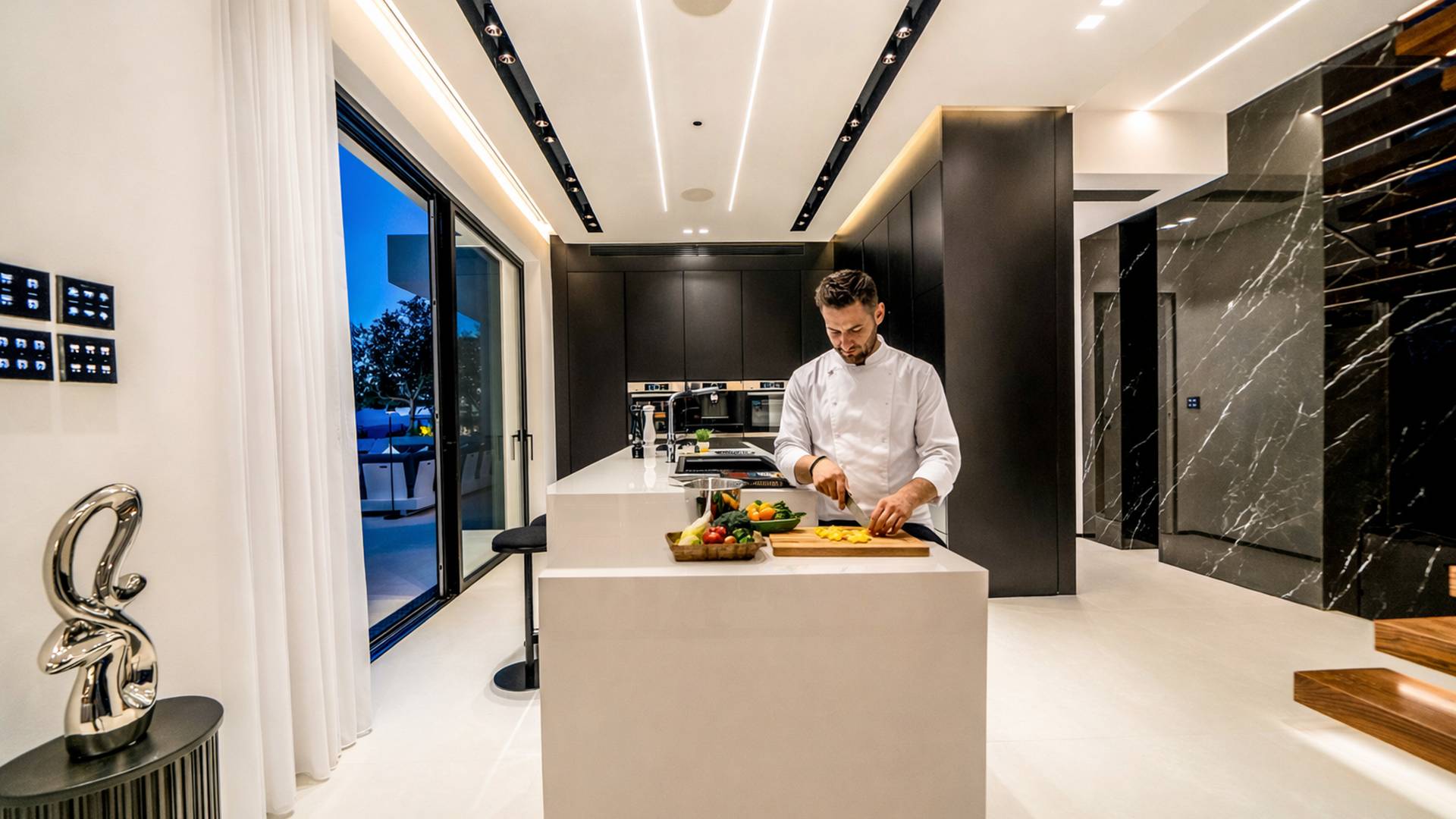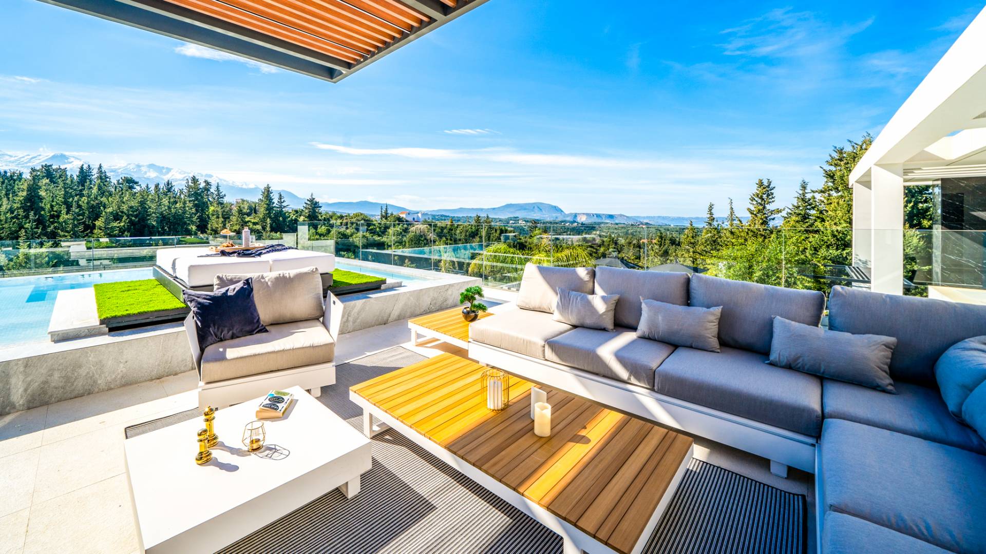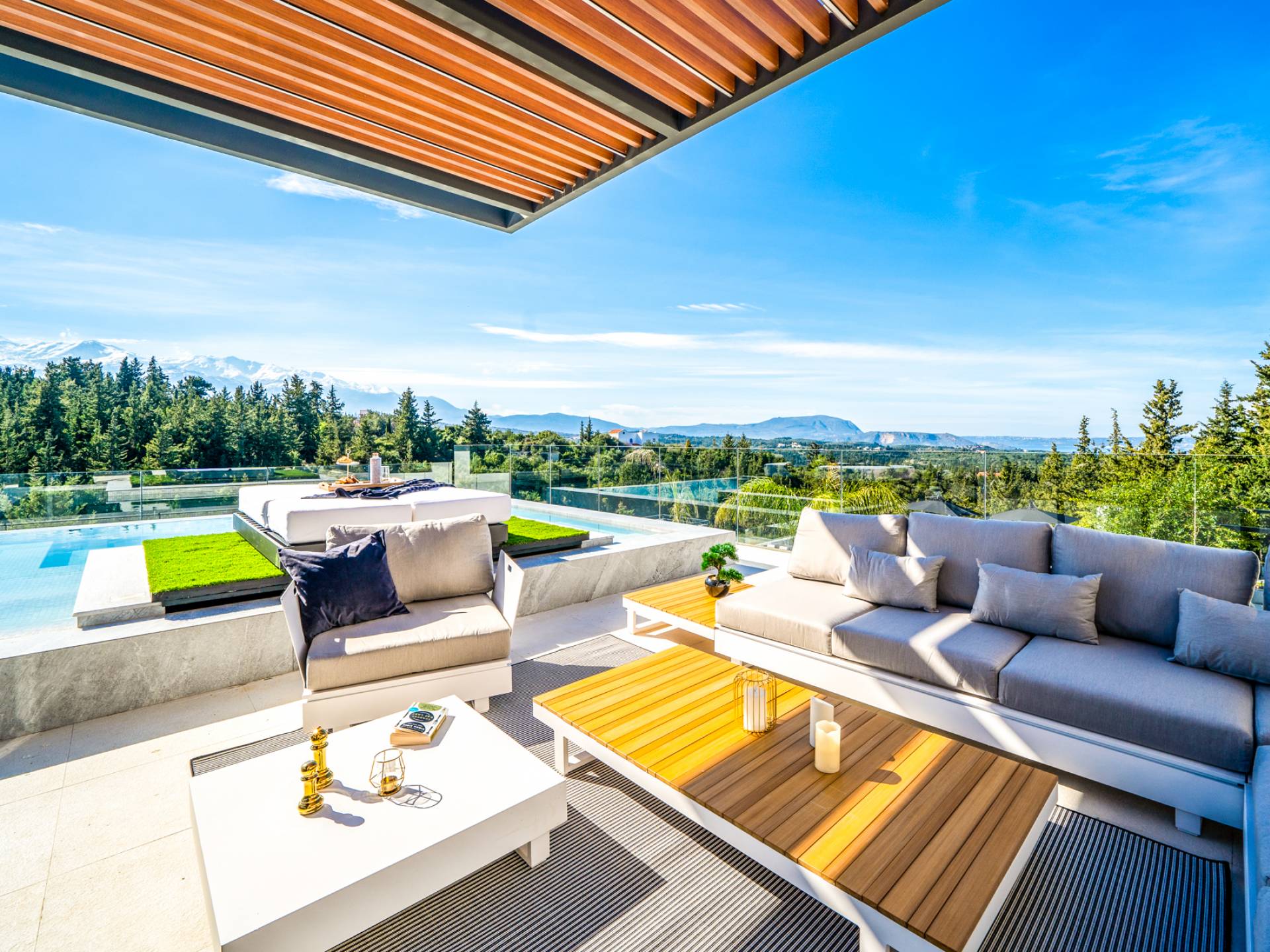 Die von Nikos Giapitzis entworfene One Villa zeichnet sich in allen drei Punkten aus: Ihre großzügigen Innenräume münden in großzügige, mehrdimensionale Terrassen, Kretas wunderbare Sonne wird kunstvoll gemanagt und rationiert; und die ästhetische Logik des Gesamtdesigns sorgt dafür, dass Schönheit und perfekte Zweckmäßigkeit im Einklang stehen. Die zurückhaltende, subtile Ästhetik der Architektur von The One wurde als Folie für die Pracht der kretischen Sonne und die Virtuosität der Ausblicke konzipiert, die dank der Glasschiebewände die vielfältigen Grüntöne der Apokoronas-Landschaft und das Lebendige umfassen , seelenbelebendes Blau des Meeres und des Himmels.