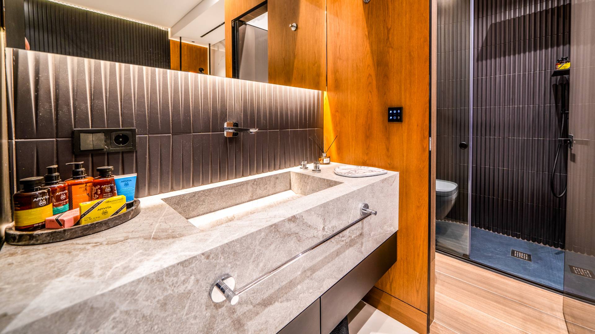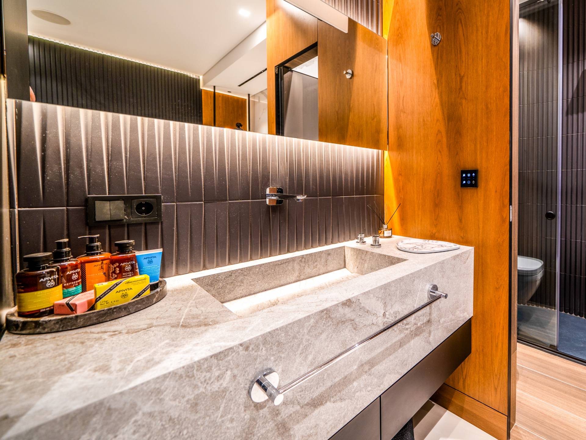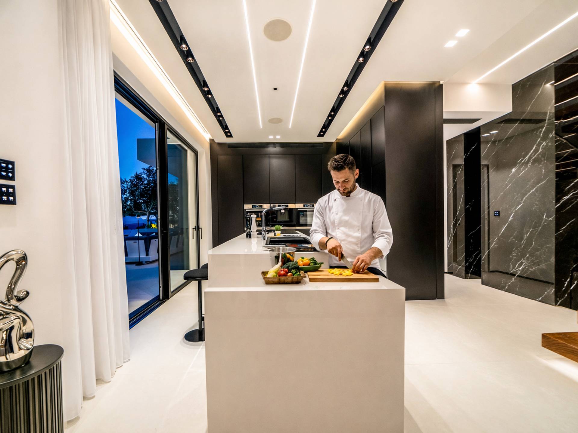 Die von Nikos Giapitzis entworfene One Villa zeichnet sich in allen drei Punkten aus: Ihre großzügigen Innenräume münden in großzügige, mehrdimensionale Terrassen, Kretas wunderbare Sonne wird kunstvoll gemanagt und rationiert; und die ästhetische Logik des Gesamtdesigns sorgt dafür, dass Schönheit und perfekte Zweckmäßigkeit im Einklang stehen. Die zurückhaltende, subtile Ästhetik der Architektur von The One wurde als Folie für die Pracht der kretischen Sonne und die Virtuosität der Ausblicke konzipiert, die dank der Glasschiebewände die vielfältigen Grüntöne der Apokoronas-Landschaft und das Lebendige umfassen , seelenbelebendes Blau des Meeres und des Himmels.