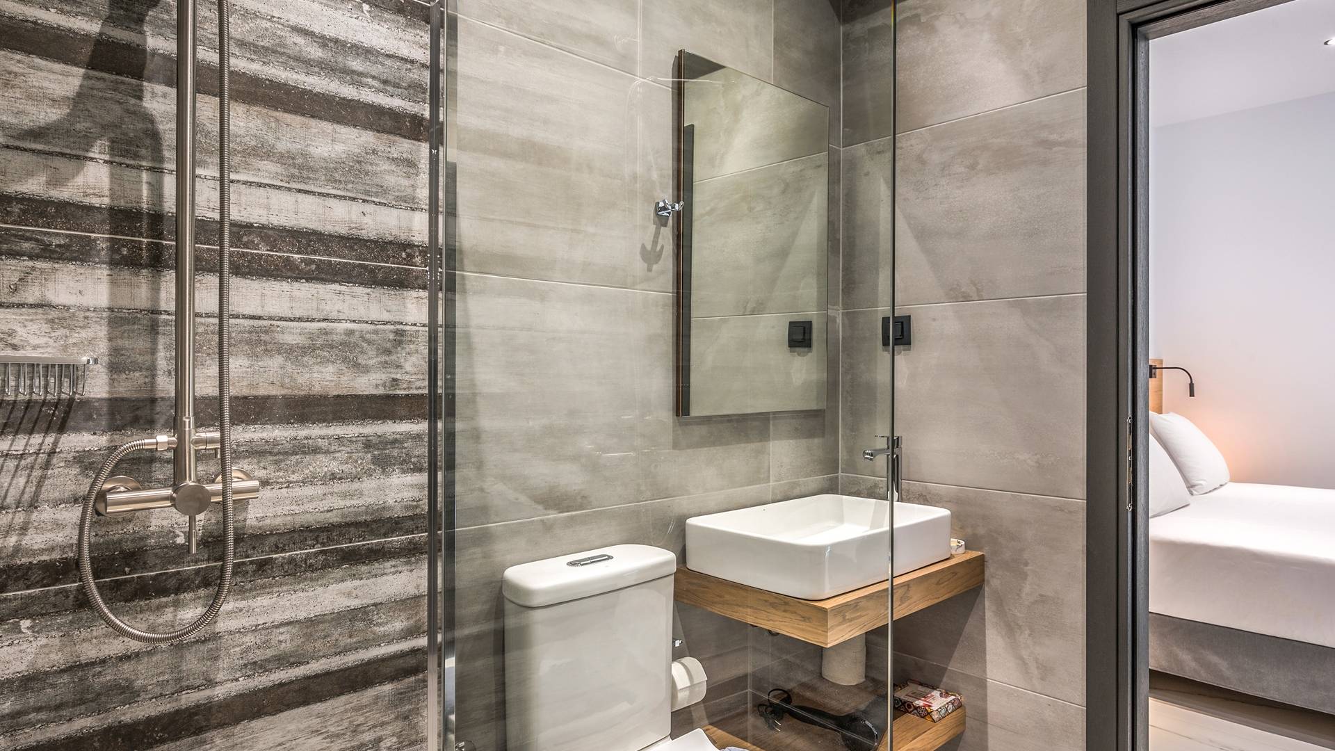 - Schlafzimmer 3 (Obergeschoss)- Queensize-Bett, Ensuite-Badezimmer mit Dusche, Balkon mit Meeres- und Poolansicht