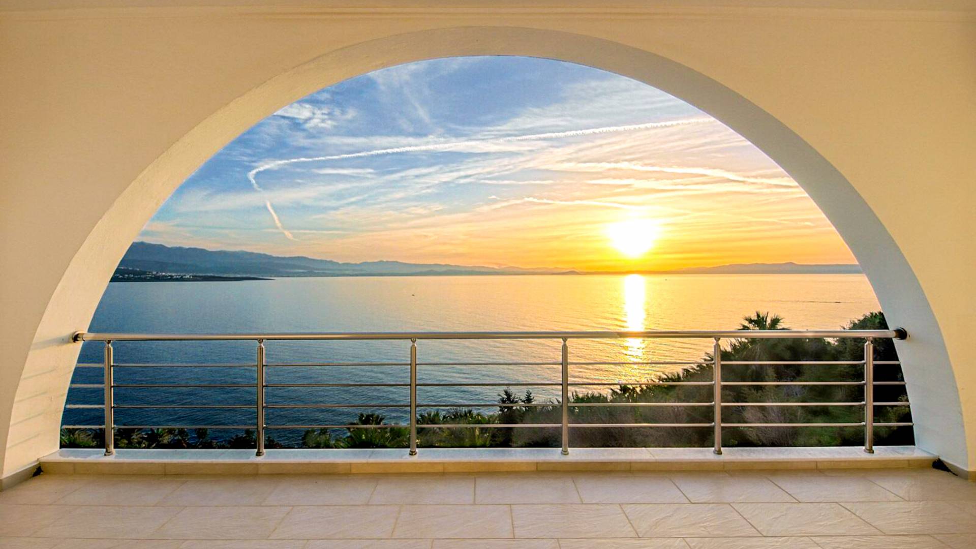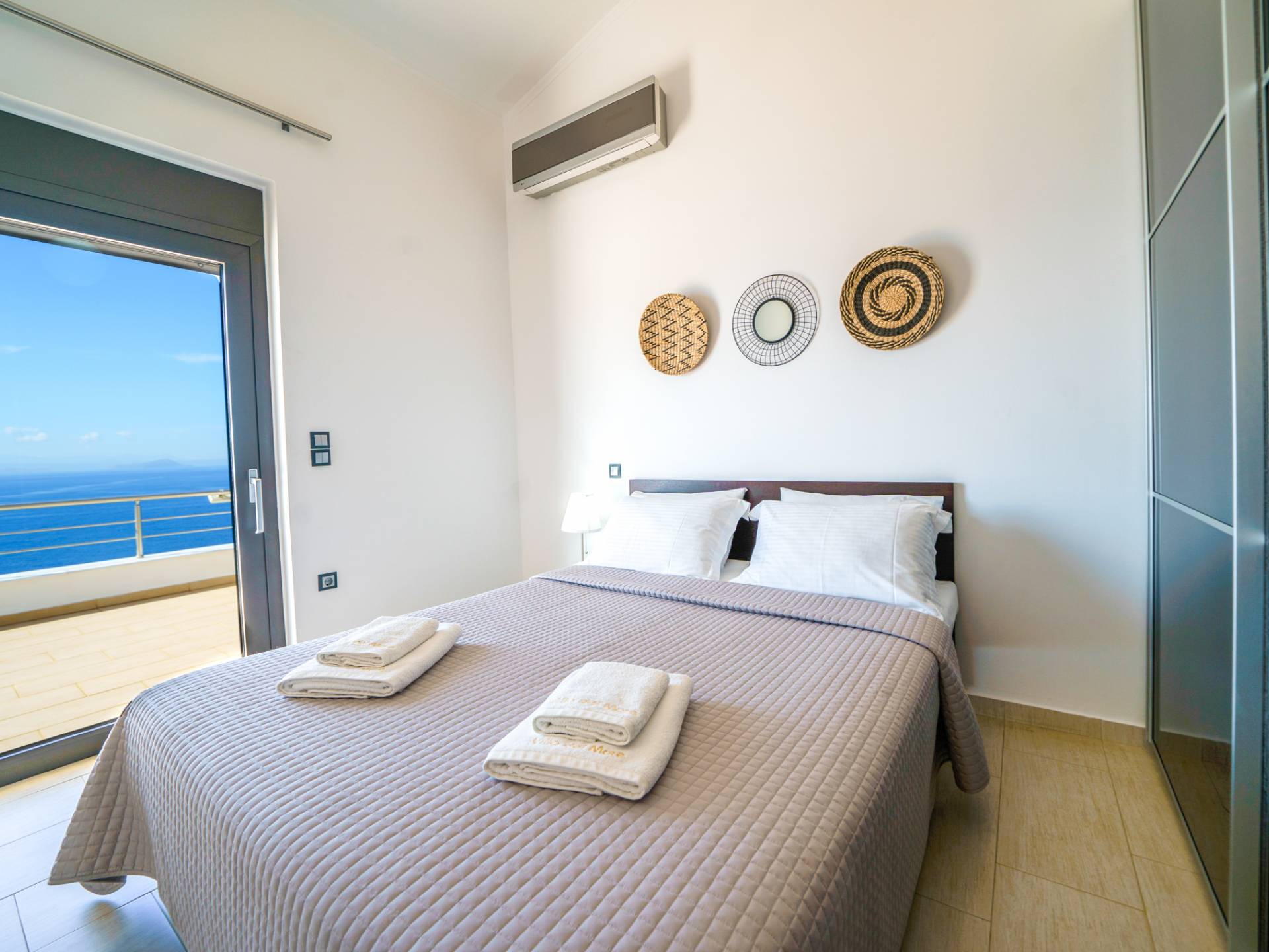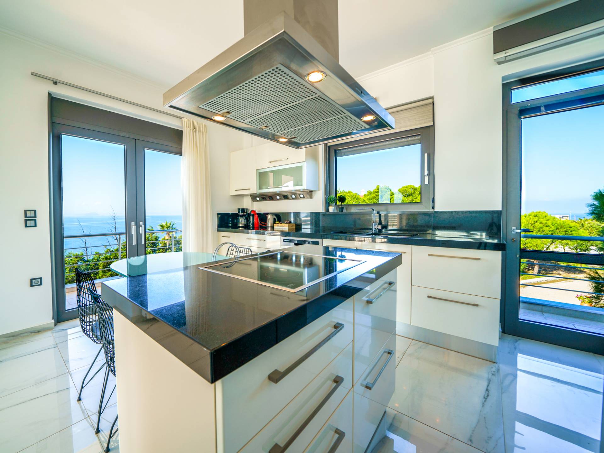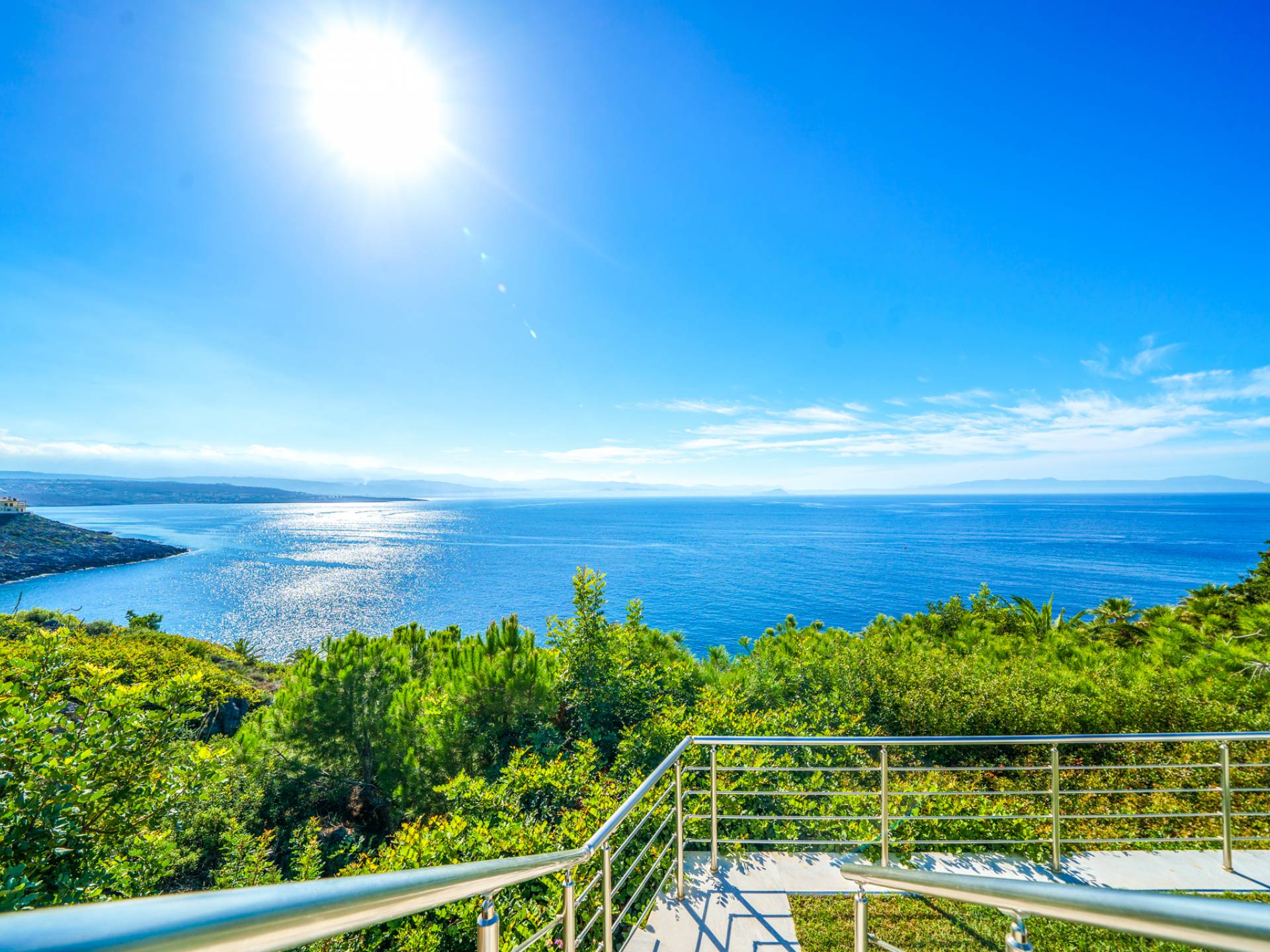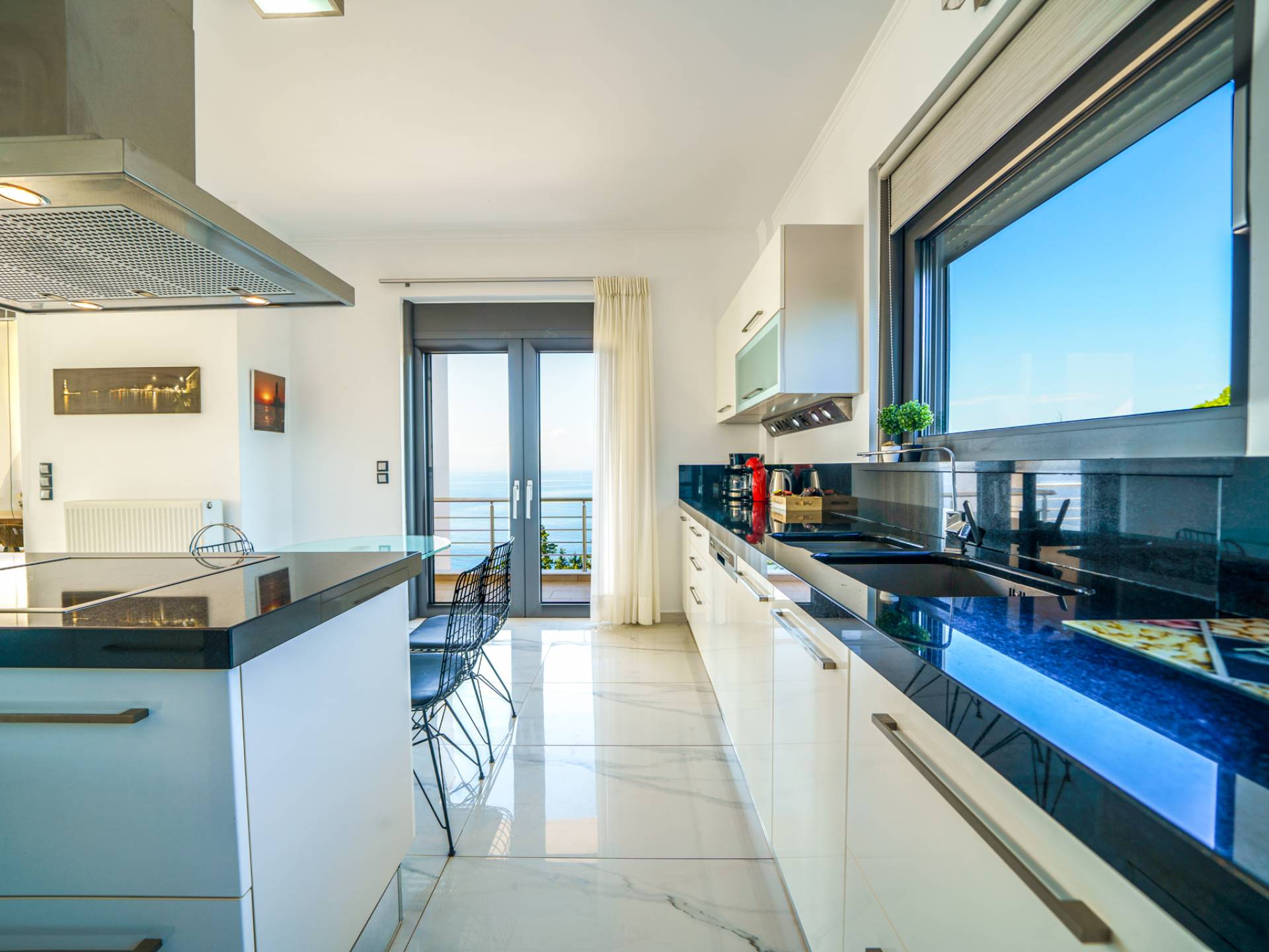 Villa del Mare verfügt über 350 Quadratmeter Wohnfläche, verteilt auf drei Etagen. Der Haupteingang befindet sich in der mittleren Etage und umfasst einen geräumigen, offenen Bereich mit einer komfortablen Lounge, einem gemütlichen Essbereich und einer Küche, die durch eine Bar vom Essbereich getrennt ist. Eine Reihe französischer Türen gibt den Blick auf eine riesige Veranda mit einer herrlichen Aussicht frei. Auf dieser Etage befindet sich auch ein praktisches WC. Die erste Etage beherbergt drei Schlafzimmer und zwei Badezimmer, wobei das Hauptschlafzimmer ein Doppelbett, ein eigenes Badezimmer und zwei separate Balkone mit herrlicher Aussicht bietet. Das zweite Schlafzimmer verfügt über ein kleines Doppelbett und einen privaten Balkon, während das dritte Schlafzimmer über zwei Einzelbetten und einen Dachboden mit einem kleineren Doppelbett verfügt, der ebenfalls über einen privaten Balkon verfügt.