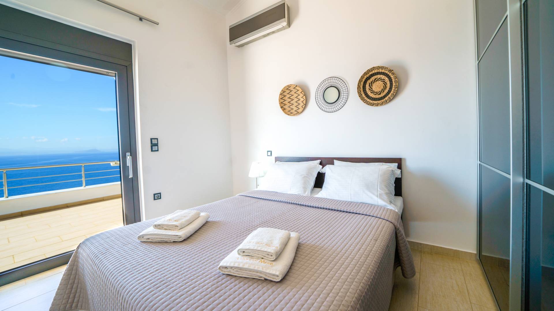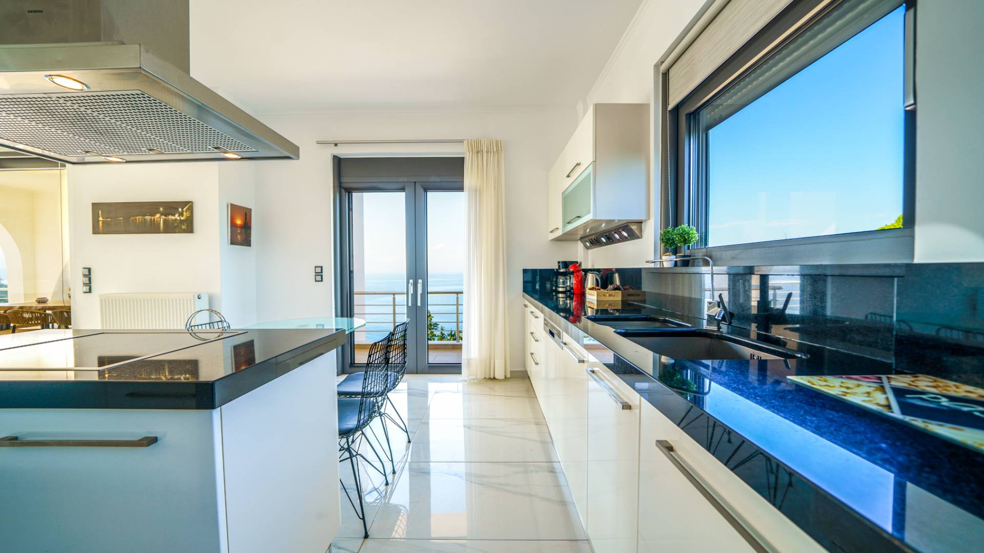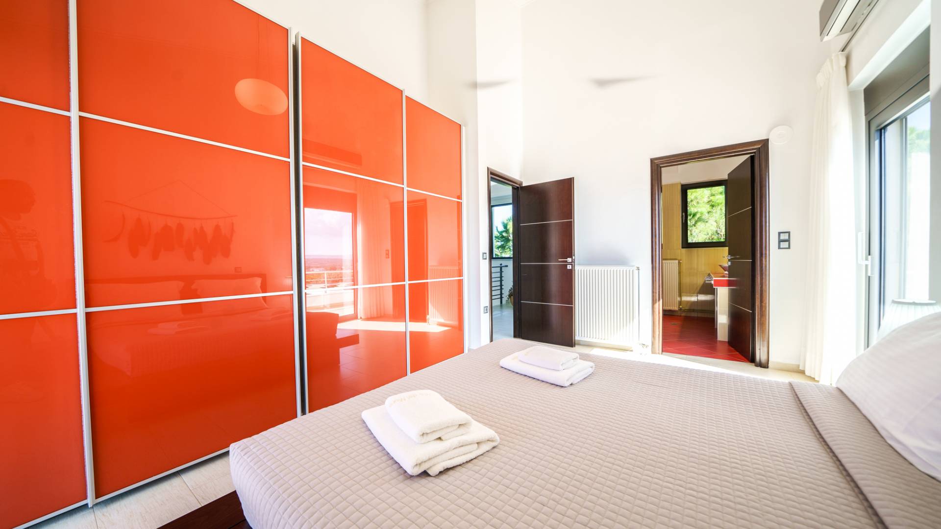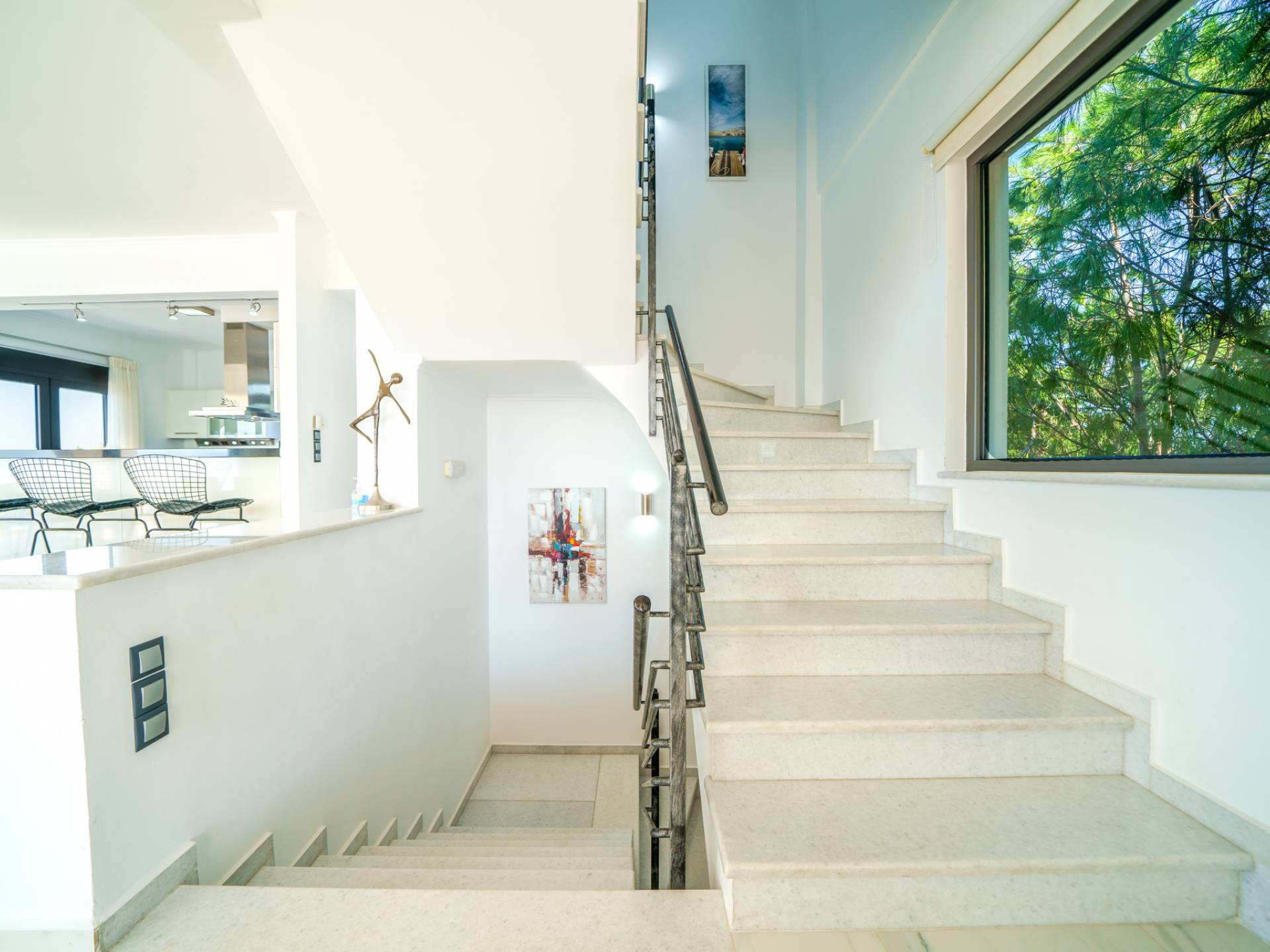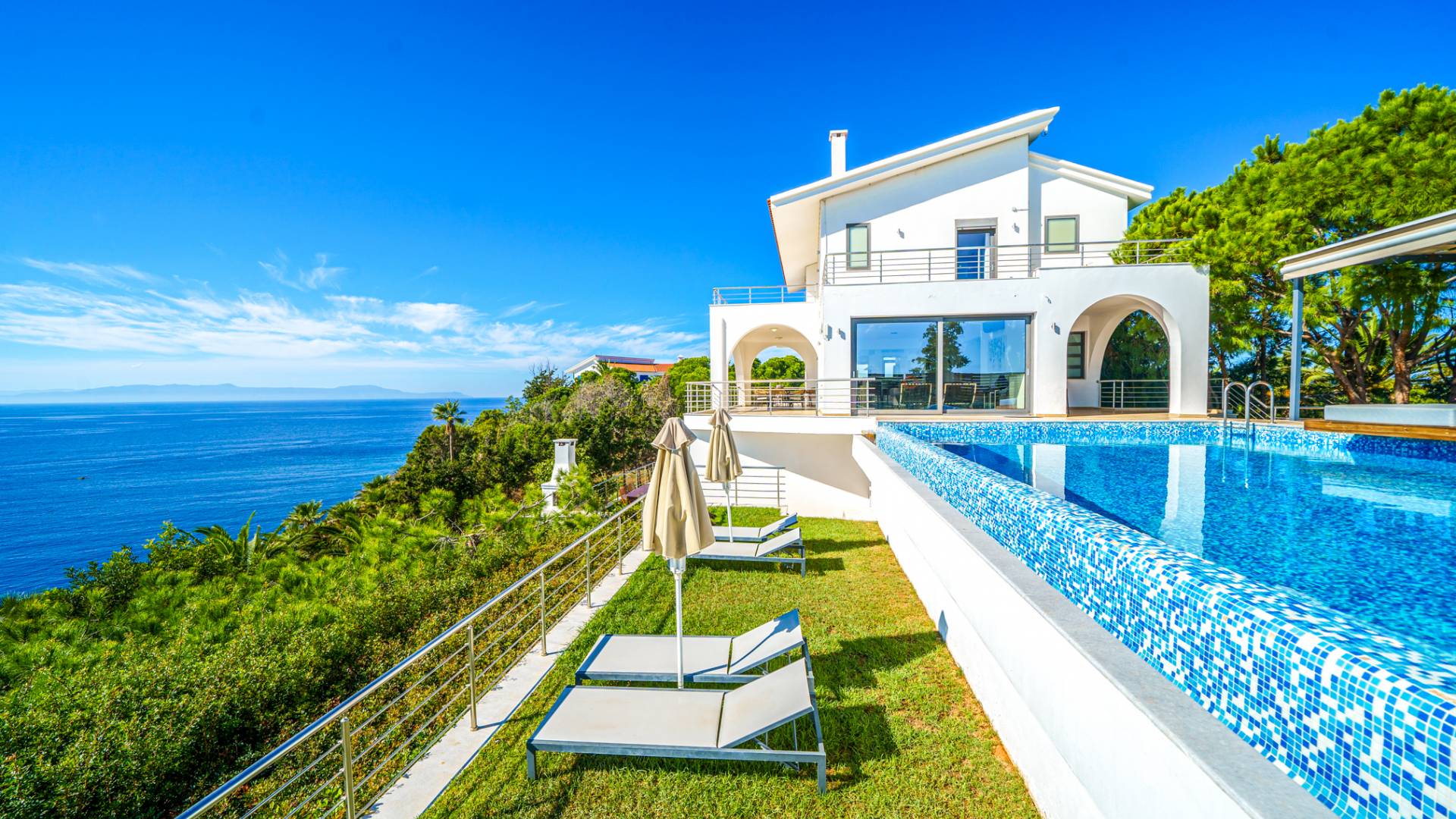 Villa del Mare verfügt über 350 Quadratmeter Wohnfläche, verteilt auf drei Etagen. Der Haupteingang befindet sich in der mittleren Etage und umfasst einen geräumigen, offenen Bereich mit einer komfortablen Lounge, einem gemütlichen Essbereich und einer Küche, die durch eine Bar vom Essbereich getrennt ist. Eine Reihe französischer Türen gibt den Blick auf eine riesige Veranda mit einer herrlichen Aussicht frei. Auf dieser Etage befindet sich auch ein praktisches WC. Die erste Etage beherbergt drei Schlafzimmer und zwei Badezimmer, wobei das Hauptschlafzimmer ein Doppelbett, ein eigenes Badezimmer und zwei separate Balkone mit herrlicher Aussicht bietet. Das zweite Schlafzimmer verfügt über ein kleines Doppelbett und einen privaten Balkon, während das dritte Schlafzimmer über zwei Einzelbetten und einen Dachboden mit einem kleineren Doppelbett verfügt, der ebenfalls über einen privaten Balkon verfügt.