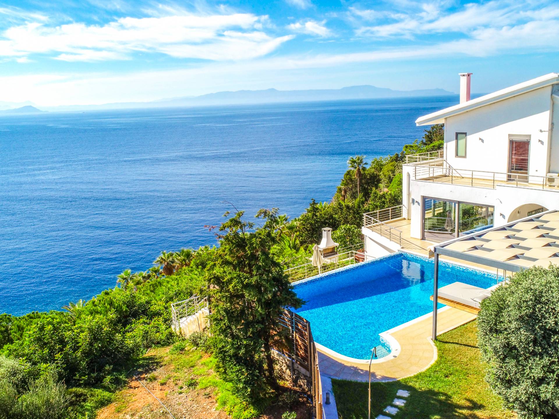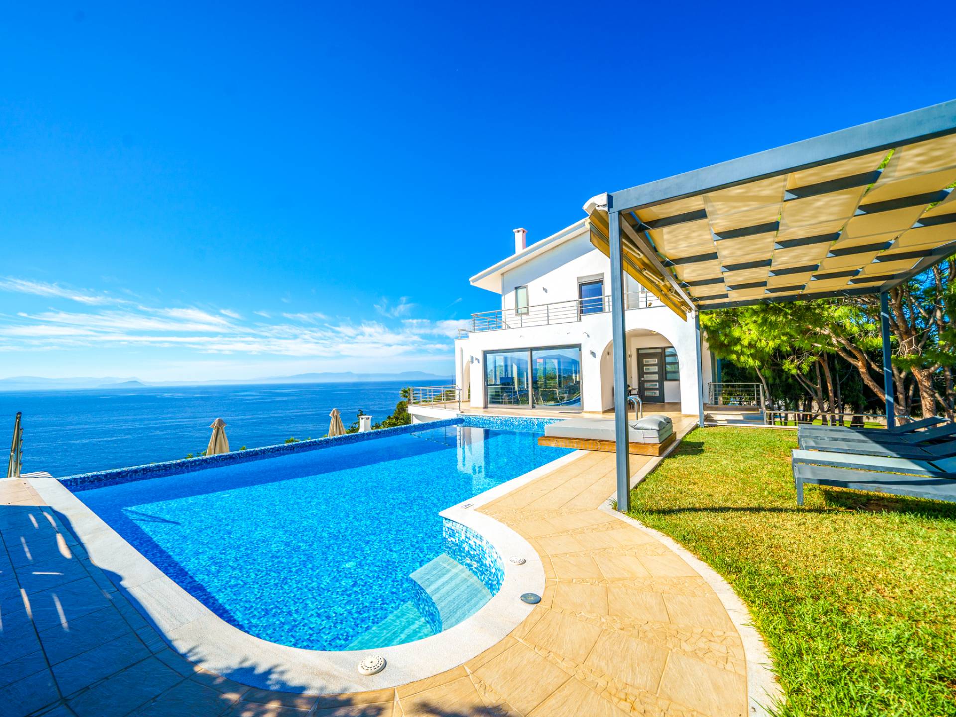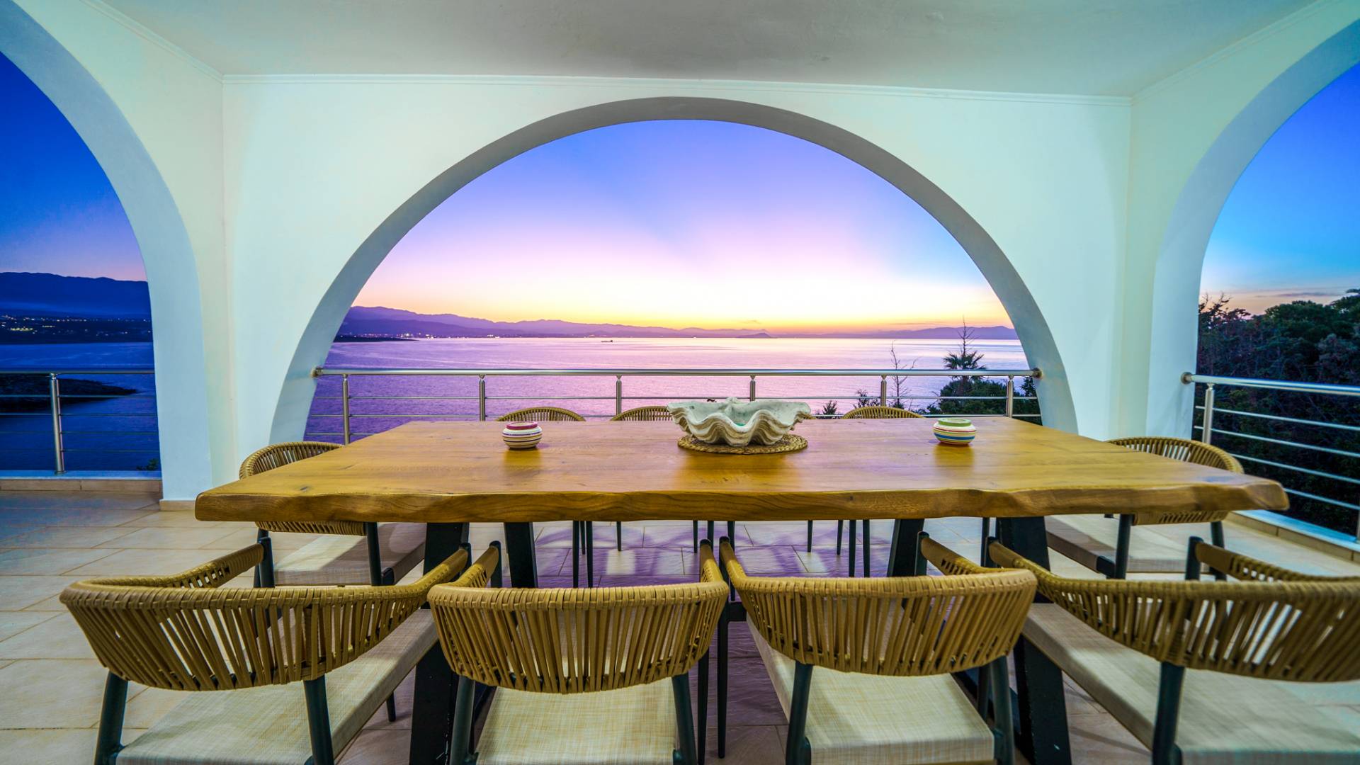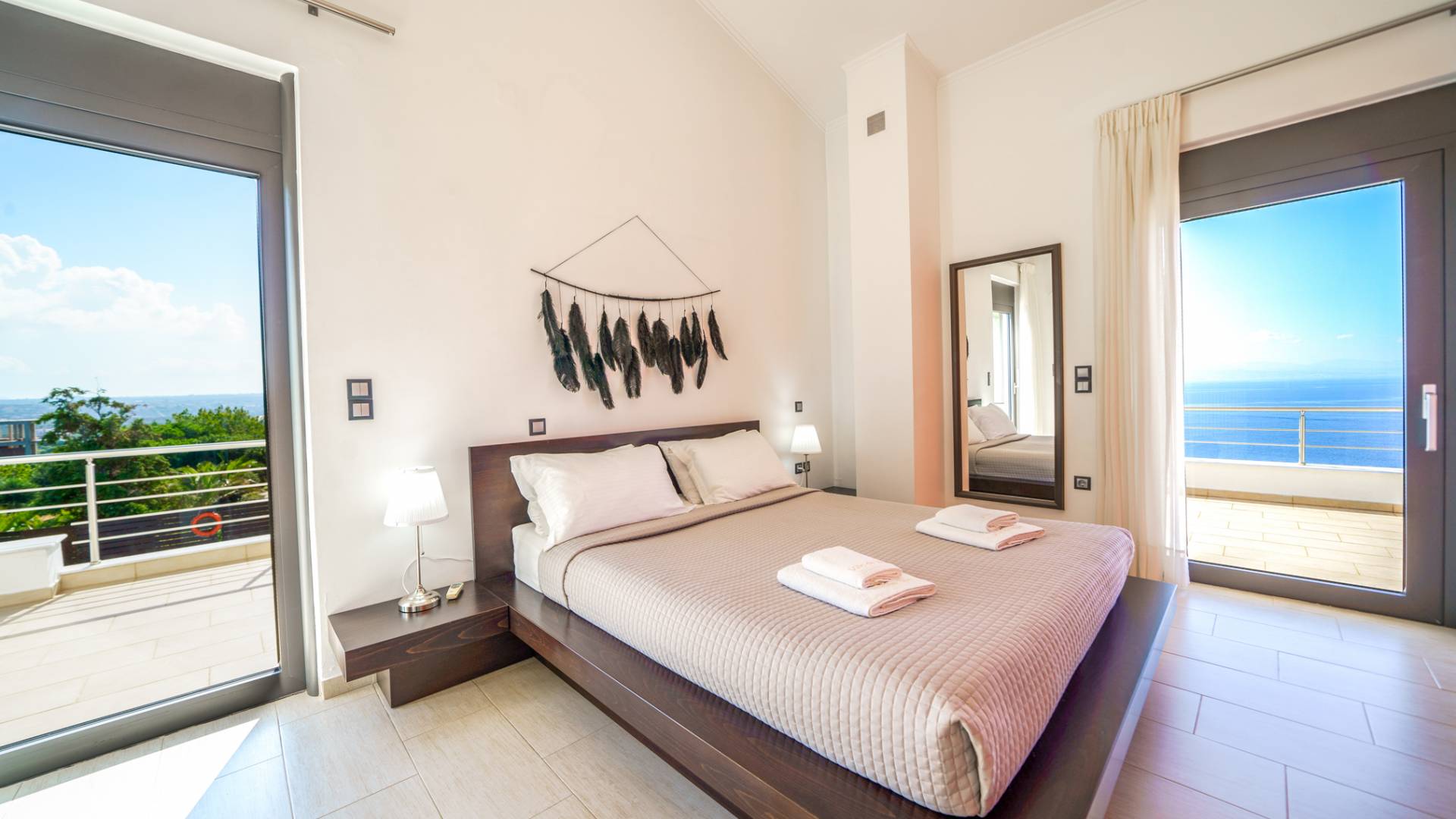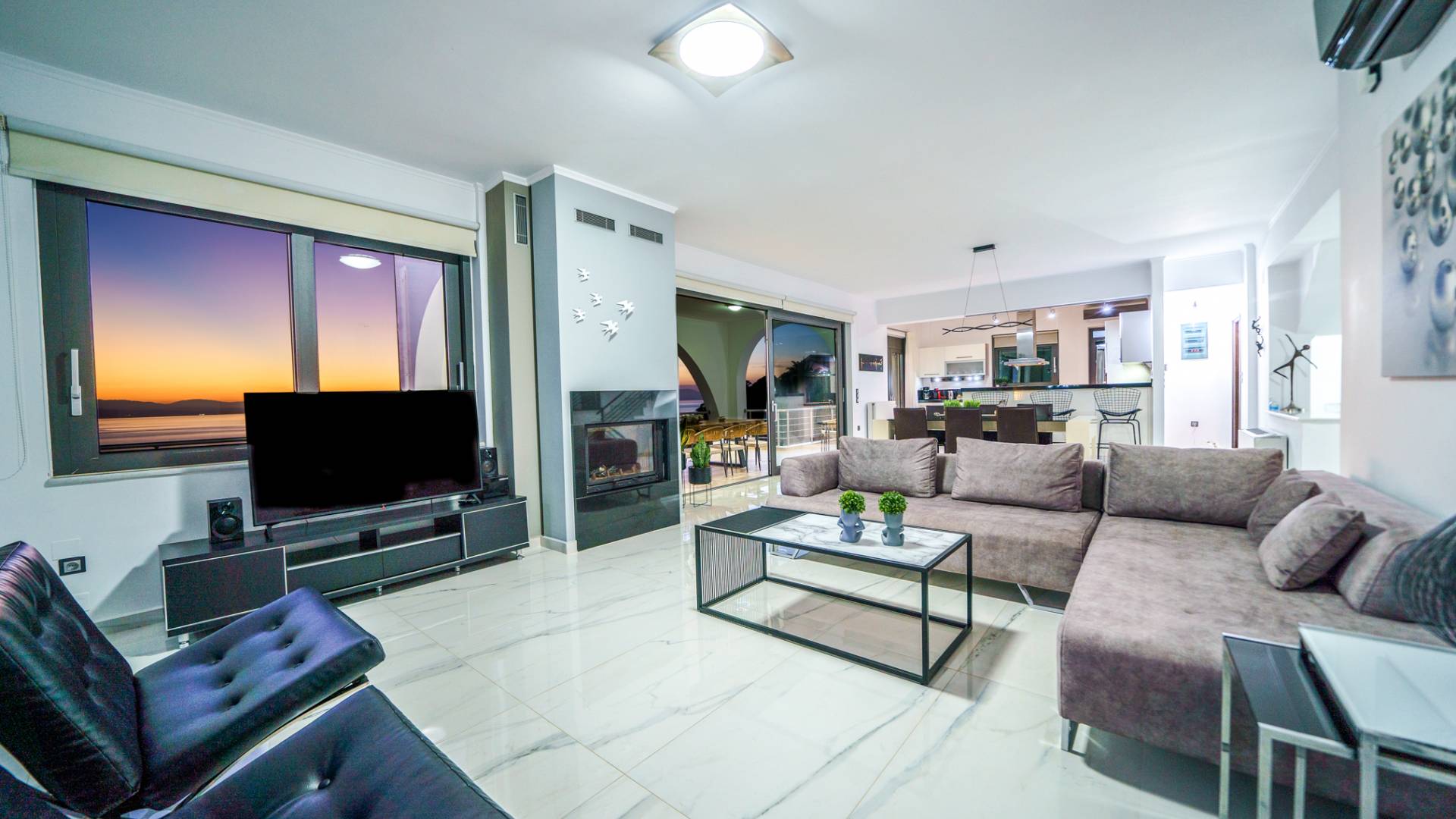 Villa del Mare verfügt über 350 Quadratmeter Wohnfläche, verteilt auf drei Etagen. Der Haupteingang befindet sich in der mittleren Etage und umfasst einen geräumigen, offenen Bereich mit einer komfortablen Lounge, einem gemütlichen Essbereich und einer Küche, die durch eine Bar vom Essbereich getrennt ist. Eine Reihe französischer Türen gibt den Blick auf eine riesige Veranda mit einer herrlichen Aussicht frei. Auf dieser Etage befindet sich auch ein praktisches WC. Die erste Etage beherbergt drei Schlafzimmer und zwei Badezimmer, wobei das Hauptschlafzimmer ein Doppelbett, ein eigenes Badezimmer und zwei separate Balkone mit herrlicher Aussicht bietet. Das zweite Schlafzimmer verfügt über ein kleines Doppelbett und einen privaten Balkon, während das dritte Schlafzimmer über zwei Einzelbetten und einen Dachboden mit einem kleineren Doppelbett verfügt, der ebenfalls über einen privaten Balkon verfügt.