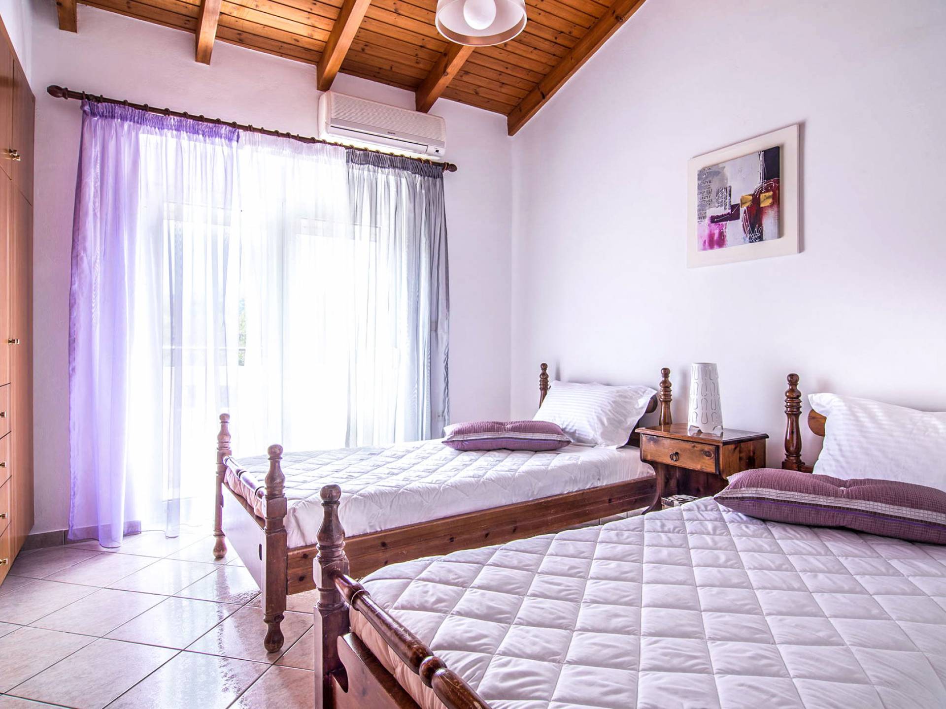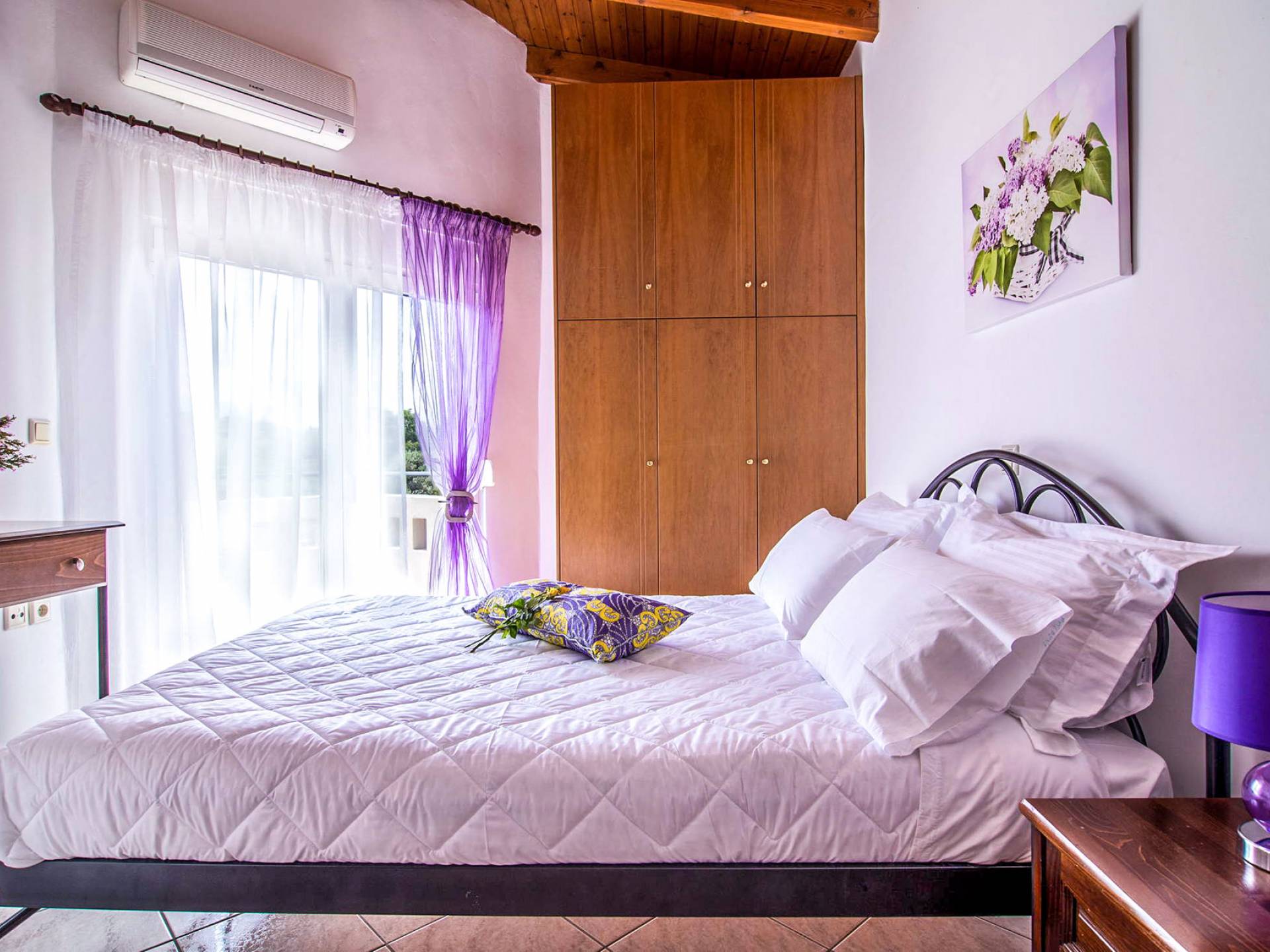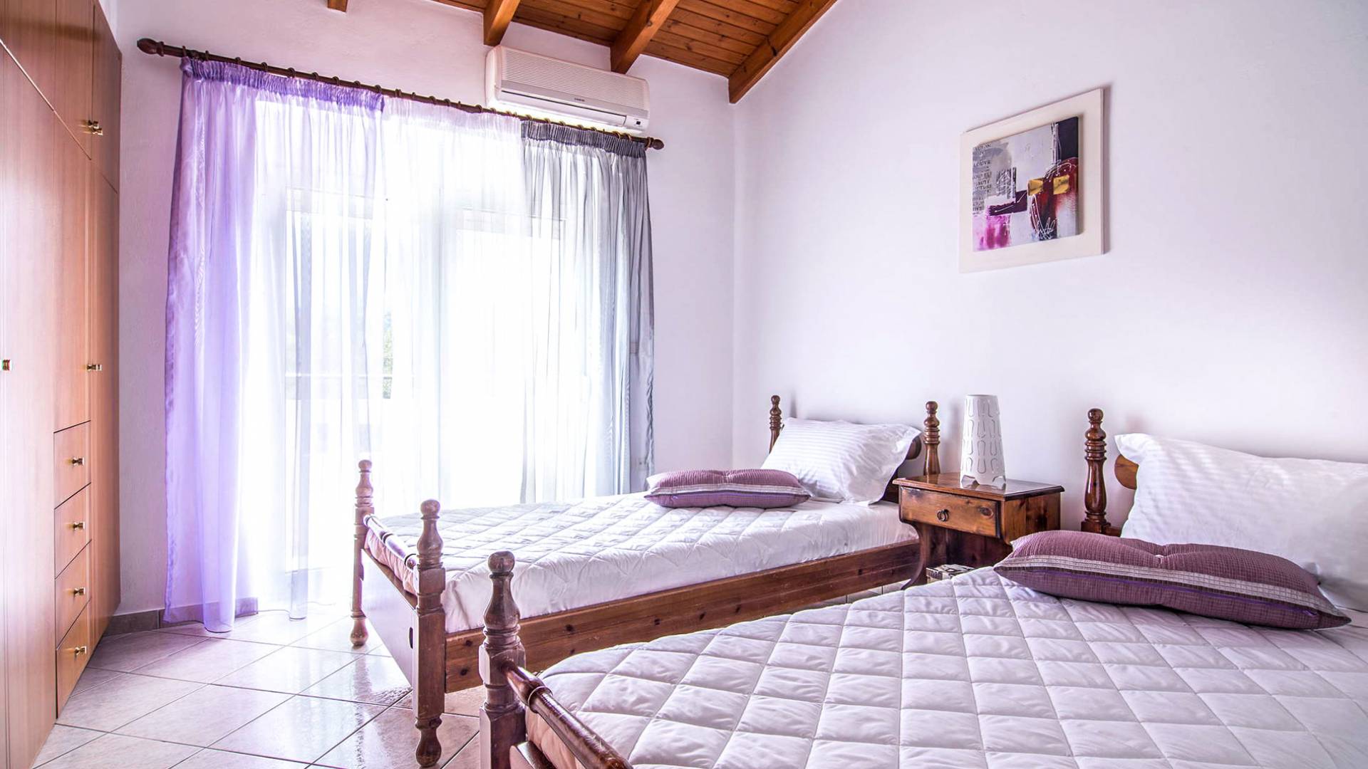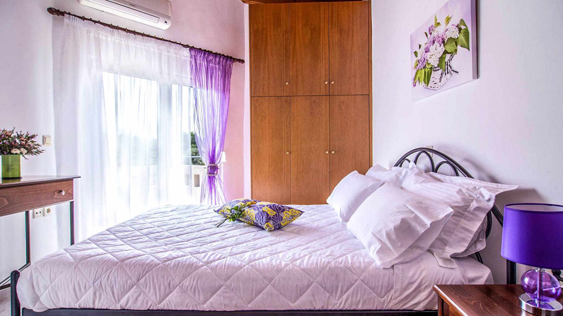 Marmortreppen führen in den zweiten Stock, wo sich drei schräge Schlafzimmer mit Holzdecke befinden, jedes mit einem eigenen großen Wandschrank und jedes mit einem separaten Balkon mit freiem Blick auf Apokoronas. Zwei der Zimmer verfügen über ein Doppelbett, das dritte über zwei Einzelbetten. Alle Schlafzimmer sind mit Klimaanlagen ausgestattet. Auf der gleichen Etage befindet sich das geräumige Hauptbadezimmer mit Whirlpool und einer Tuchwaschmaschine. Das Haus im Erdgeschoss ist eine schöne Herberge mit niedrigem Dach und einem Schlafzimmer, einer voll ausgestatteten Küche, einem Badezimmer und einem Wohnzimmer mit direktem Zugang zu den herrlichen Gärten der Villa. Das Schlafzimmer hat ein Doppelbett, einen großen Schrank und ist klimatisiert. Ebenfalls im Erdgeschoss befindet sich neben dem Hostel ein privater Raum, der auf Anfrage als Fitnessstudio für Personal Training dient.