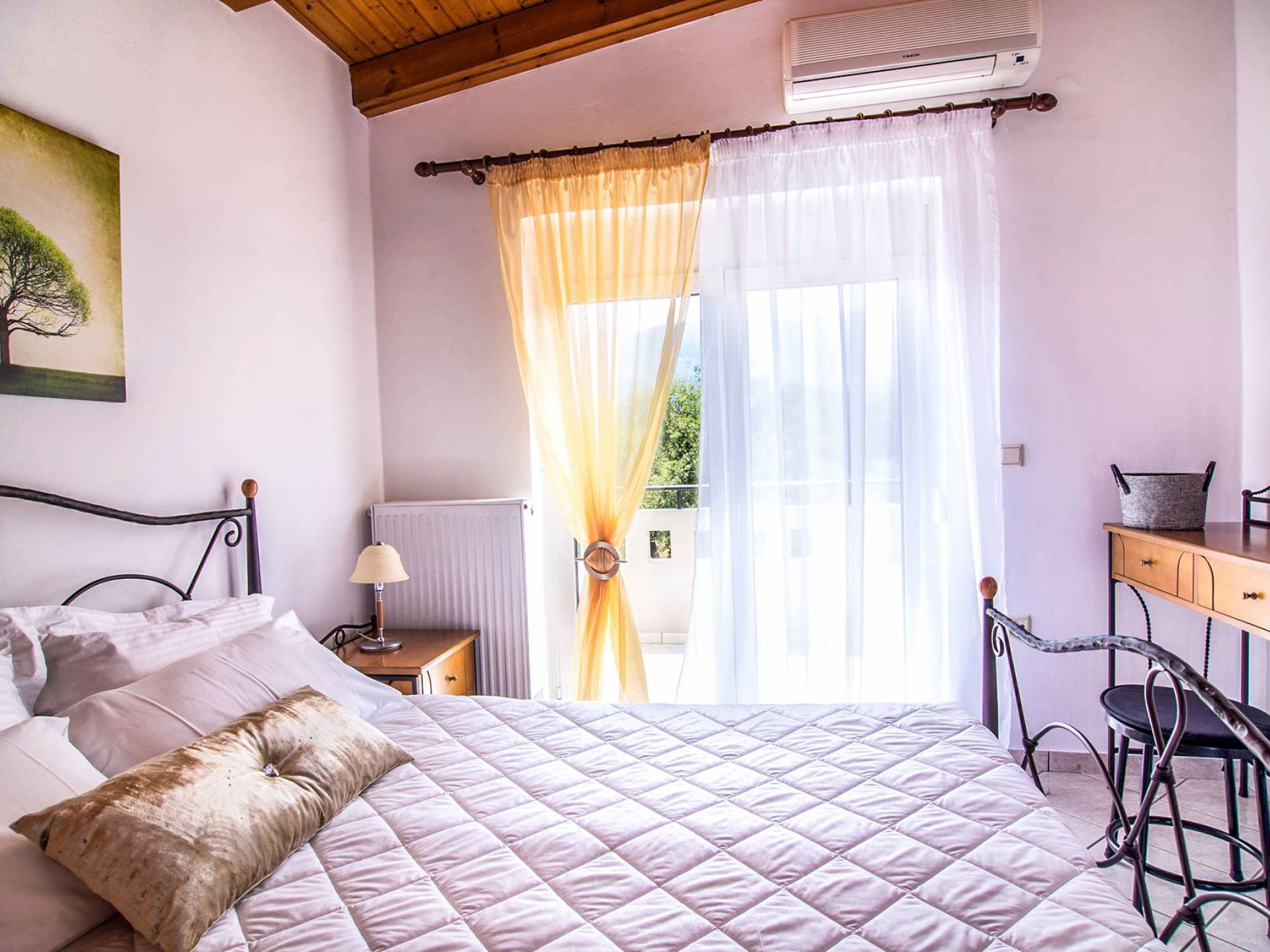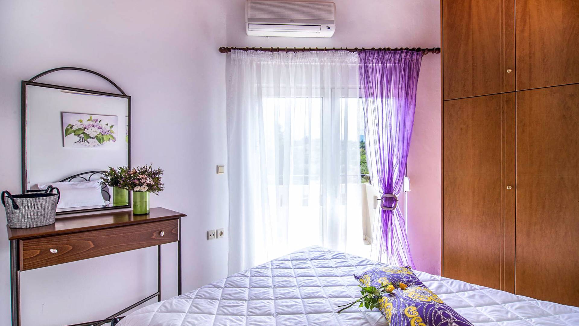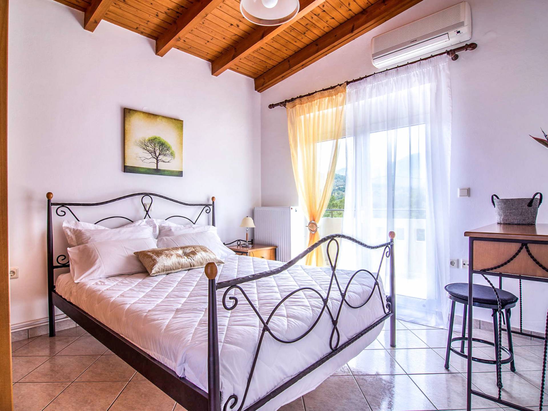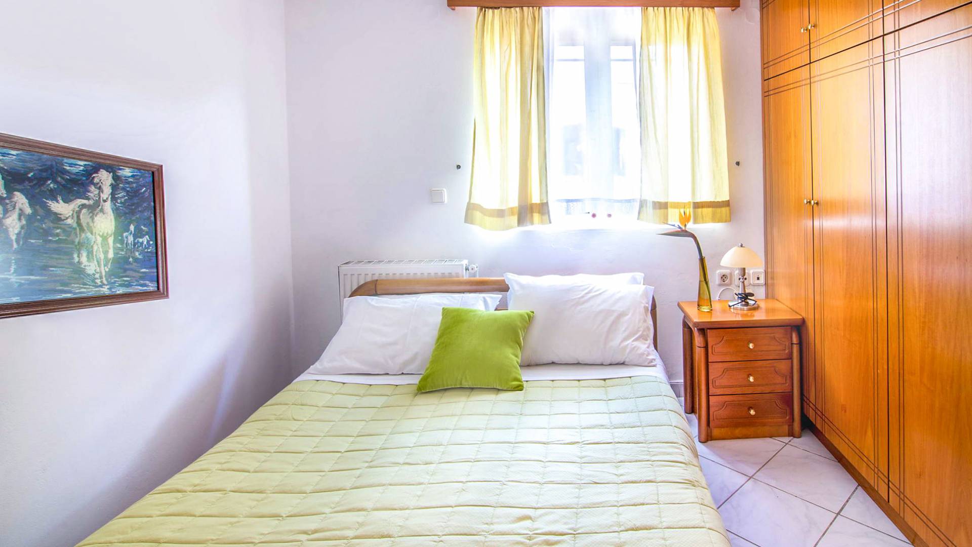Marmortreppen führen in den zweiten Stock, wo sich drei schräge Schlafzimmer mit Holzdecke befinden, jedes mit einem eigenen großen Wandschrank und jedes mit einem separaten Balkon mit freiem Blick auf Apokoronas. Zwei der Zimmer verfügen über ein Doppelbett, das dritte über zwei Einzelbetten. Alle Schlafzimmer sind mit Klimaanlagen ausgestattet. Auf der gleichen Etage befindet sich das geräumige Hauptbadezimmer mit Whirlpool und einer Tuchwaschmaschine. Das Haus im Erdgeschoss ist eine schöne Herberge mit niedrigem Dach und einem Schlafzimmer, einer voll ausgestatteten Küche, einem Badezimmer und einem Wohnzimmer mit direktem Zugang zu den herrlichen Gärten der Villa. Das Schlafzimmer hat ein Doppelbett, einen großen Schrank und ist klimatisiert. Ebenfalls im Erdgeschoss befindet sich neben dem Hostel ein privater Raum, der auf Anfrage als Fitnessstudio für Personal Training dient.