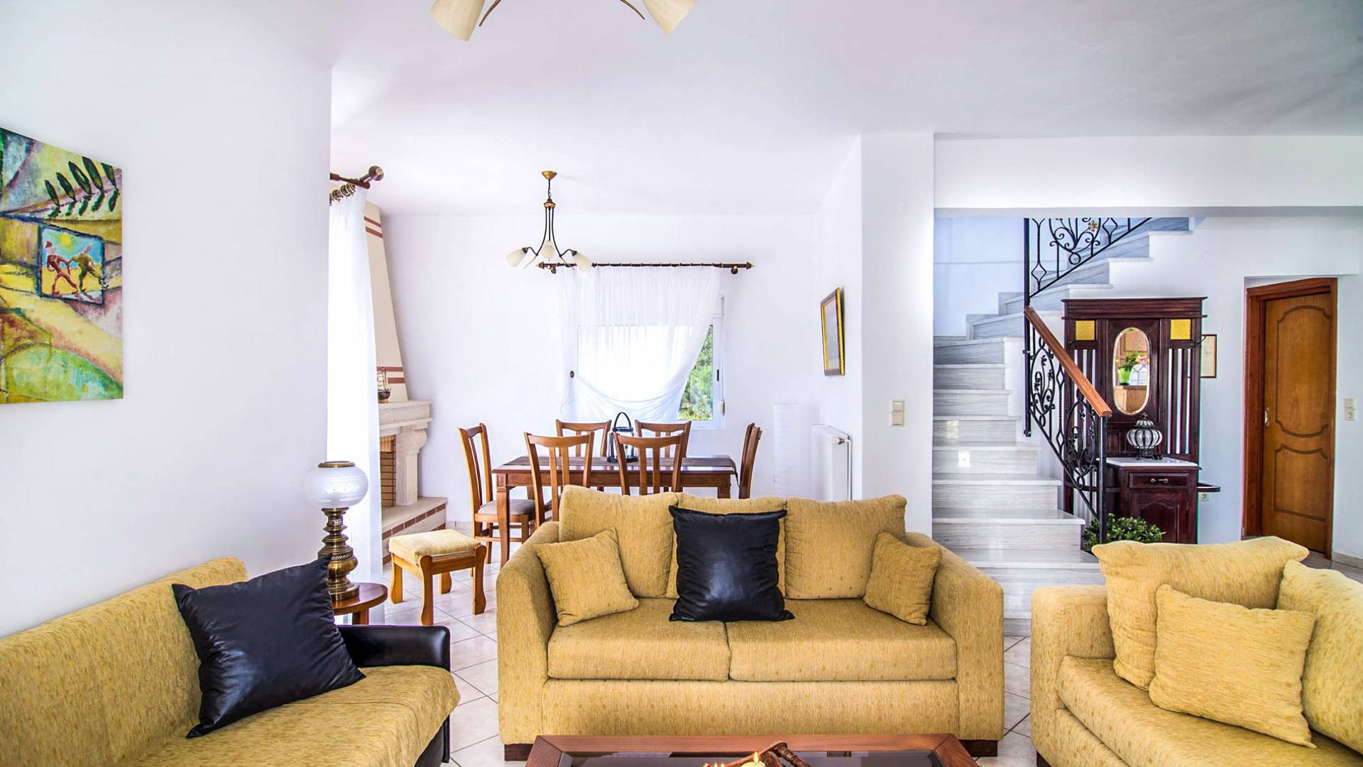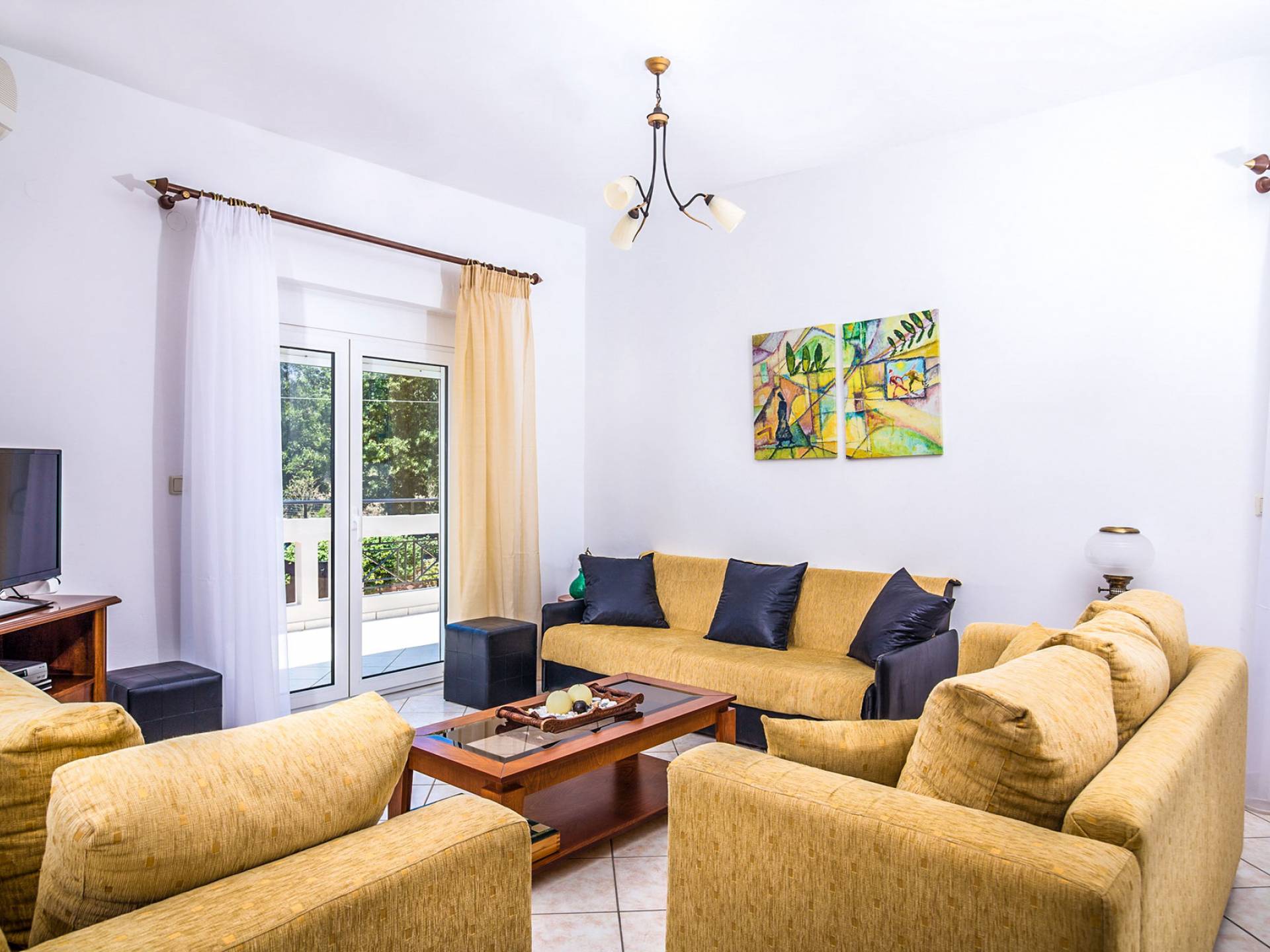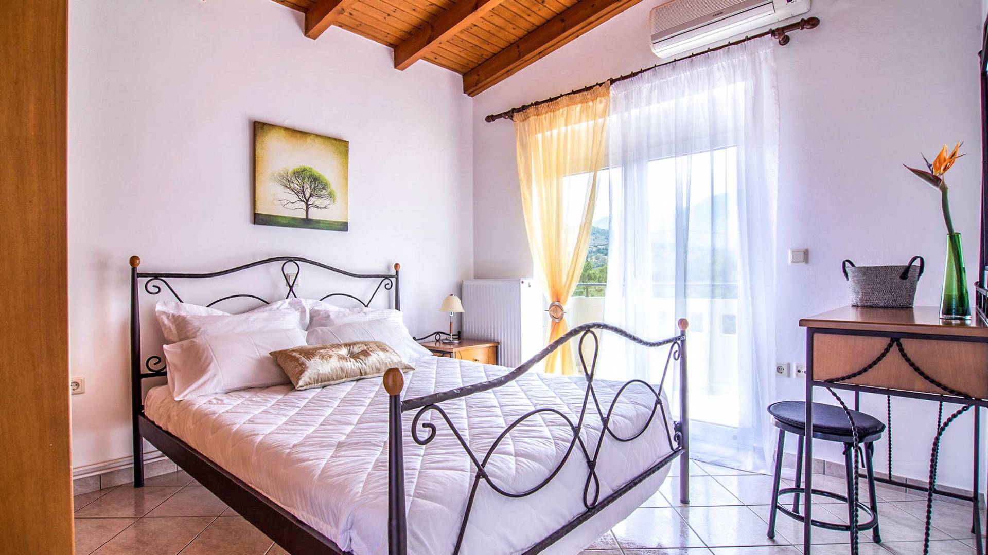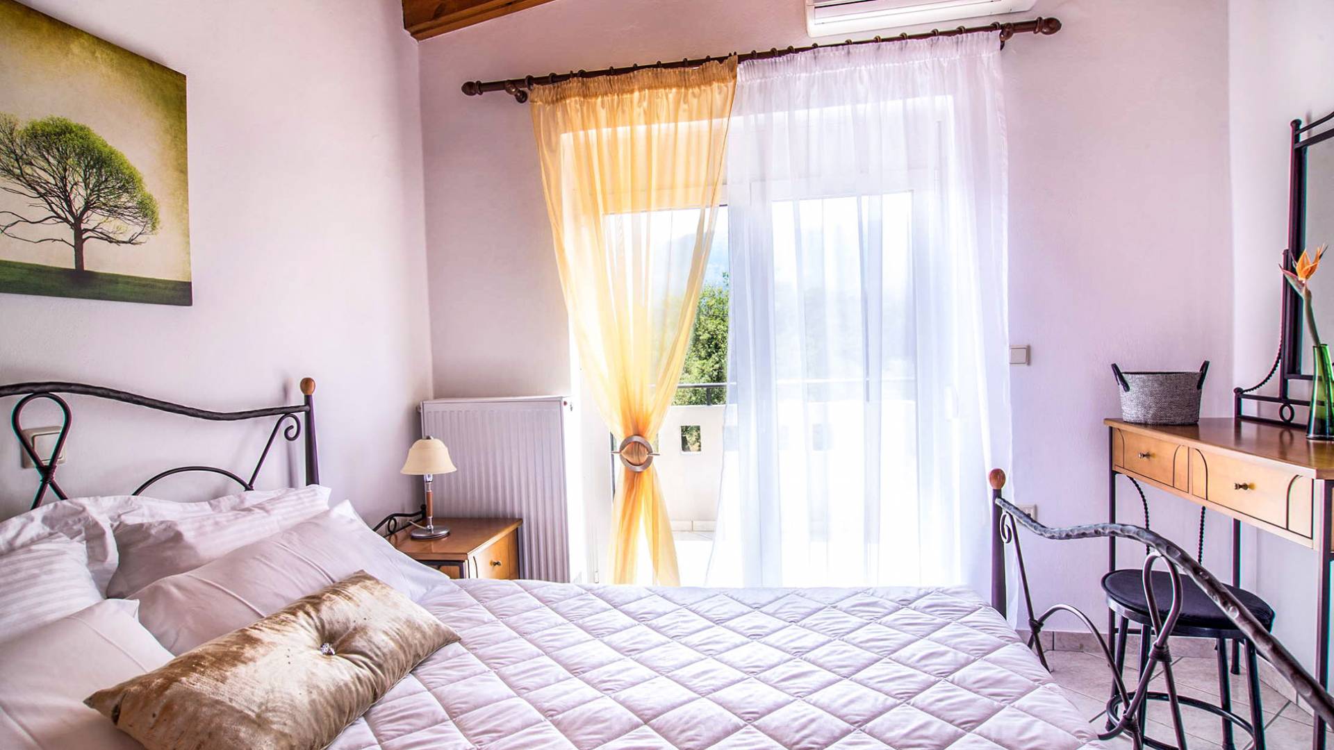 Marmortreppen führen in den zweiten Stock, wo sich drei schräge Schlafzimmer mit Holzdecke befinden, jedes mit einem eigenen großen Wandschrank und jedes mit einem separaten Balkon mit freiem Blick auf Apokoronas. Zwei der Zimmer verfügen über ein Doppelbett, das dritte über zwei Einzelbetten. Alle Schlafzimmer sind mit Klimaanlagen ausgestattet. Auf der gleichen Etage befindet sich das geräumige Hauptbadezimmer mit Whirlpool und einer Tuchwaschmaschine. Das Haus im Erdgeschoss ist eine schöne Herberge mit niedrigem Dach und einem Schlafzimmer, einer voll ausgestatteten Küche, einem Badezimmer und einem Wohnzimmer mit direktem Zugang zu den herrlichen Gärten der Villa. Das Schlafzimmer hat ein Doppelbett, einen großen Schrank und ist klimatisiert. Ebenfalls im Erdgeschoss befindet sich neben dem Hostel ein privater Raum, der auf Anfrage als Fitnessstudio für Personal Training dient.