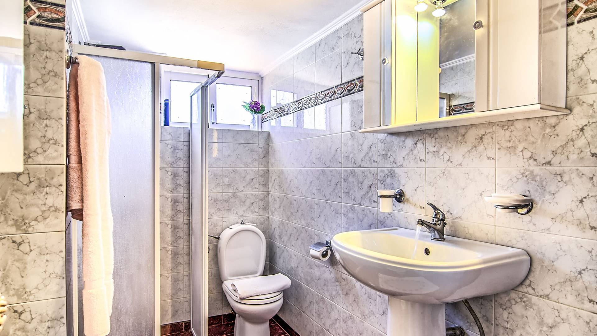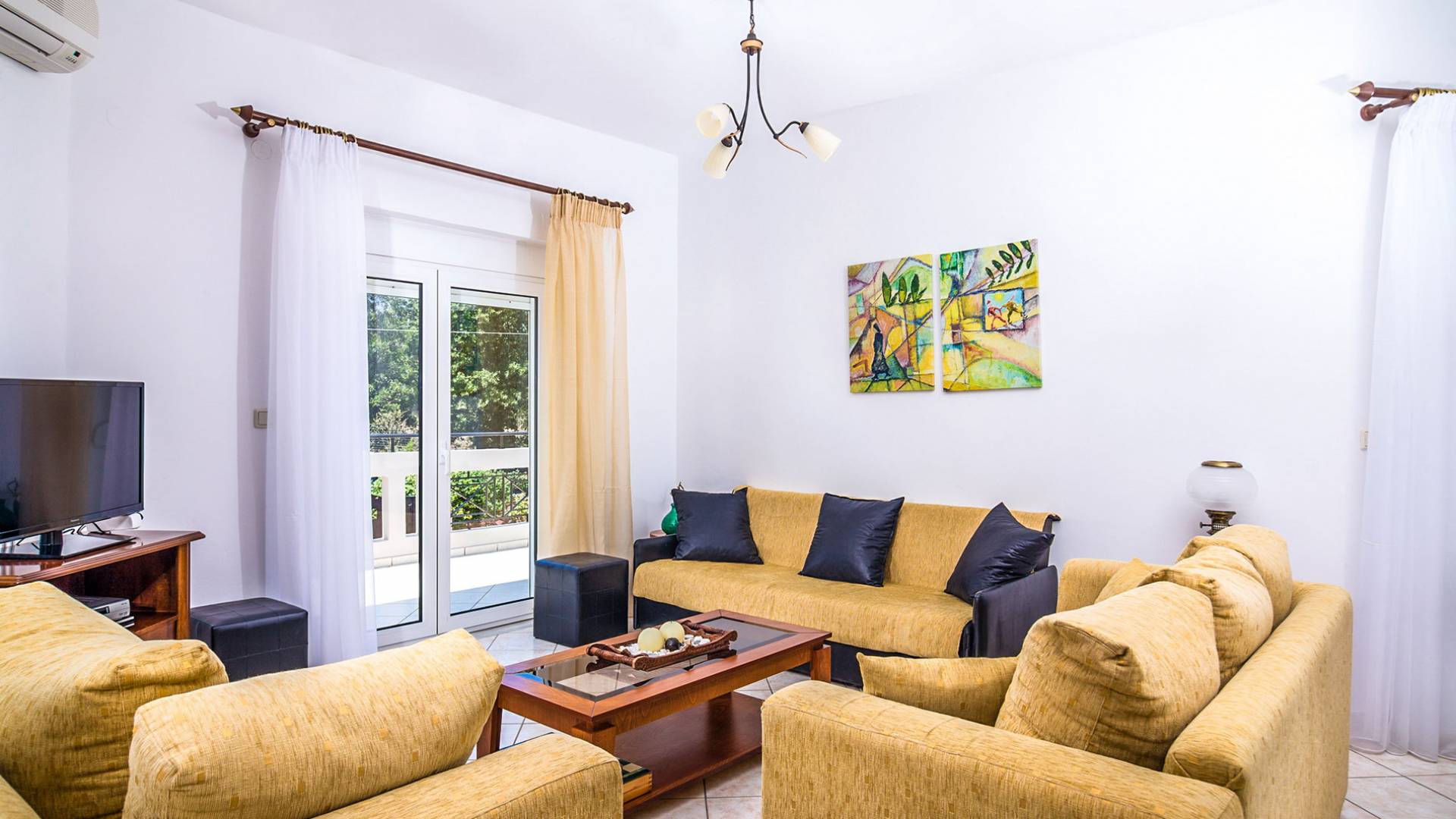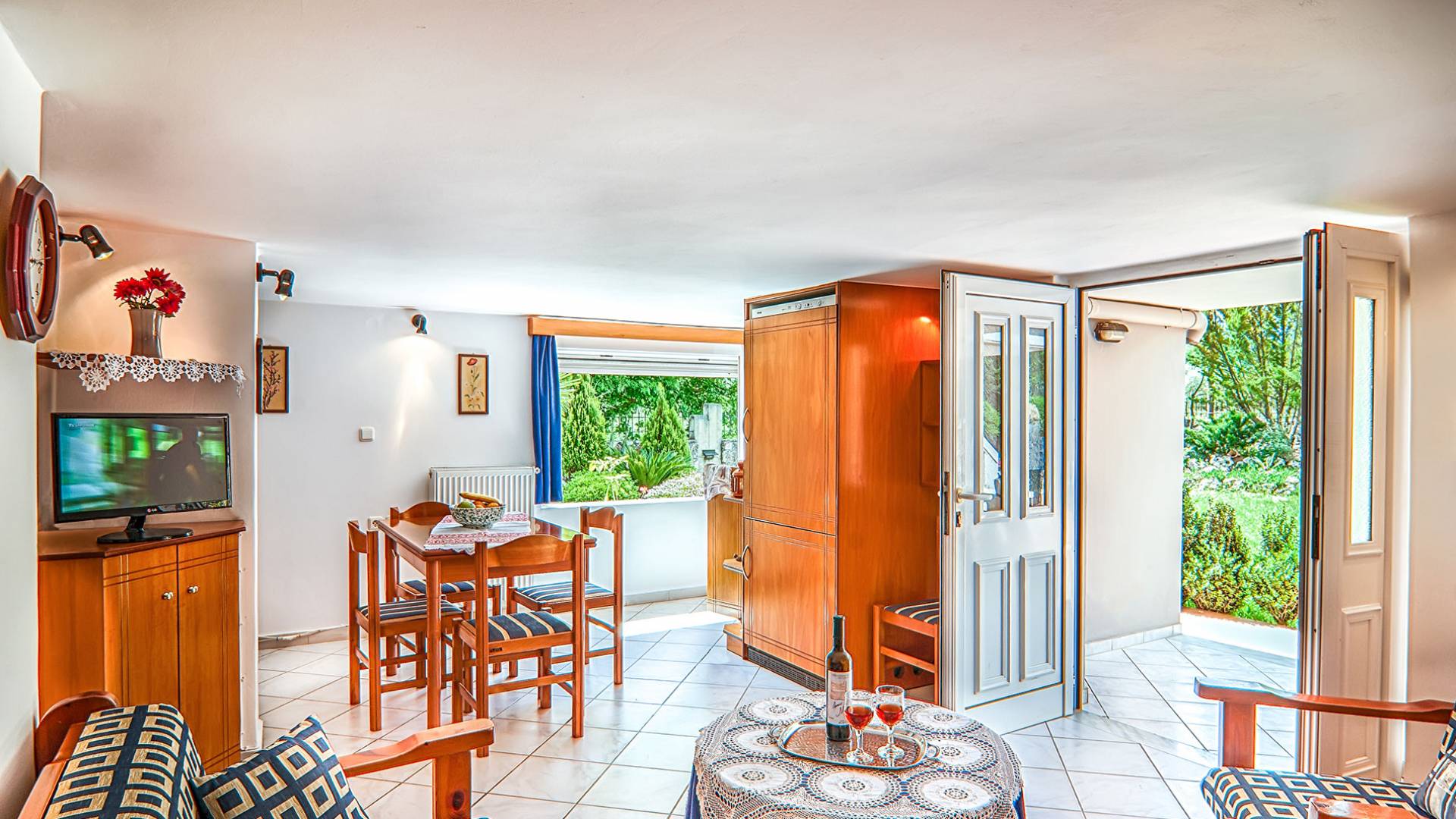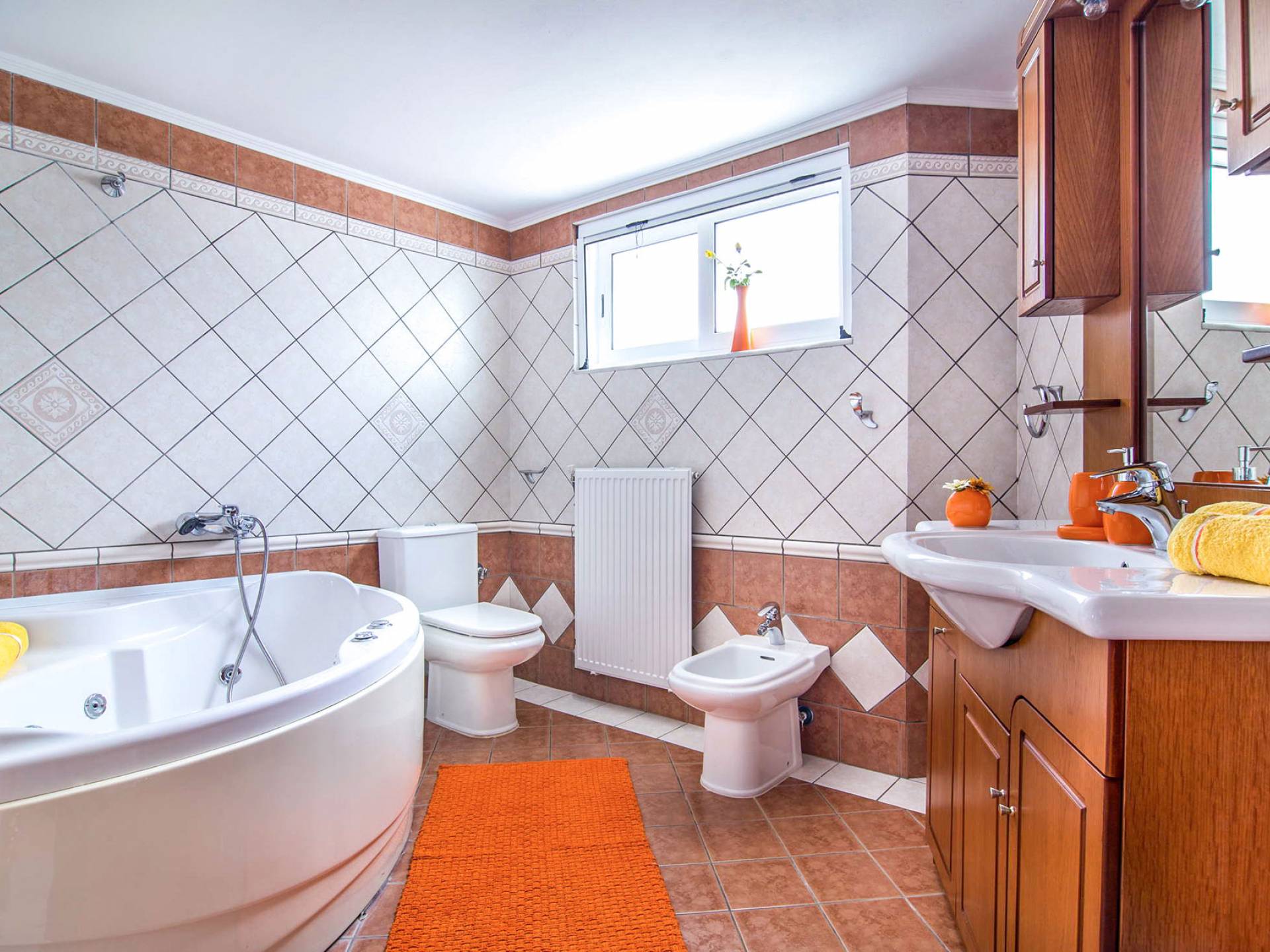 Marmortreppen führen in den zweiten Stock, wo sich drei schräge Schlafzimmer mit Holzdecke befinden, jedes mit einem eigenen großen Wandschrank und jedes mit einem separaten Balkon mit freiem Blick auf Apokoronas. Zwei der Zimmer verfügen über ein Doppelbett, das dritte über zwei Einzelbetten. Alle Schlafzimmer sind mit Klimaanlagen ausgestattet. Auf der gleichen Etage befindet sich das geräumige Hauptbadezimmer mit Whirlpool und einer Tuchwaschmaschine. Das Haus im Erdgeschoss ist eine schöne Herberge mit niedrigem Dach und einem Schlafzimmer, einer voll ausgestatteten Küche, einem Badezimmer und einem Wohnzimmer mit direktem Zugang zu den herrlichen Gärten der Villa. Das Schlafzimmer hat ein Doppelbett, einen großen Schrank und ist klimatisiert. Ebenfalls im Erdgeschoss befindet sich neben dem Hostel ein privater Raum, der auf Anfrage als Fitnessstudio für Personal Training dient.