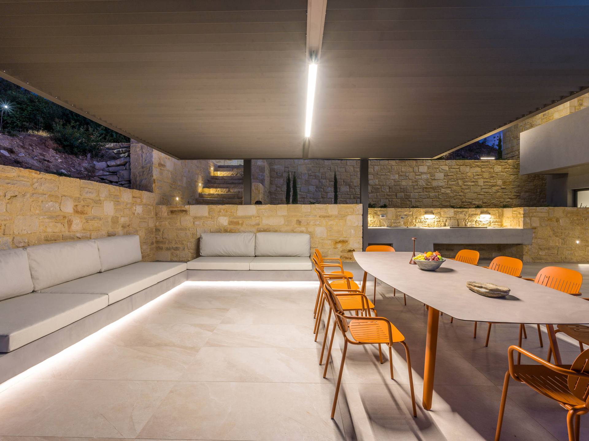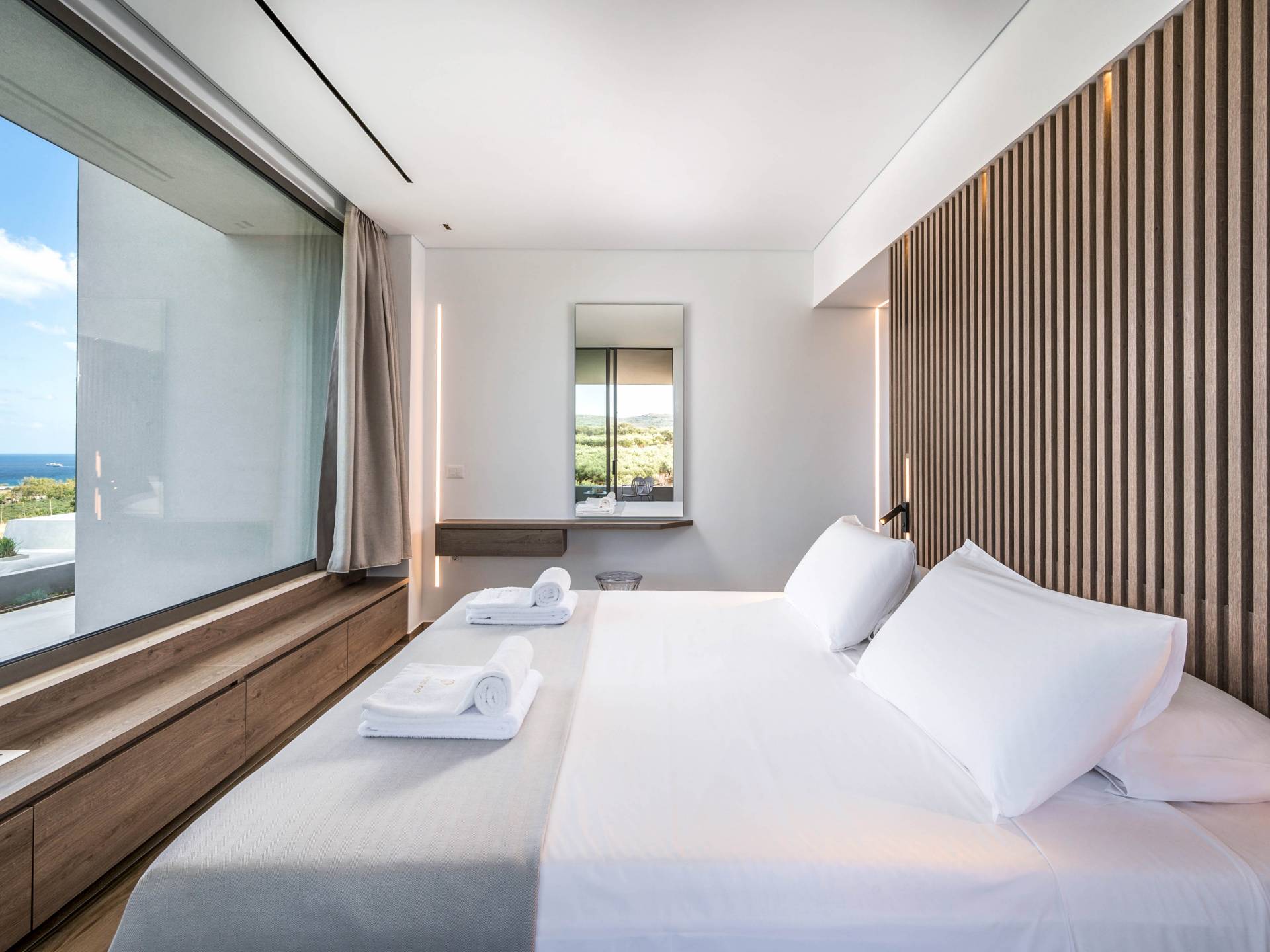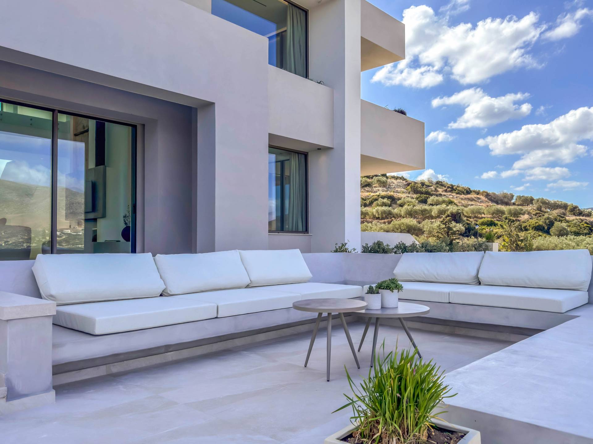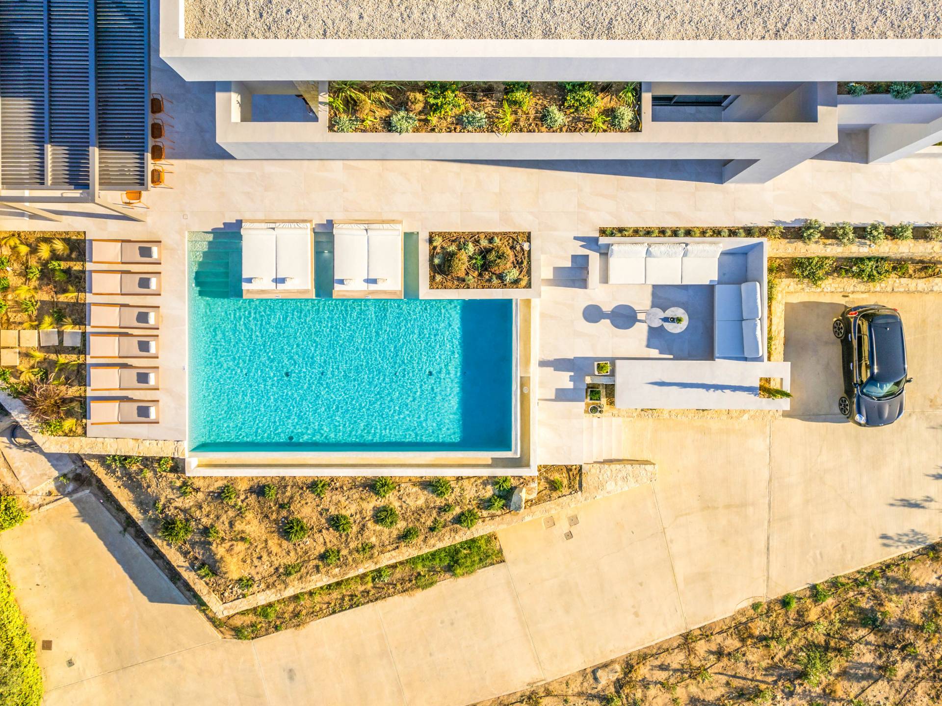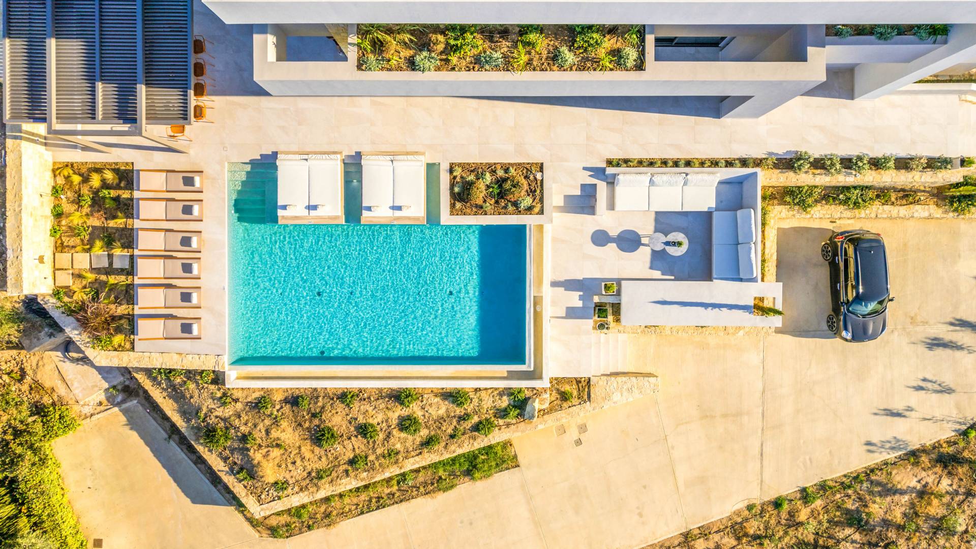 Die elegante Struktur der Villa fügt sich nahtlos in die Landschaft ein und die Außenfassade ergänzt das fabelhafte Interieur. Jedes Zimmer verfügt über eine Terrasse mit Blick auf die Ägäis. Ein schöner, von einer Pergola beschatteter Essbereich im Freien bietet Sitzgelegenheiten, Tische und Sofas im Freien, alles inmitten eines sorgfältig angelegten Gartens voller einheimischer Sträucher, Blumen und Bäume.