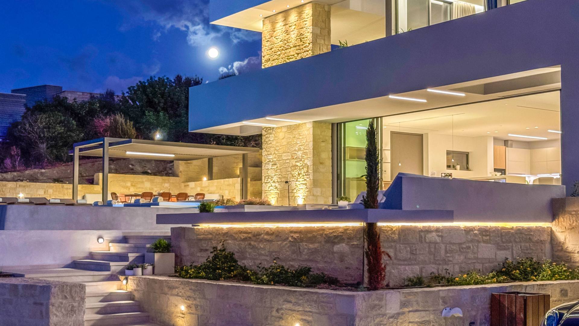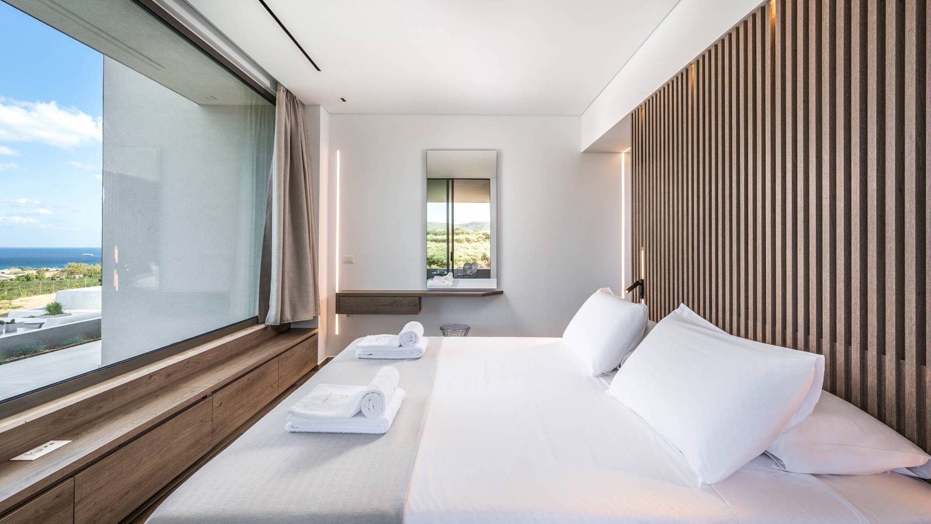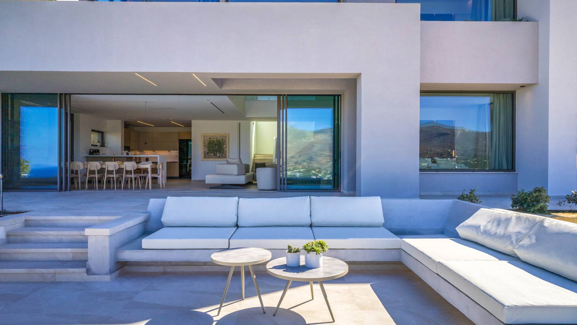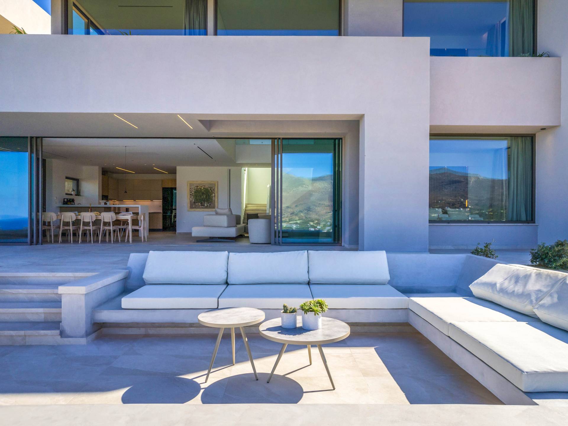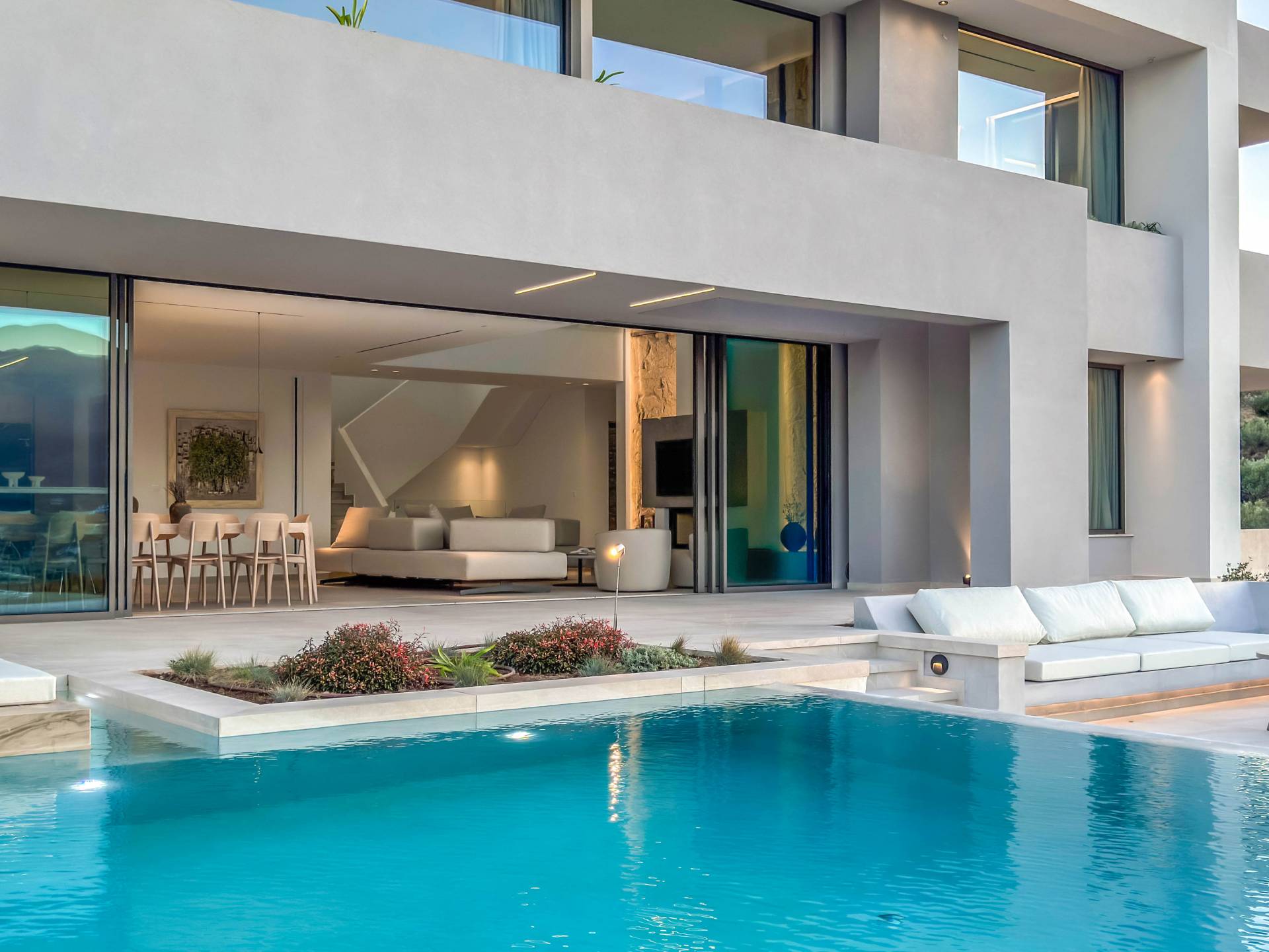 Die elegante Struktur der Villa fügt sich nahtlos in die Landschaft ein und die Außenfassade ergänzt das fabelhafte Interieur. Jedes Zimmer verfügt über eine Terrasse mit Blick auf die Ägäis. Ein schöner, von einer Pergola beschatteter Essbereich im Freien bietet Sitzgelegenheiten, Tische und Sofas im Freien, alles inmitten eines sorgfältig angelegten Gartens voller einheimischer Sträucher, Blumen und Bäume.