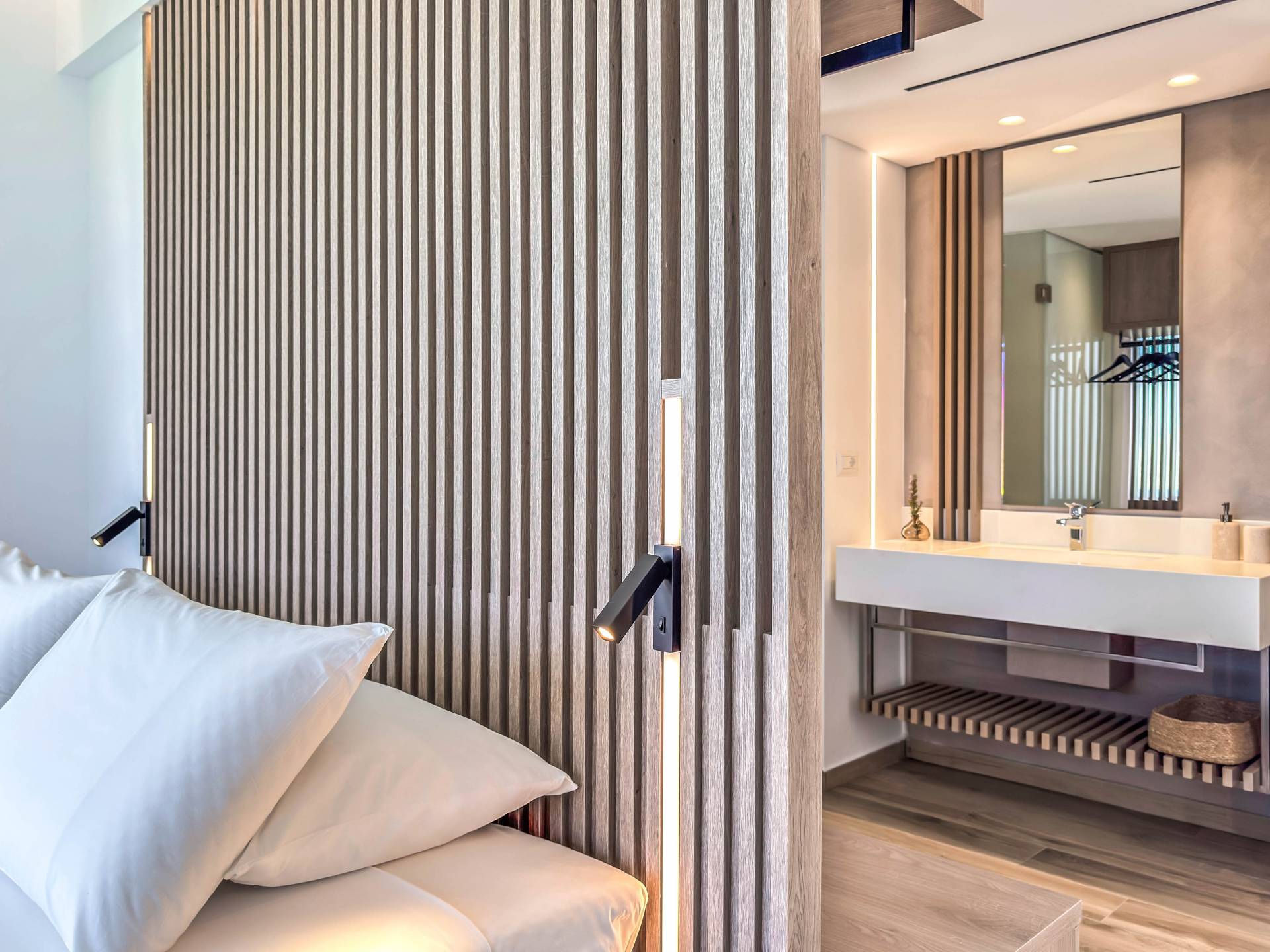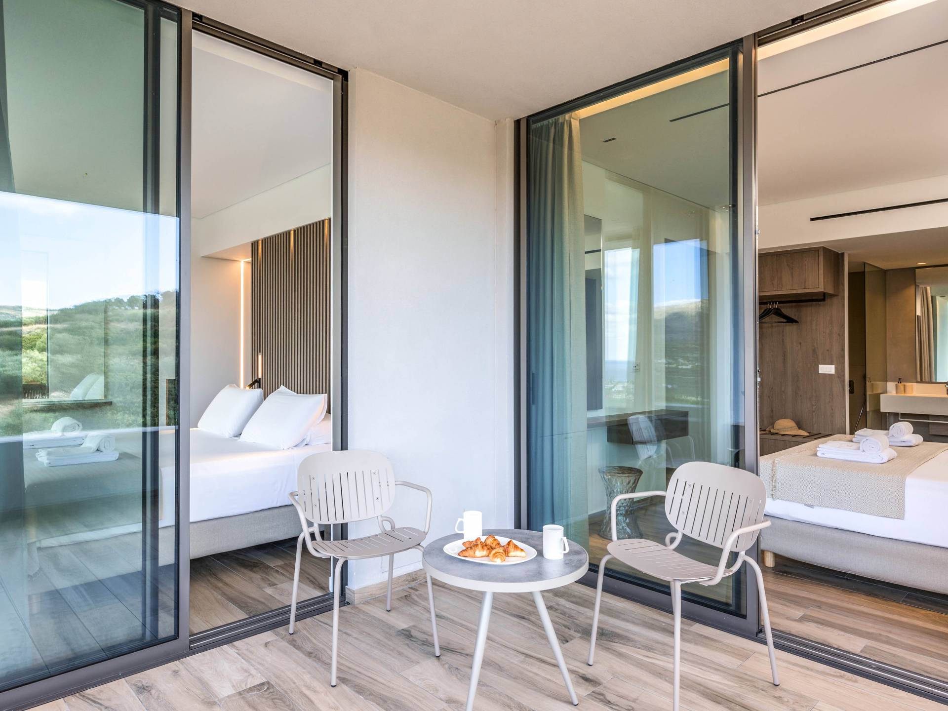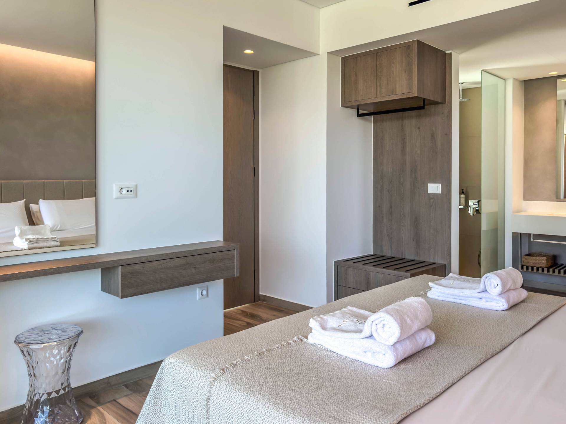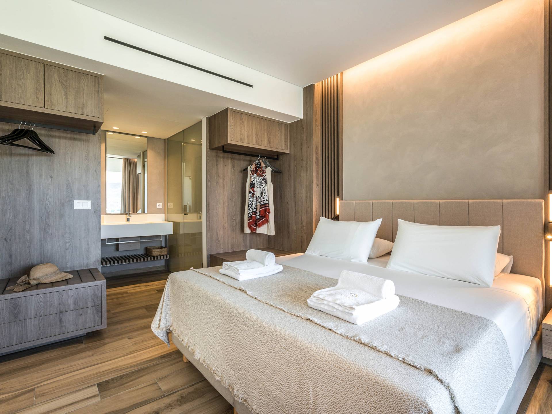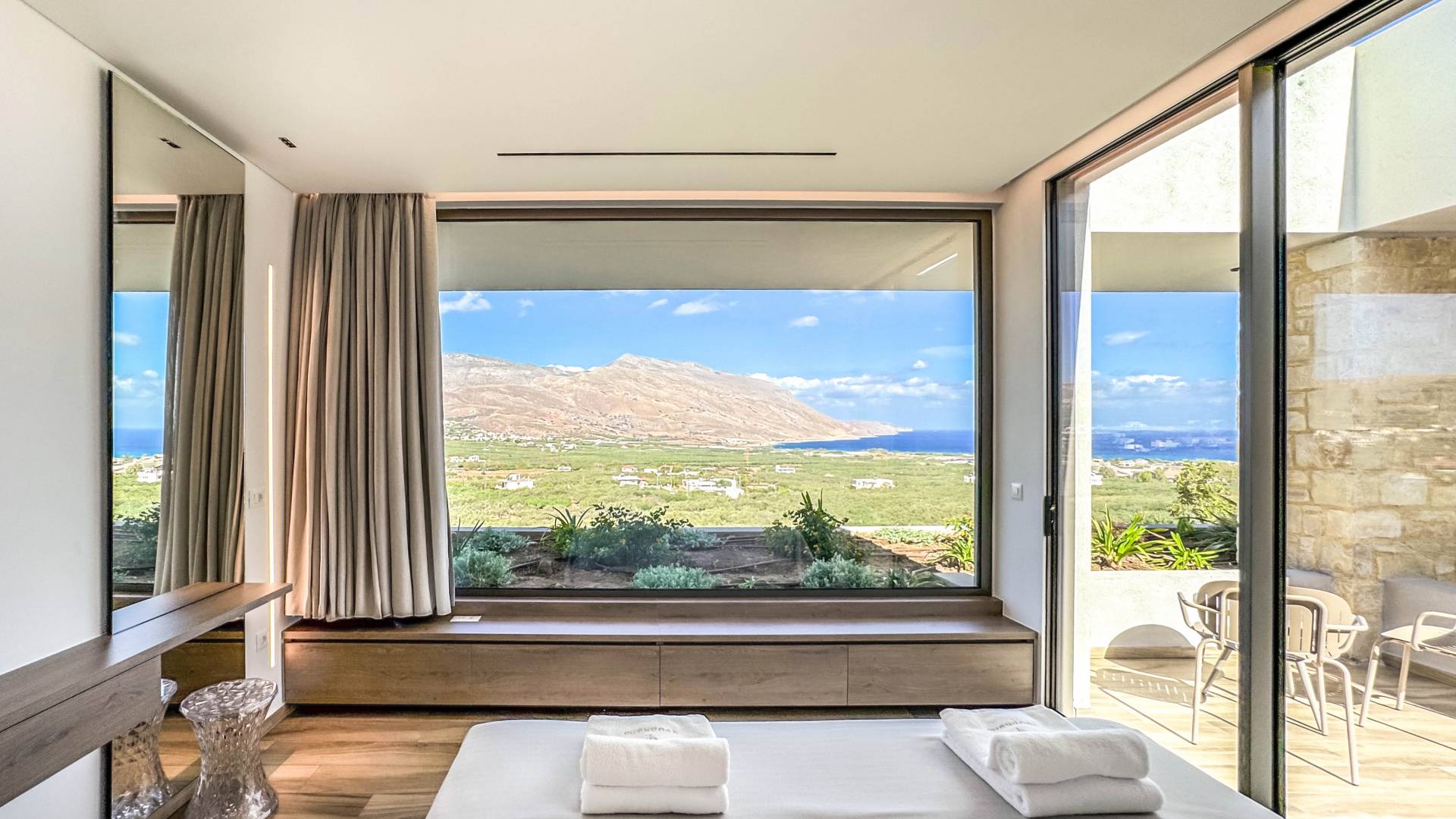 Die elegante Struktur der Villa fügt sich nahtlos in die Landschaft ein und die Außenfassade ergänzt das fabelhafte Interieur. Jedes Zimmer verfügt über eine Terrasse mit Blick auf die Ägäis. Ein schöner, von einer Pergola beschatteter Essbereich im Freien bietet Sitzgelegenheiten, Tische und Sofas im Freien, alles inmitten eines sorgfältig angelegten Gartens voller einheimischer Sträucher, Blumen und Bäume.