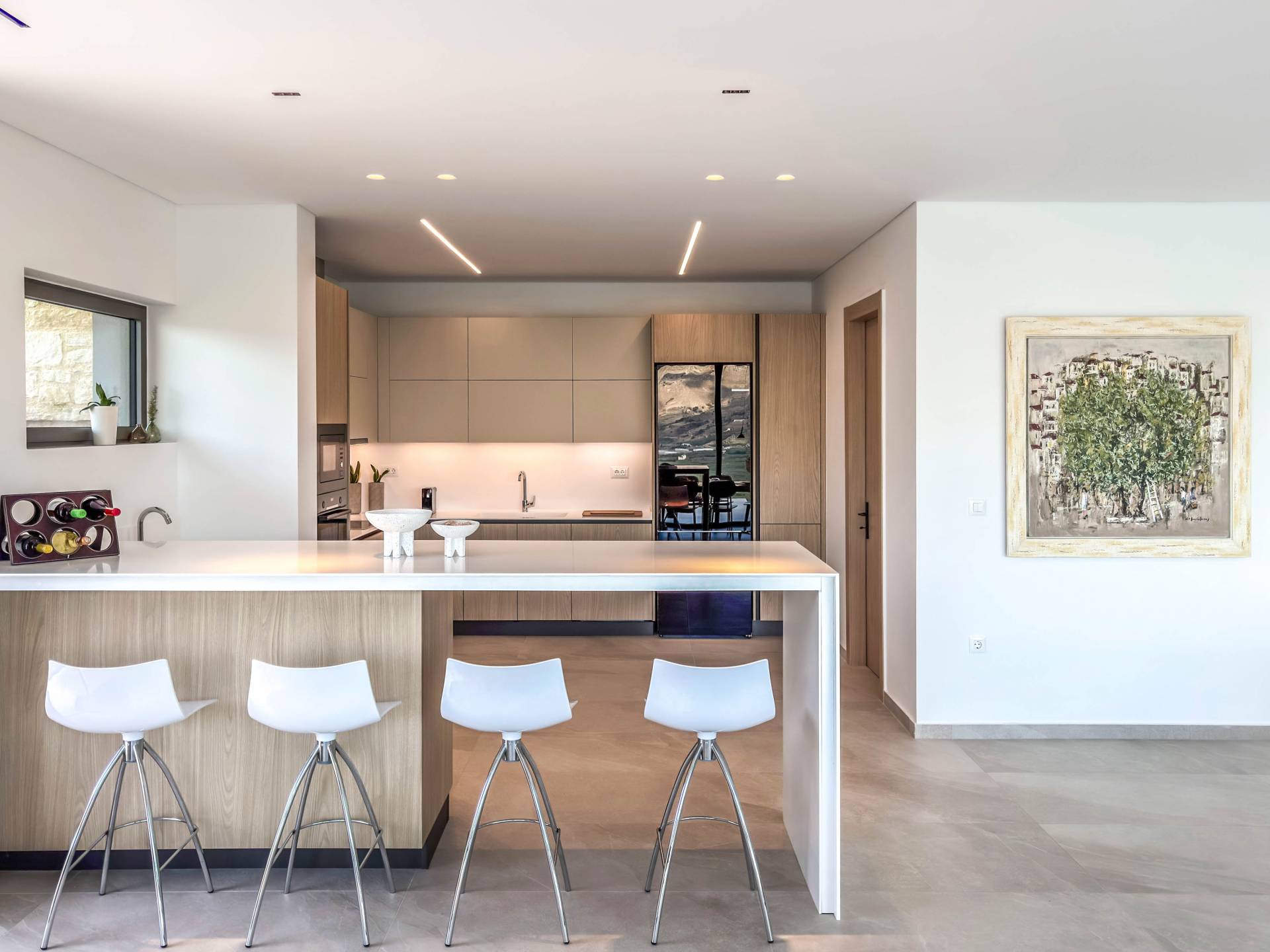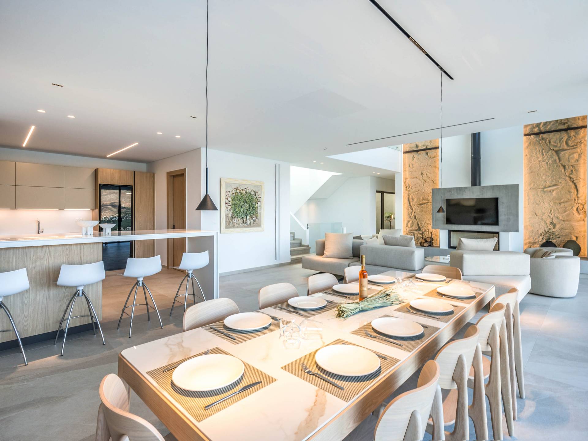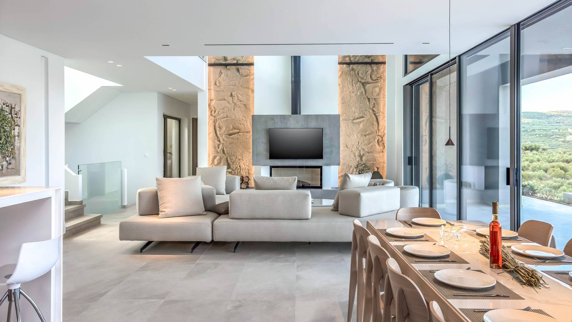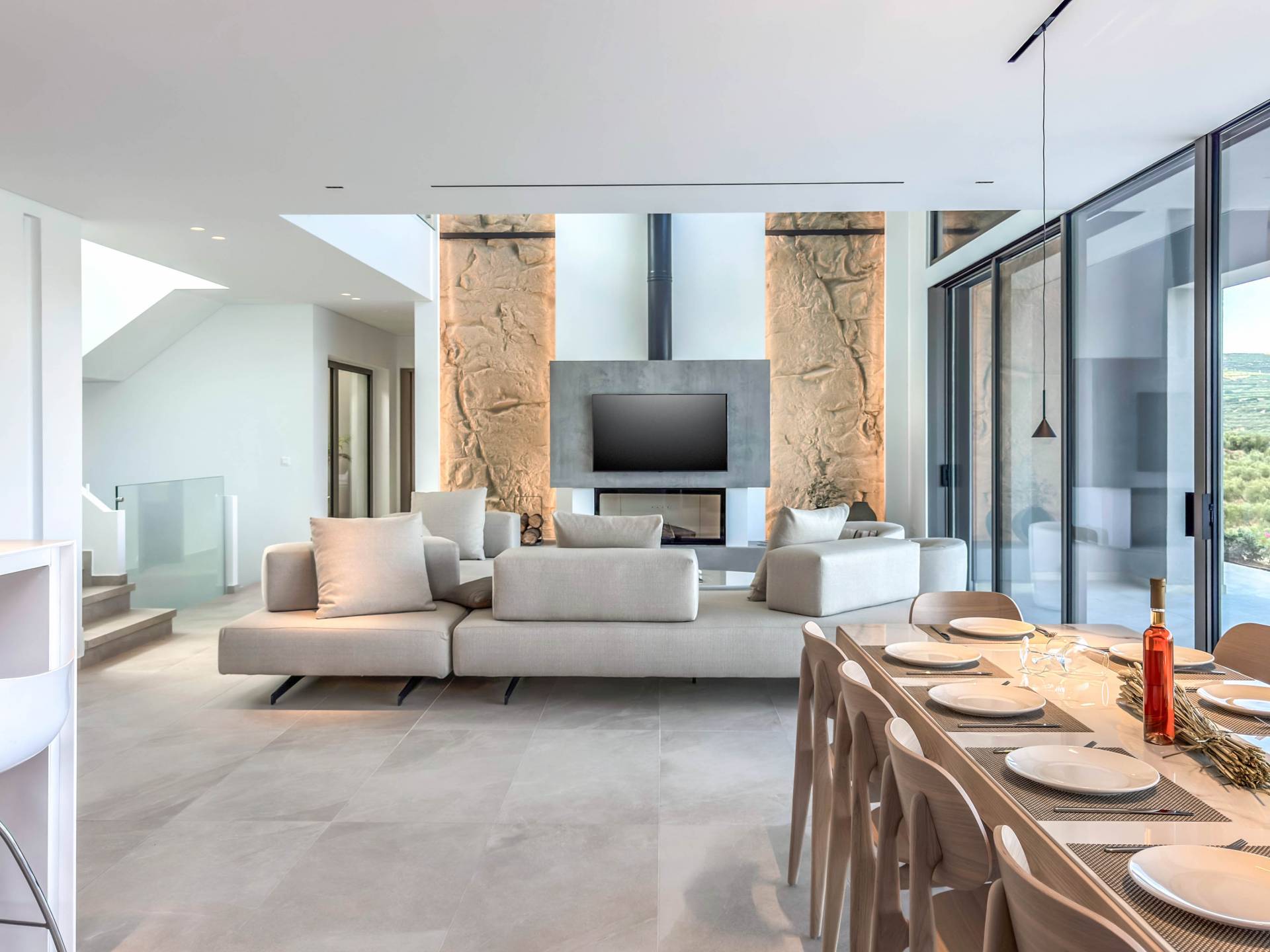 Im Inneren der Villa befindet sich eine geräumige, offene Küche mit modernen Geräten und großen Arbeitsflächen. Die Küche grenzt an einen Essbereich und eine Lounge, die um einen umweltfreundlichen Kamin herum angeordnet sind. Utopia bietet Platz für bis zu 10 Gäste und jedes Schlafzimmer ist ein luxuriöser Rückzugsort mit eigenem Bad mit Dusche und atemberaubendem Blick auf das Meer und die Berge.
