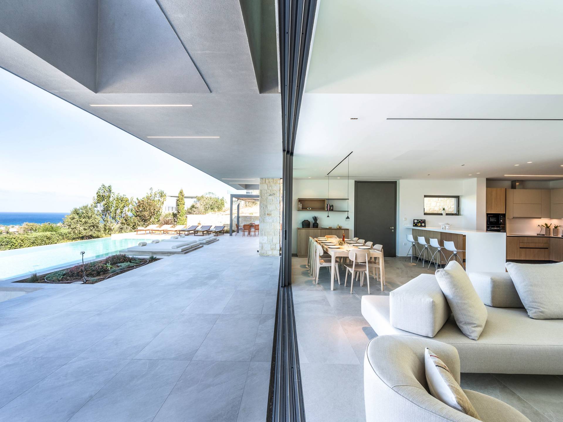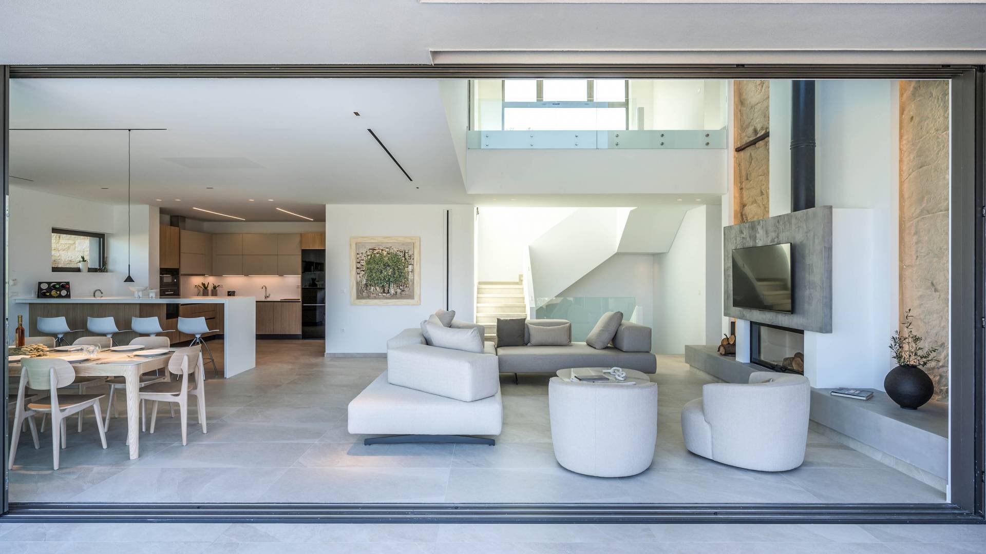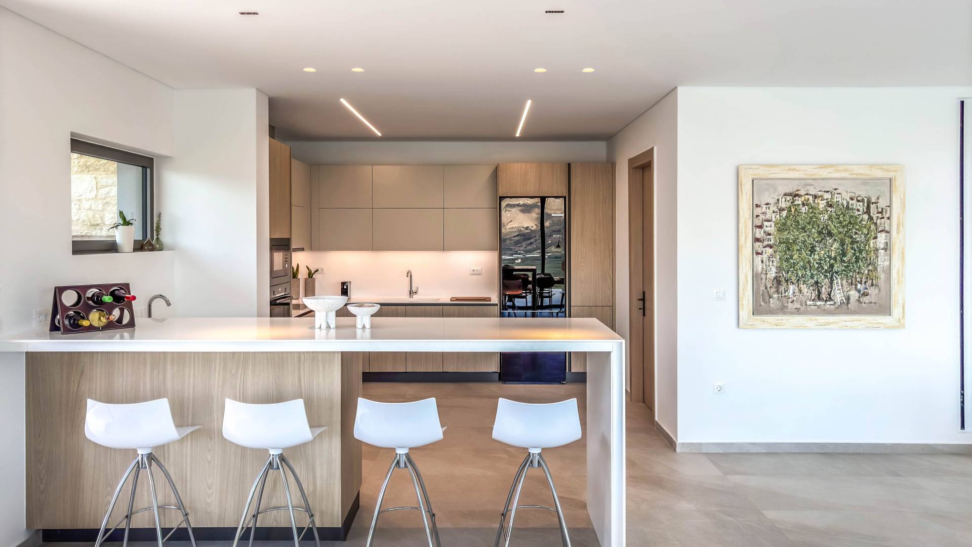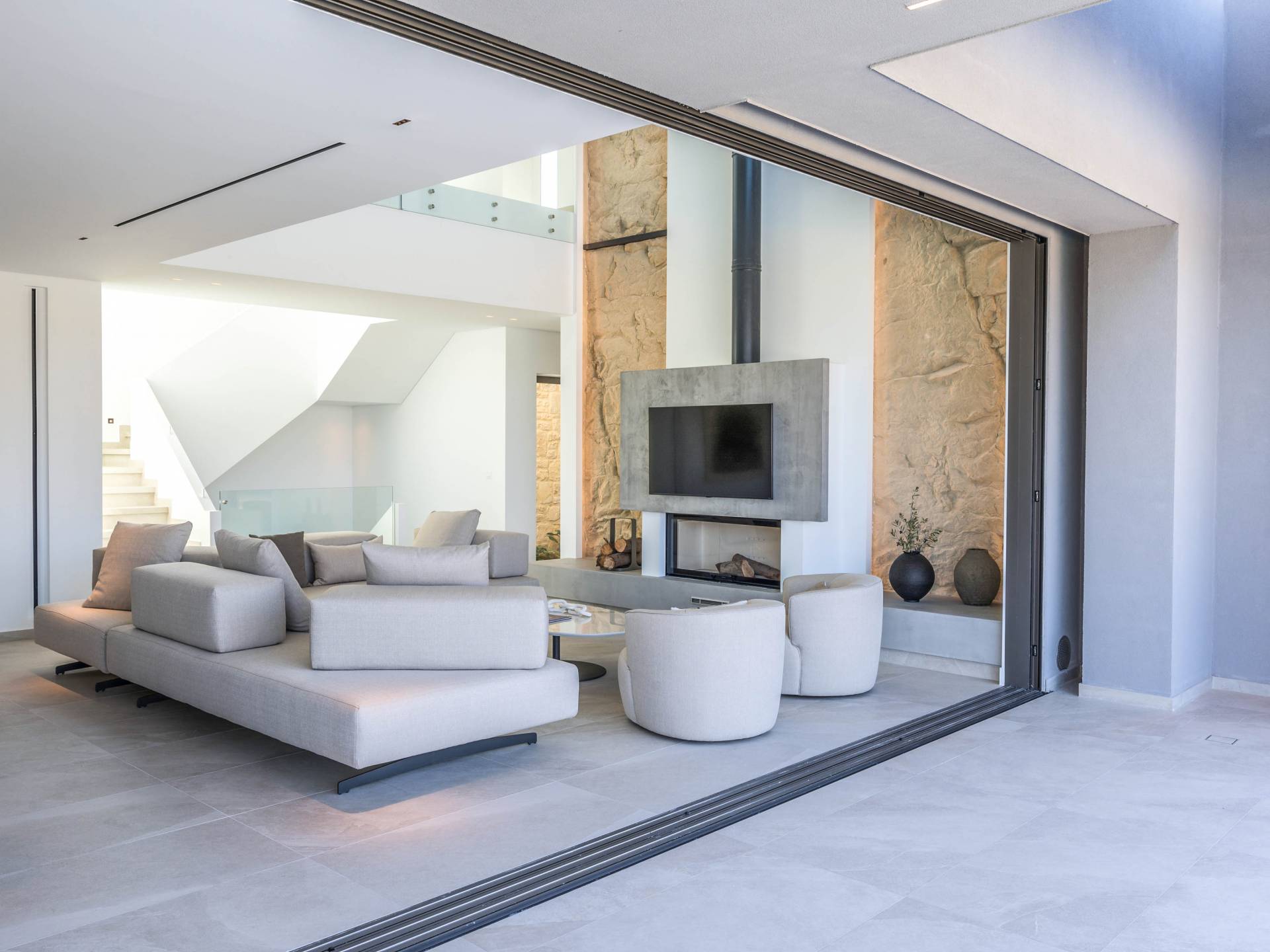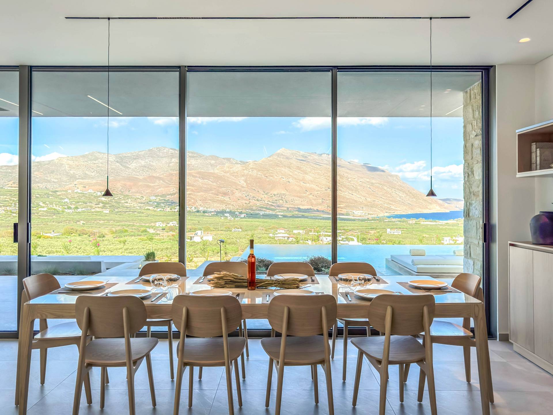 Im Inneren der Villa befindet sich eine geräumige, offene Küche mit modernen Geräten und großen Arbeitsflächen. Die Küche grenzt an einen Essbereich und eine Lounge, die um einen umweltfreundlichen Kamin herum angeordnet sind. Utopia bietet Platz für bis zu 10 Gäste und jedes Schlafzimmer ist ein luxuriöser Rückzugsort mit eigenem Bad mit Dusche und atemberaubendem Blick auf das Meer und die Berge.