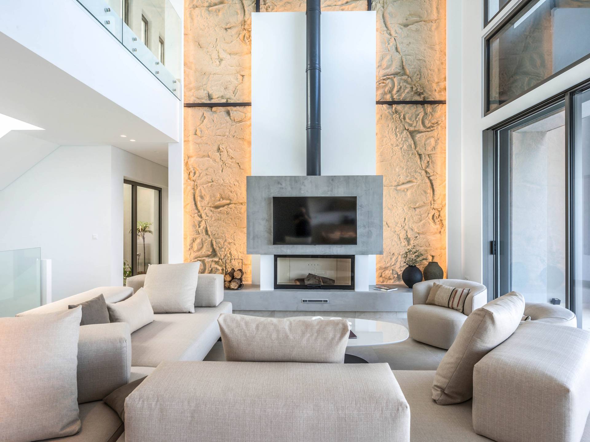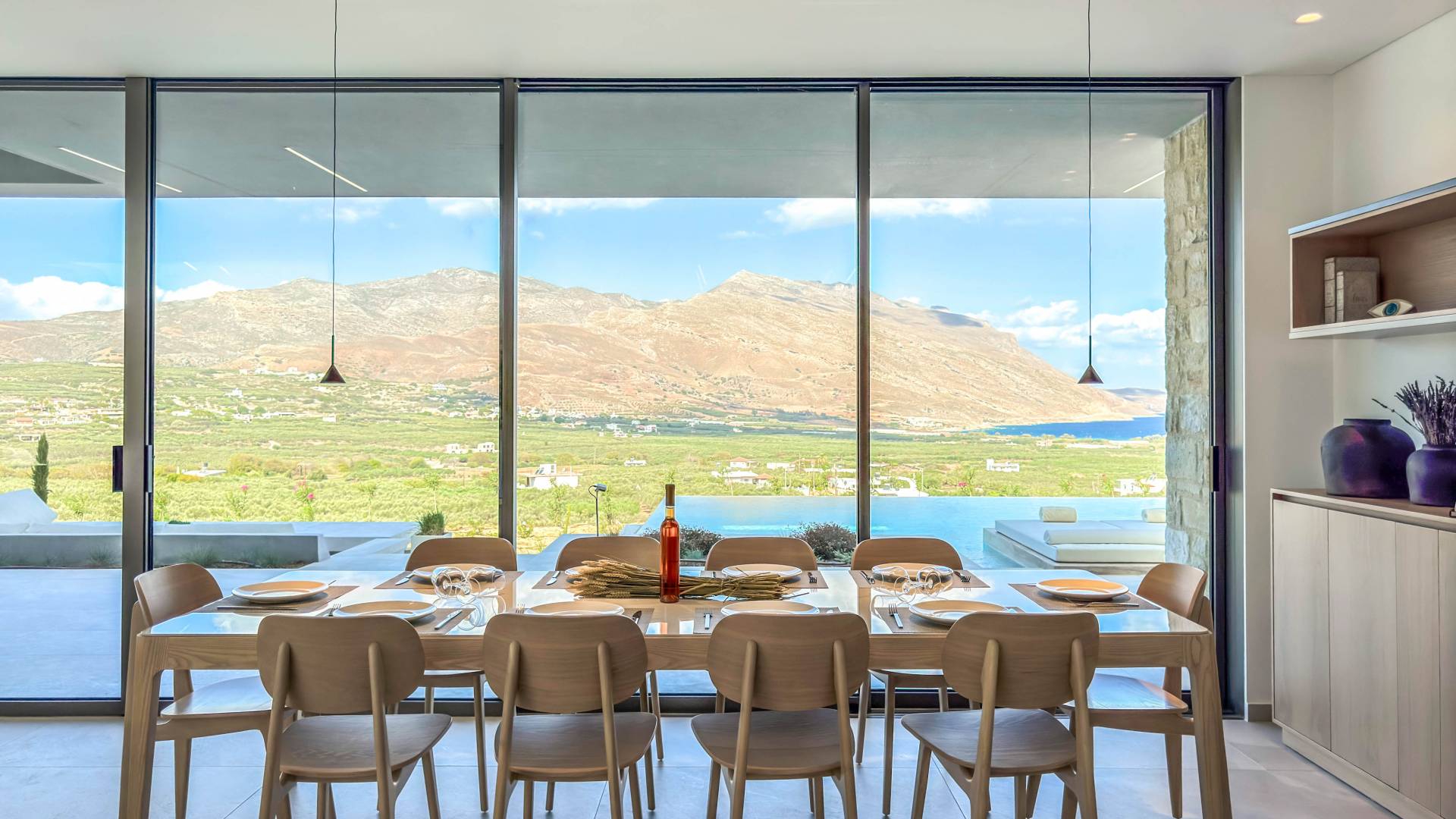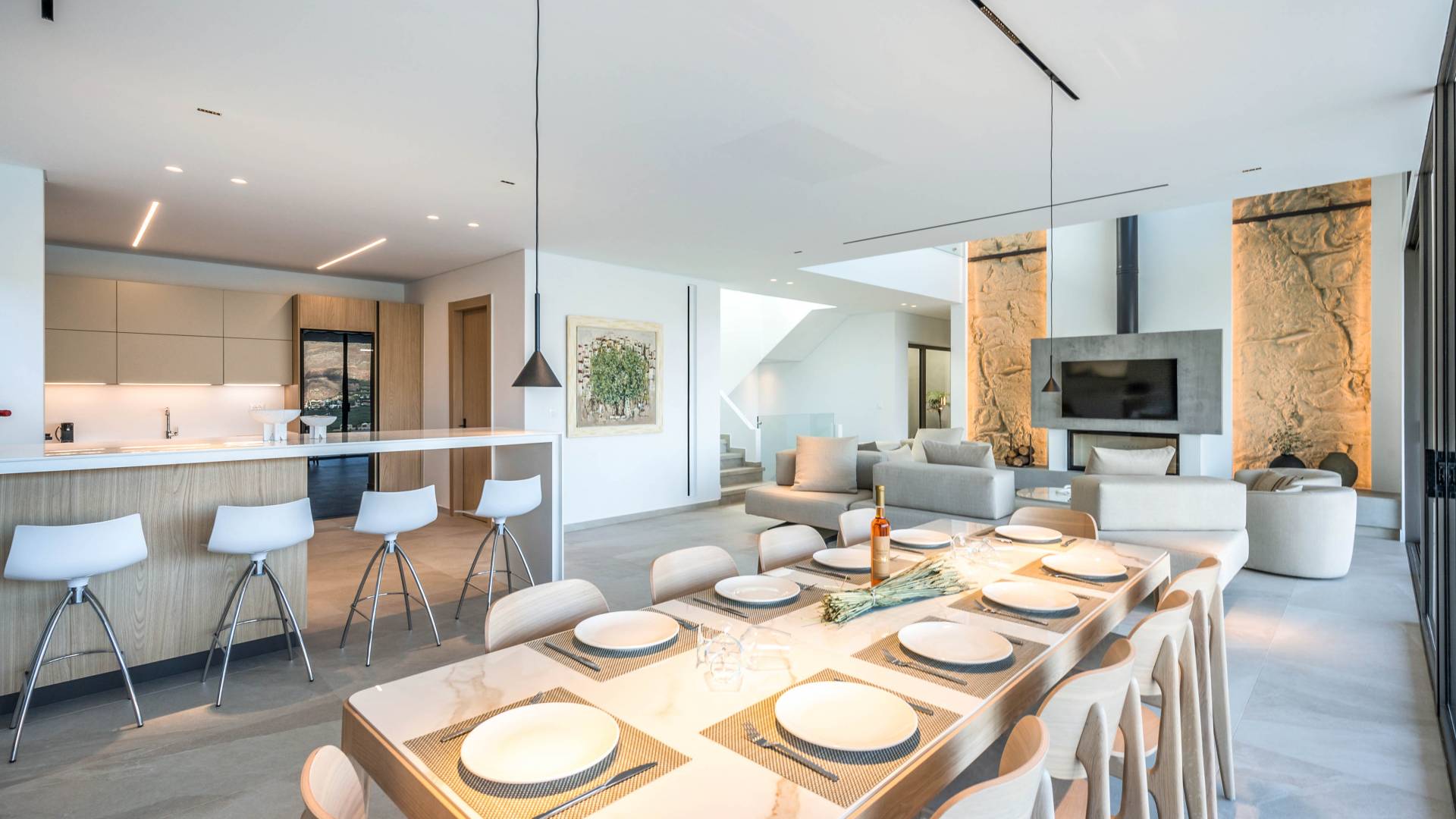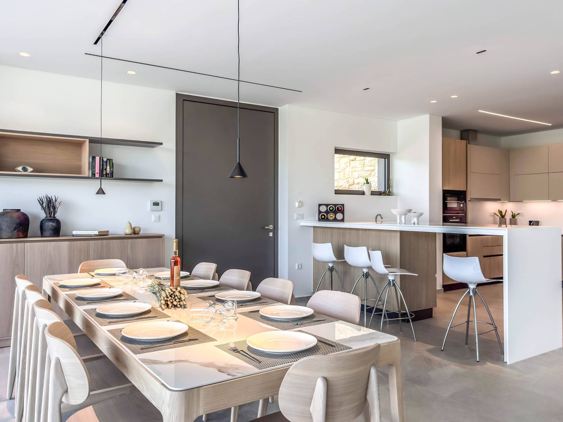 Im Inneren der Villa befindet sich eine geräumige, offene Küche mit modernen Geräten und großen Arbeitsflächen. Die Küche grenzt an einen Essbereich und eine Lounge, die um einen umweltfreundlichen Kamin herum angeordnet sind. Utopia bietet Platz für bis zu 10 Gäste und jedes Schlafzimmer ist ein luxuriöser Rückzugsort mit eigenem Bad mit Dusche und atemberaubendem Blick auf das Meer und die Berge.