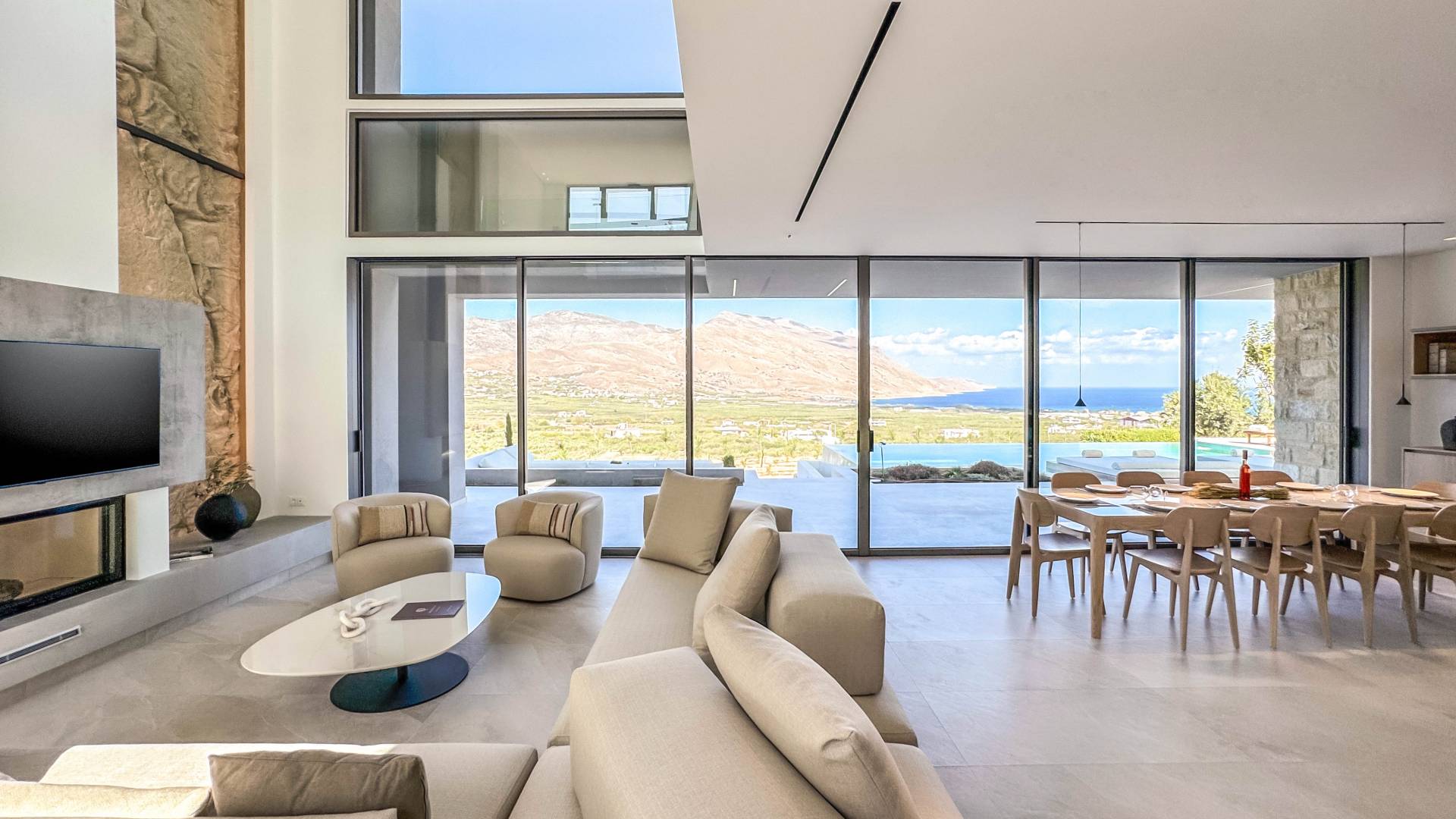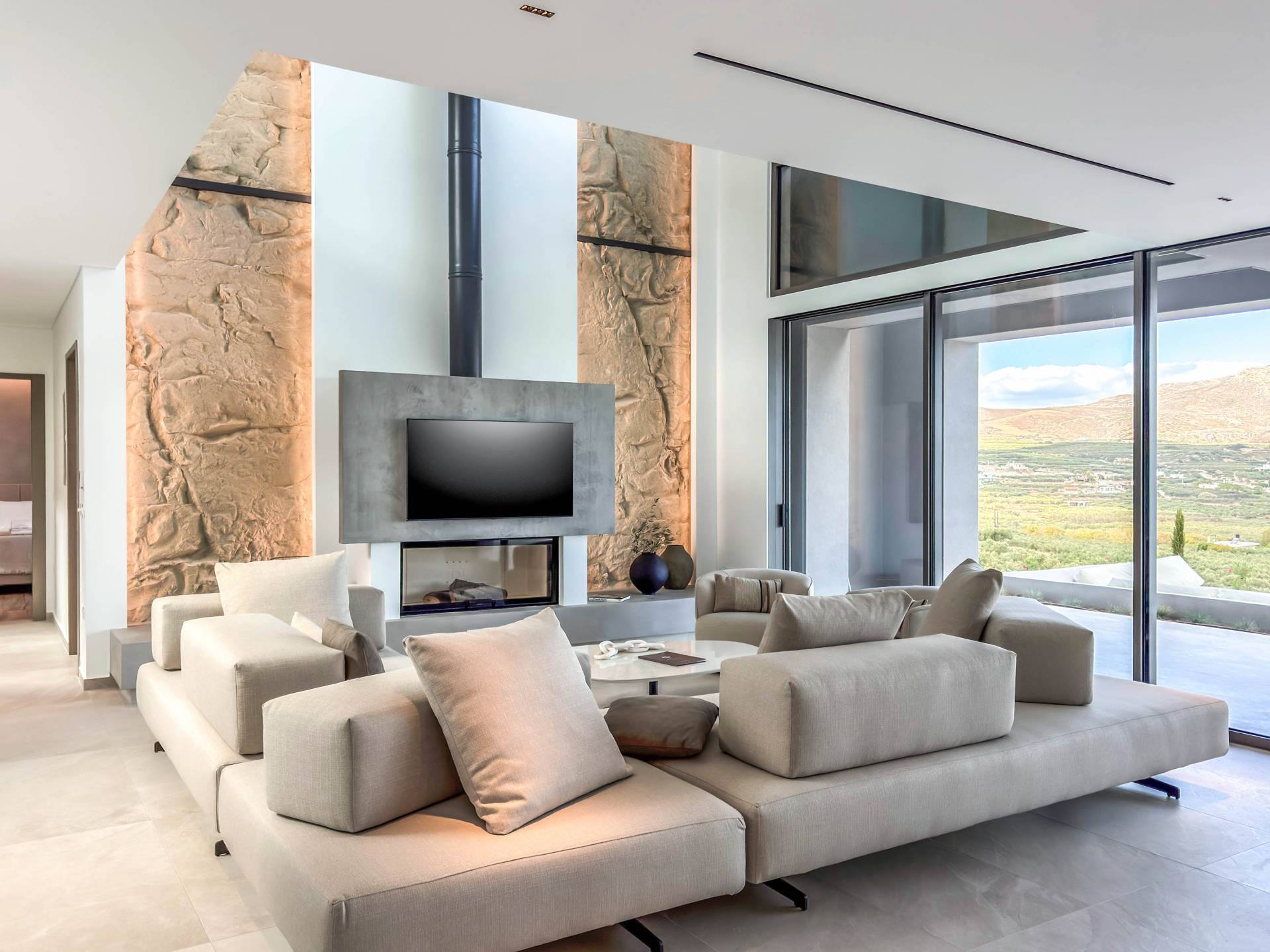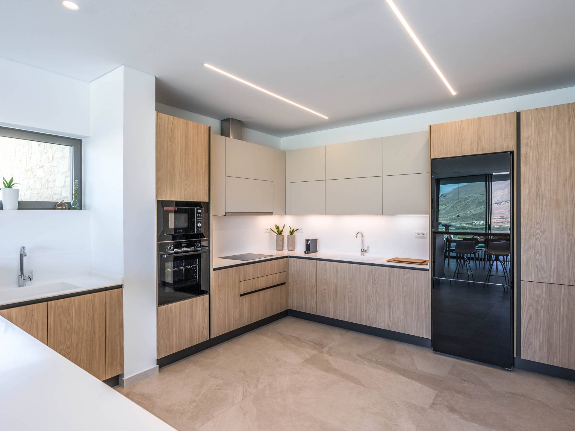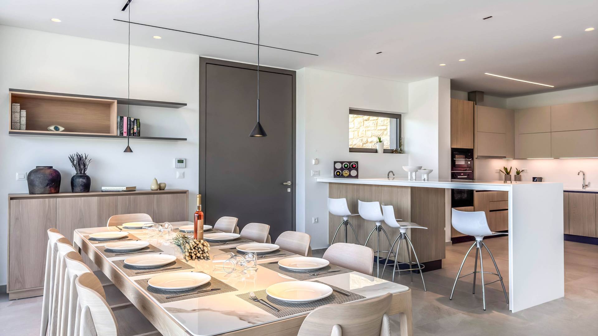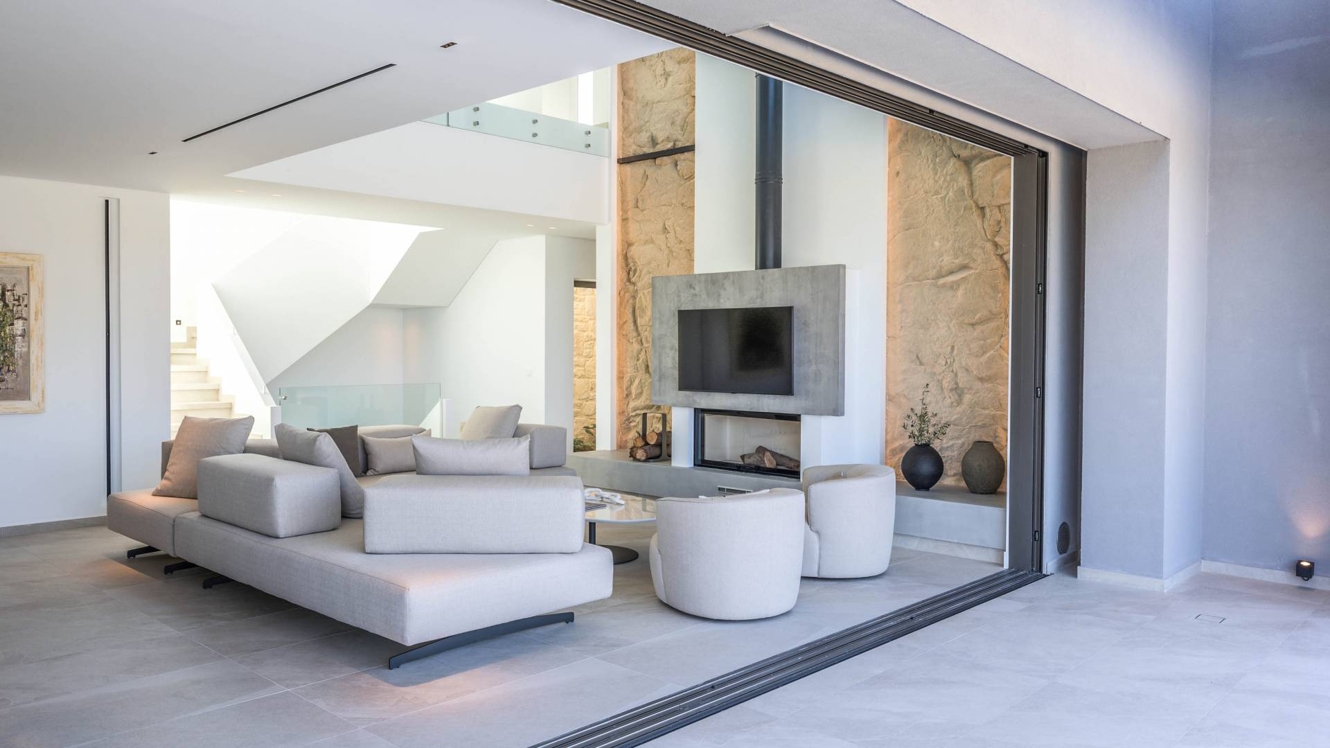 Im Inneren der Villa befindet sich eine geräumige, offene Küche mit modernen Geräten und großen Arbeitsflächen. Die Küche grenzt an einen Essbereich und eine Lounge, die um einen umweltfreundlichen Kamin herum angeordnet sind. Utopia bietet Platz für bis zu 10 Gäste und jedes Schlafzimmer ist ein luxuriöser Rückzugsort mit eigenem Bad mit Dusche und atemberaubendem Blick auf das Meer und die Berge.