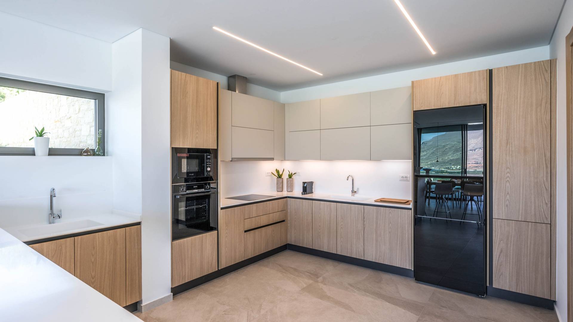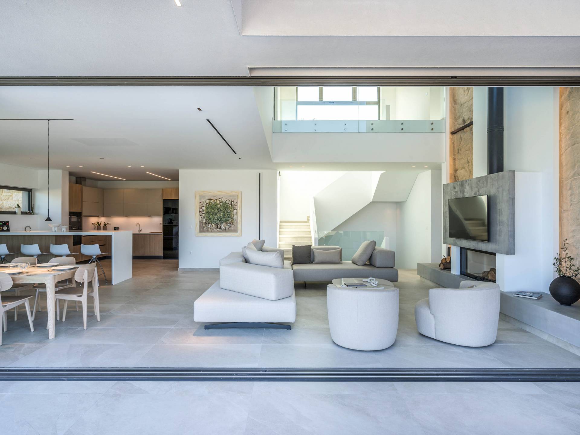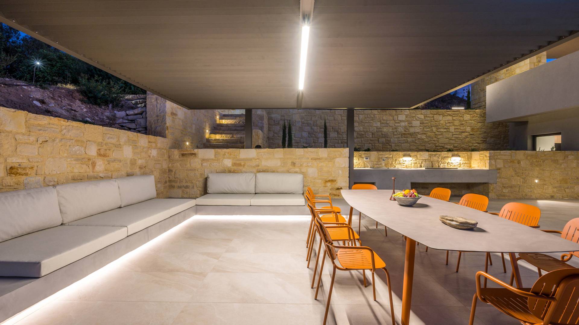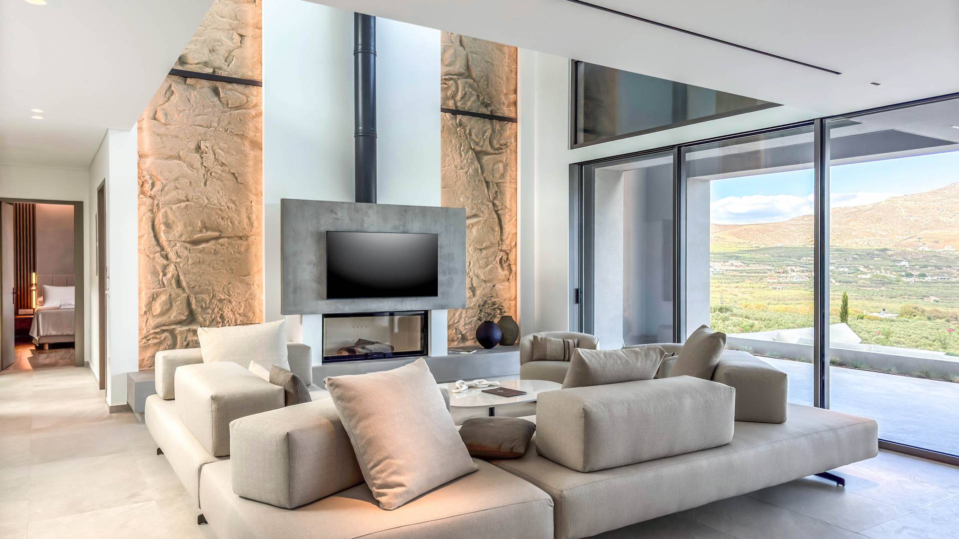 Im Inneren der Villa befindet sich eine geräumige, offene Küche mit modernen Geräten und großen Arbeitsflächen. Die Küche grenzt an einen Essbereich und eine Lounge, die um einen umweltfreundlichen Kamin herum angeordnet sind. Utopia bietet Platz für bis zu 10 Gäste und jedes Schlafzimmer ist ein luxuriöser Rückzugsort mit eigenem Bad mit Dusche und atemberaubendem Blick auf das Meer und die Berge.