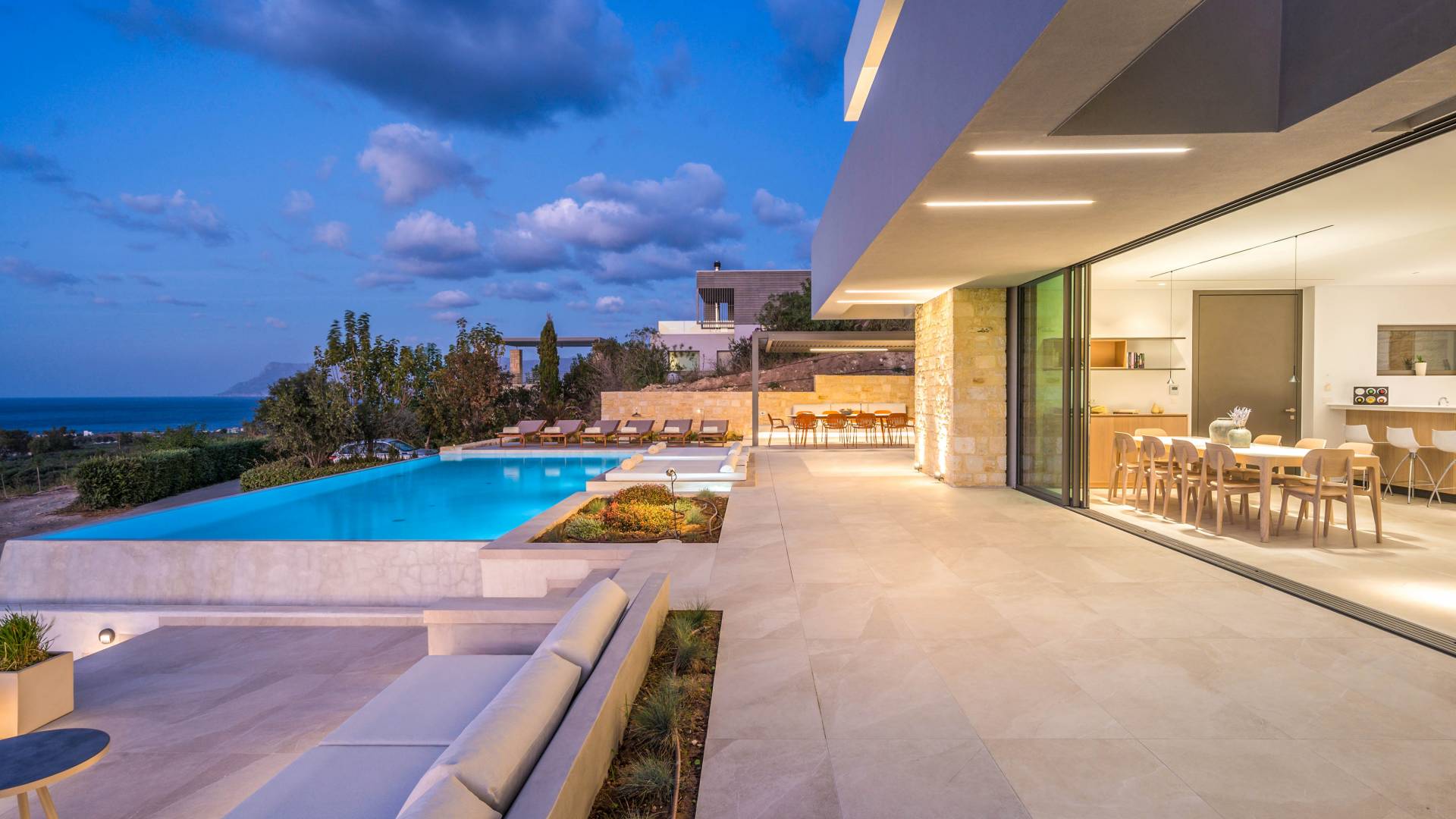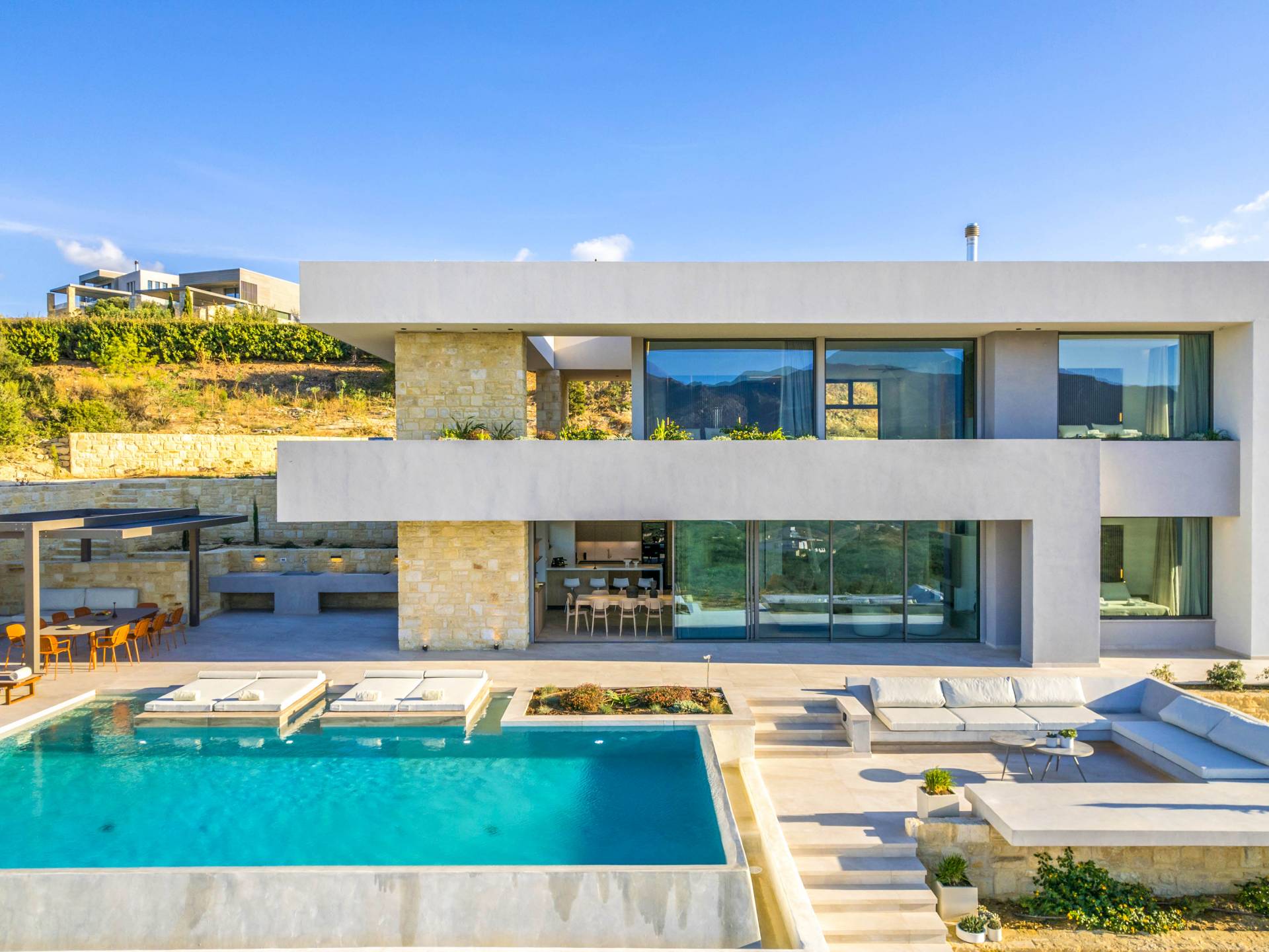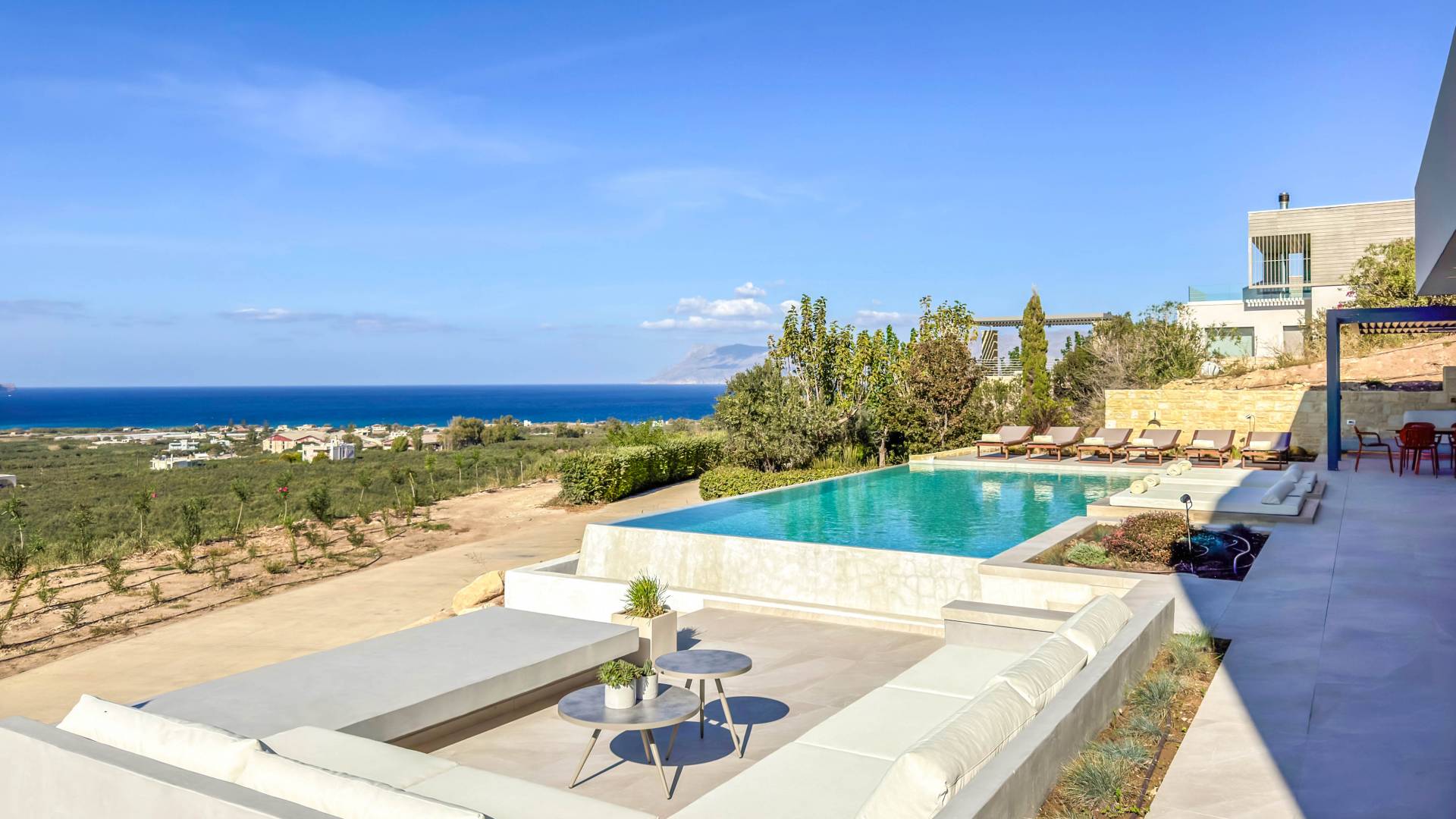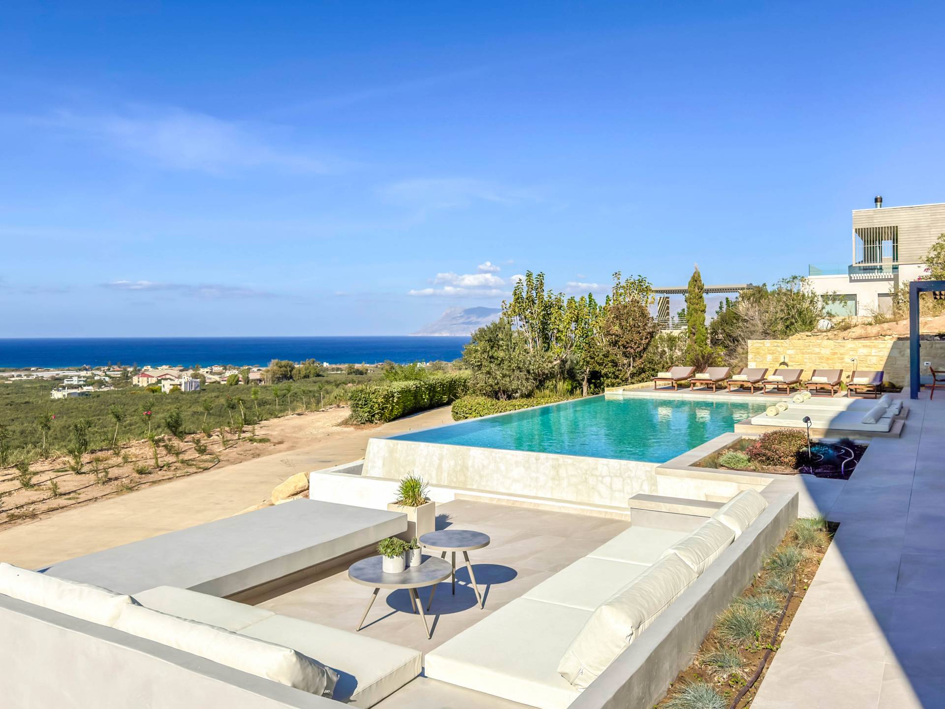 Die ultramoderne und stilvolle Villa mit fünf Schlafzimmern bietet einen ungehinderten Blick über den grünen Glanz der Olivenbäume auf die Bucht von Kissamos und das atemberaubende türkisfarbene Meer. Der weitläufige Außenbereich ist um einen 50 Quadratmeter großen Swimmingpool herum angeordnet. Utopia ist unsere größte Villa mit Meerblick am Hang. Das Schwesterobjekt Majestic liegt etwas höher am Hang.