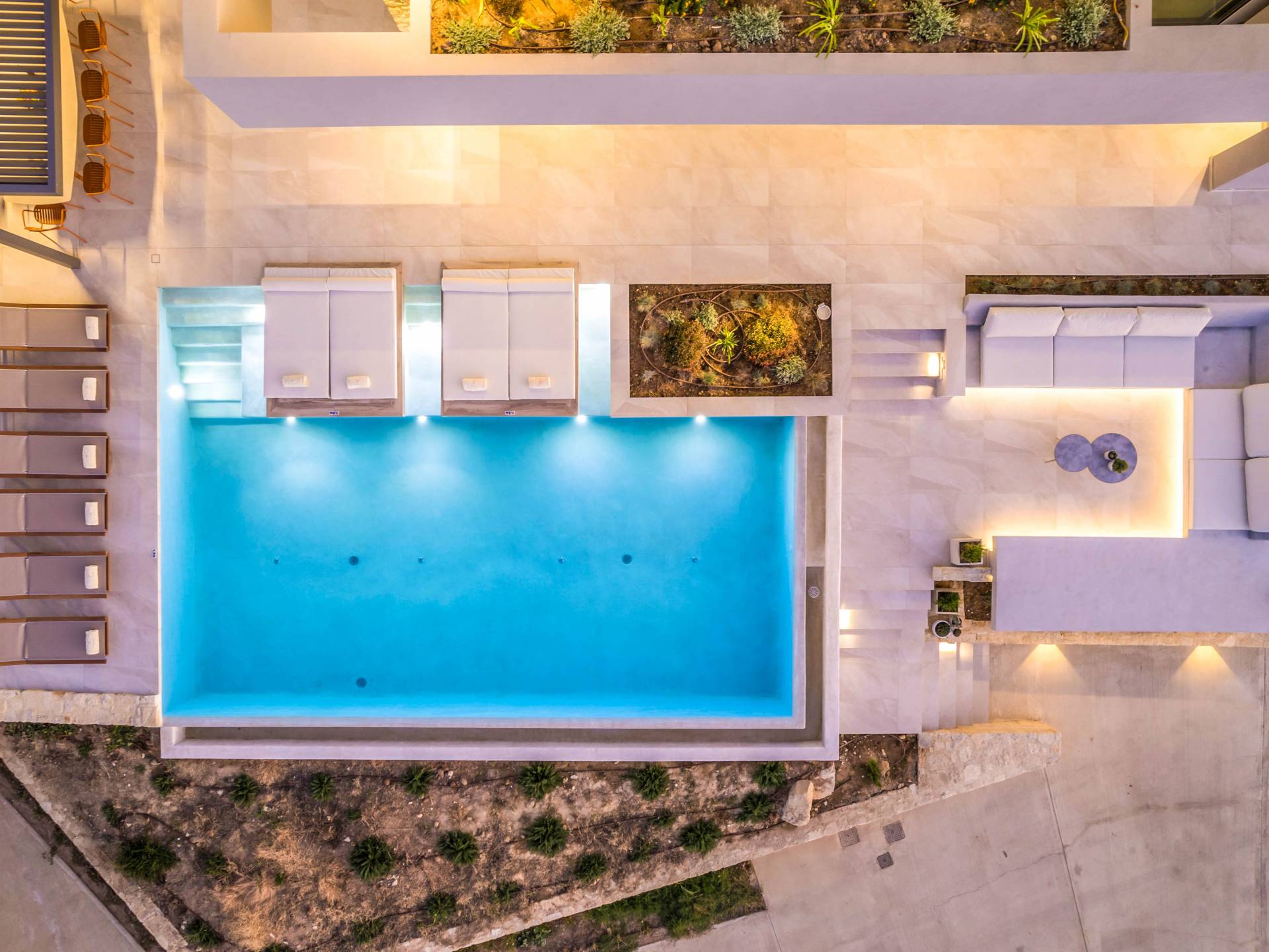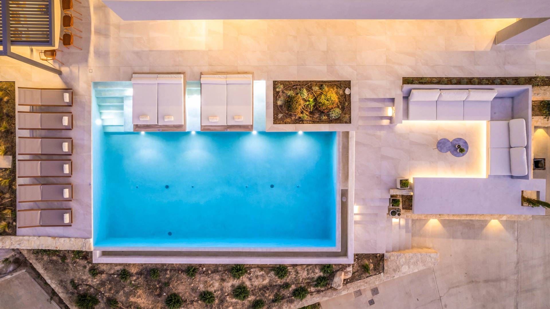 Ob Sie draußen im Pool entspannen oder auf den Sonnenliegen und Matratzen am Pool faulenzen, die geräumigen Innen- und Außenbereiche sind leicht zugänglich. Blass getünchte Wände kontrastieren wunderbar mit natürlichem Mauerwerk und der riesige Pool spiegelt die wahre verträumte Schönheit Utopiens wider.