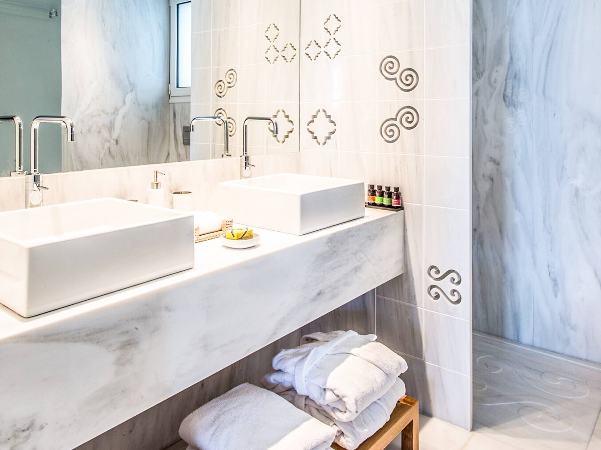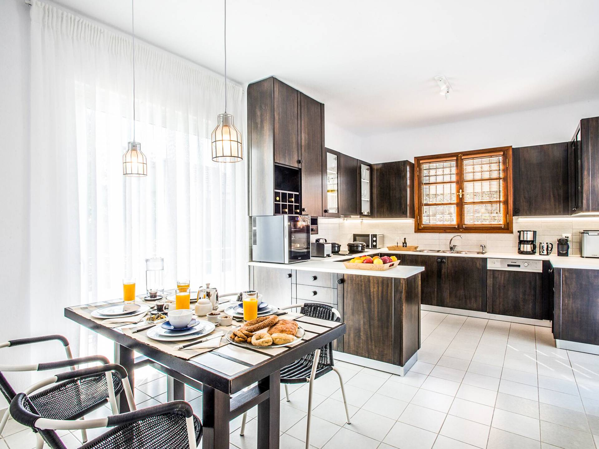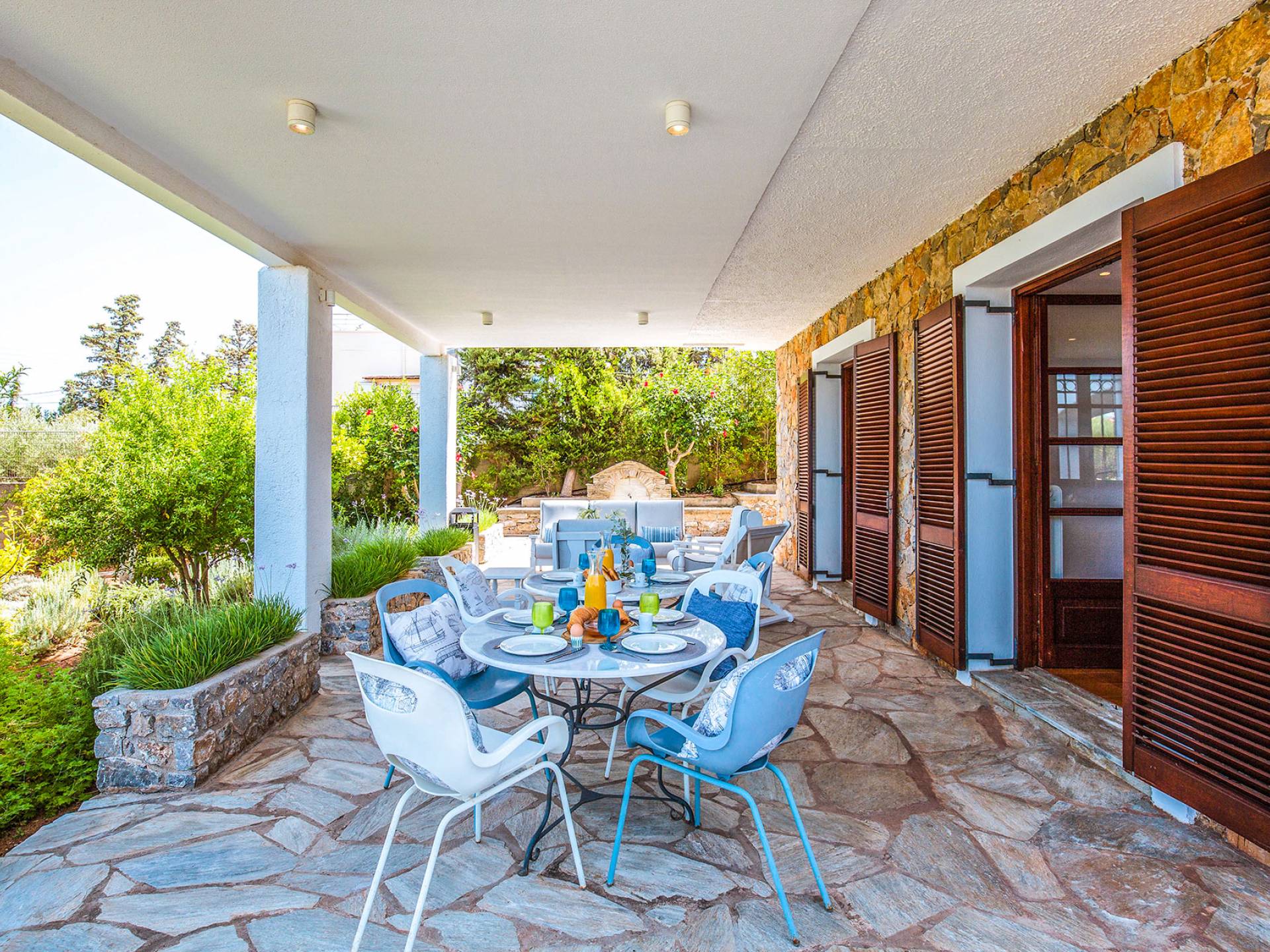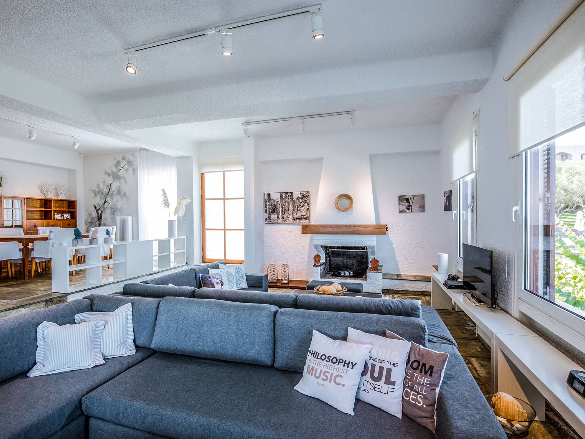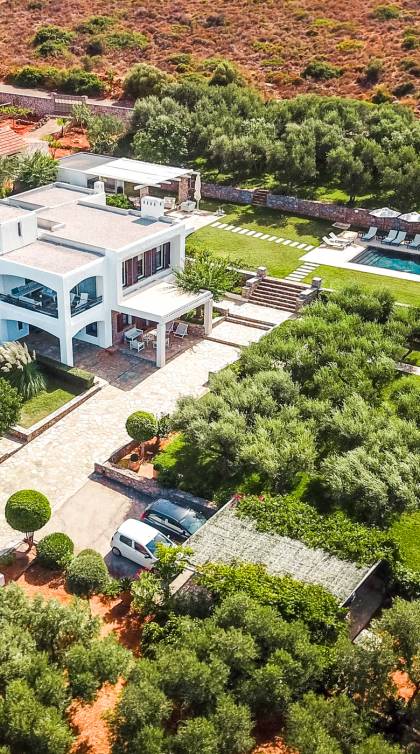 Villa Verdea Chania besteht aus zwei Etagen, von denen jede ein eigenes, unabhängiges Gästehaus mit 3 verschiedenen Eingängen zur Förderung der Privatsphäre beherbergt und letztendlich 7 Schlafzimmer und 4 Badezimmer bietet. Beide Ebenen verfügen über große, offene Wohnbereiche mit Kamin und Essbereich; Es gibt drei Wohnbereiche. Jede Etage verfügt über eine eigene voll ausgestattete Küche und zwei Badezimmer. Von allen Zimmern und Wohnbereichen besteht zudem ein direkter Zugang entweder zum Garten oder zu den Terrassen. Darüber hinaus gibt es zahlreiche Balkone und private Terrassen, hohe Decken, luftige Räume und helle, komfortable Küchen mit direktem Zugang sowohl zum Innen- als auch zum Außenbereich. Die Trennung der einzelnen Bereiche wurde bewusst vorgenommen, um den Gästen absolute Privatsphäre zu gewährleisten. Seine praktische Aufteilung macht den Sommer angenehmer und unterhaltsamer, während der beheizte Salzwasserpool (14,40 x 4,10) Kinder und Erwachsene gleichermaßen anzieht. Sie können von den Terrassen aus zwischen Meer- und Gartenblick wählen, was eine passende Kulisse für den Pool bietet, kombiniert mit der idealen Atmosphäre der umliegenden Landschaft. Direkt neben dem Schwimmbad gibt es einen mit Pergola überdachten Bereich, so dass 14 Personen draußen speisen können. Es gibt auch einen Grill und ausreichend Platz zum Parken.