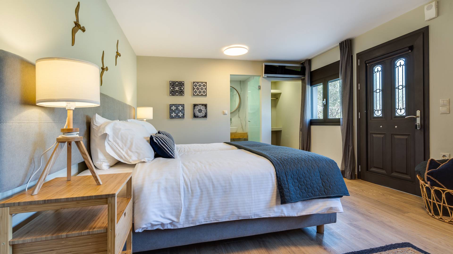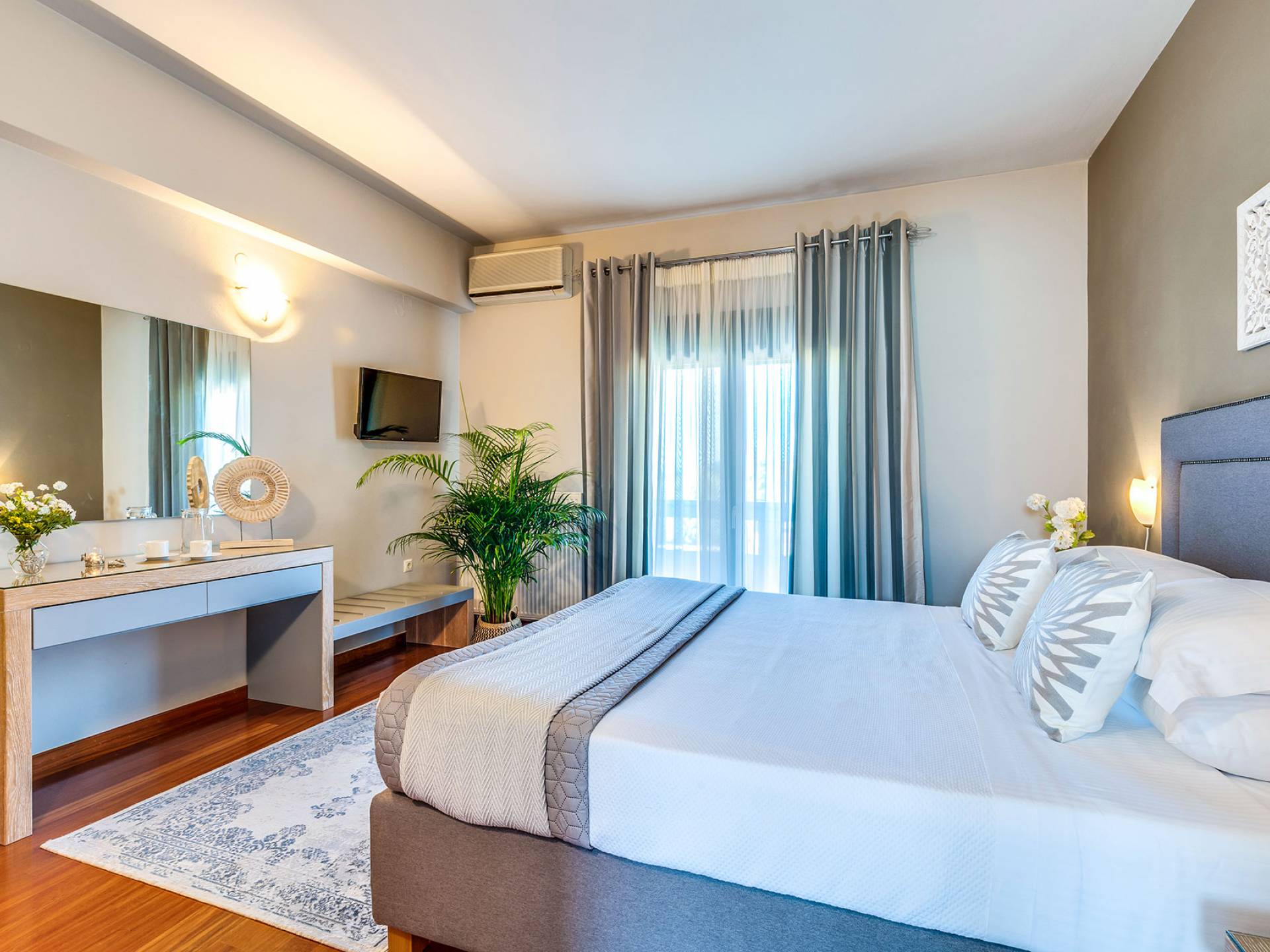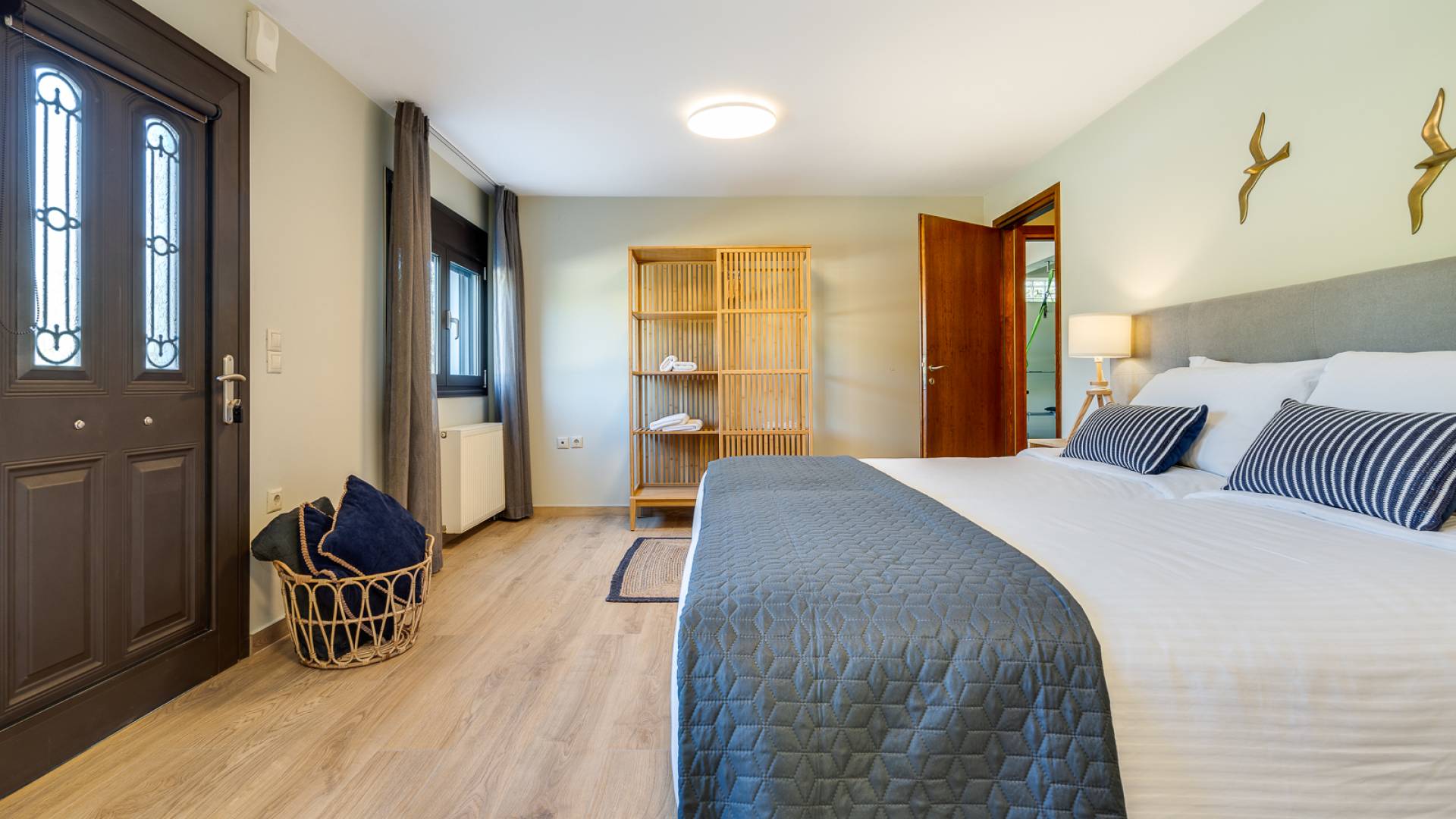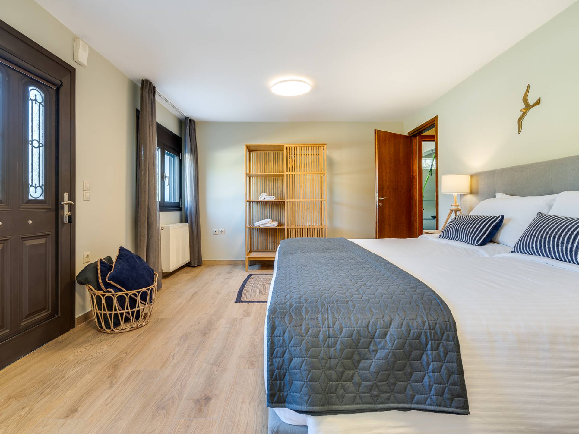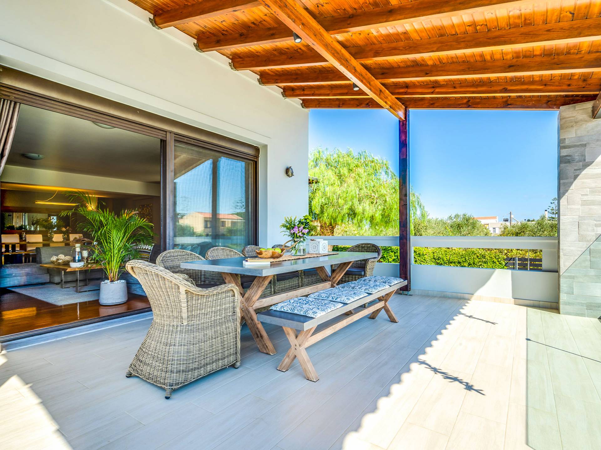 Beim Betreten der Wine Villa Chania im Erdgeschoss befindet sich ein geräumiger offener Bereich, der aus dem Wohnzimmer mit einem großen Sofa, einem Kamin, einem 50-Zoll-HD-Sat-TV, einem Esszimmer und einer voll ausgestatteten Küche von höchster Qualität besteht Armaturen und Geräte. Der Wohnbereich öffnet sich zu einer Veranda mit Esstisch, die Sie zum Poolbereich führt. Außerdem befindet sich neben der Küche ein Waschraum mit Waschmaschine und Trockner. Da durch einen Flur im Erdgeschoss gehen, gibt es 3 Schlafzimmer. Das Hauptschlafzimmer verfügt über ein Doppelbett, einen Kleiderschrank, einen 32-Zoll-HDTV und ein eigenes Bad mit Dusche. Der Rest der 2 Schlafzimmer hat ein Doppelbett bzw. 2 Einzelbetten. Darüber hinaus gibt es im selben Bereich ein weiteres Badezimmer mit Badewanne und Dusche und eine Toilette.