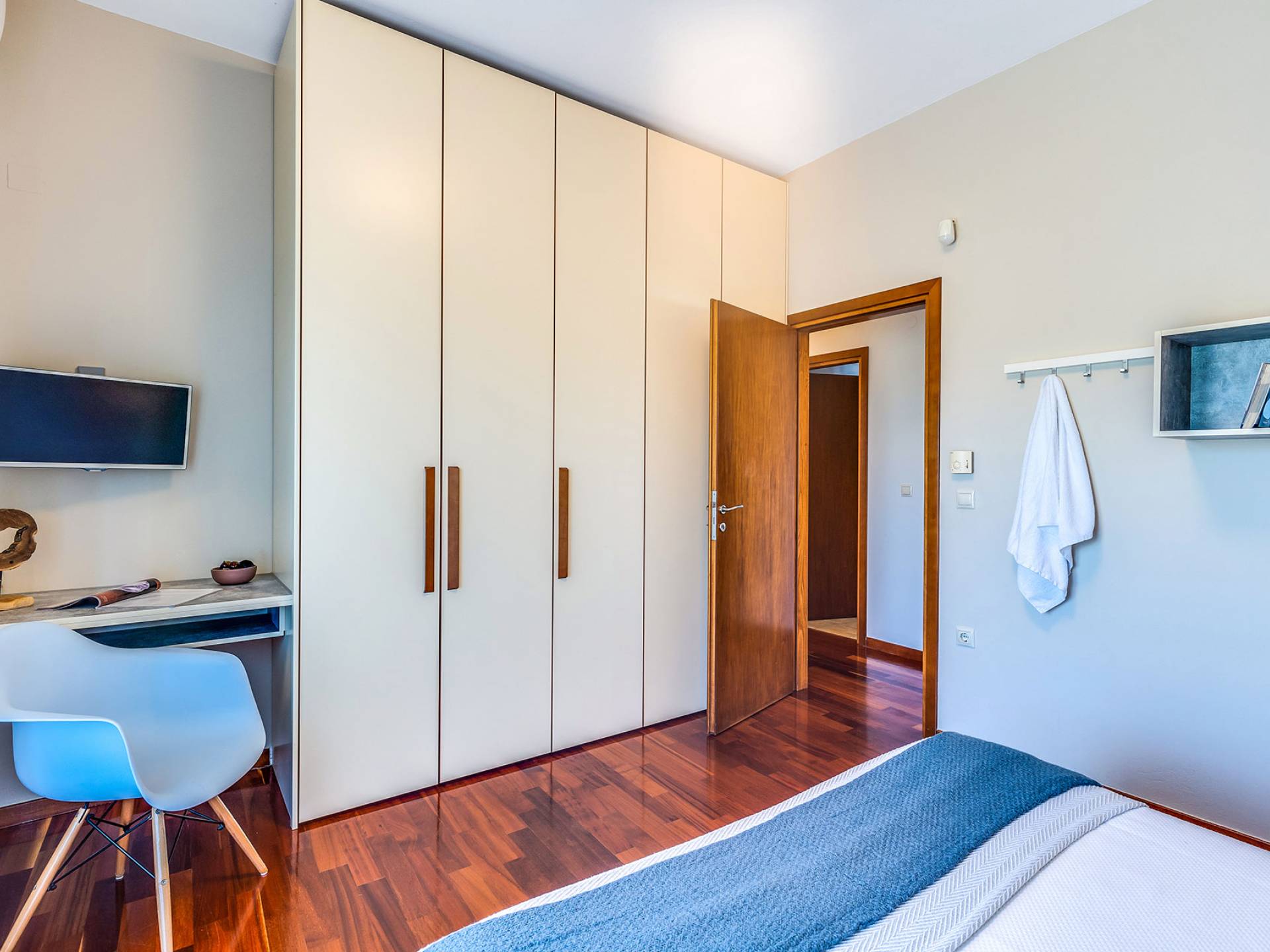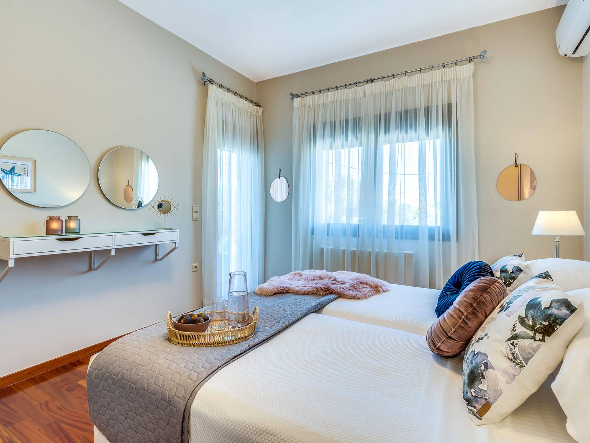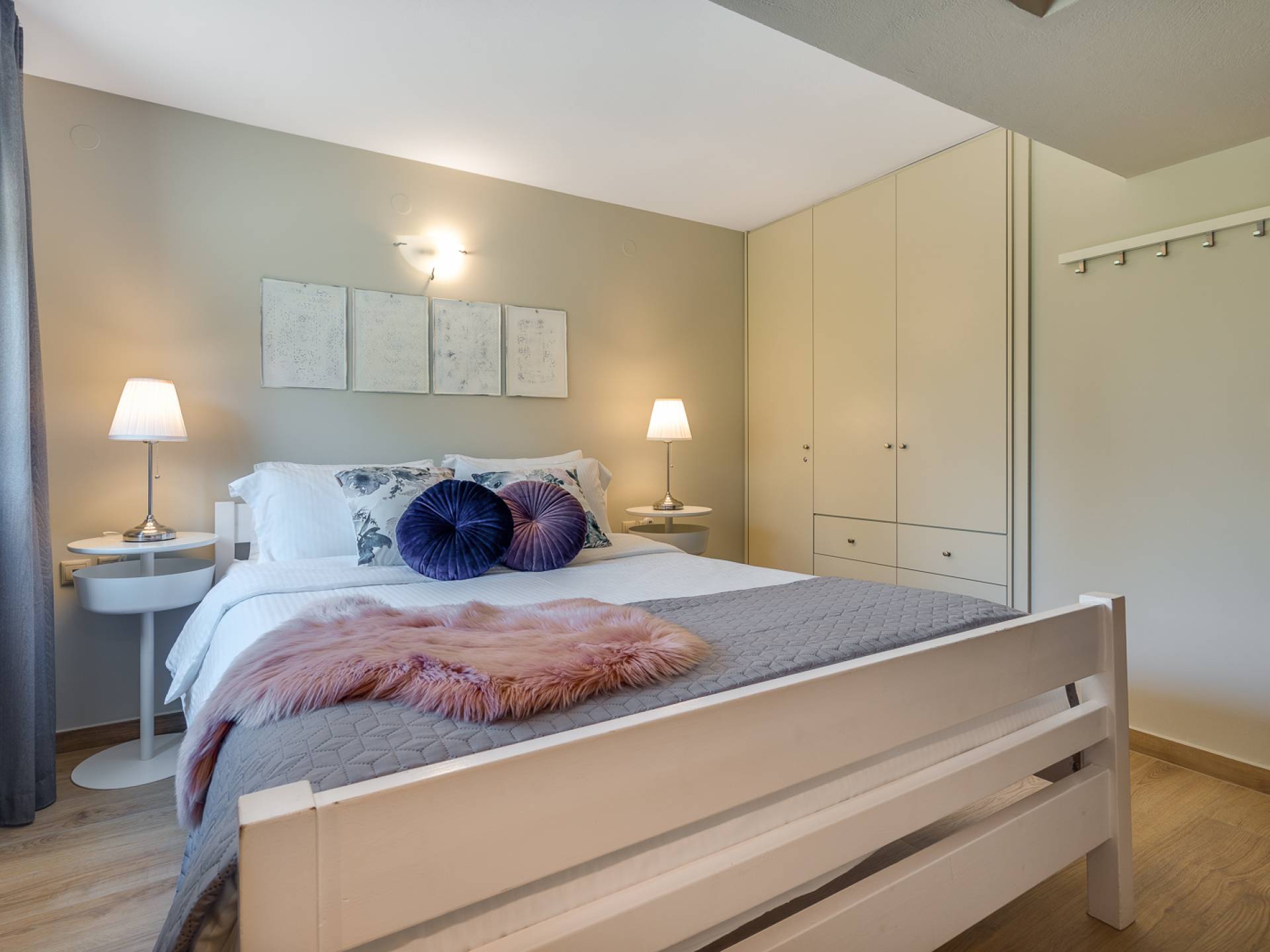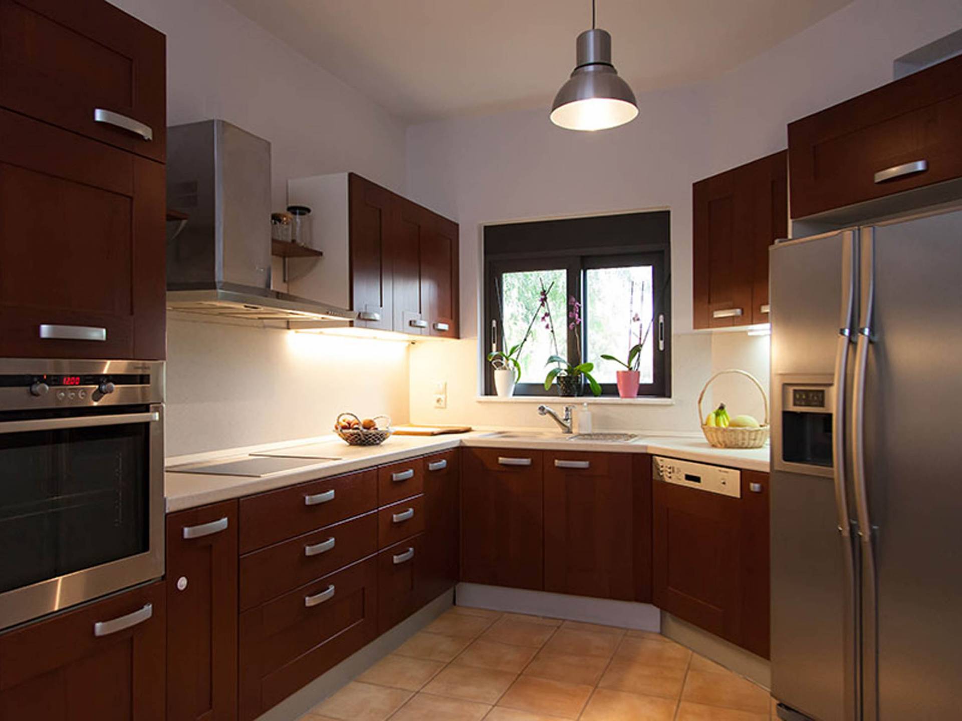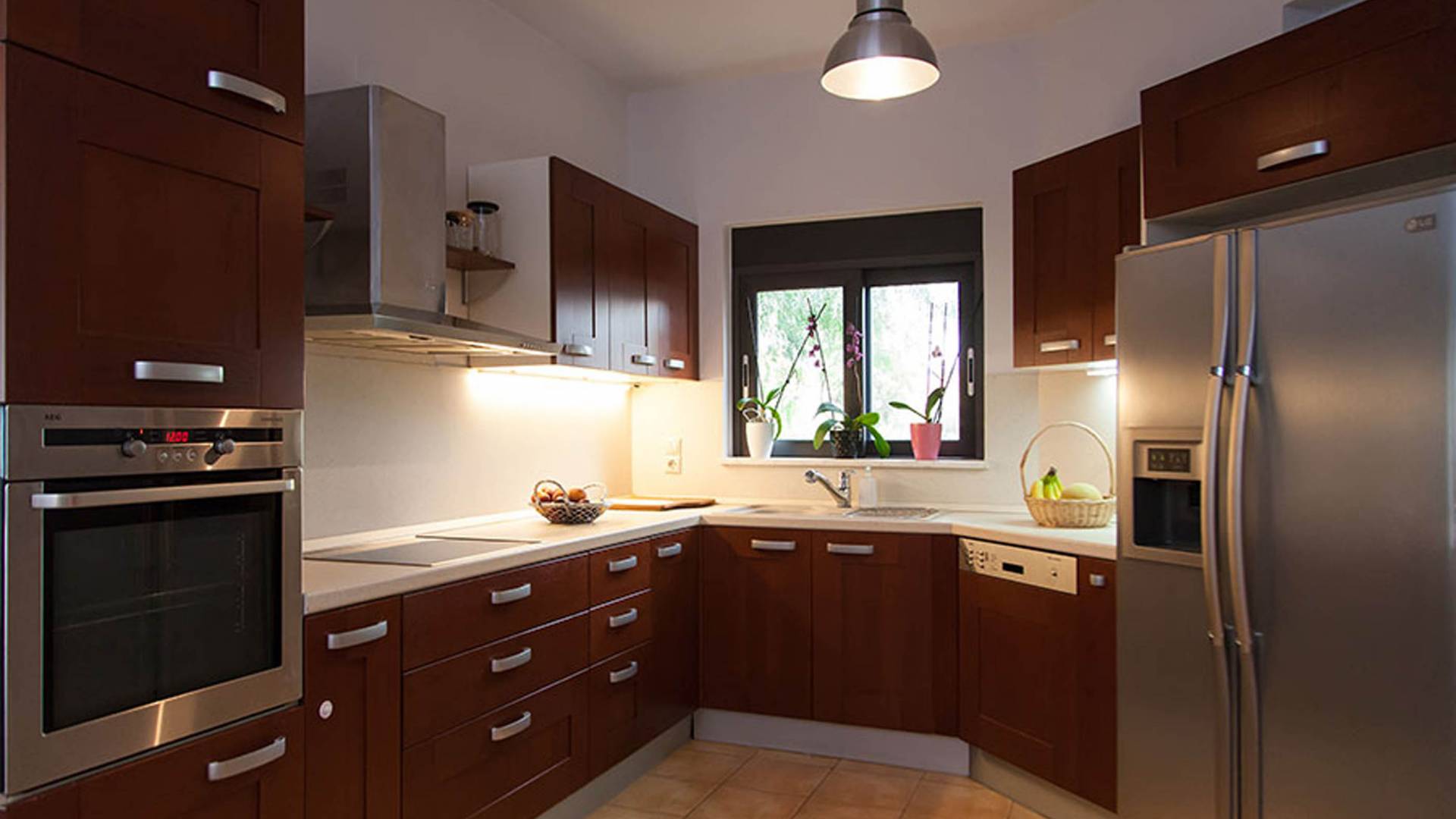 Beim Betreten der Wine Villa Chania im Erdgeschoss befindet sich ein geräumiger offener Bereich, der aus dem Wohnzimmer mit einem großen Sofa, einem Kamin, einem 50-Zoll-HD-Sat-TV, einem Esszimmer und einer voll ausgestatteten Küche von höchster Qualität besteht Armaturen und Geräte. Der Wohnbereich öffnet sich zu einer Veranda mit Esstisch, die Sie zum Poolbereich führt. Außerdem befindet sich neben der Küche ein Waschraum mit Waschmaschine und Trockner. Da durch einen Flur im Erdgeschoss gehen, gibt es 3 Schlafzimmer. Das Hauptschlafzimmer verfügt über ein Doppelbett, einen Kleiderschrank, einen 32-Zoll-HDTV und ein eigenes Bad mit Dusche. Der Rest der 2 Schlafzimmer hat ein Doppelbett bzw. 2 Einzelbetten. Darüber hinaus gibt es im selben Bereich ein weiteres Badezimmer mit Badewanne und Dusche und eine Toilette.