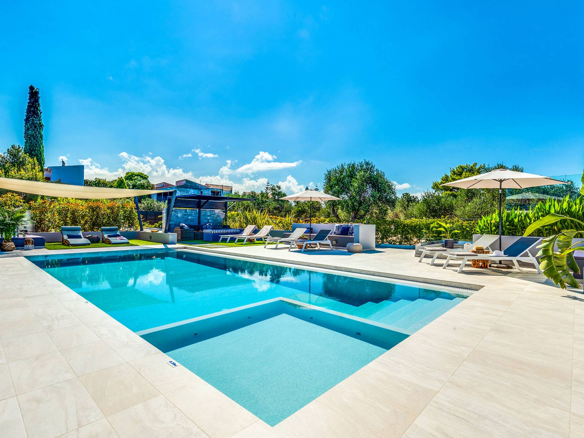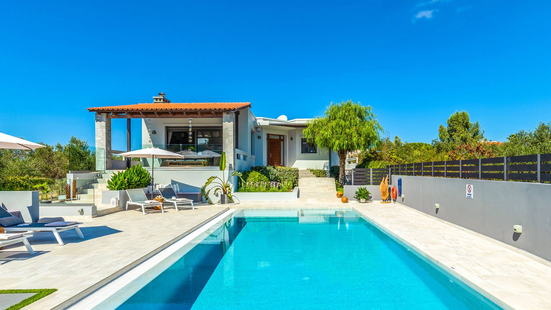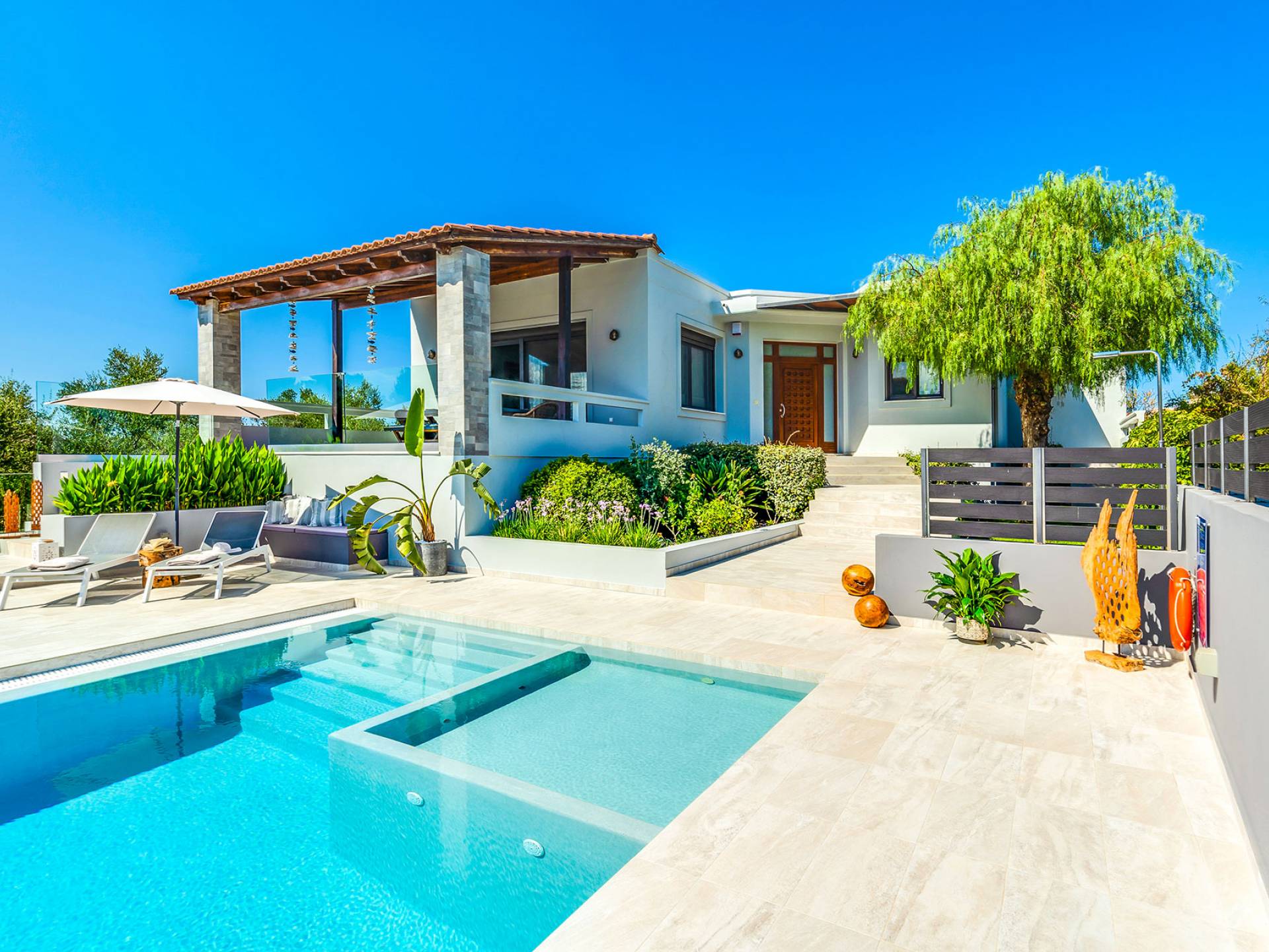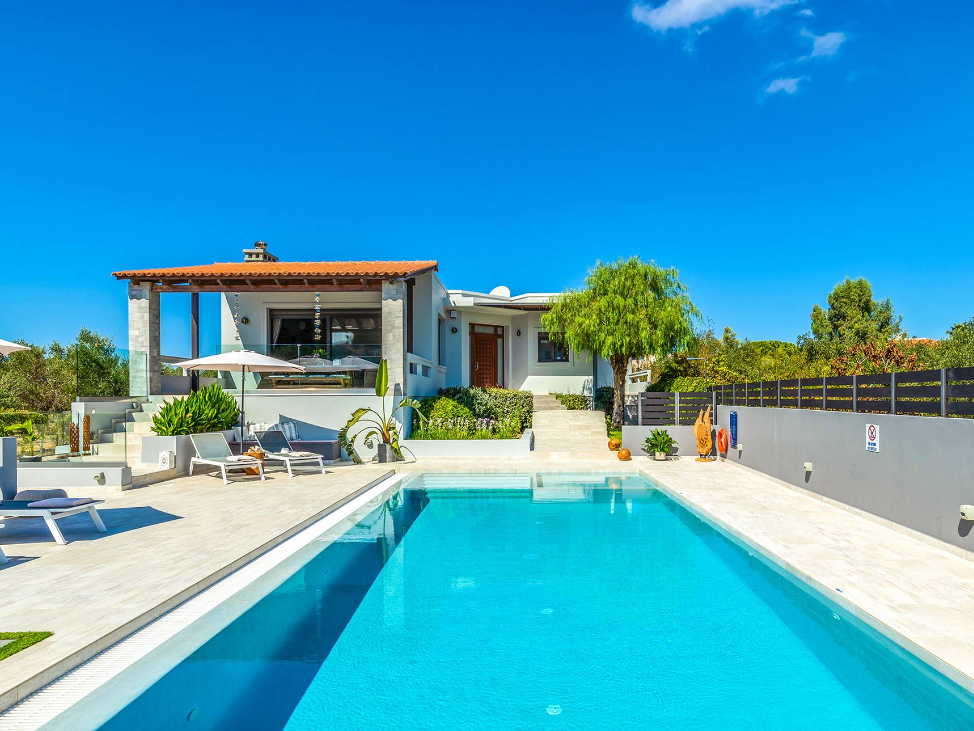 Der schön angelegte Außenbereich, umgeben von verschiedenen Bäumen und Blumen, bietet eine Vielzahl von Einrichtungen und Plätzen zum Entspannen. Zu den Außenanlagen gehören insbesondere: 55 m² großer privater beheizter Pool mit einem flachen Teil für Kinder. Voll ausgestatteter Holzkohlegrill mit Holzofen, Gasgrill. Zwei Esstische im Freien. Eine Vielzahl von möblierten Plätzen (mit Sonnenliegen, Sonnenschirmen und Stühlen) zum Entspannen auf der Veranda und den Gärten rund um die Villa. Spielplatz für kleine Kinder. Basketball-Netz. Parkplatz für 4 Autos. Der gesamte Außenbereich ist völlig privat und eingezäunt und bietet unseren Gästen absolute Privatsphäre.