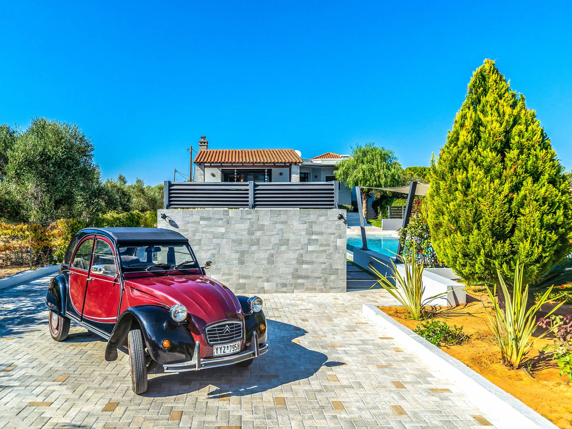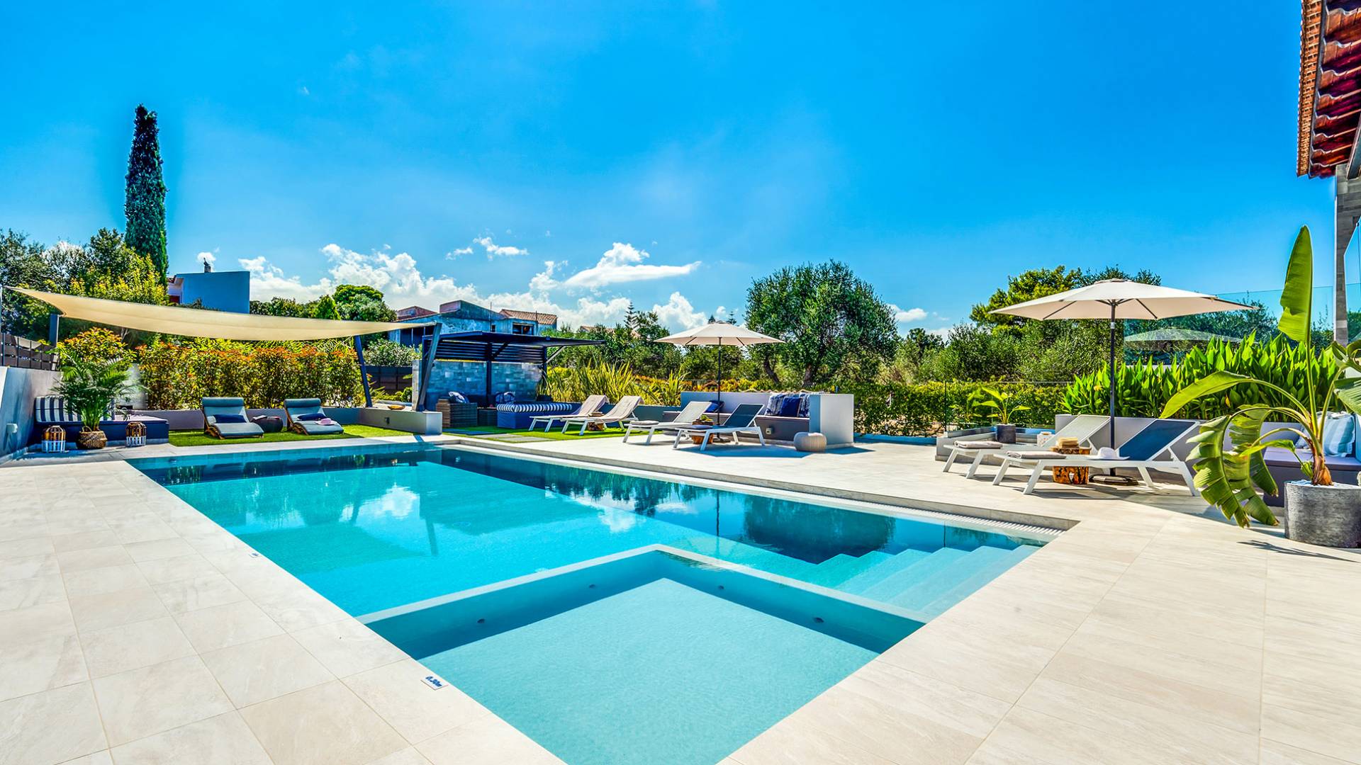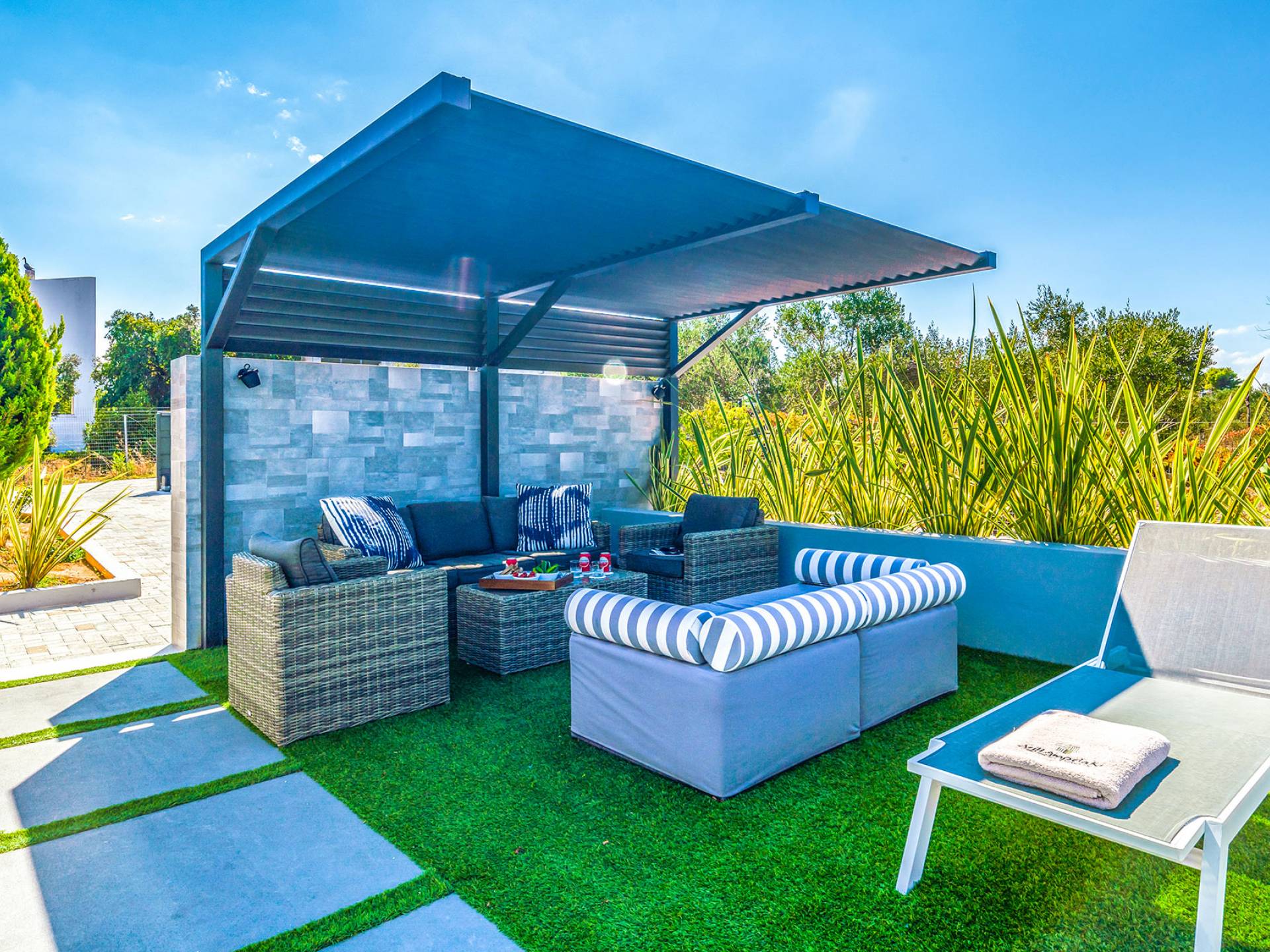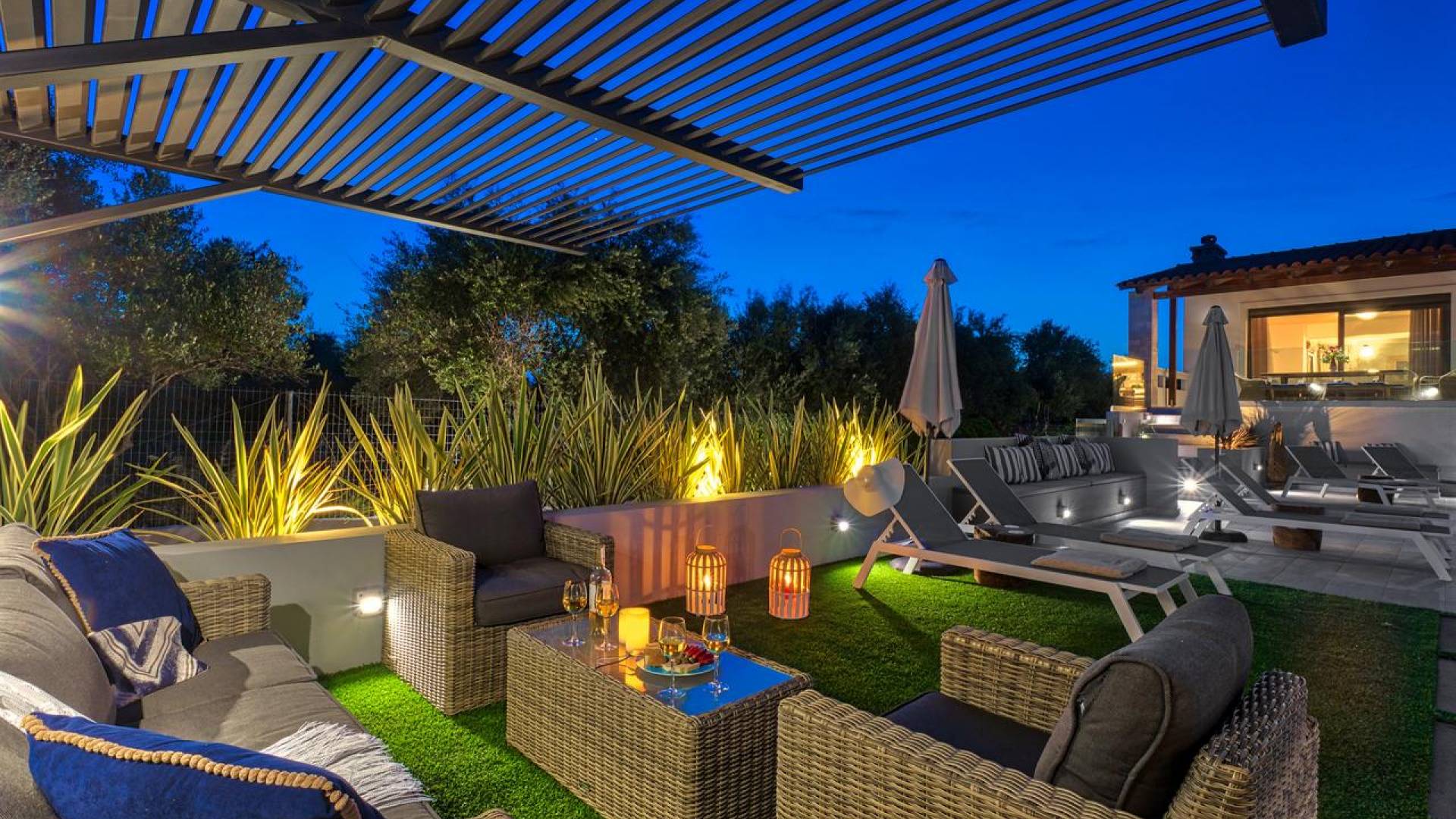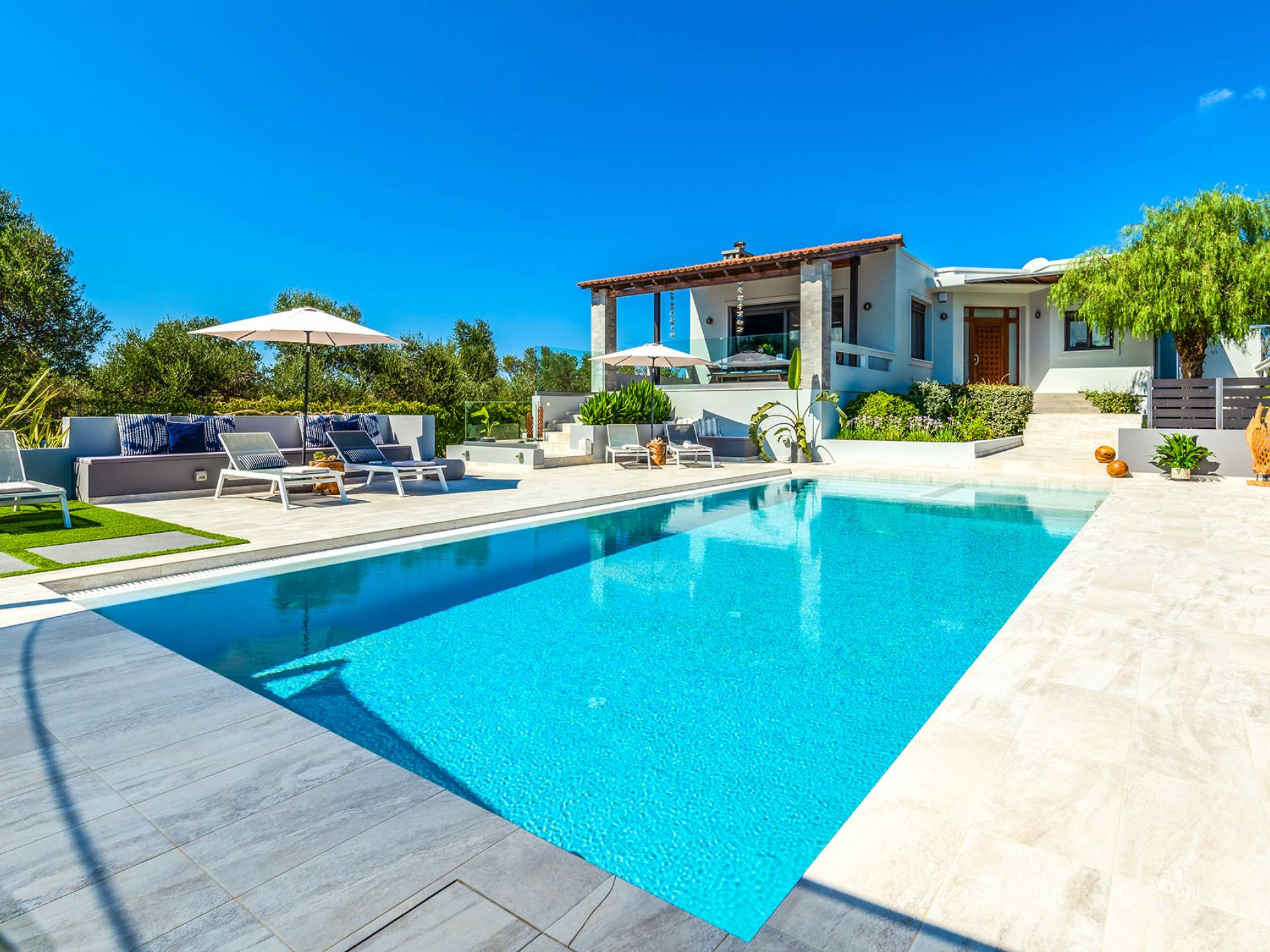 Der schön angelegte Außenbereich, umgeben von verschiedenen Bäumen und Blumen, bietet eine Vielzahl von Einrichtungen und Plätzen zum Entspannen. Zu den Außenanlagen gehören insbesondere: 55 m² großer privater beheizter Pool mit einem flachen Teil für Kinder. Voll ausgestatteter Holzkohlegrill mit Holzofen, Gasgrill. Zwei Esstische im Freien. Eine Vielzahl von möblierten Plätzen (mit Sonnenliegen, Sonnenschirmen und Stühlen) zum Entspannen auf der Veranda und den Gärten rund um die Villa. Spielplatz für kleine Kinder. Basketball-Netz. Parkplatz für 4 Autos. Der gesamte Außenbereich ist völlig privat und eingezäunt und bietet unseren Gästen absolute Privatsphäre.