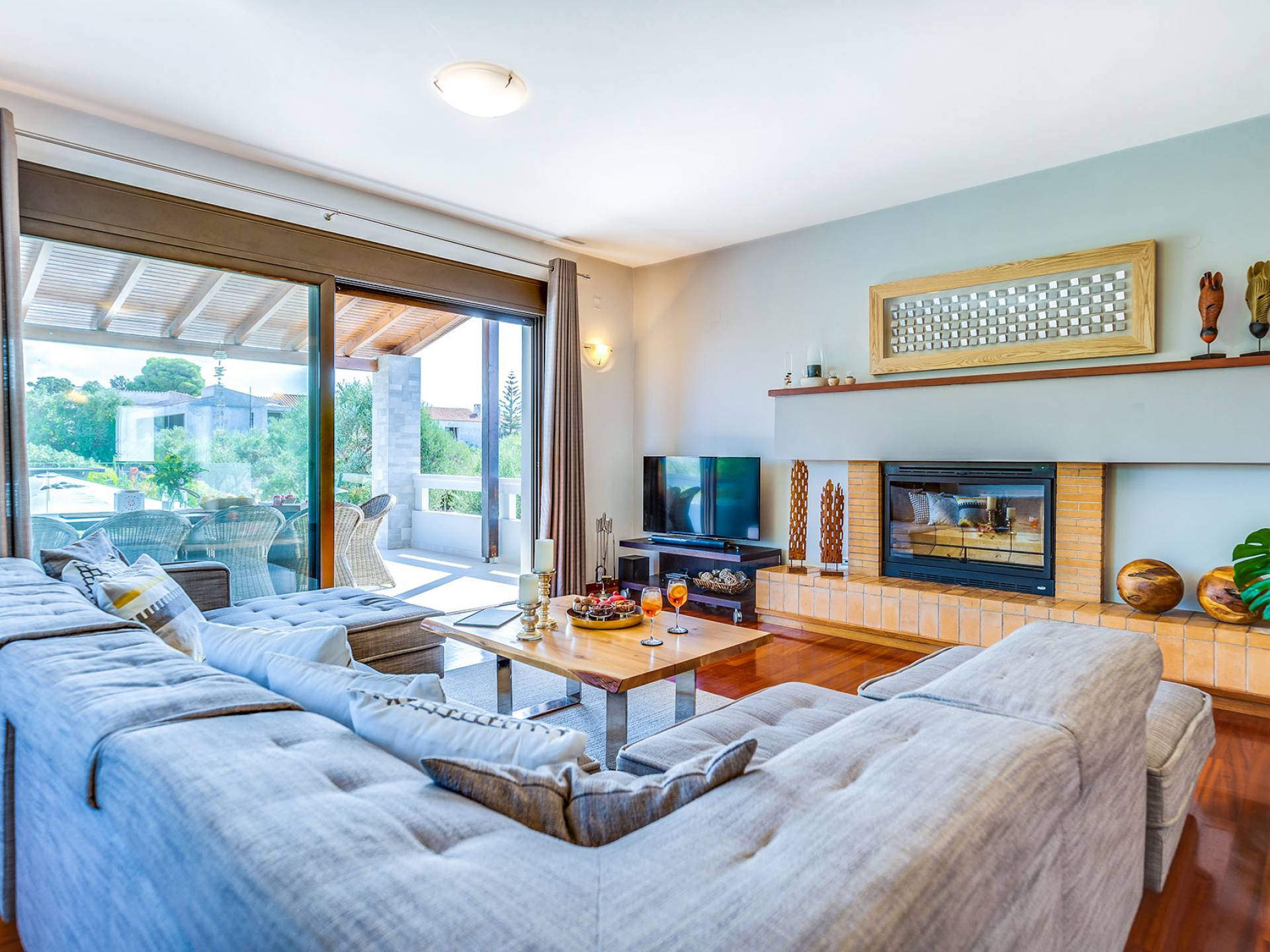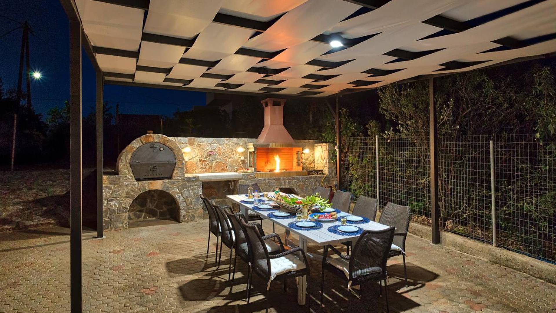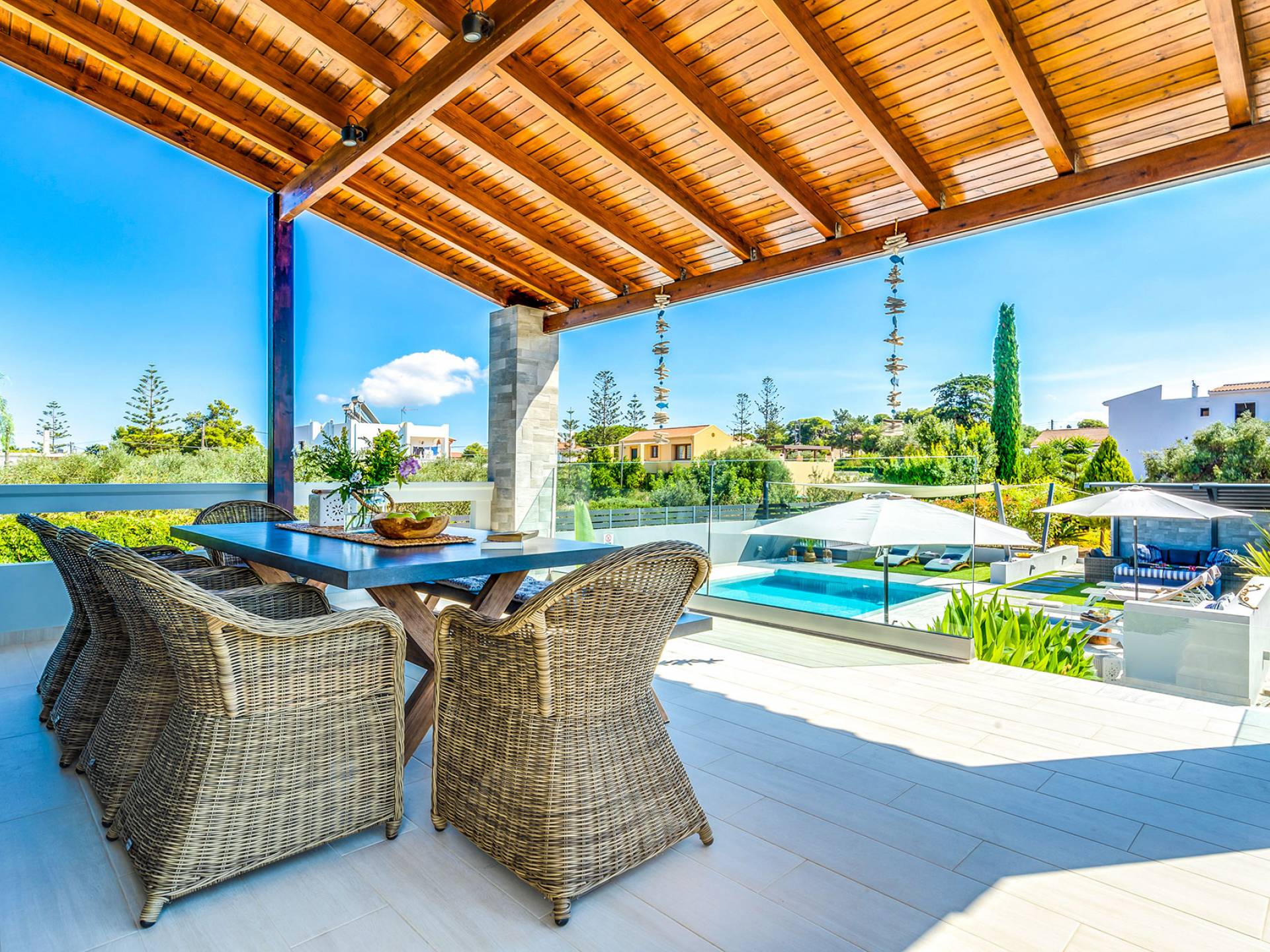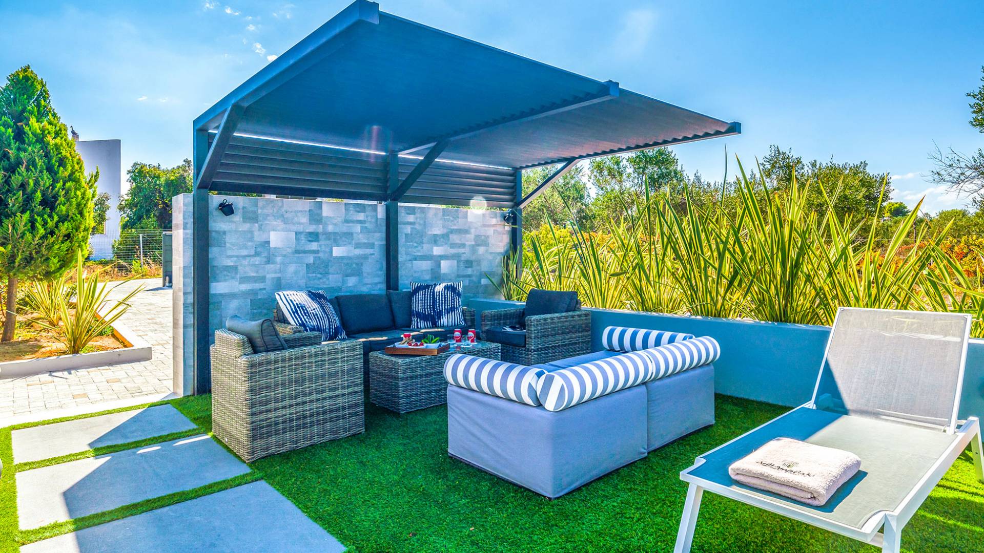 Der schön angelegte Außenbereich, umgeben von verschiedenen Bäumen und Blumen, bietet eine Vielzahl von Einrichtungen und Plätzen zum Entspannen. Zu den Außenanlagen gehören insbesondere: 55 m² großer privater beheizter Pool mit einem flachen Teil für Kinder. Voll ausgestatteter Holzkohlegrill mit Holzofen, Gasgrill. Zwei Esstische im Freien. Eine Vielzahl von möblierten Plätzen (mit Sonnenliegen, Sonnenschirmen und Stühlen) zum Entspannen auf der Veranda und den Gärten rund um die Villa. Spielplatz für kleine Kinder. Basketball-Netz. Parkplatz für 4 Autos. Der gesamte Außenbereich ist völlig privat und eingezäunt und bietet unseren Gästen absolute Privatsphäre.