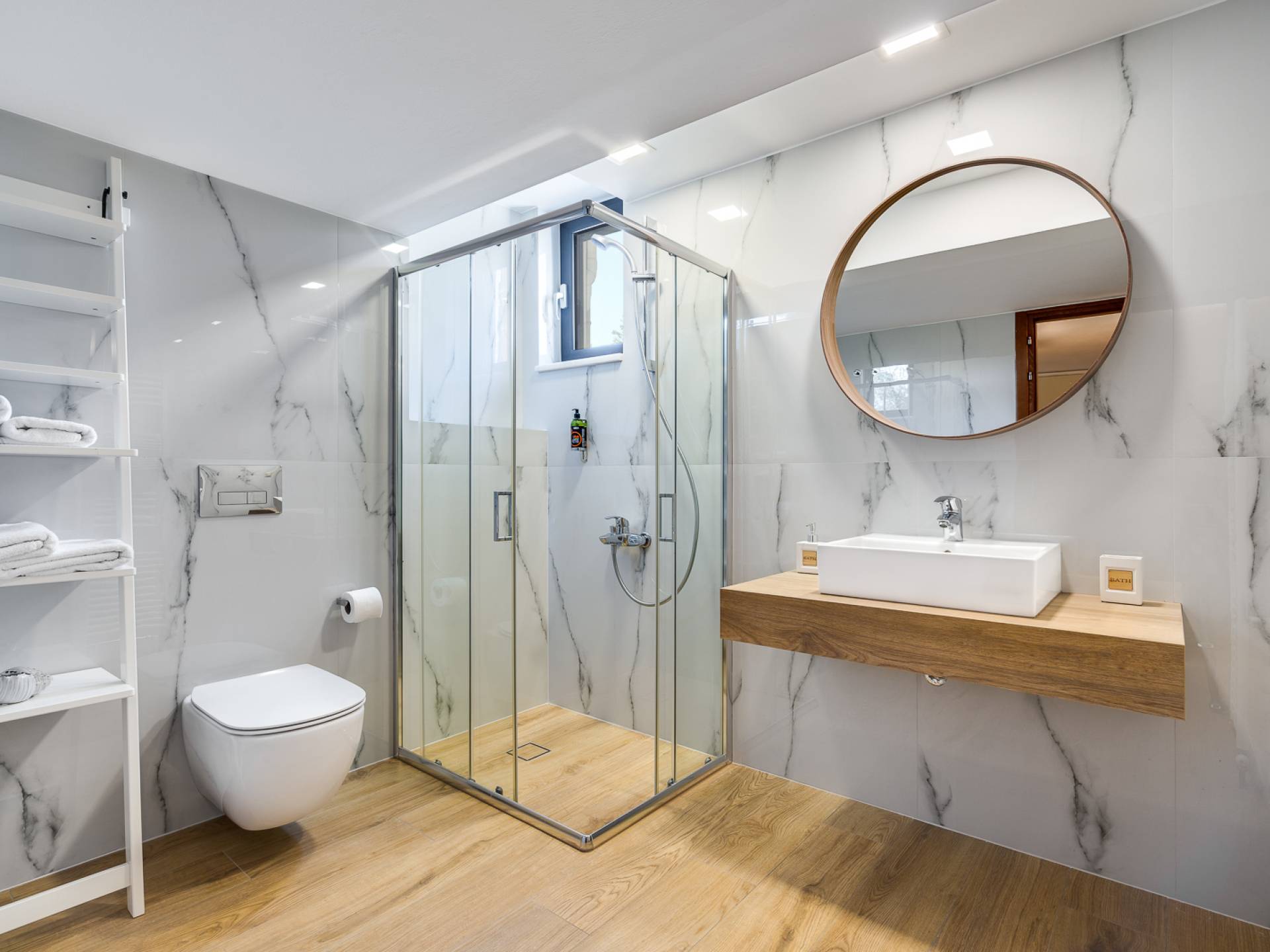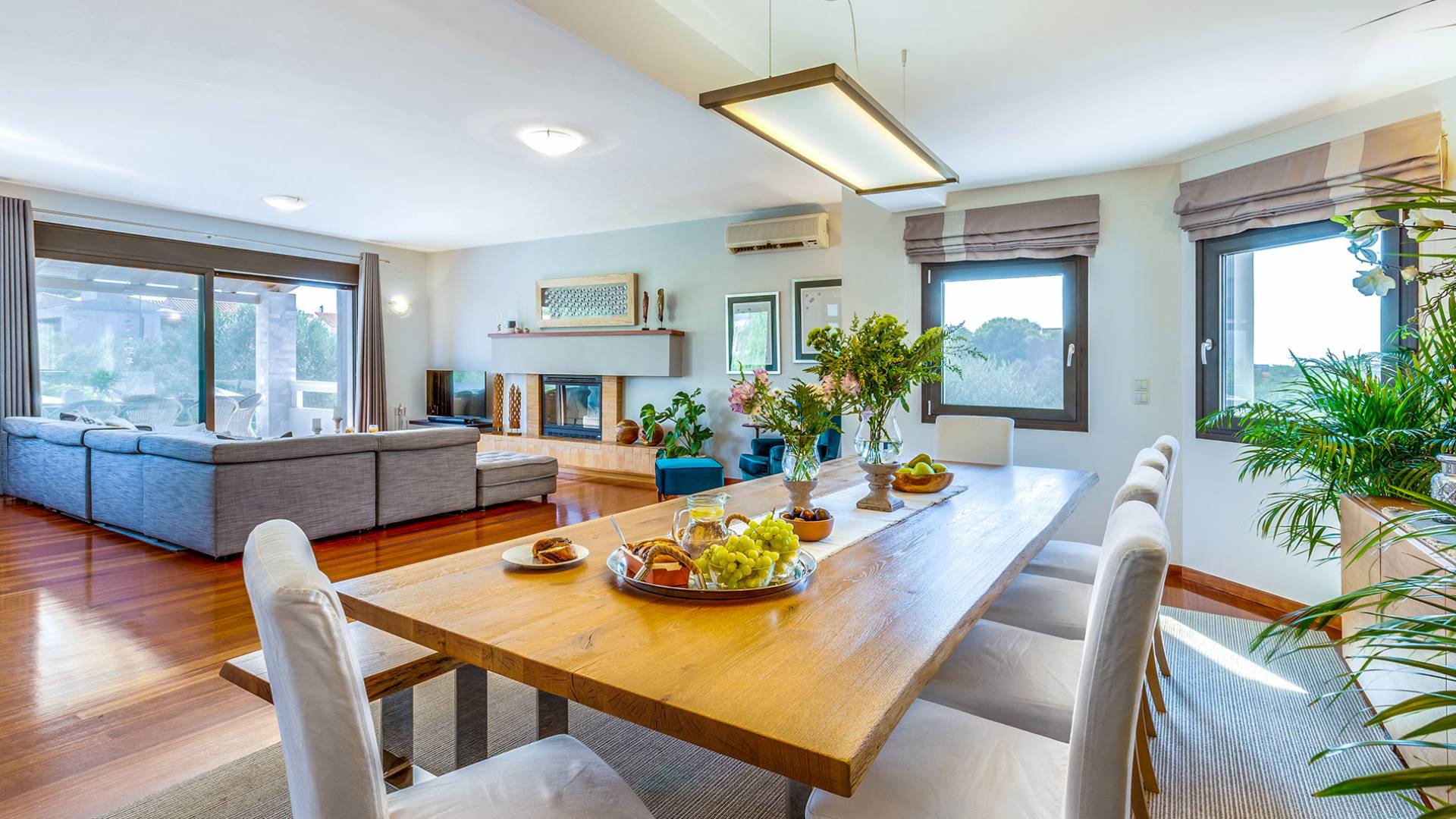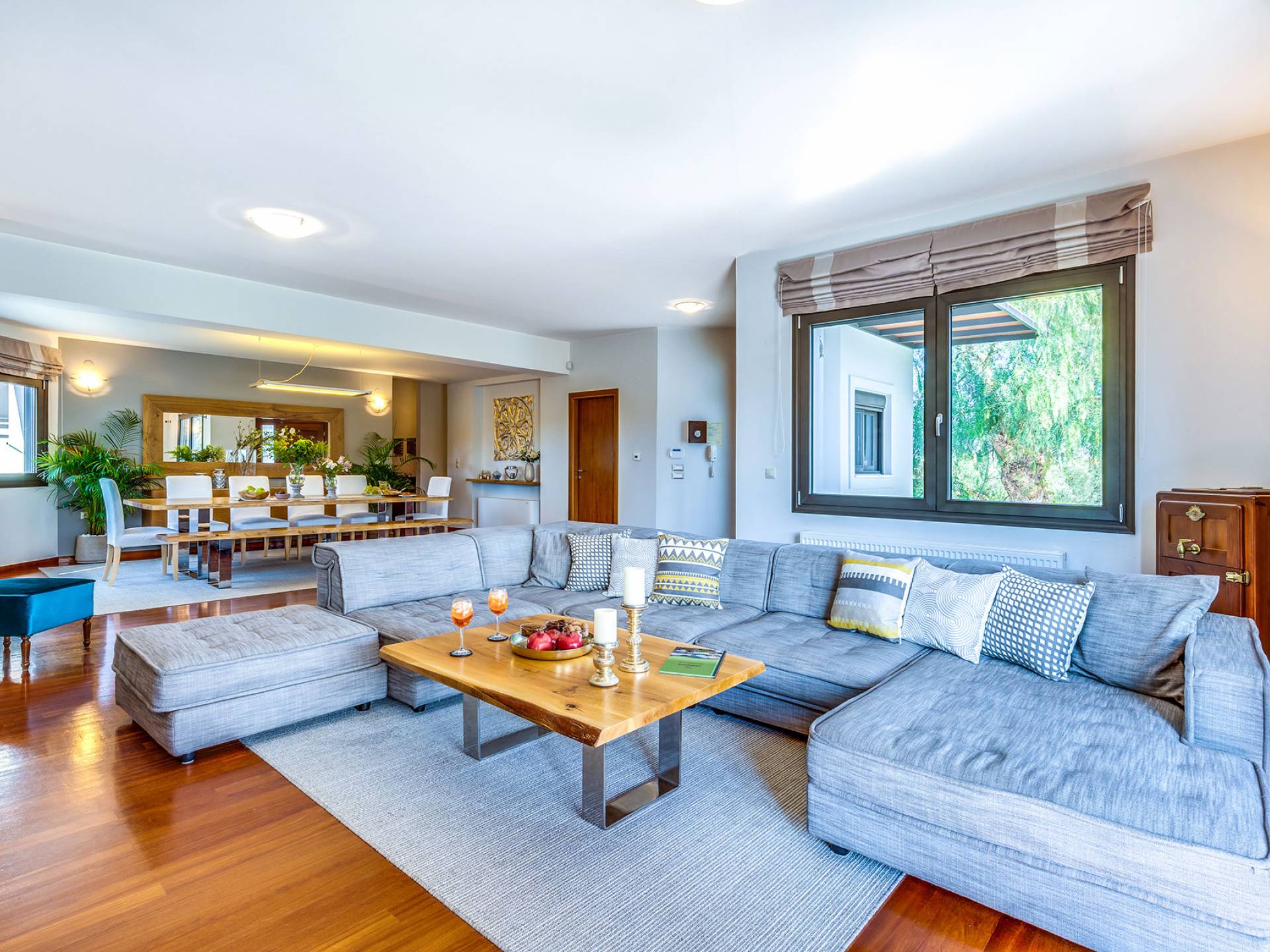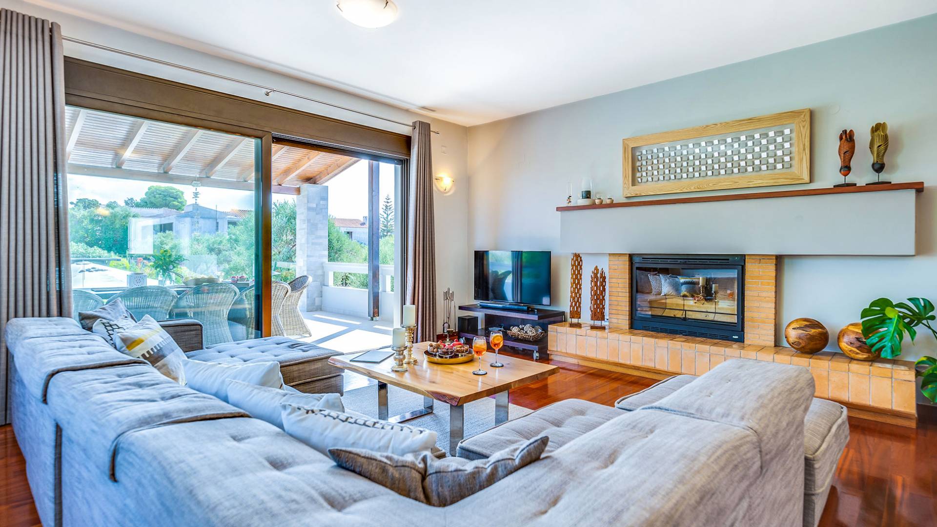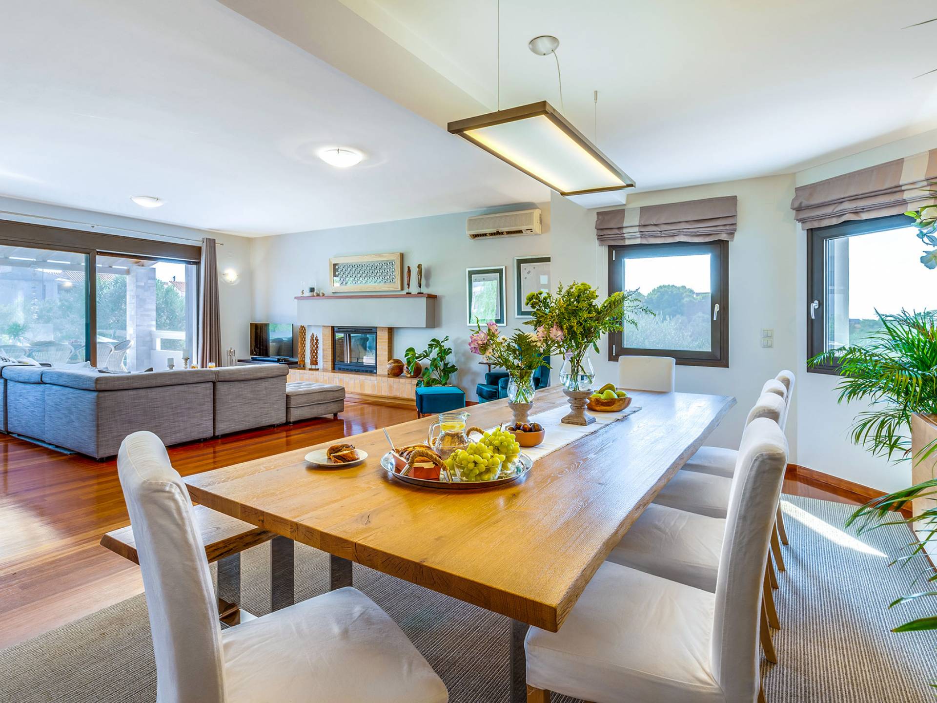 Der schön angelegte Außenbereich, umgeben von verschiedenen Bäumen und Blumen, bietet eine Vielzahl von Einrichtungen und Plätzen zum Entspannen. Zu den Außenanlagen gehören insbesondere: 55 m² großer privater beheizter Pool mit einem flachen Teil für Kinder. Voll ausgestatteter Holzkohlegrill mit Holzofen, Gasgrill. Zwei Esstische im Freien. Eine Vielzahl von möblierten Plätzen (mit Sonnenliegen, Sonnenschirmen und Stühlen) zum Entspannen auf der Veranda und den Gärten rund um die Villa. Spielplatz für kleine Kinder. Basketball-Netz. Parkplatz für 4 Autos. Der gesamte Außenbereich ist völlig privat und eingezäunt und bietet unseren Gästen absolute Privatsphäre.