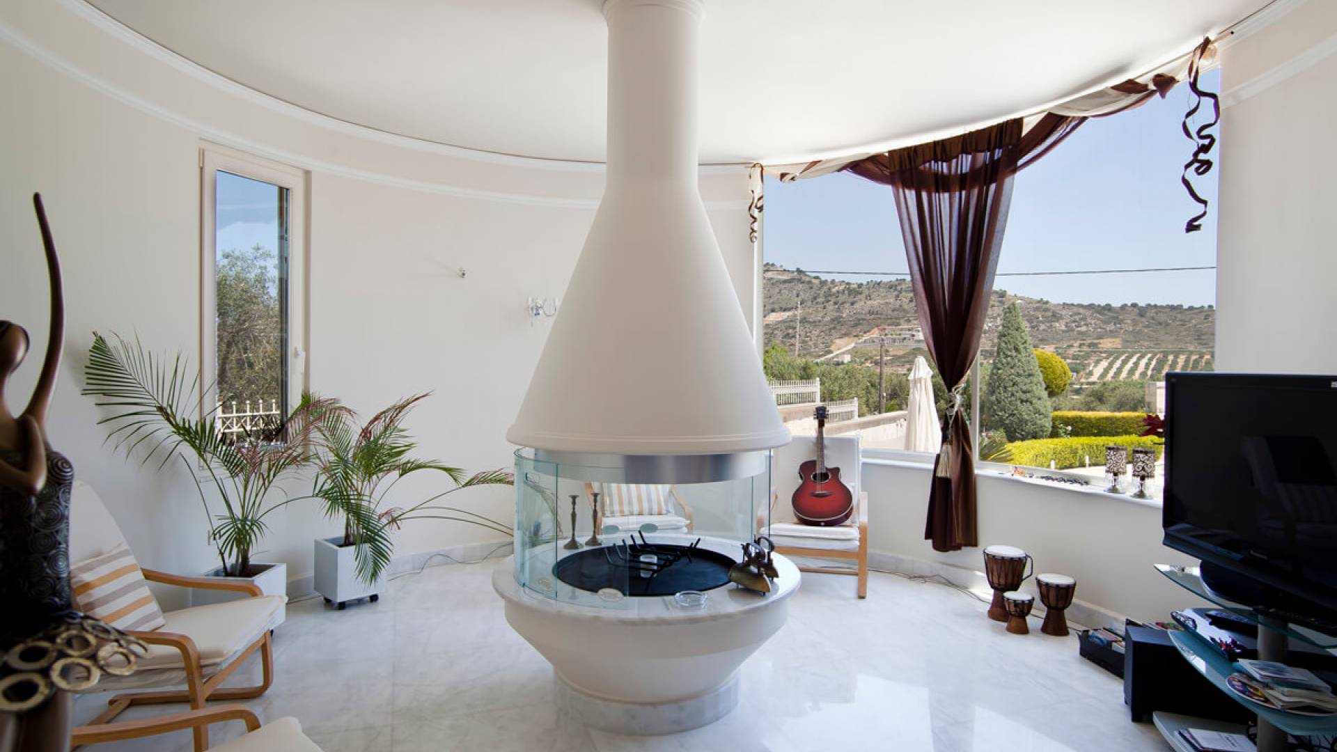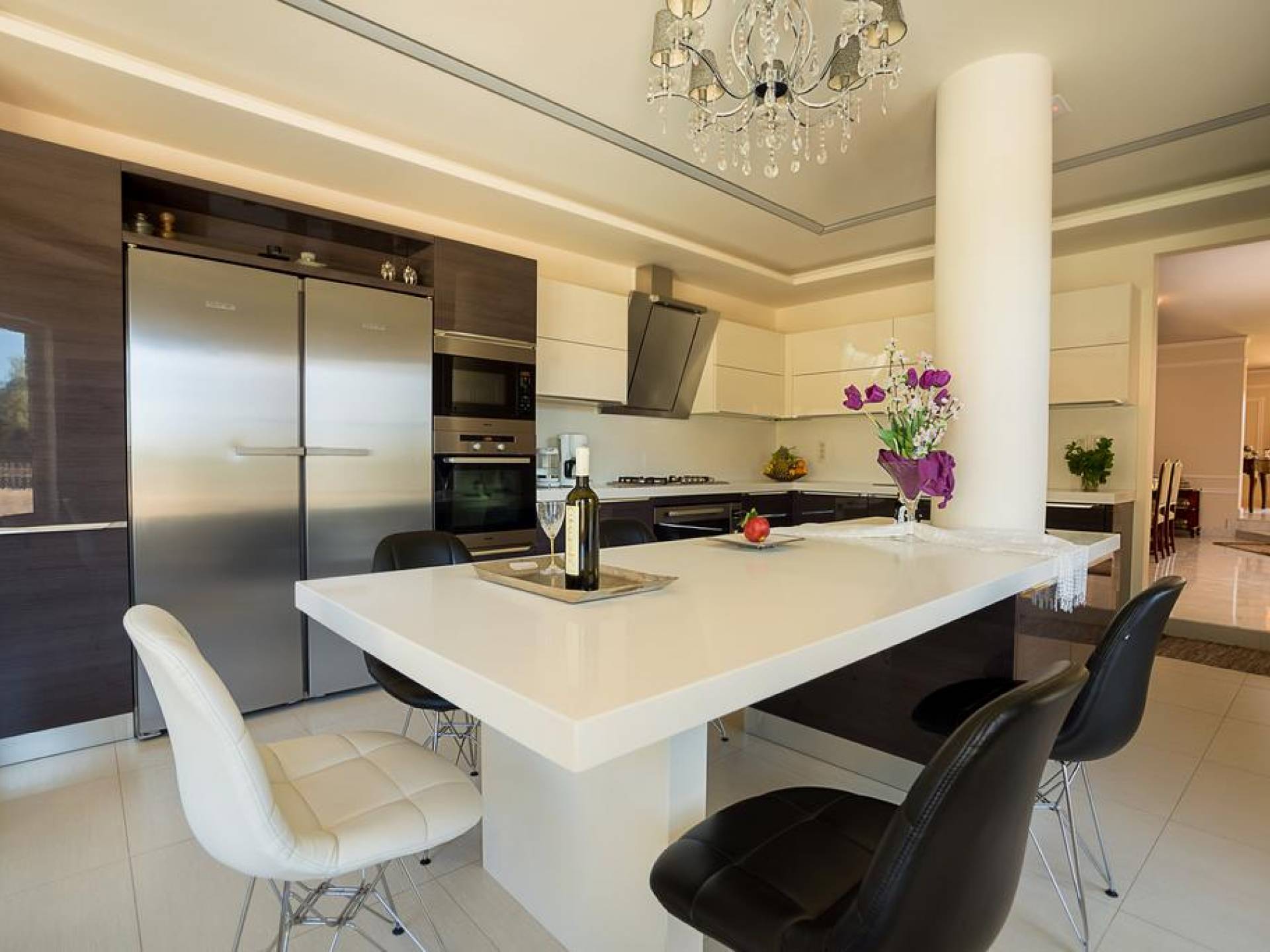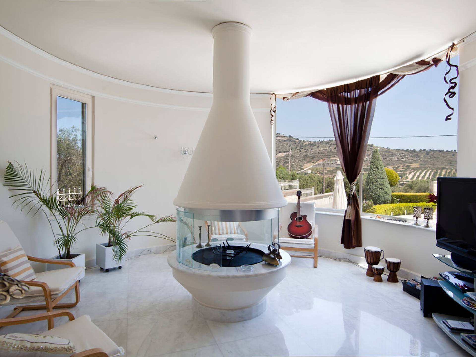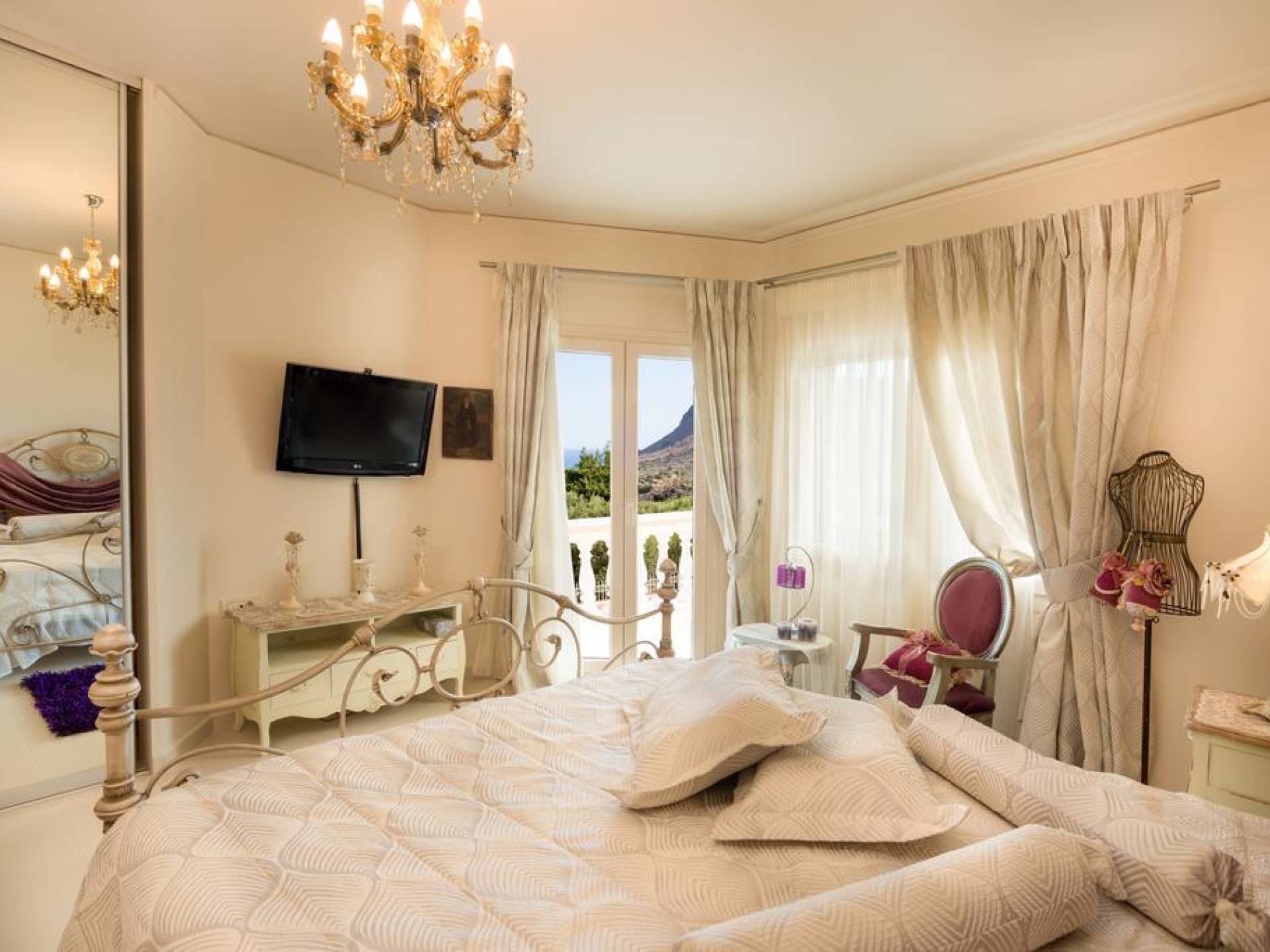 Das Innere der Green Palace Villa Crete kombiniert ein sehr großes Wohnzimmer mit einem Esszimmer, das durch eine geräumige und moderne Küche verbunden ist. Die Küche ist komplett ausgestattet und mit modernen Geräten und Kochzubehör ausgestattet. Es verfügt außerdem über ein eigenes Esszimmer, Sitzgelegenheiten, einen Fernseher und einen fantastischen Blick auf den Pool und den Garten. Der Rest besteht aus einem einzigen Büroraum, einem großen Wohnzimmer mit Kamin, Fernseher und herrlichem Blick auf den Garten, den Pool und einen grünen Hang.