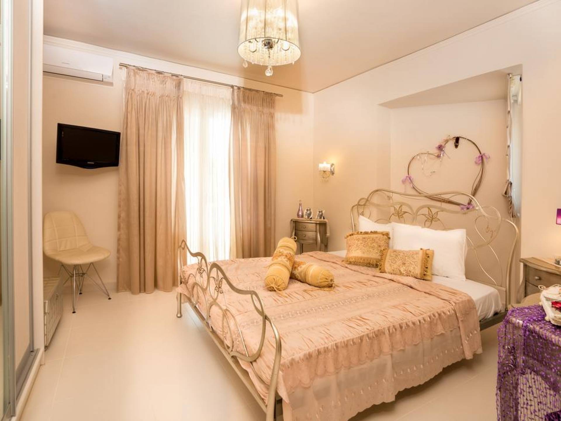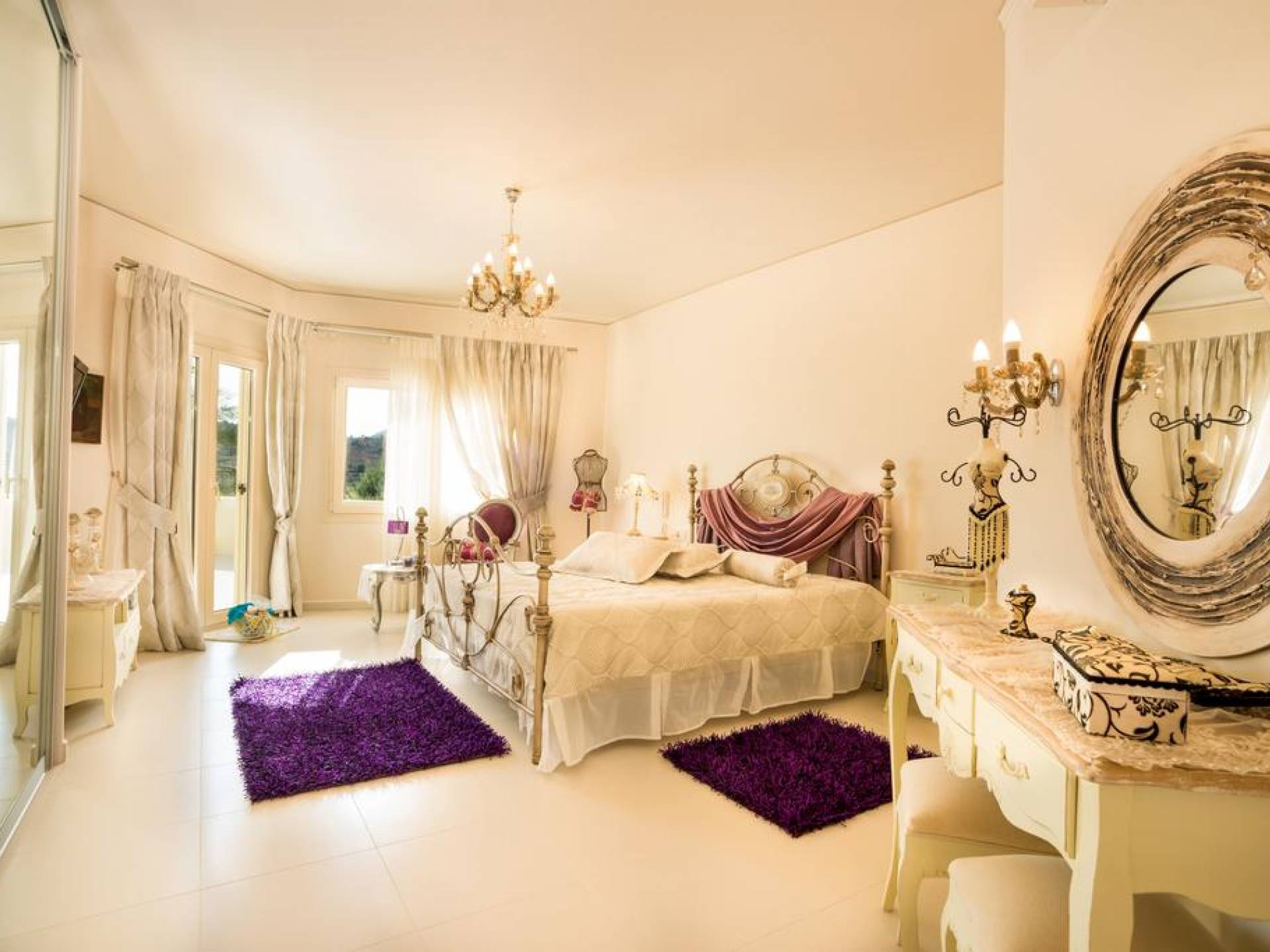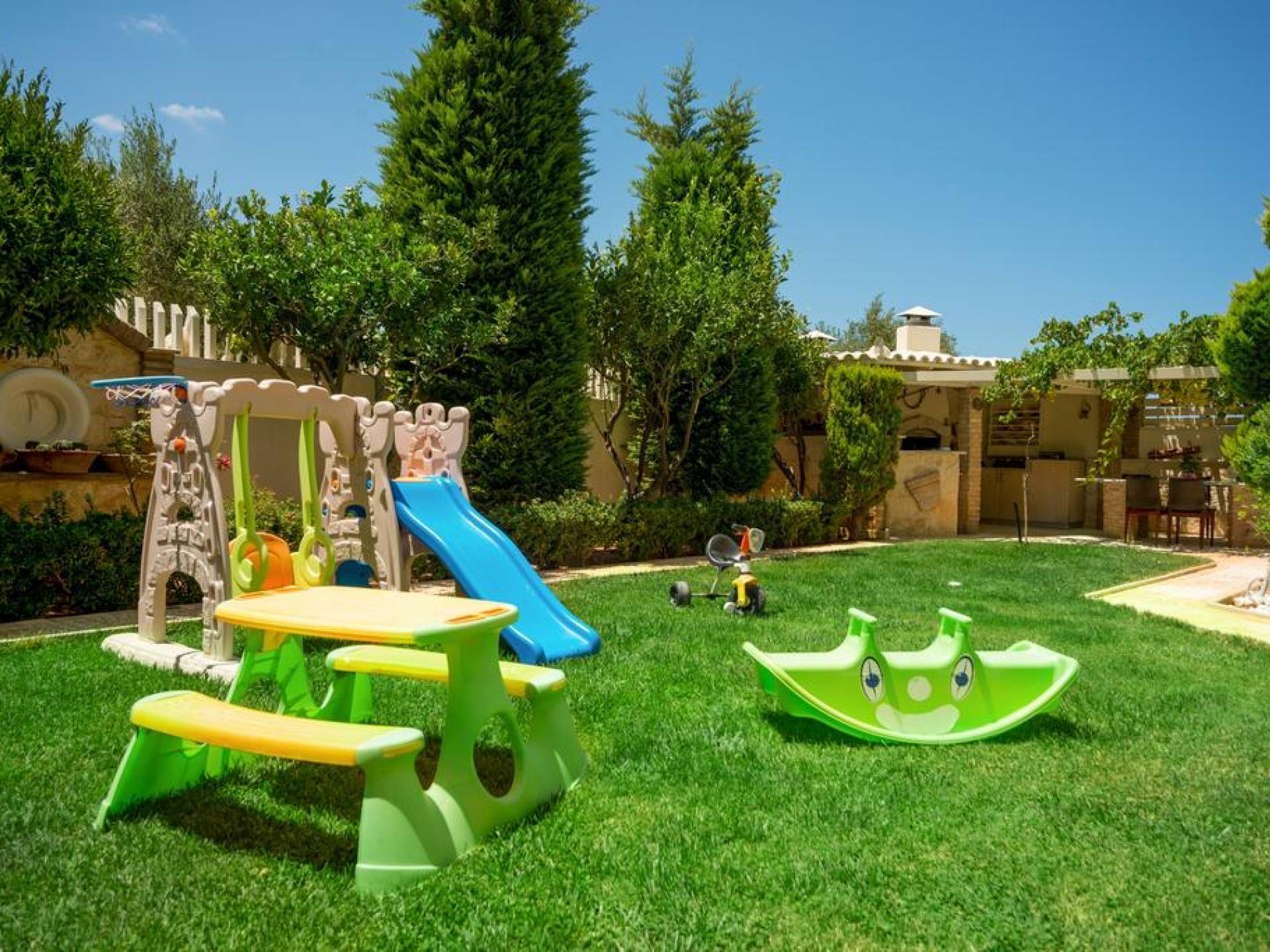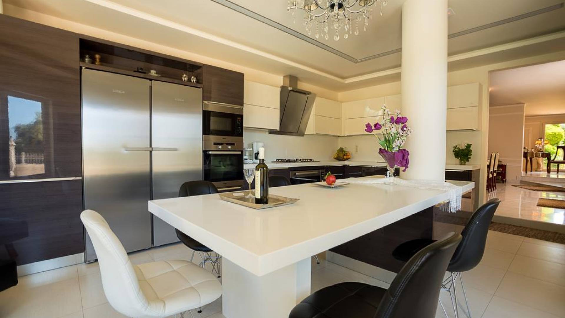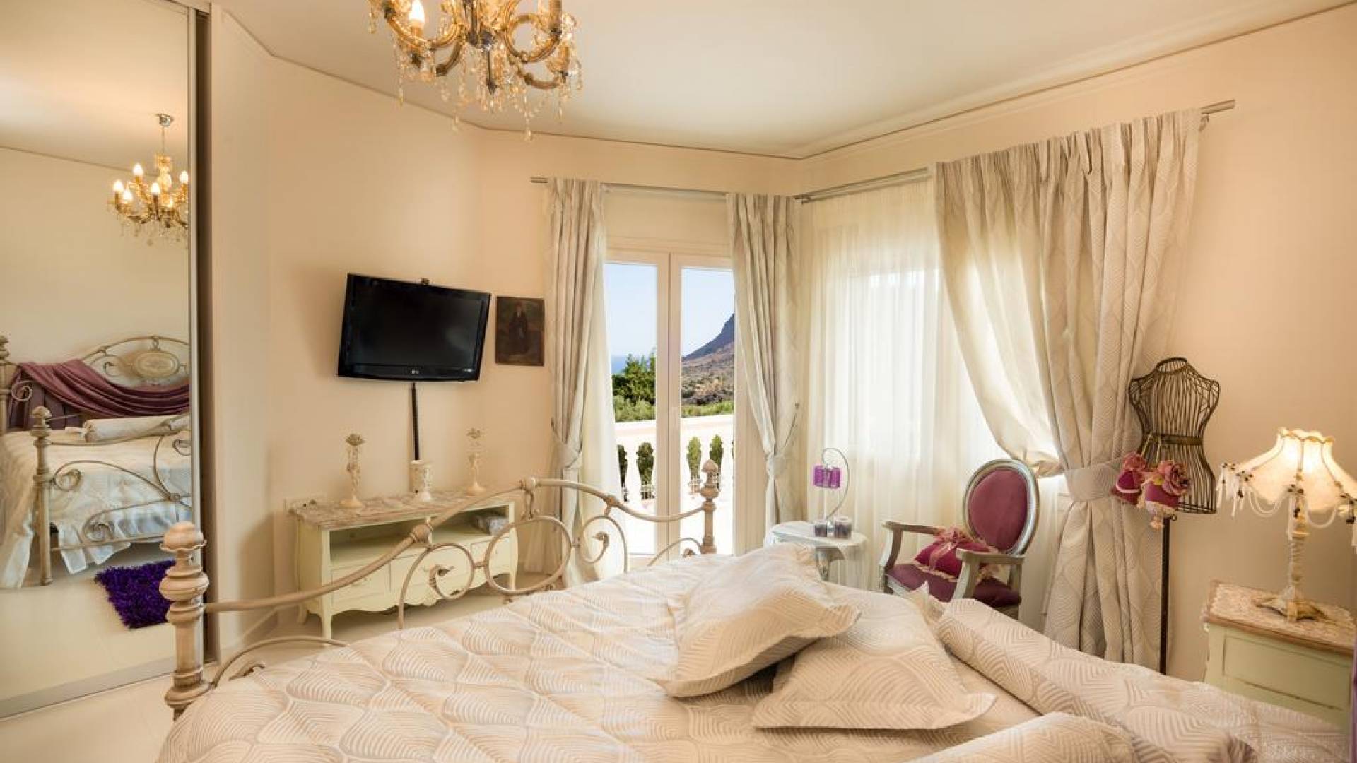 Das Innere der Green Palace Villa Crete kombiniert ein sehr großes Wohnzimmer mit einem Esszimmer, das durch eine geräumige und moderne Küche verbunden ist. Die Küche ist komplett ausgestattet und mit modernen Geräten und Kochzubehör ausgestattet. Es verfügt außerdem über ein eigenes Esszimmer, Sitzgelegenheiten, einen Fernseher und einen fantastischen Blick auf den Pool und den Garten. Der Rest besteht aus einem einzigen Büroraum, einem großen Wohnzimmer mit Kamin, Fernseher und herrlichem Blick auf den Garten, den Pool und einen grünen Hang.