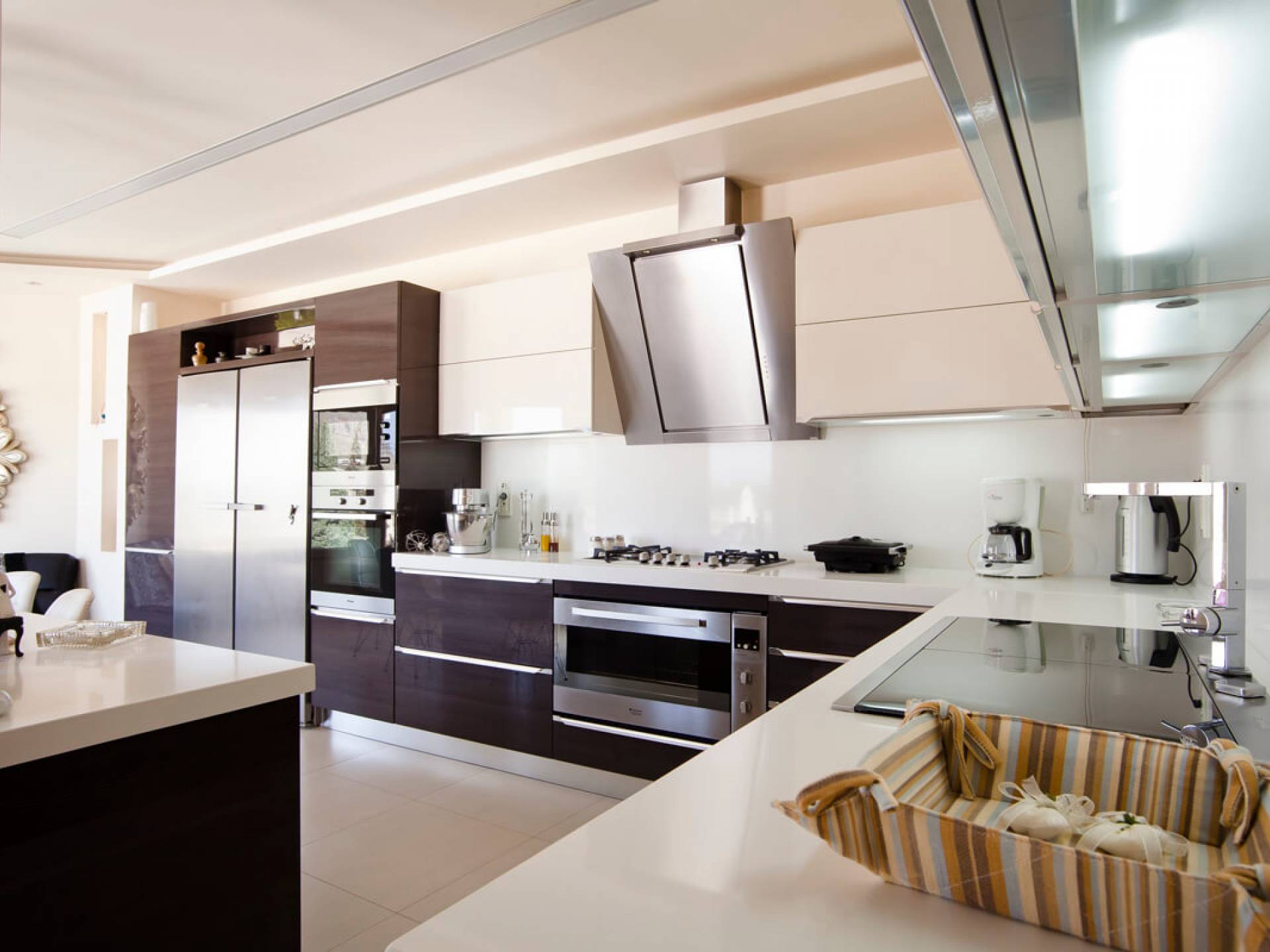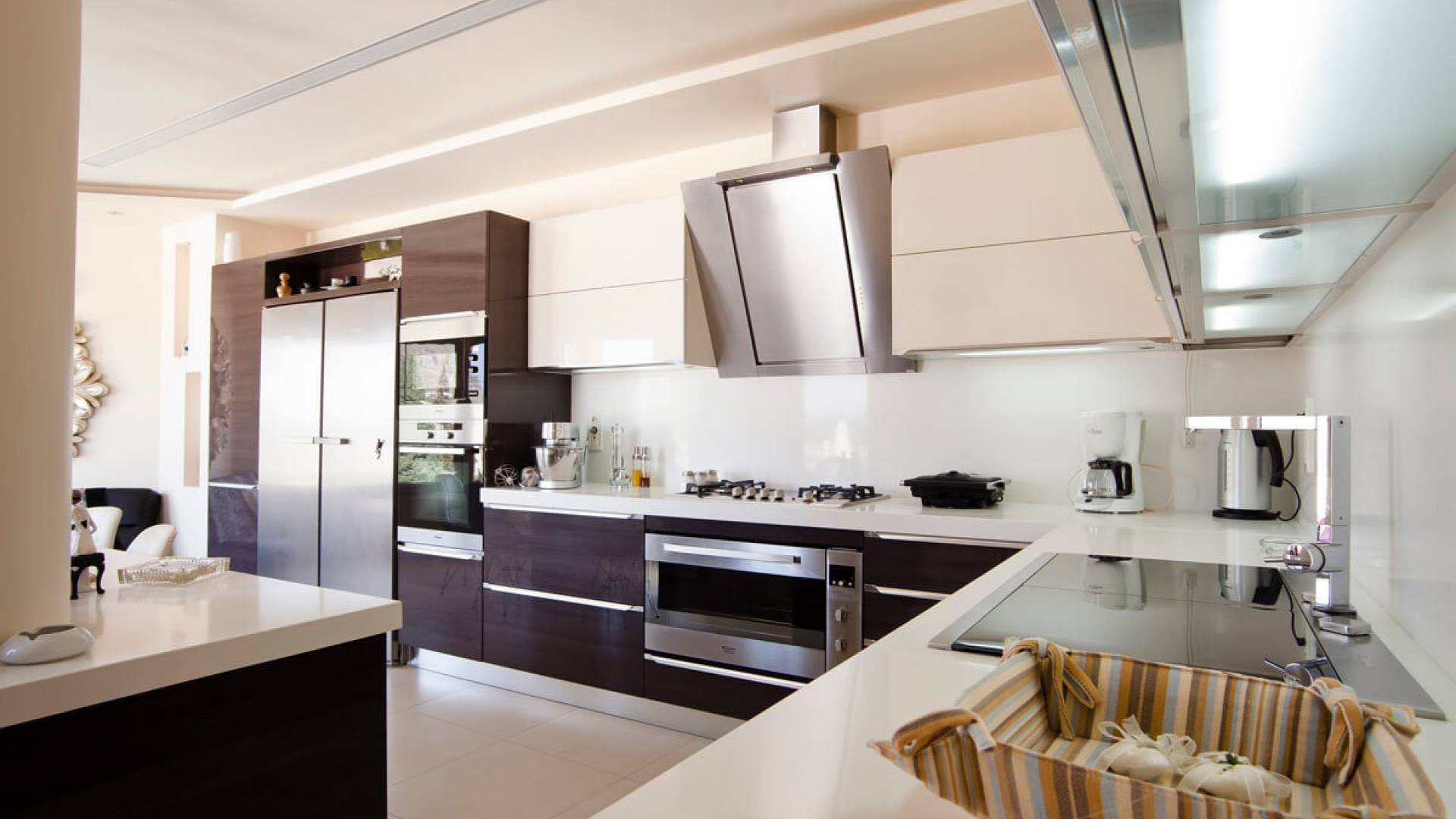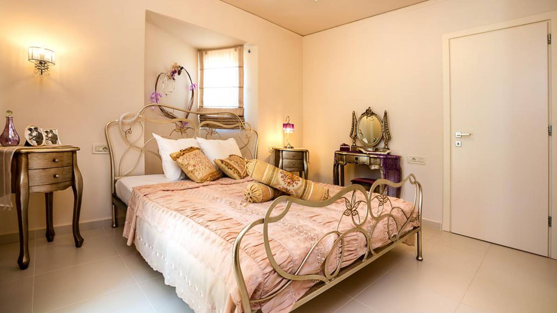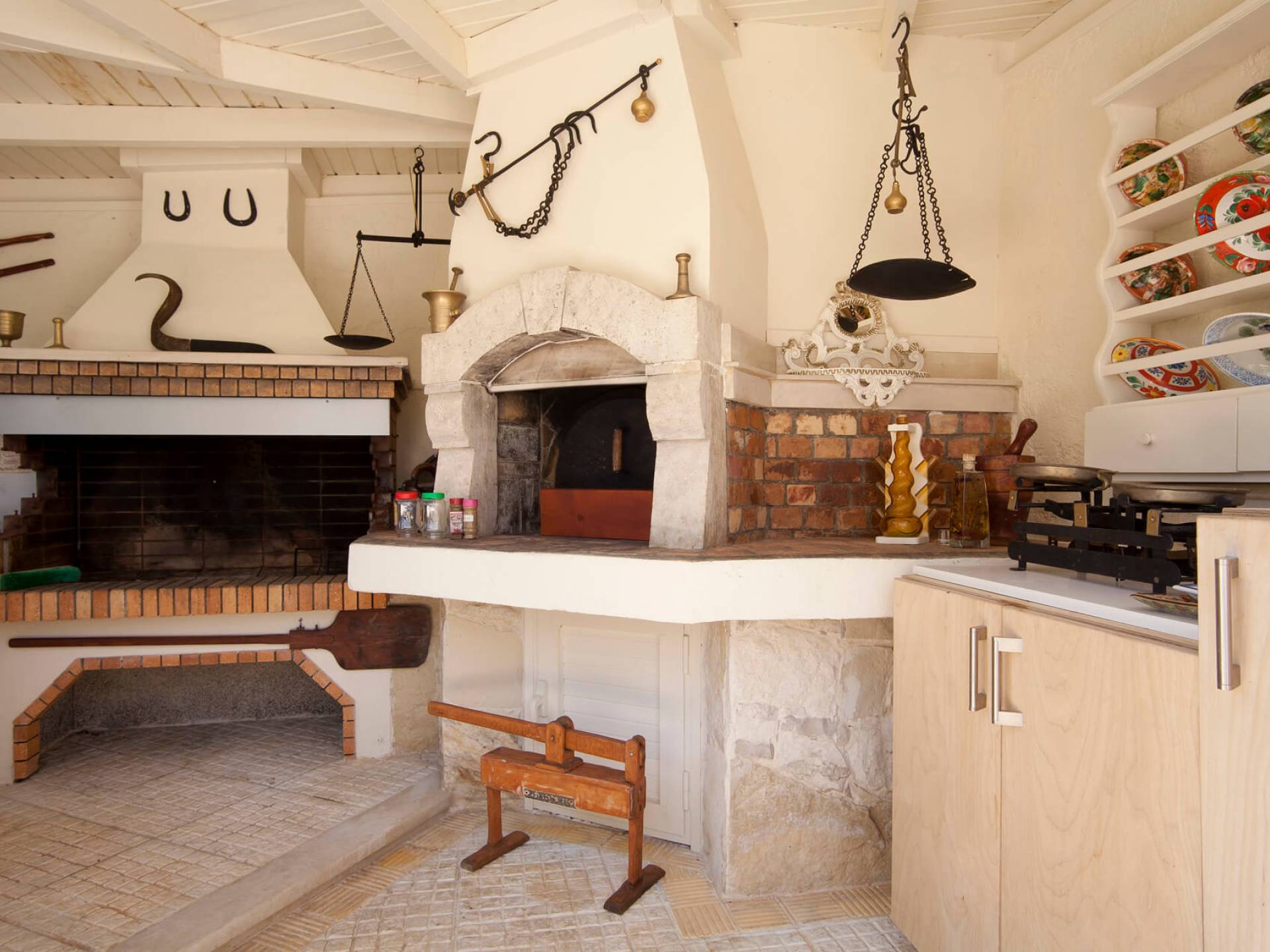 Das Innere der Green Palace Villa Crete kombiniert ein sehr großes Wohnzimmer mit einem Esszimmer, das durch eine geräumige und moderne Küche verbunden ist. Die Küche ist komplett ausgestattet und mit modernen Geräten und Kochzubehör ausgestattet. Es verfügt außerdem über ein eigenes Esszimmer, Sitzgelegenheiten, einen Fernseher und einen fantastischen Blick auf den Pool und den Garten. Der Rest besteht aus einem einzigen Büroraum, einem großen Wohnzimmer mit Kamin, Fernseher und herrlichem Blick auf den Garten, den Pool und einen grünen Hang.