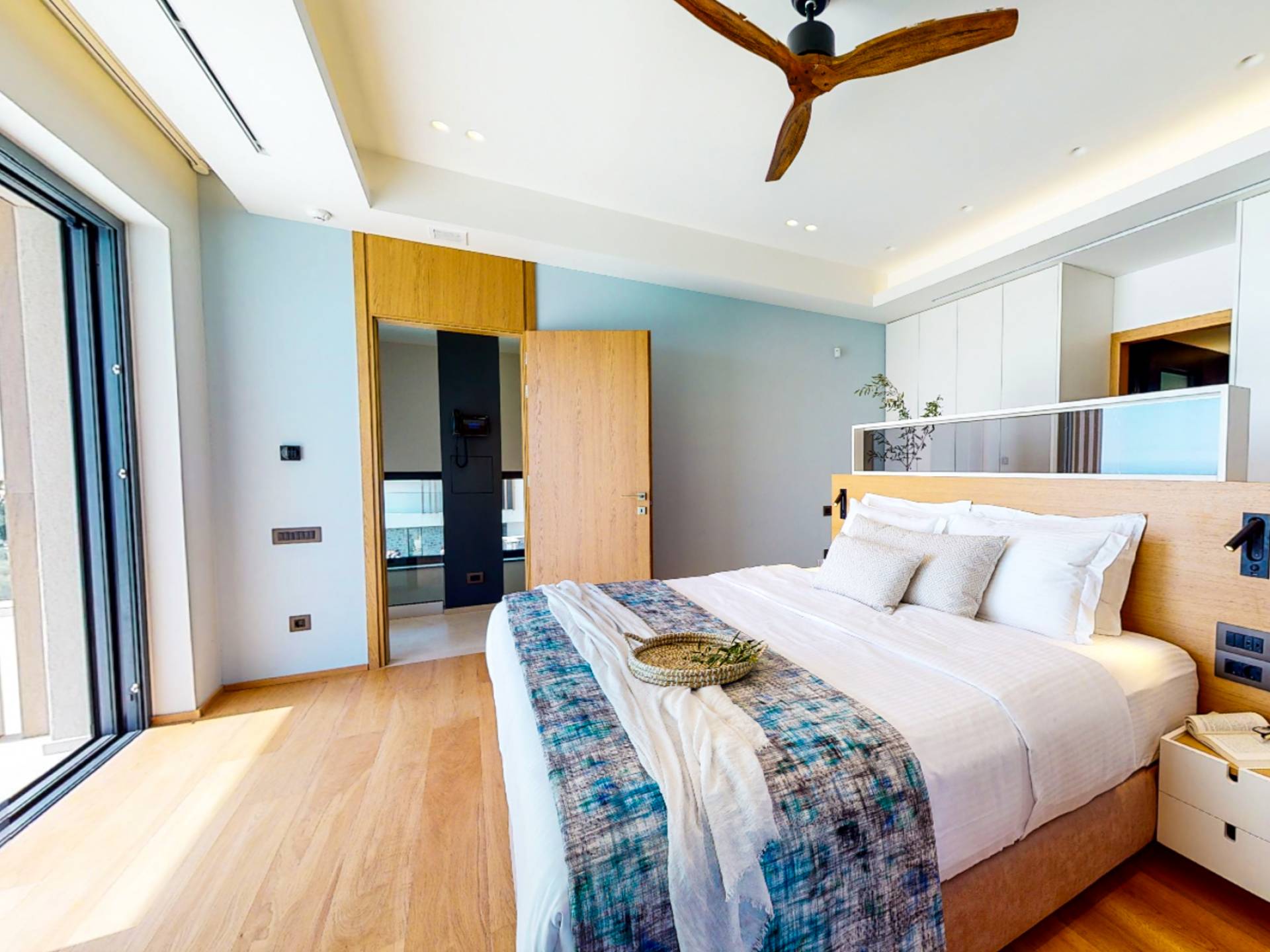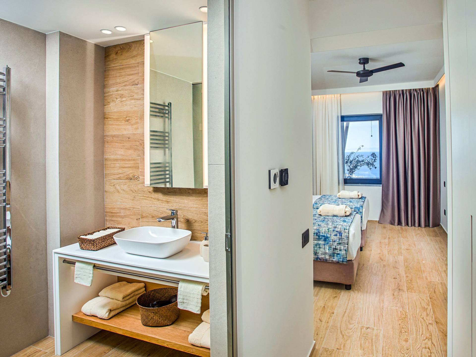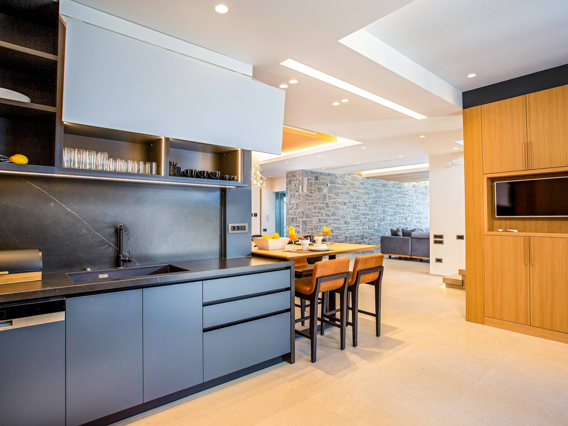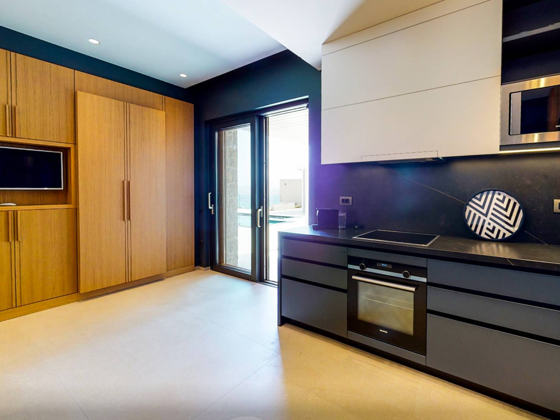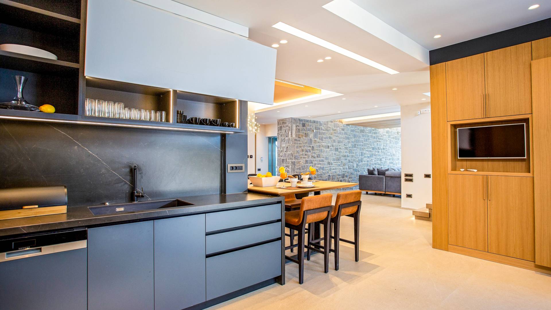Hyperion Luxury Villa ist auf 500 m2 Fläche gebaut, bestehend aus vier Ebenen, mit direktem Zugang vom Infinity-Pool und Terrassenbereich zum Erdgeschoss mit seiner voll ausgestatteten modernen Küche mit offenem Wohn- und Sitzbereich. Es ist ein behindertengerechtes Haus und verfügt über einen modernen Aufzug, der vom Eingang im zweiten Stock der Villa aus zugänglich ist und auch zum 1. Hauptschlafzimmer führt, wo sich die Rollstuhlrampe befindet.