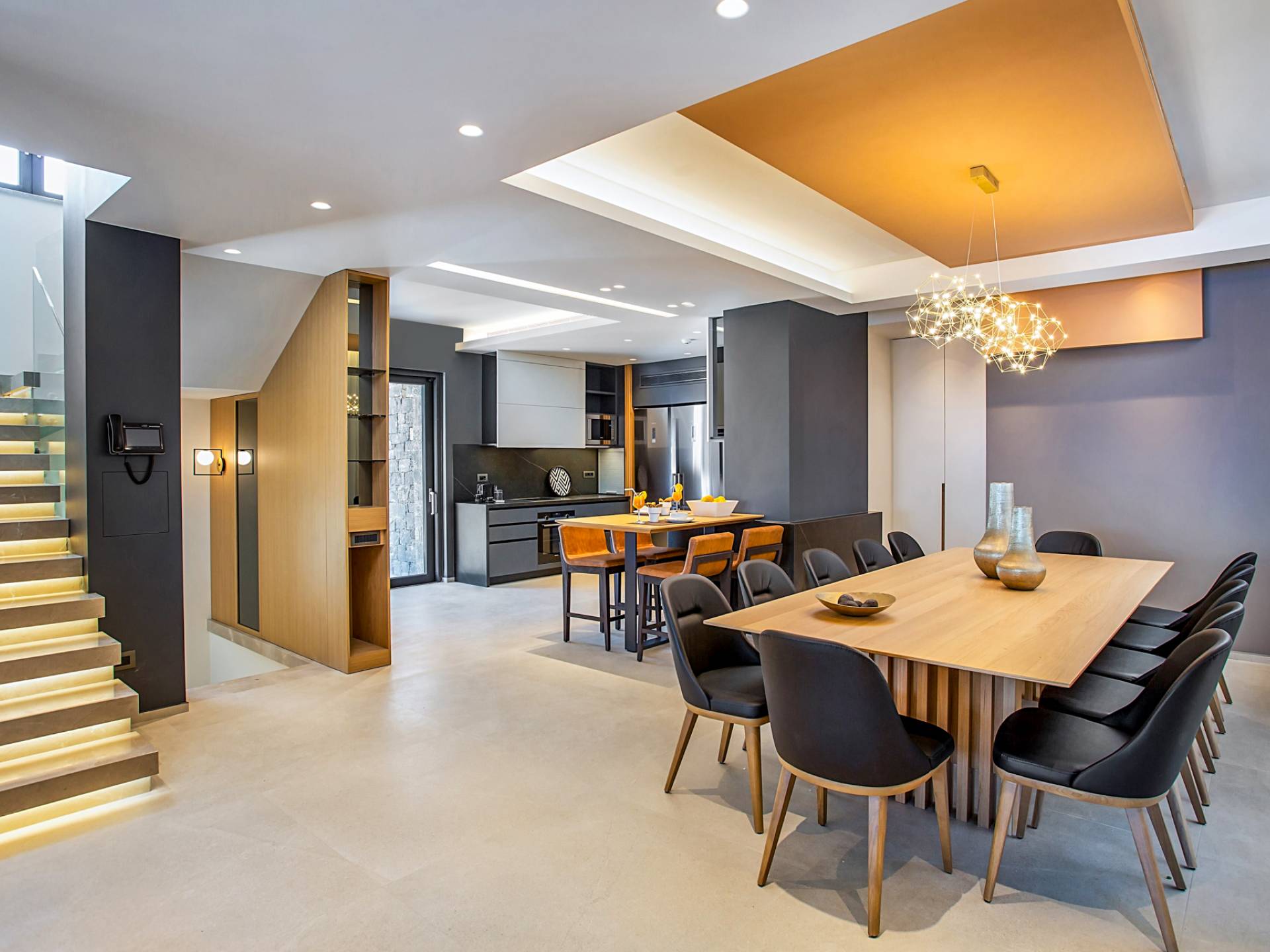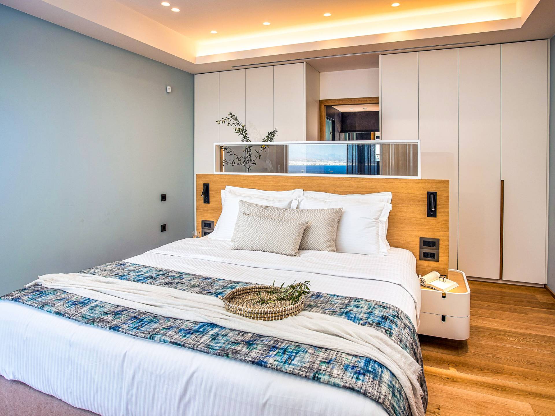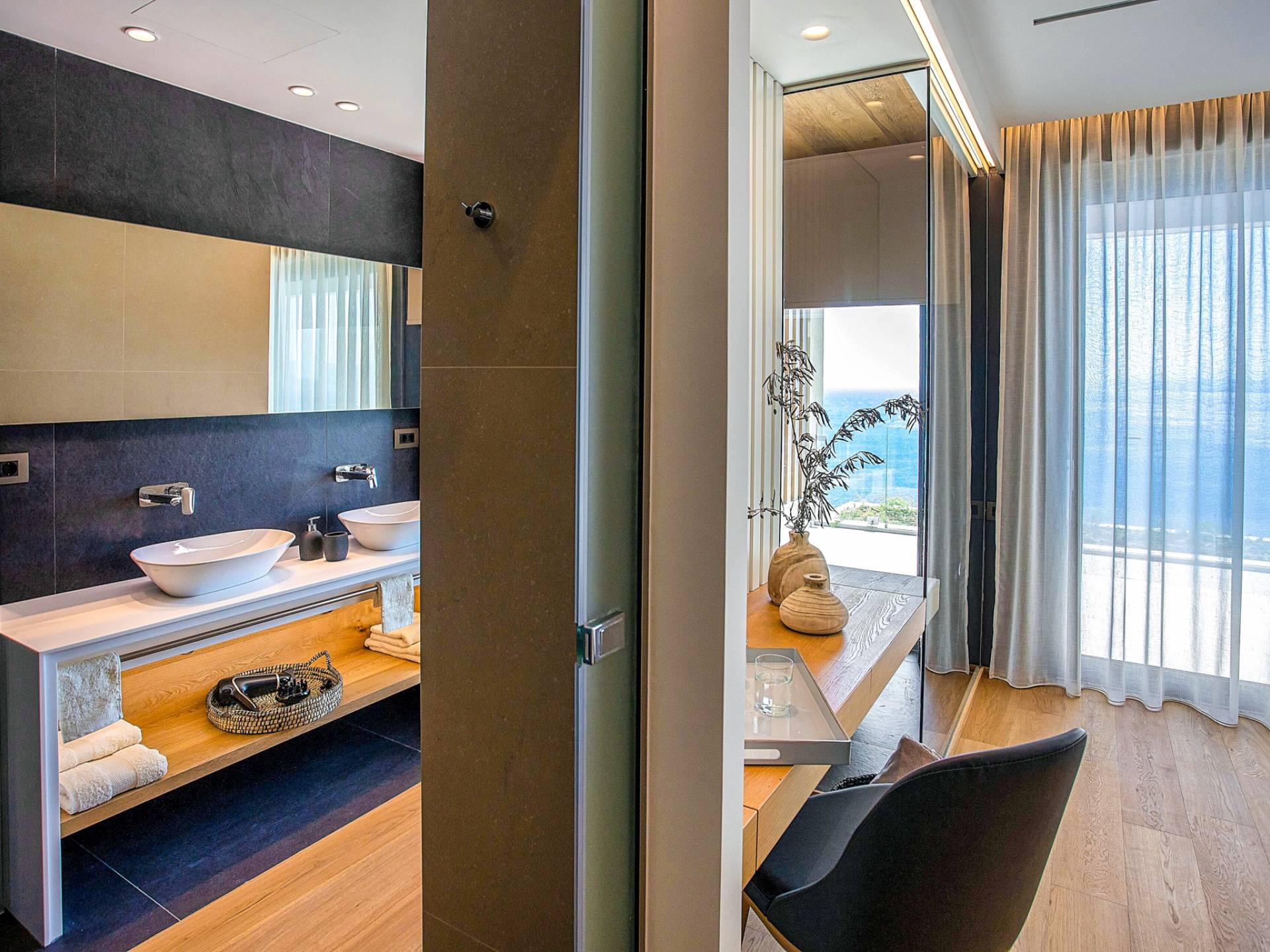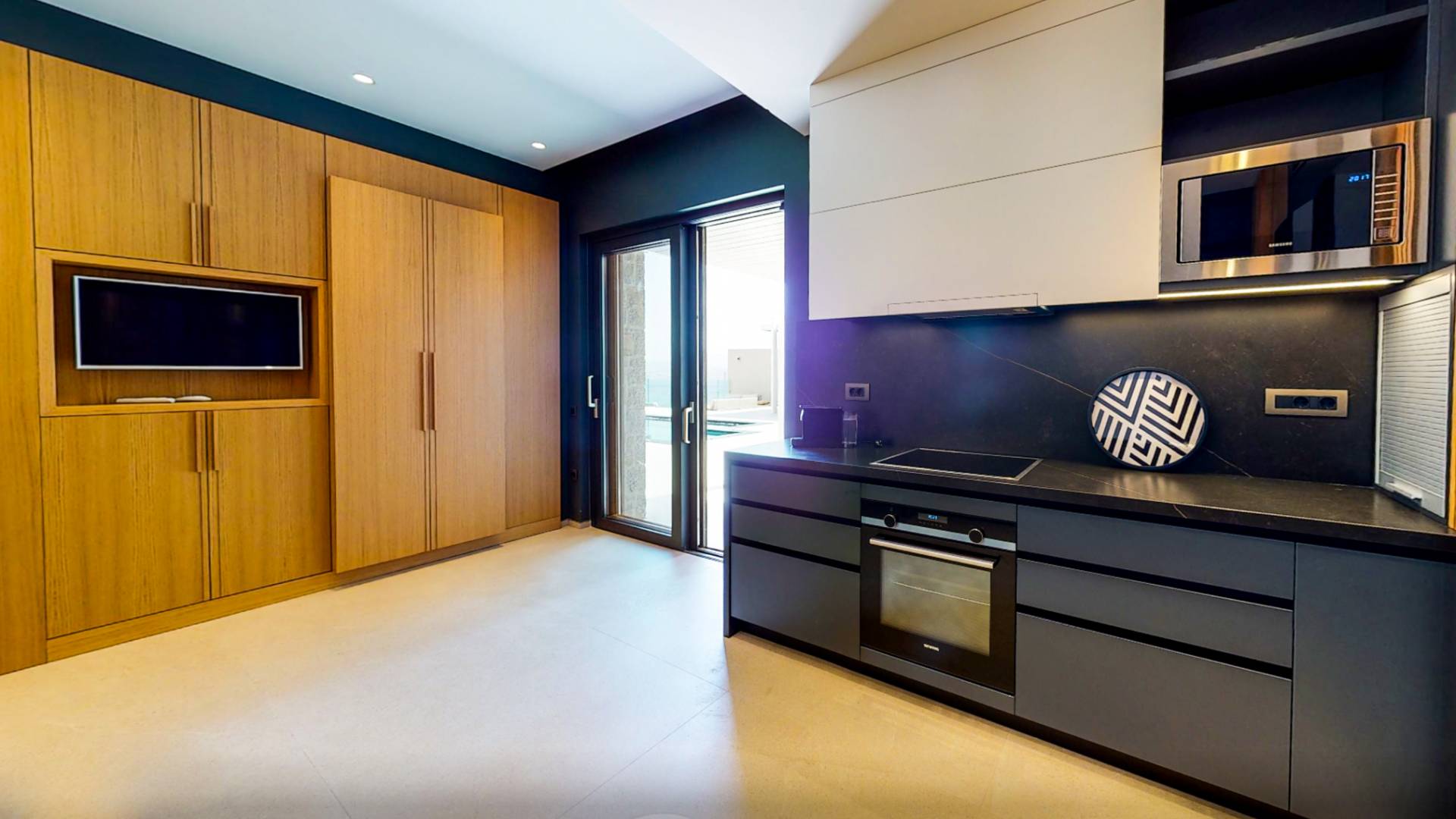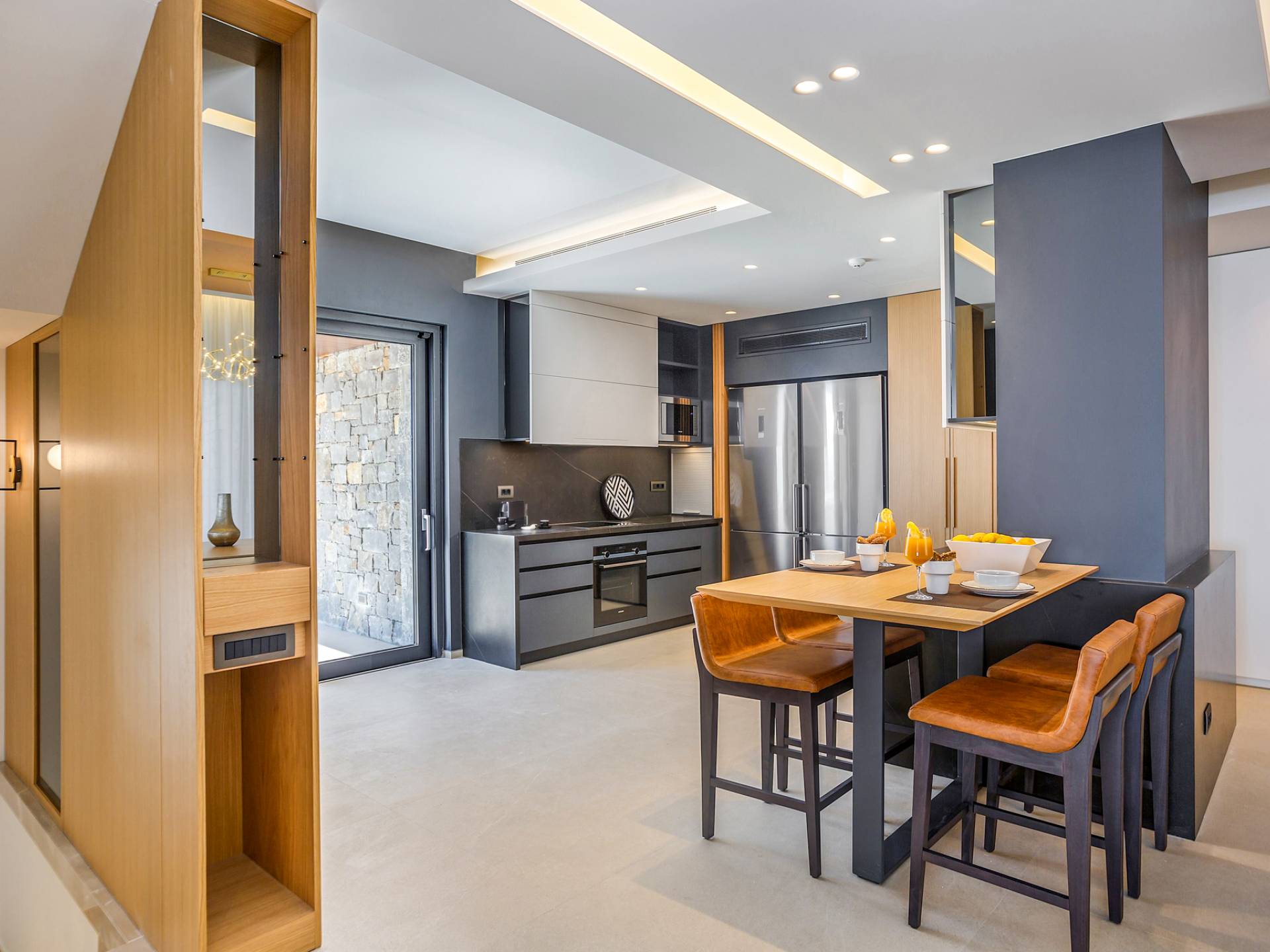Hyperion Luxury Villa ist auf 500 m2 Fläche gebaut, bestehend aus vier Ebenen, mit direktem Zugang vom Infinity-Pool und Terrassenbereich zum Erdgeschoss mit seiner voll ausgestatteten modernen Küche mit offenem Wohn- und Sitzbereich. Es ist ein behindertengerechtes Haus und verfügt über einen modernen Aufzug, der vom Eingang im zweiten Stock der Villa aus zugänglich ist und auch zum 1. Hauptschlafzimmer führt, wo sich die Rollstuhlrampe befindet.