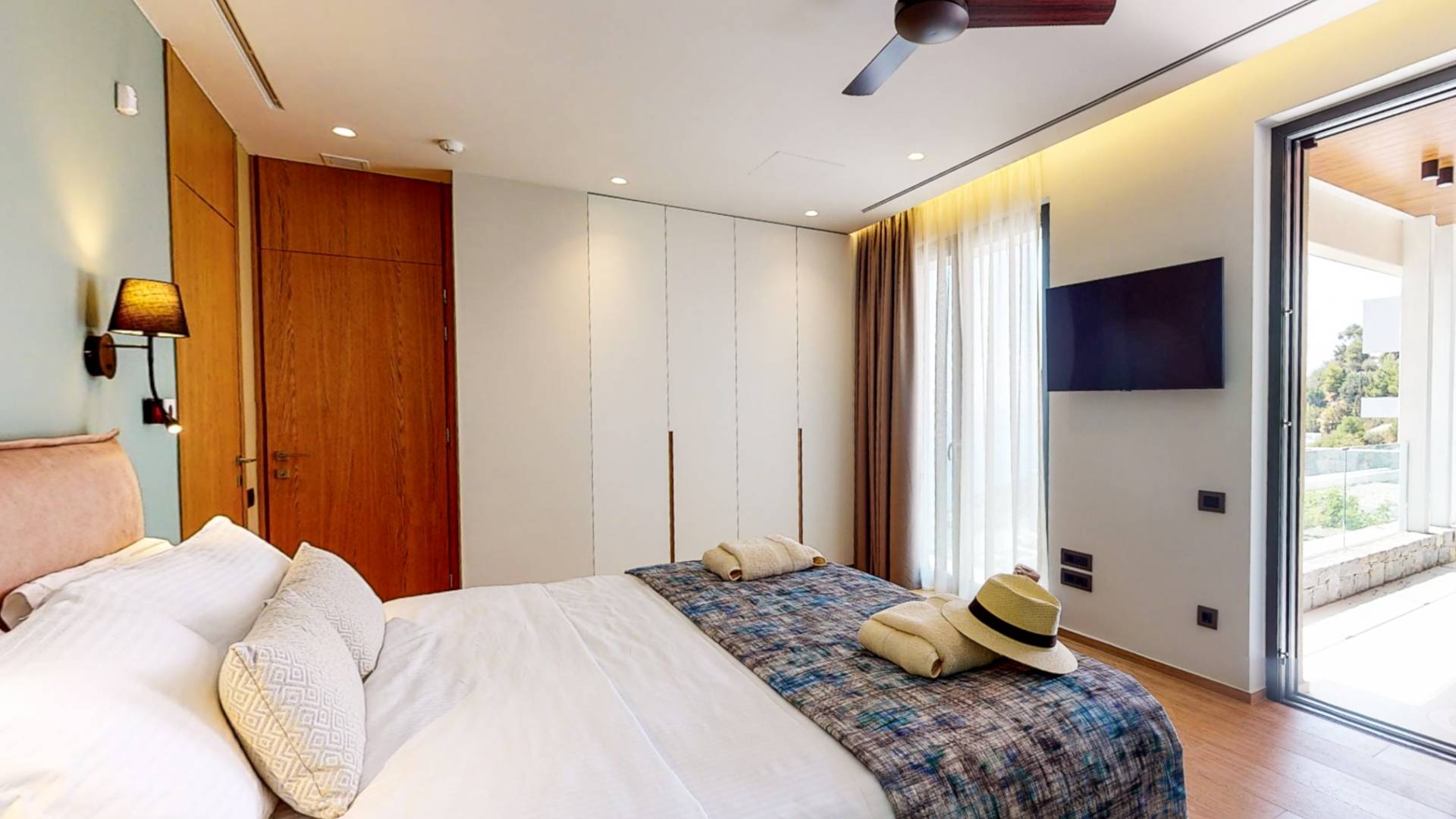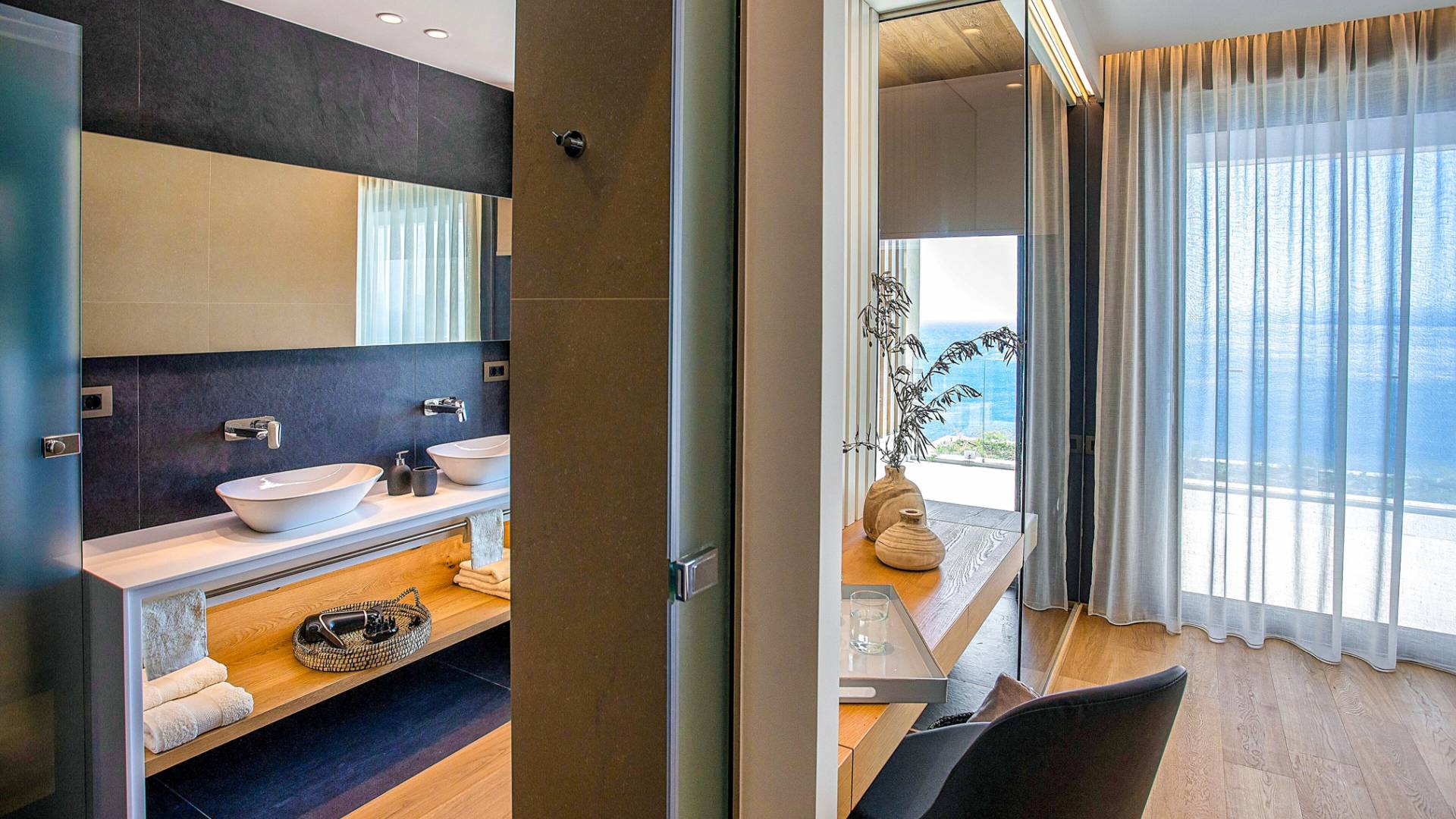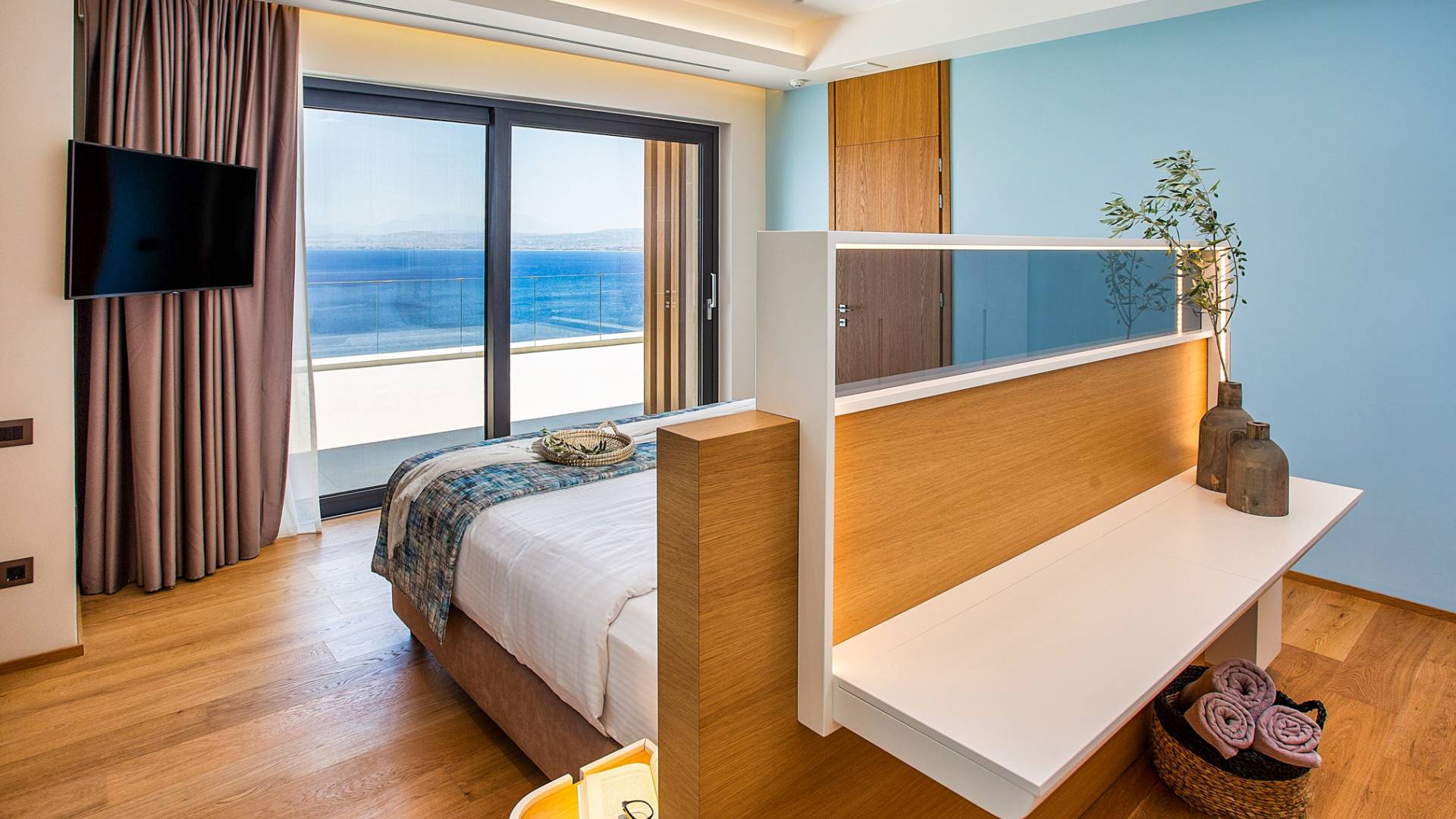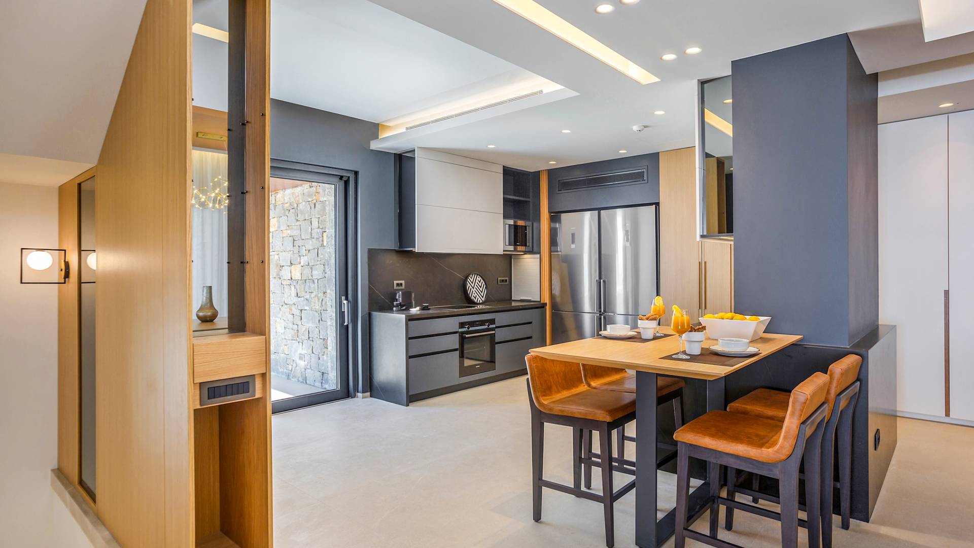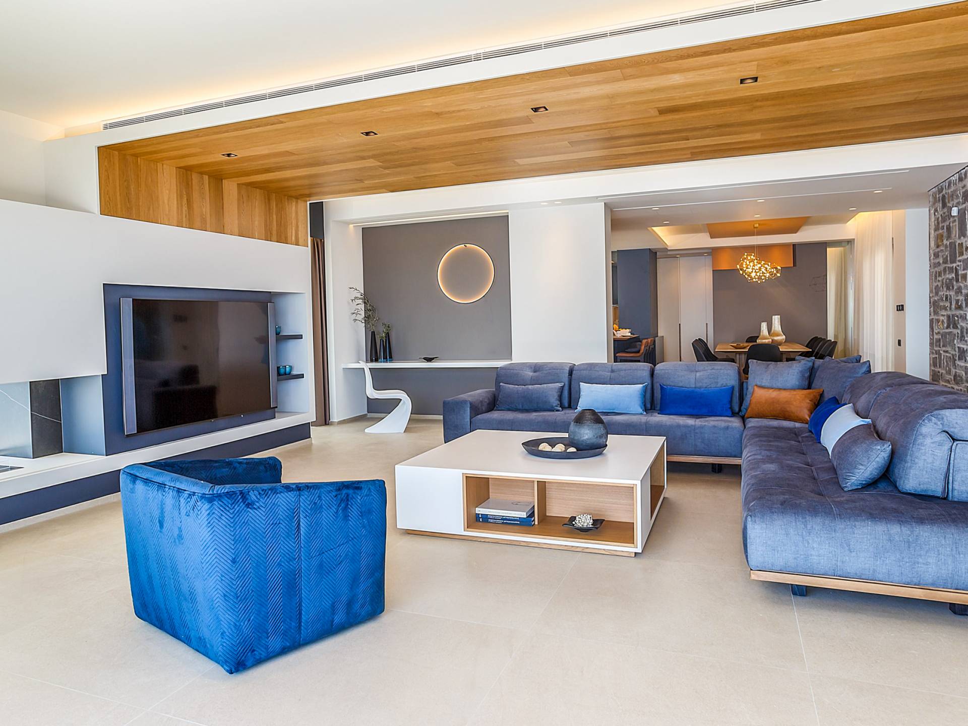 Hyperion Luxury Villa ist auf 500 m2 Fläche gebaut, bestehend aus vier Ebenen, mit direktem Zugang vom Infinity-Pool und Terrassenbereich zum Erdgeschoss mit seiner voll ausgestatteten modernen Küche mit offenem Wohn- und Sitzbereich. Es ist ein behindertengerechtes Haus und verfügt über einen modernen Aufzug, der vom Eingang im zweiten Stock der Villa aus zugänglich ist und auch zum 1. Hauptschlafzimmer führt, wo sich die Rollstuhlrampe befindet.