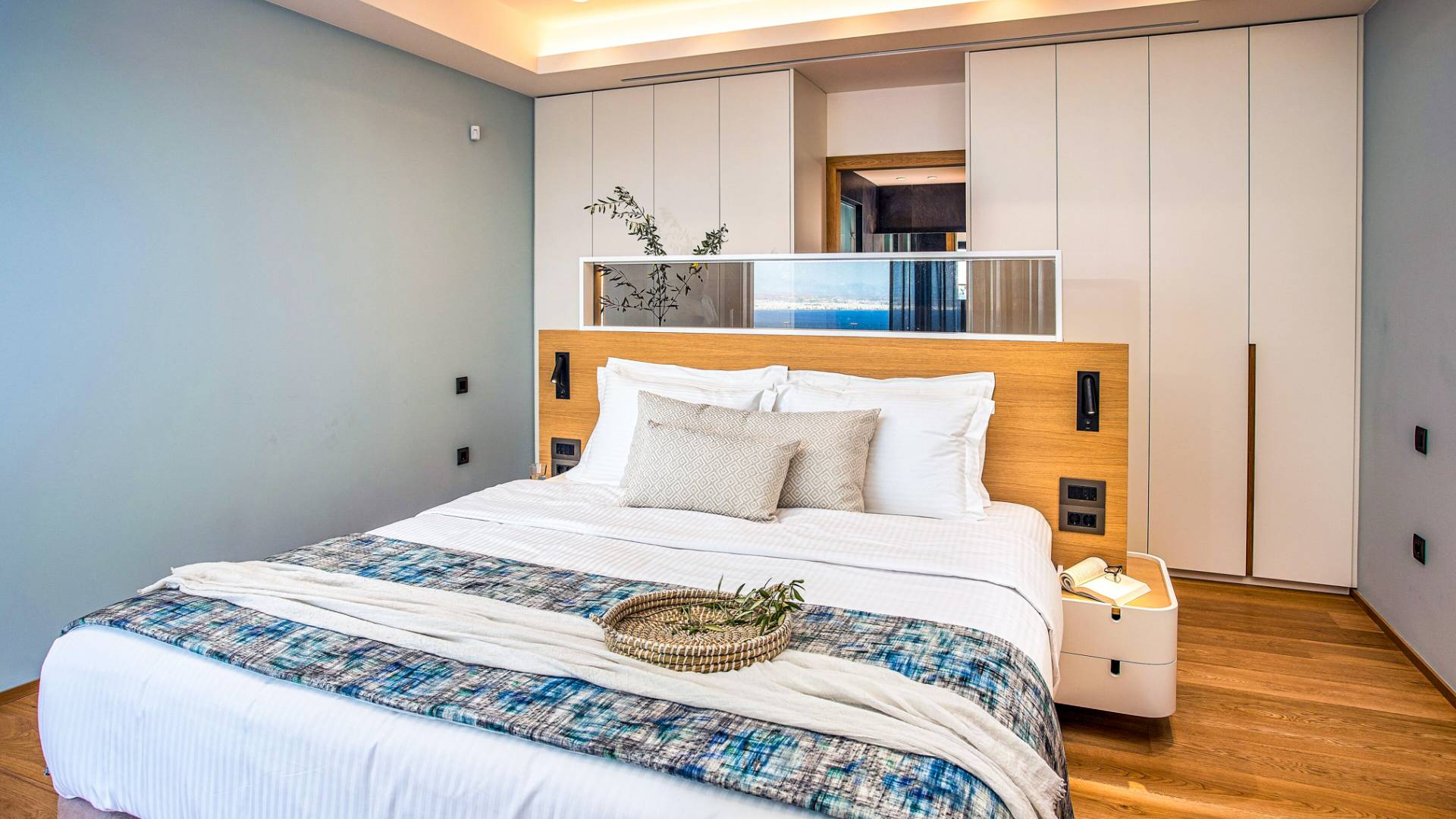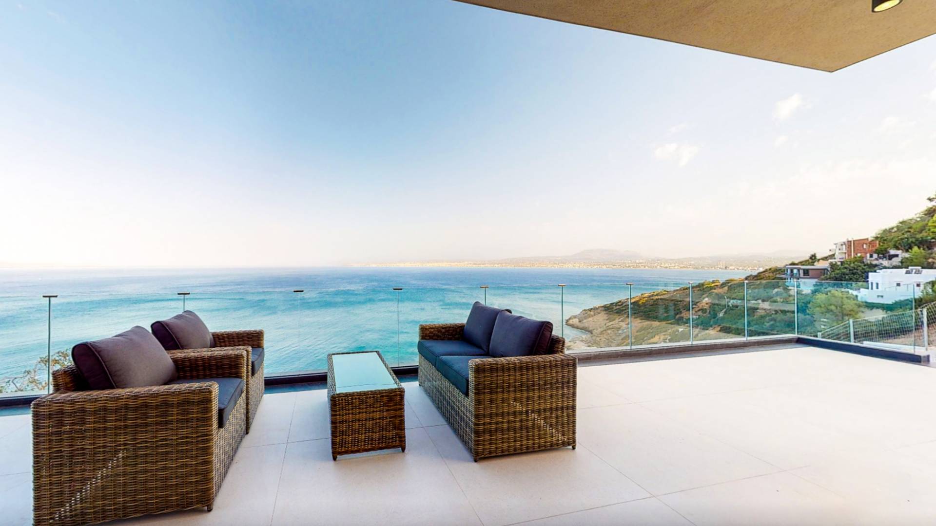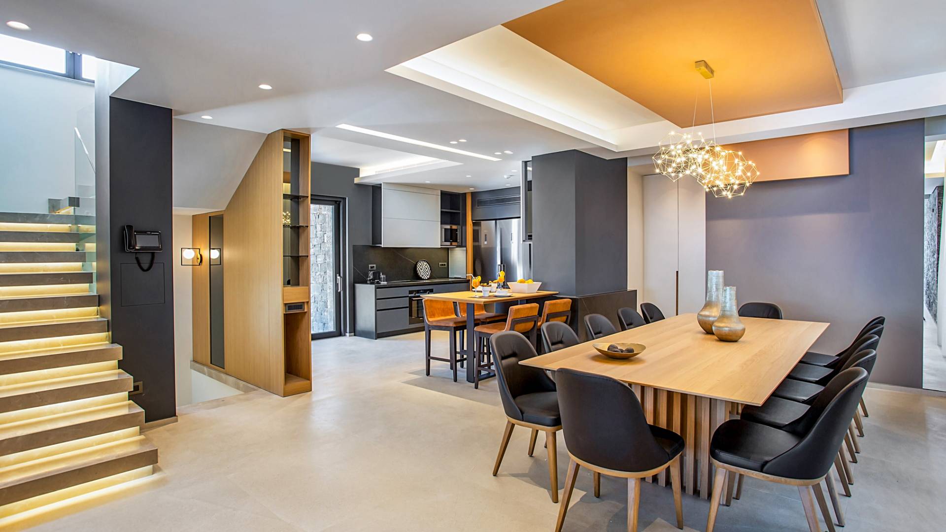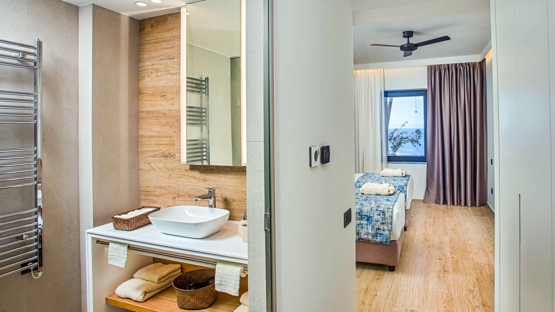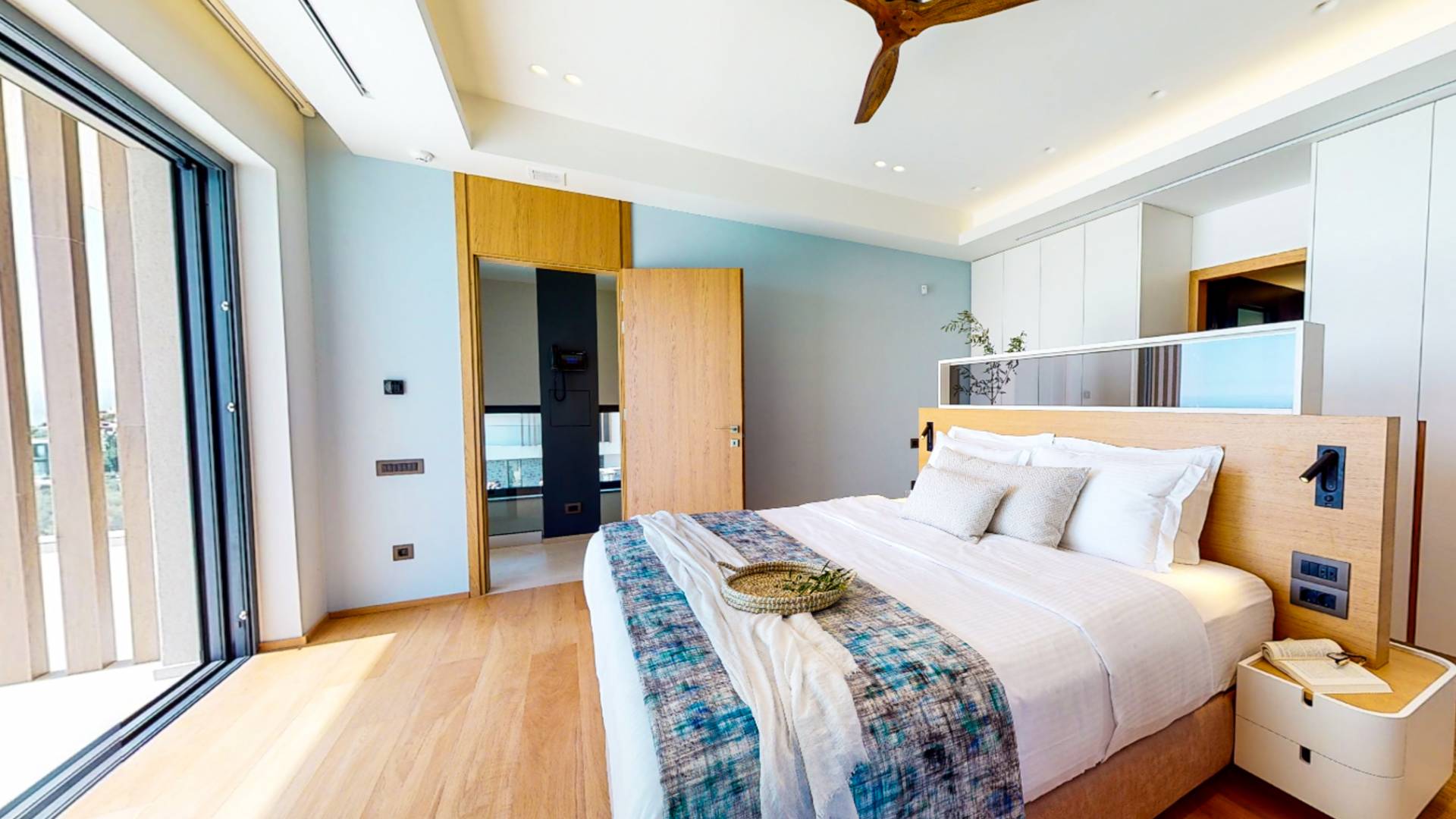 Hyperion Luxury Villa ist auf 500 m2 Fläche gebaut, bestehend aus vier Ebenen, mit direktem Zugang vom Infinity-Pool und Terrassenbereich zum Erdgeschoss mit seiner voll ausgestatteten modernen Küche mit offenem Wohn- und Sitzbereich. Es ist ein behindertengerechtes Haus und verfügt über einen modernen Aufzug, der vom Eingang im zweiten Stock der Villa aus zugänglich ist und auch zum 1. Hauptschlafzimmer führt, wo sich die Rollstuhlrampe befindet.