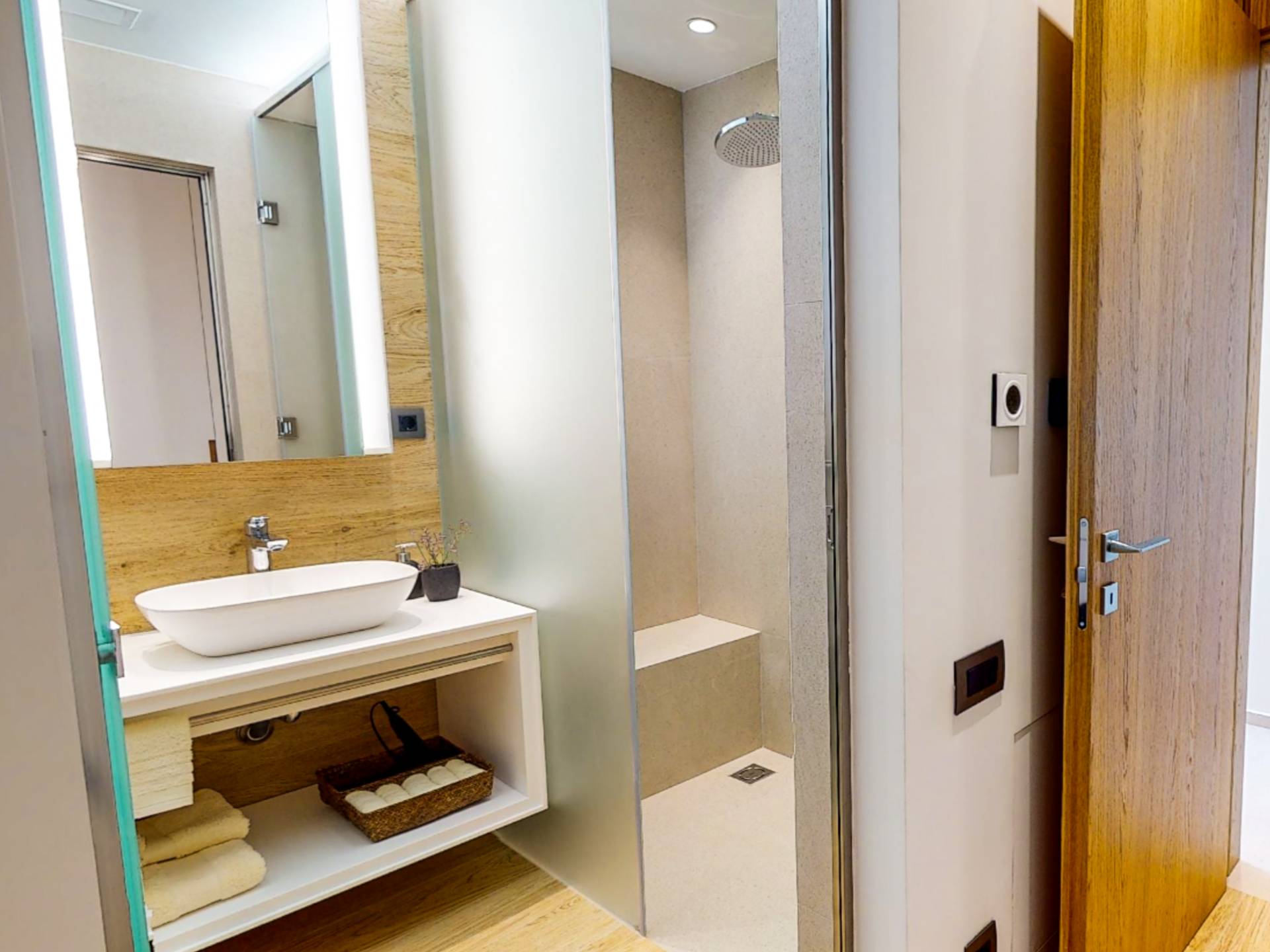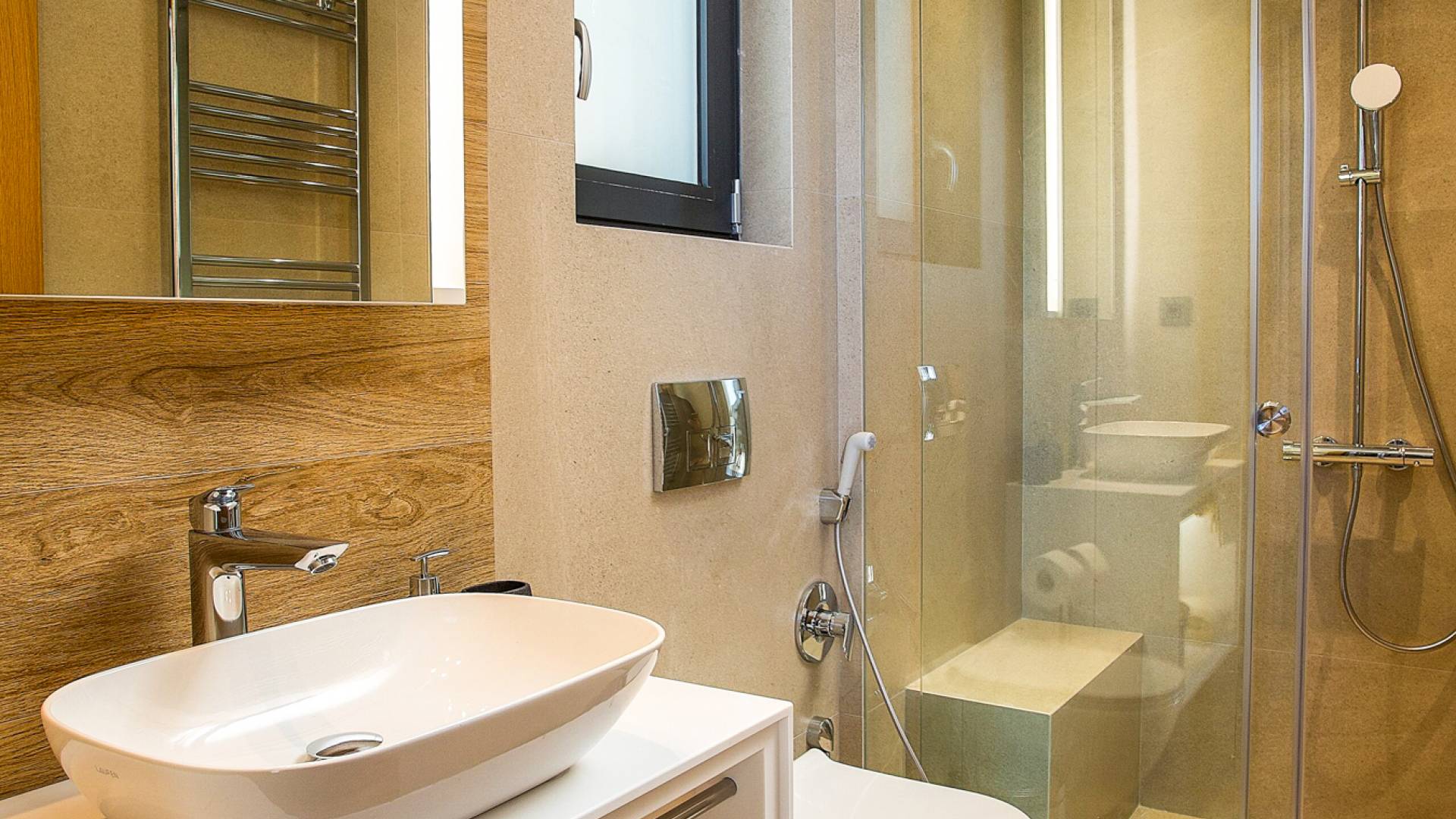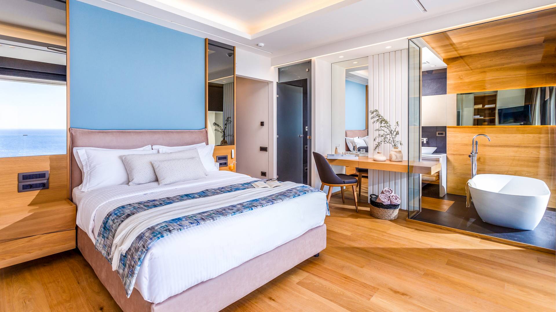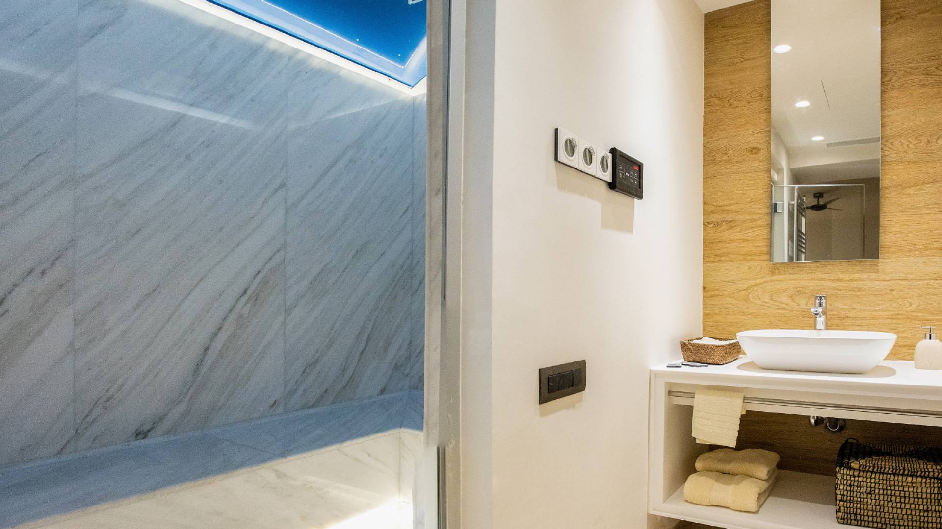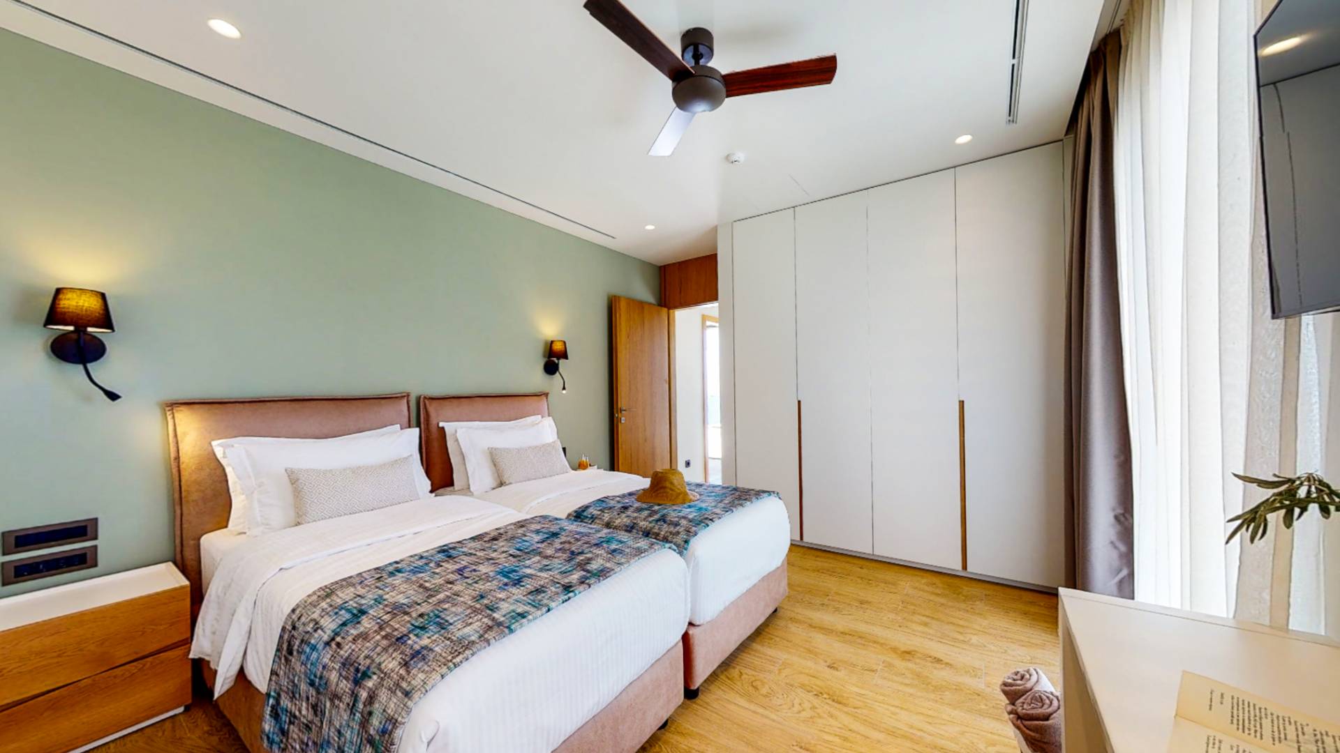 Hyperion Luxury Villa ist auf 500 m2 Fläche gebaut, bestehend aus vier Ebenen, mit direktem Zugang vom Infinity-Pool und Terrassenbereich zum Erdgeschoss mit seiner voll ausgestatteten modernen Küche mit offenem Wohn- und Sitzbereich. Es ist ein behindertengerechtes Haus und verfügt über einen modernen Aufzug, der vom Eingang im zweiten Stock der Villa aus zugänglich ist und auch zum 1. Hauptschlafzimmer führt, wo sich die Rollstuhlrampe befindet.