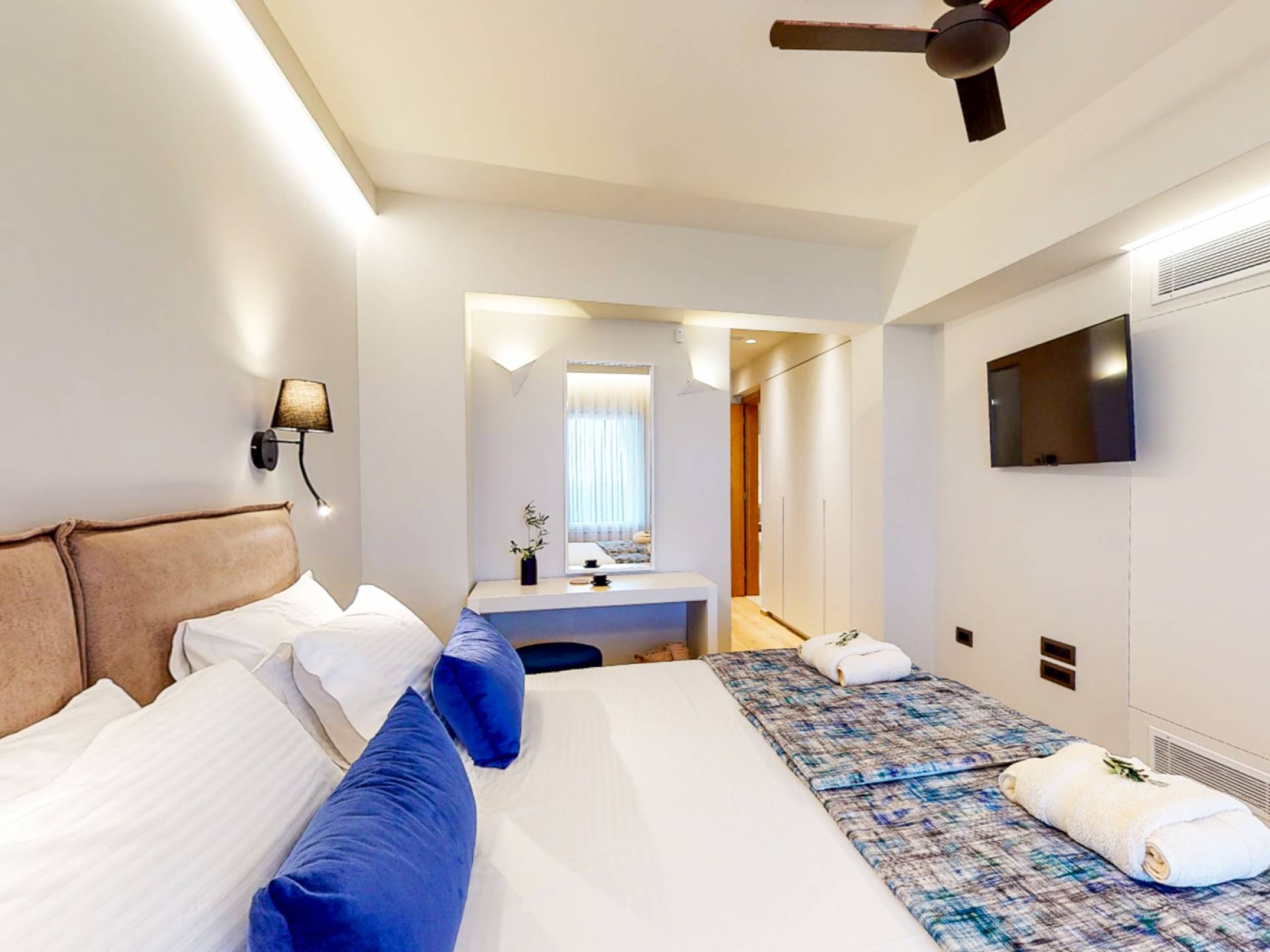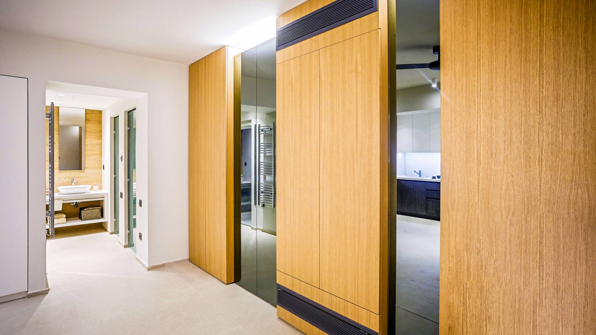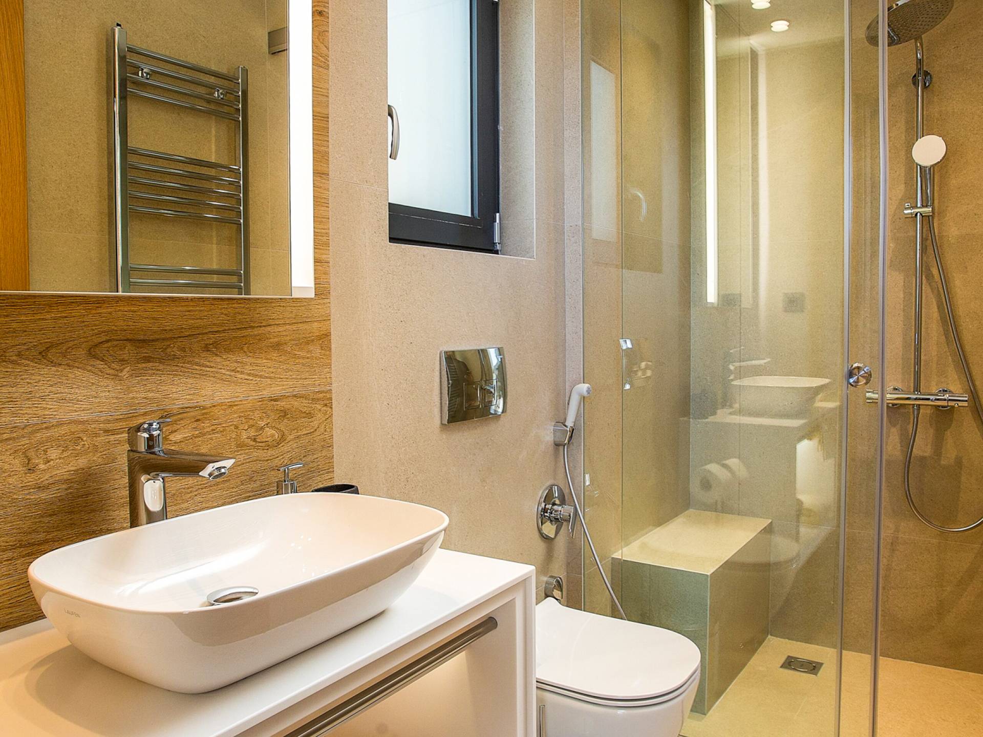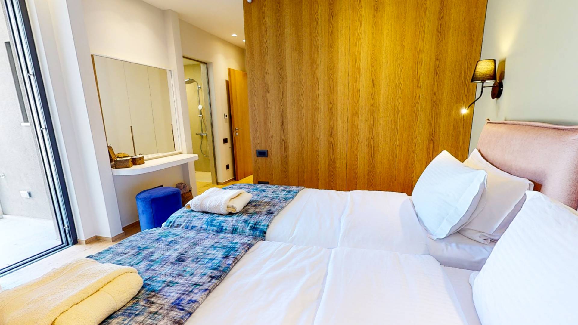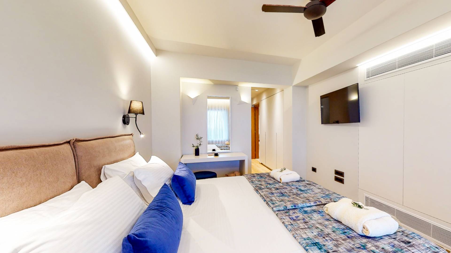 Hyperion Luxury Villa ist auf 500 m2 Fläche gebaut, bestehend aus vier Ebenen, mit direktem Zugang vom Infinity-Pool und Terrassenbereich zum Erdgeschoss mit seiner voll ausgestatteten modernen Küche mit offenem Wohn- und Sitzbereich. Es ist ein behindertengerechtes Haus und verfügt über einen modernen Aufzug, der vom Eingang im zweiten Stock der Villa aus zugänglich ist und auch zum 1. Hauptschlafzimmer führt, wo sich die Rollstuhlrampe befindet.