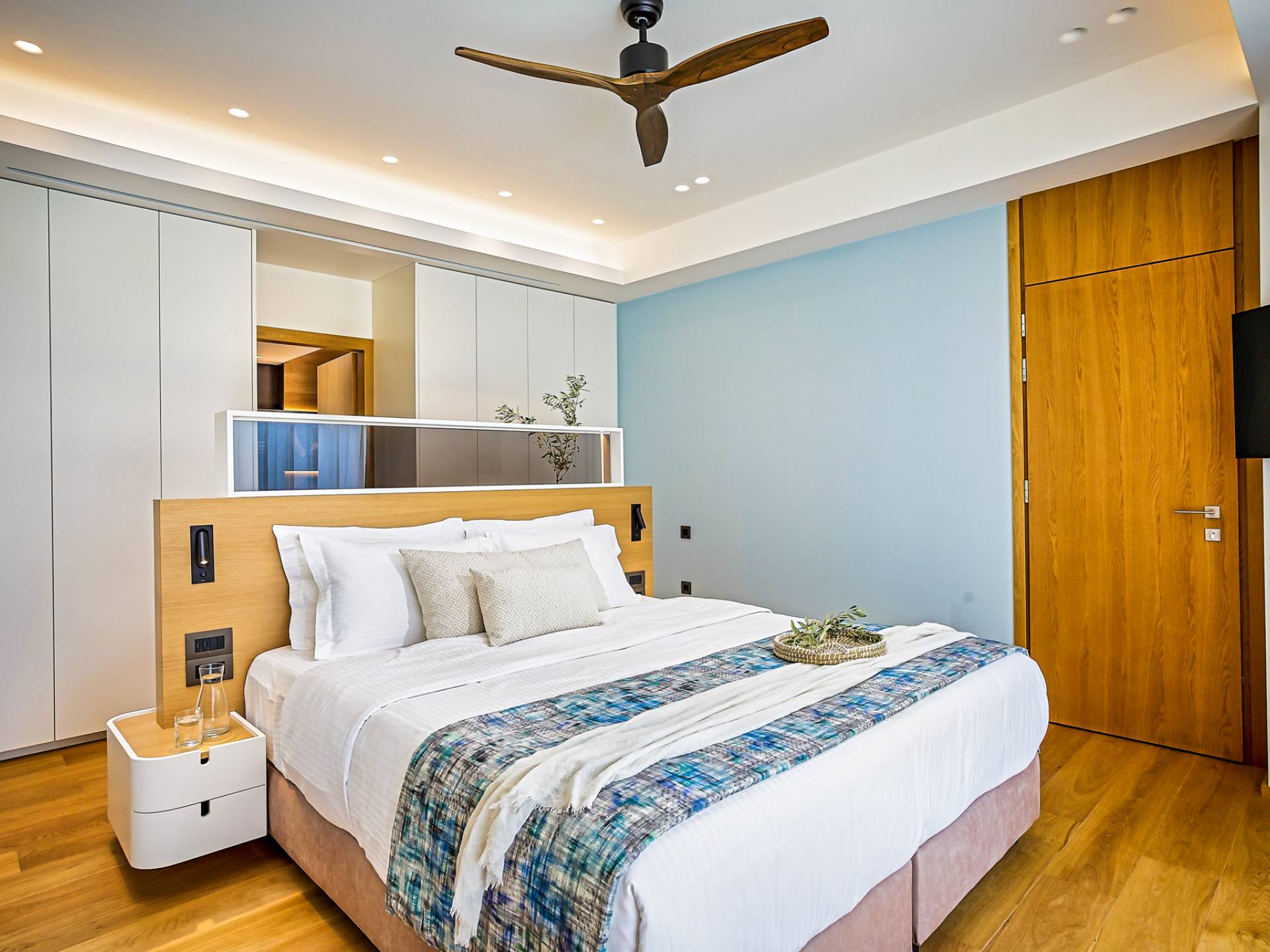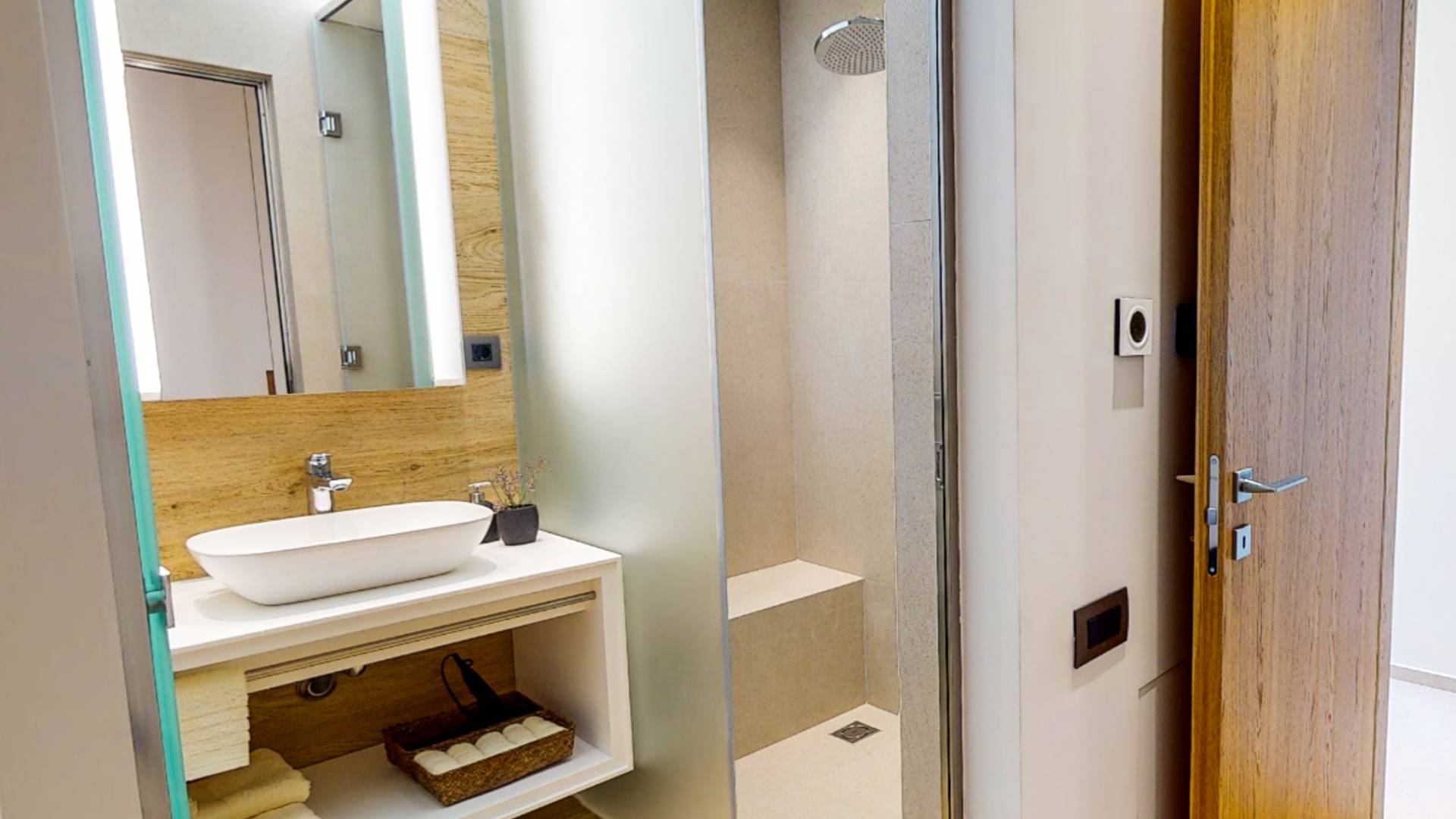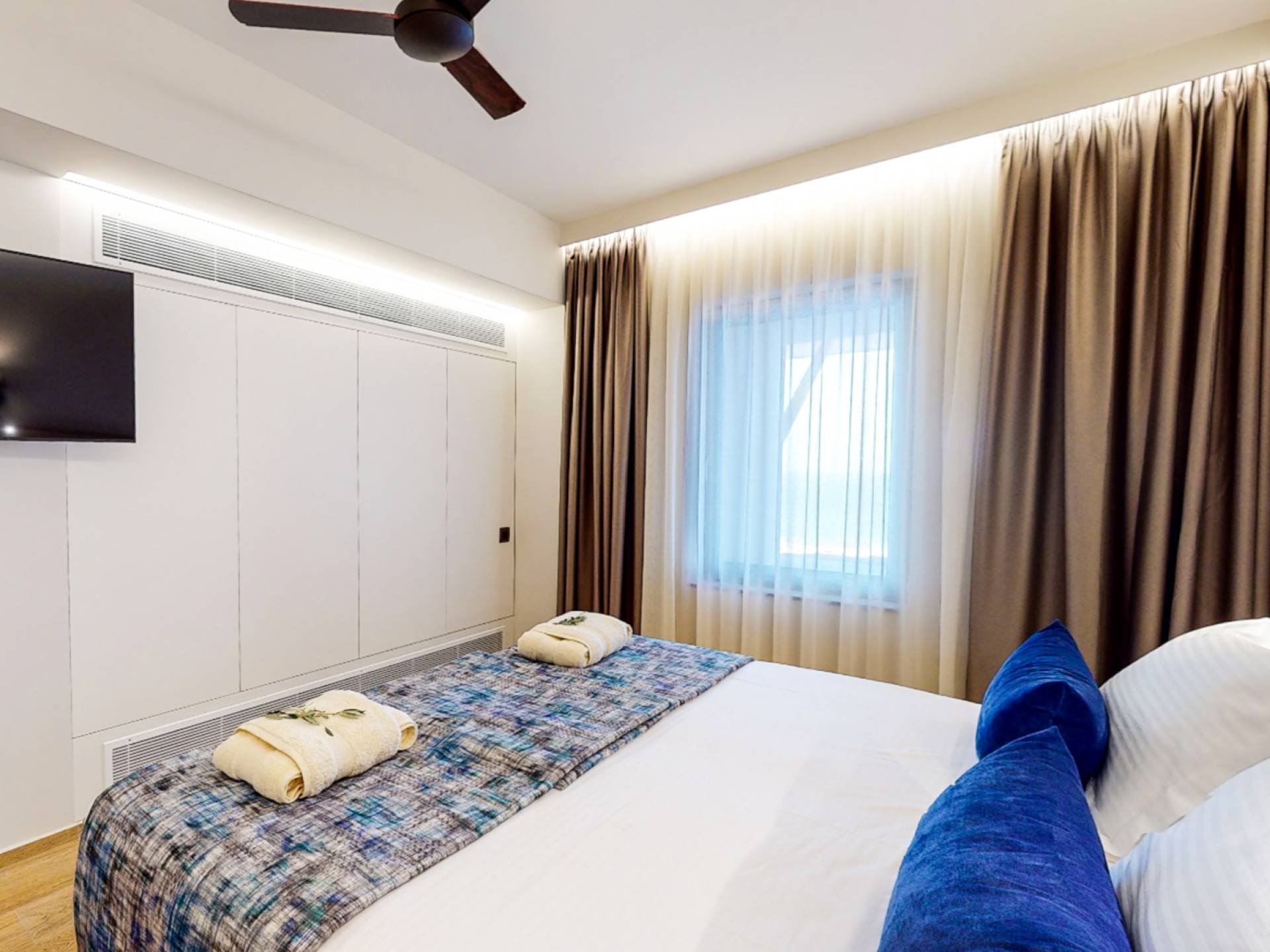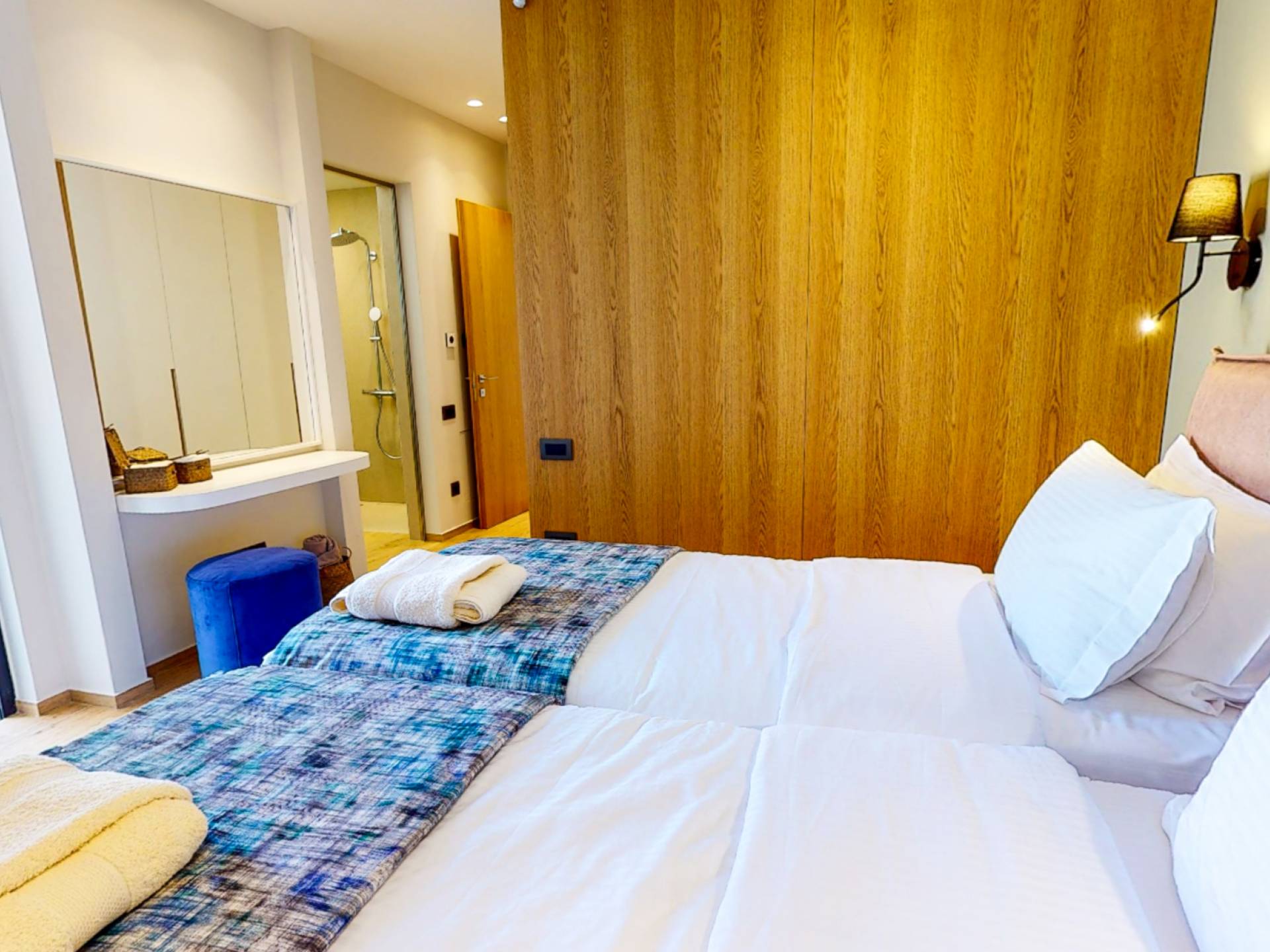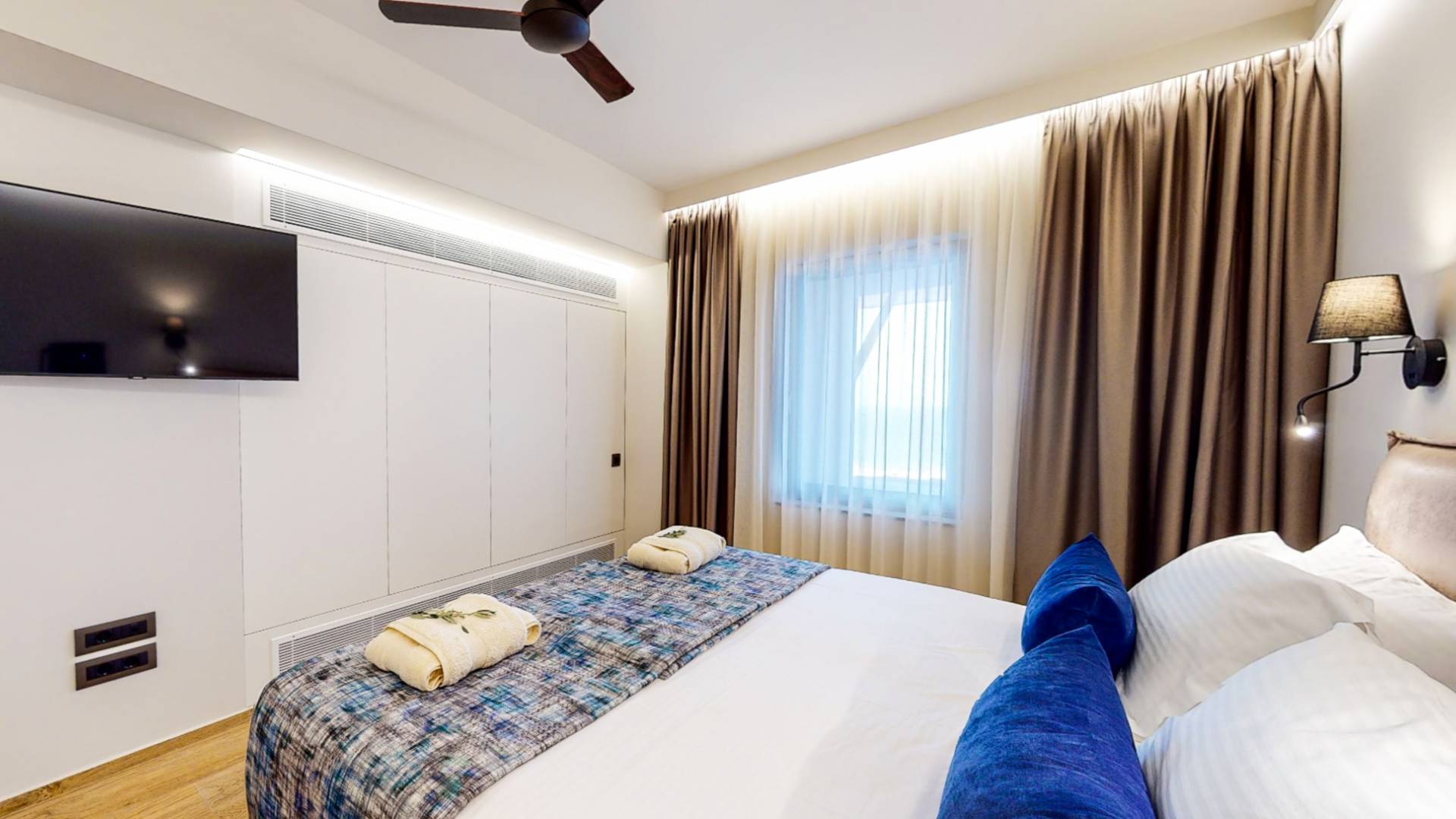 Hyperion Luxury Villa ist auf 500 m2 Fläche gebaut, bestehend aus vier Ebenen, mit direktem Zugang vom Infinity-Pool und Terrassenbereich zum Erdgeschoss mit seiner voll ausgestatteten modernen Küche mit offenem Wohn- und Sitzbereich. Es ist ein behindertengerechtes Haus und verfügt über einen modernen Aufzug, der vom Eingang im zweiten Stock der Villa aus zugänglich ist und auch zum 1. Hauptschlafzimmer führt, wo sich die Rollstuhlrampe befindet.
