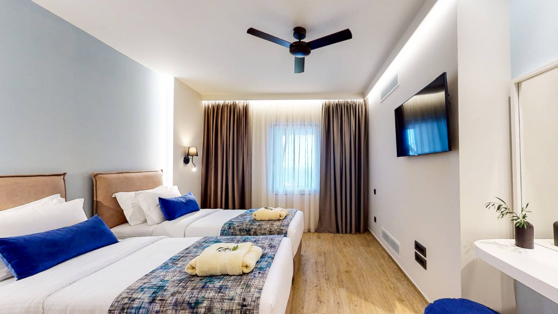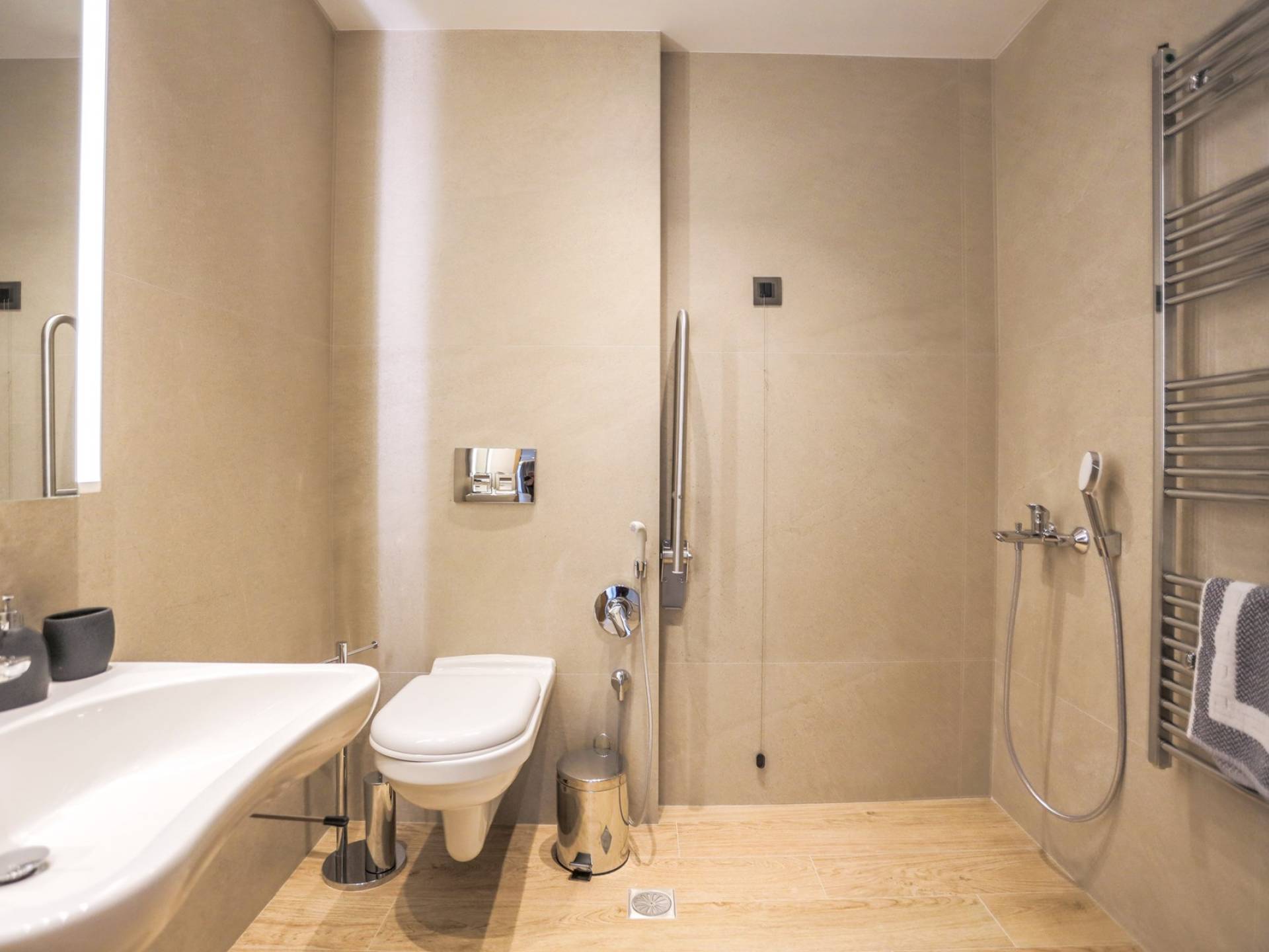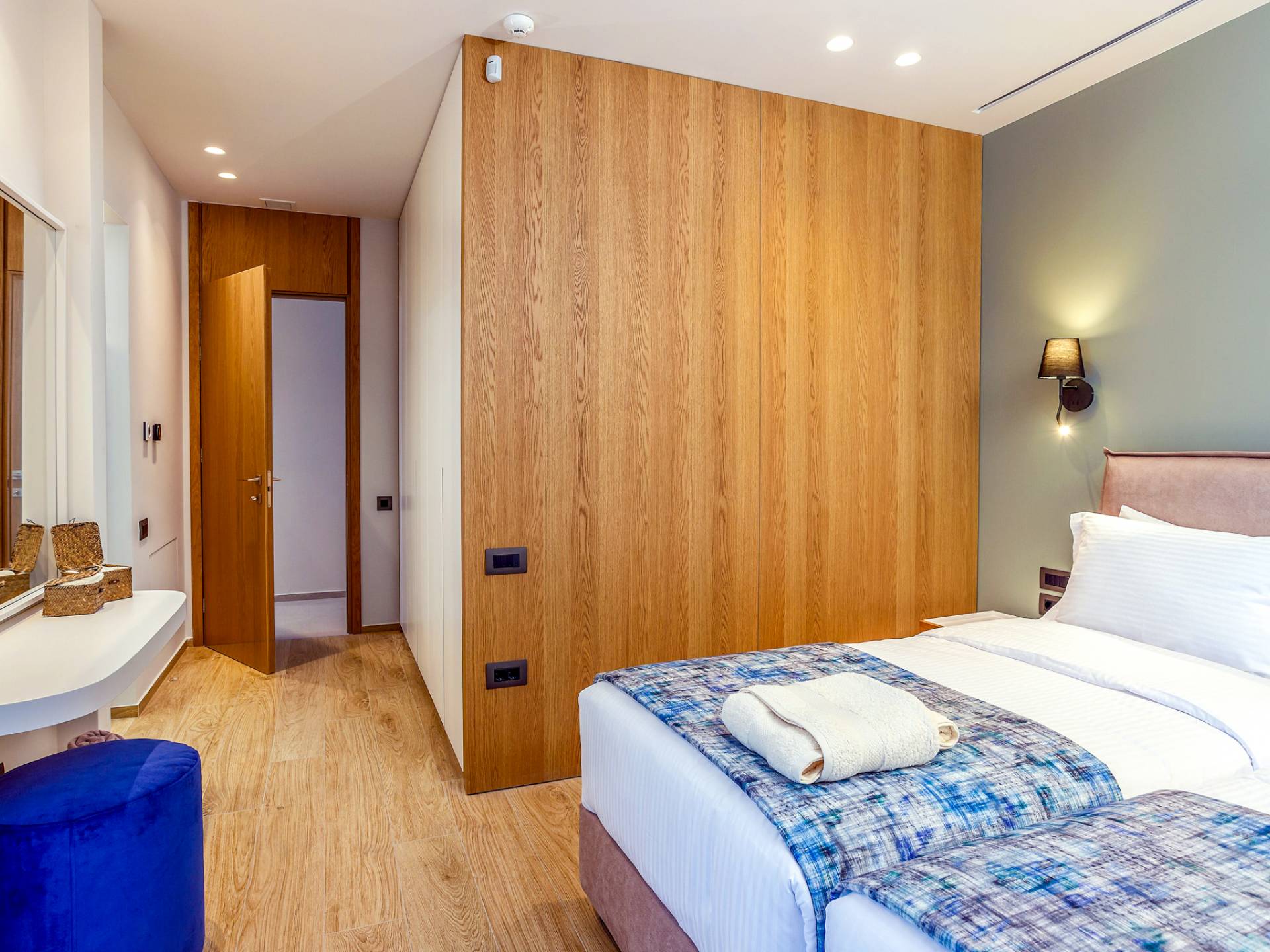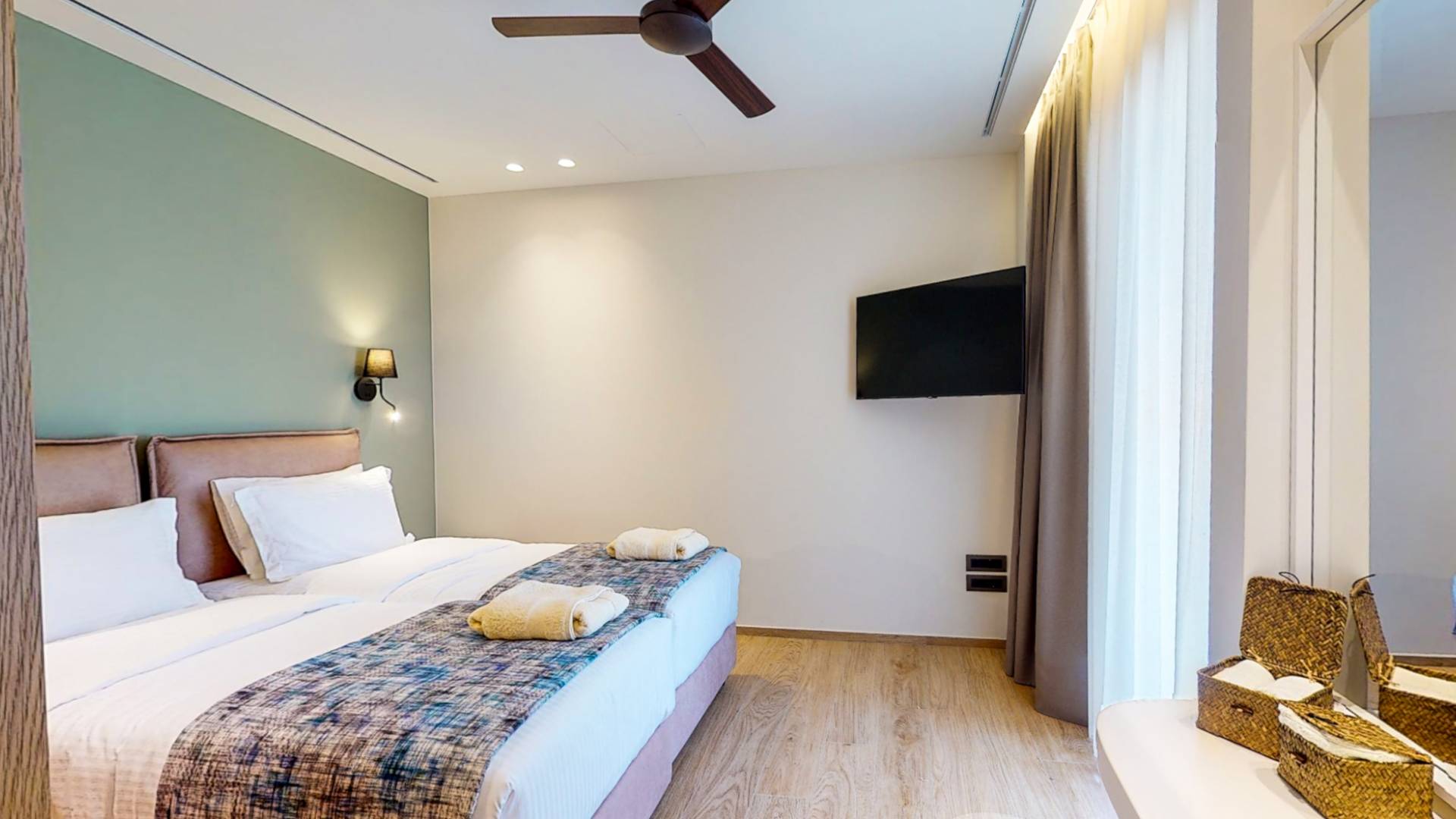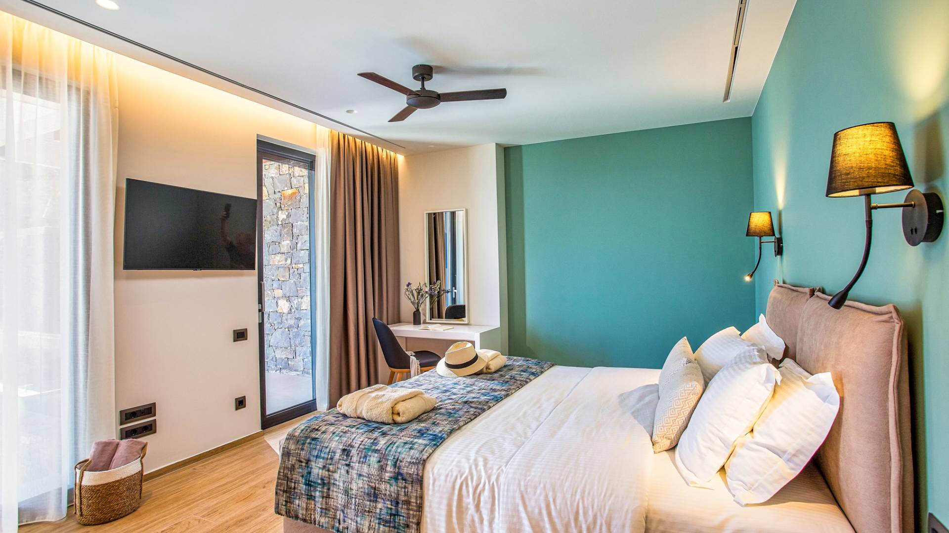 Hyperion Luxury Villa ist auf 500 m2 Fläche gebaut, bestehend aus vier Ebenen, mit direktem Zugang vom Infinity-Pool und Terrassenbereich zum Erdgeschoss mit seiner voll ausgestatteten modernen Küche mit offenem Wohn- und Sitzbereich. Es ist ein behindertengerechtes Haus und verfügt über einen modernen Aufzug, der vom Eingang im zweiten Stock der Villa aus zugänglich ist und auch zum 1. Hauptschlafzimmer führt, wo sich die Rollstuhlrampe befindet.