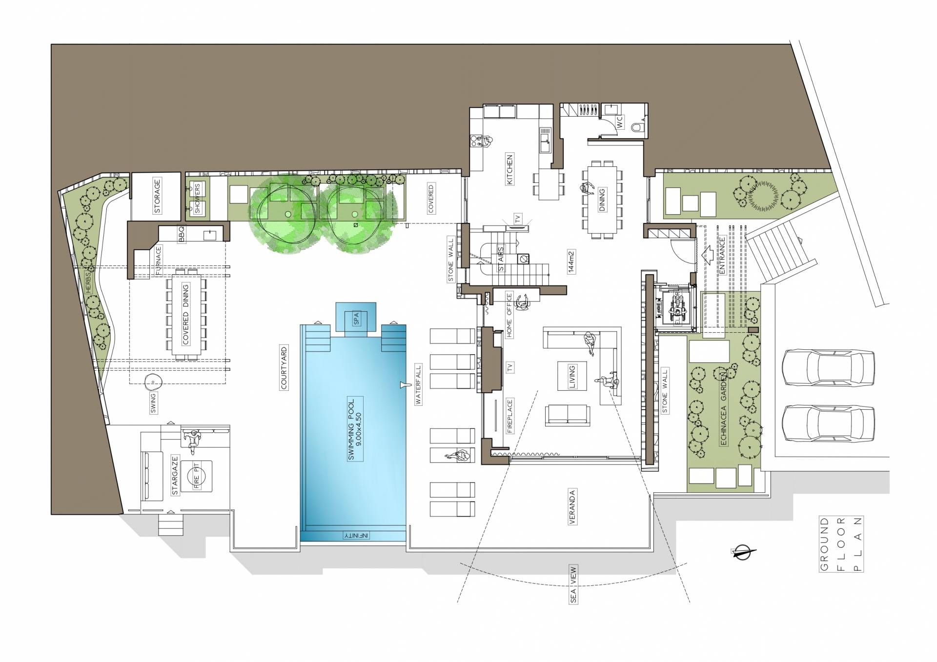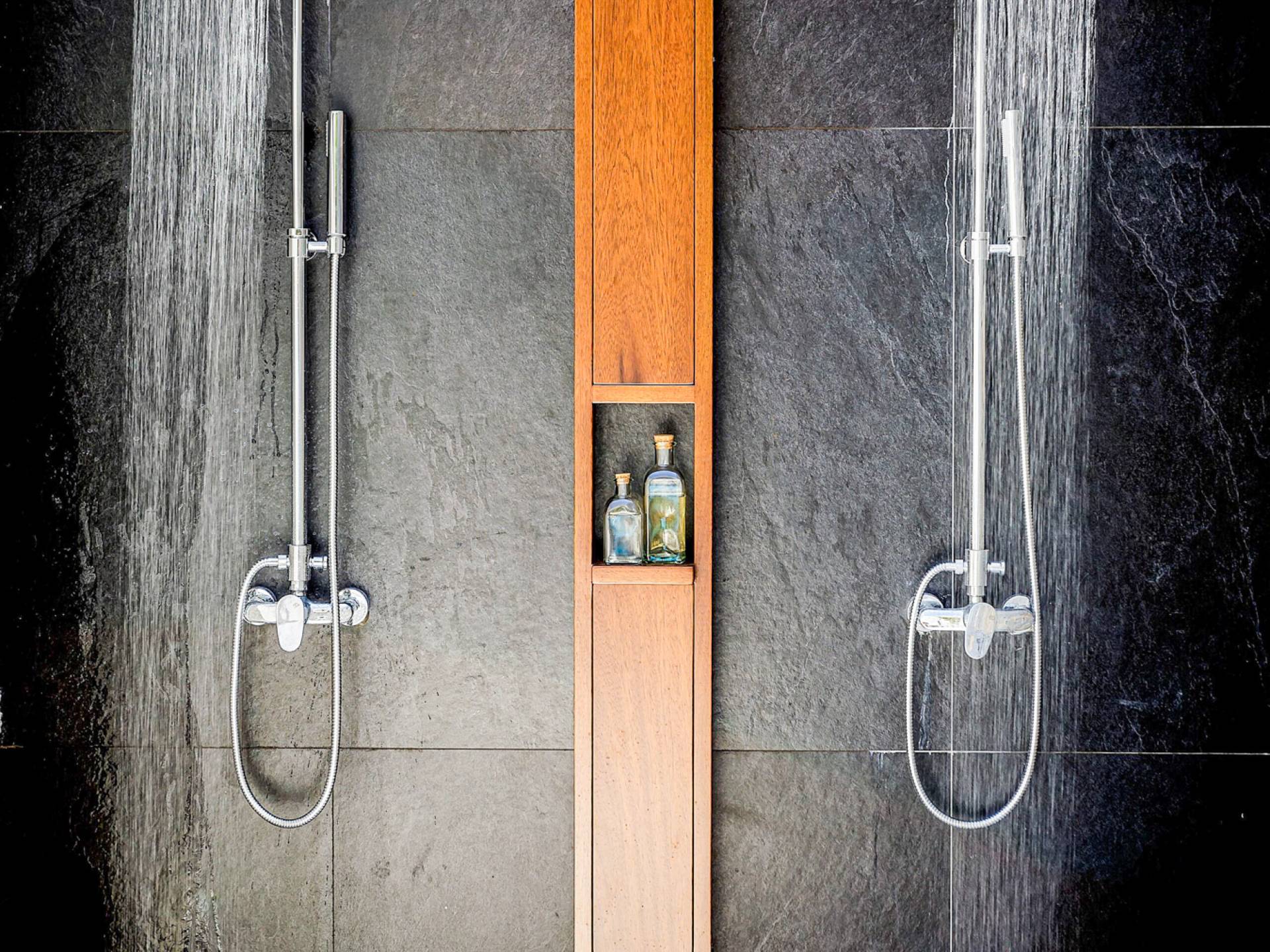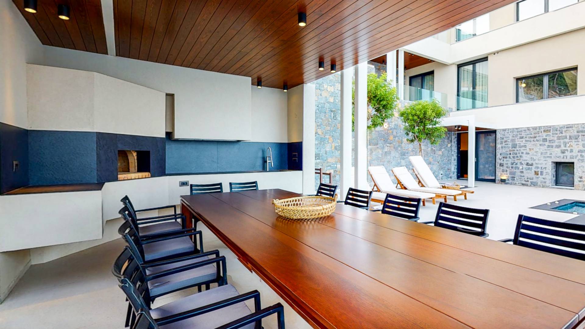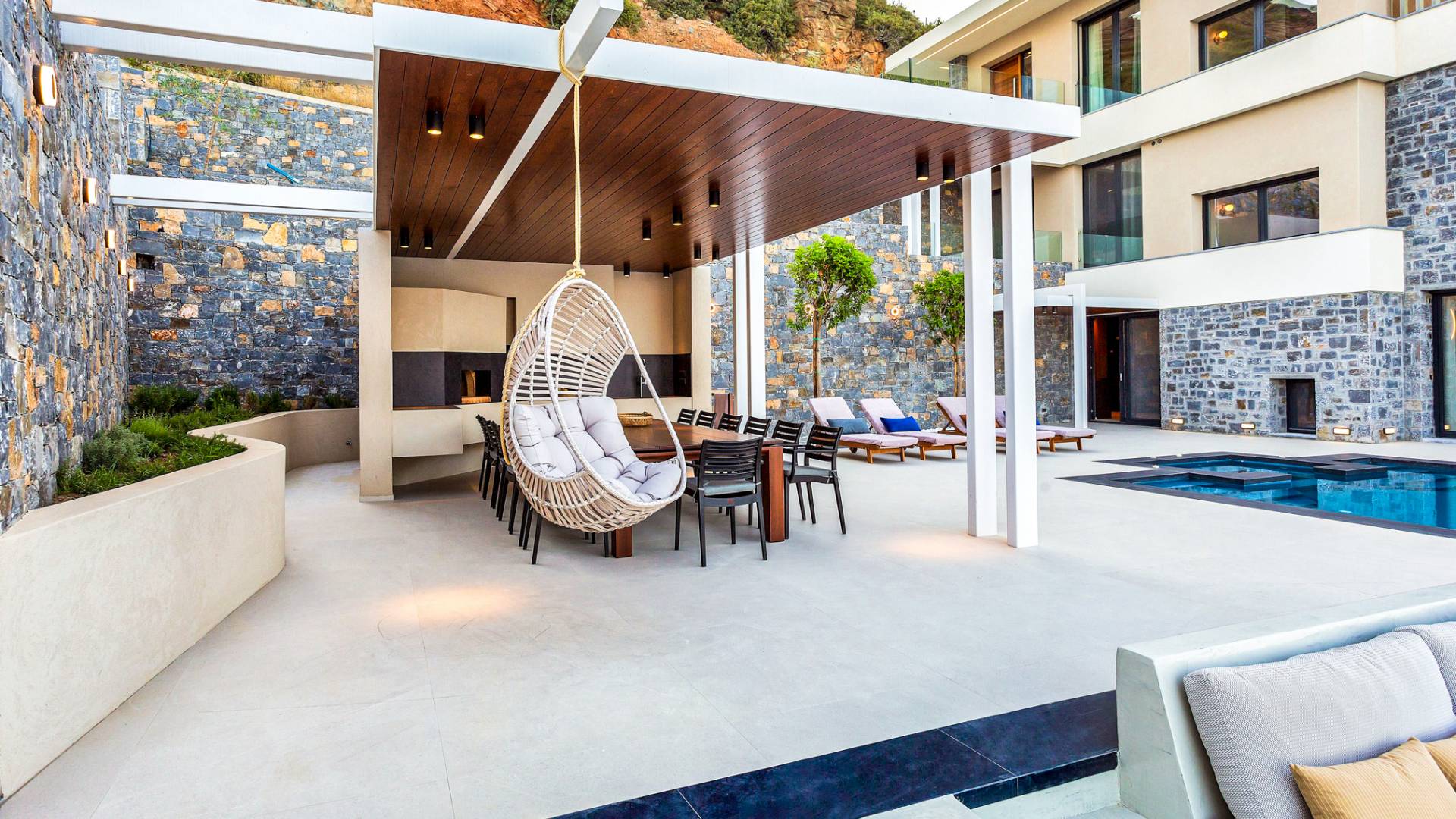 Das Highlight eines Außenbereichs ist ein 42 m² großer beheizter SPA-Infinity-Pool (Meerwasser) mit Gegenstromschwimmen, Whirlpool und Wasserfallstrahl sowie eine Feuerstelle mit Sternenblick für romantische Abende und Nächte. Es stehen Sonnenliegen, Duschen im Freien sowie eine überdachte Terrasse mit einem Klostertisch mit bis zu 16 Stühlen zur Verfügung. Schaukel und ein Barbeque-Bereich mit einem Gasgrill mit überdachter Küche vervollständigen den Essbereich im Freien.