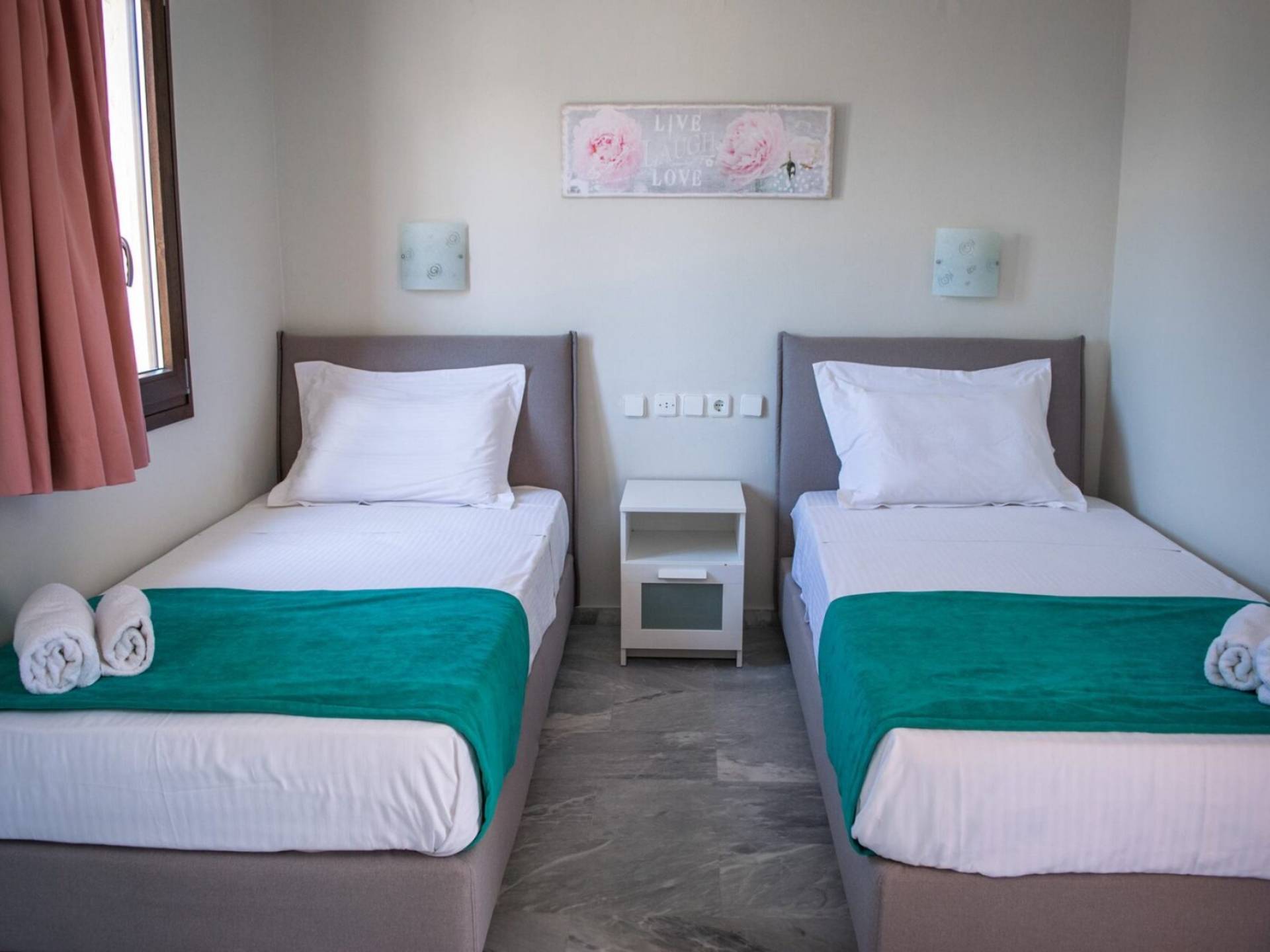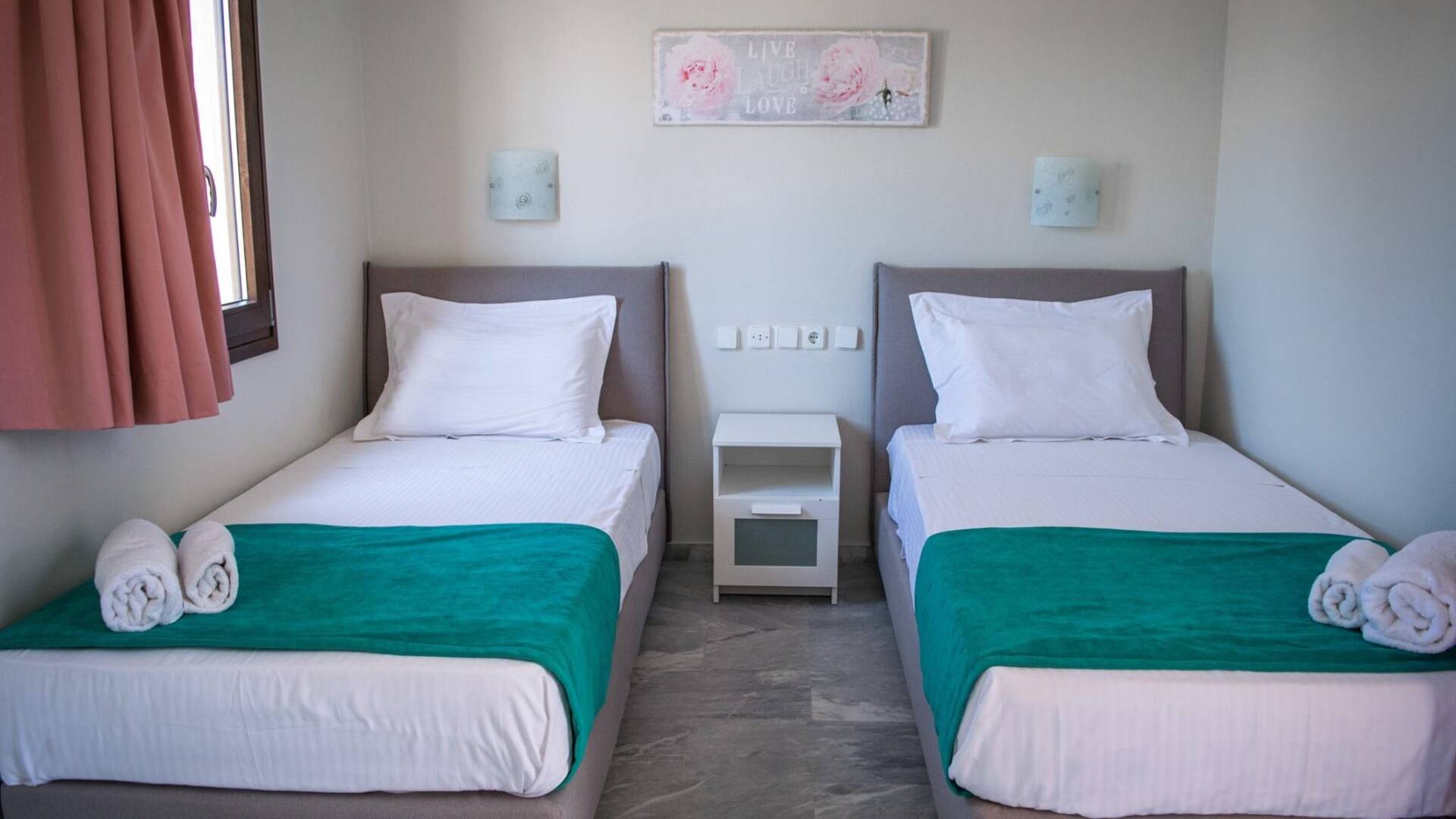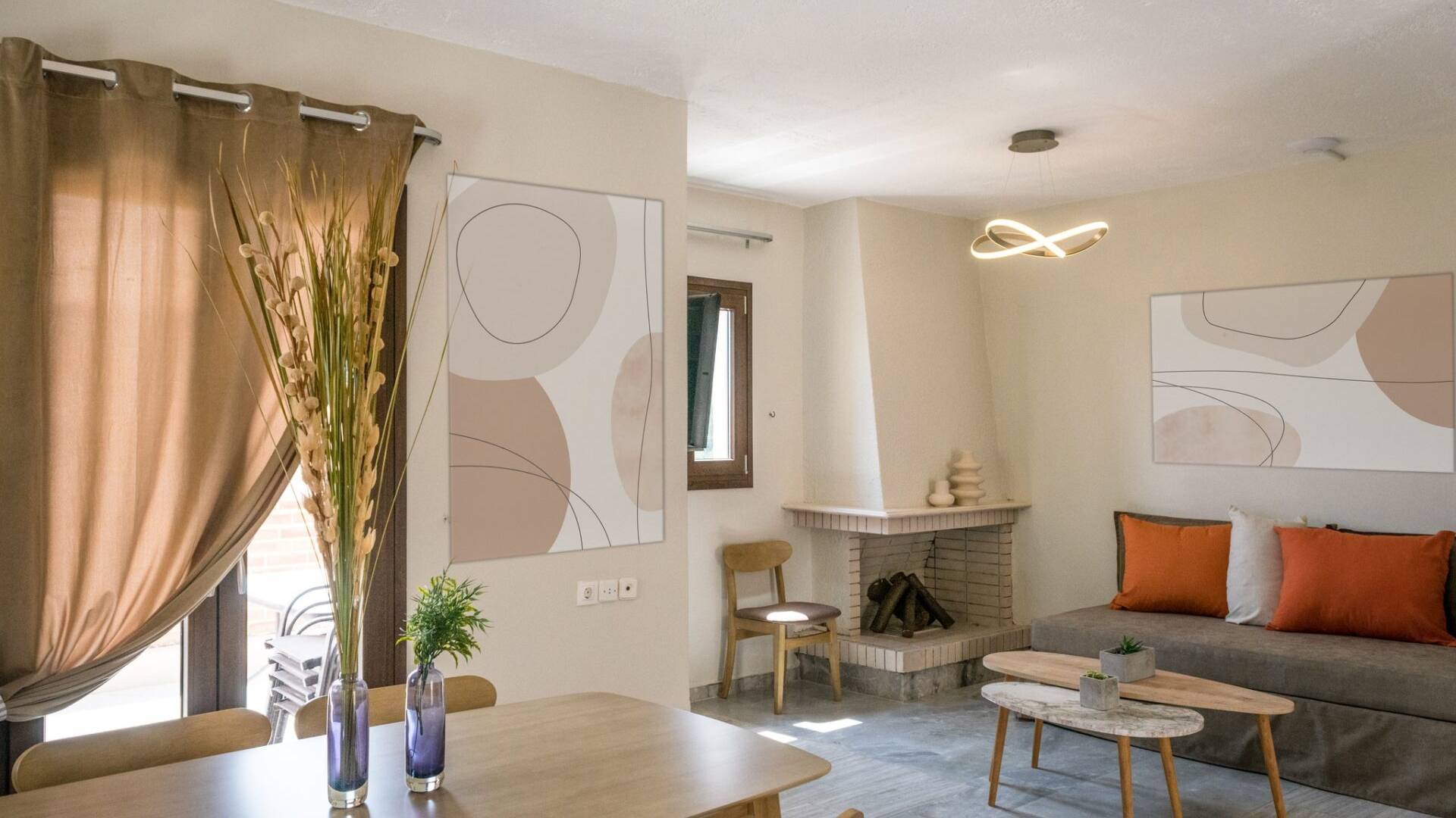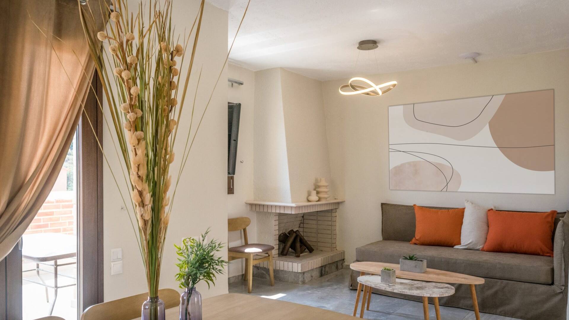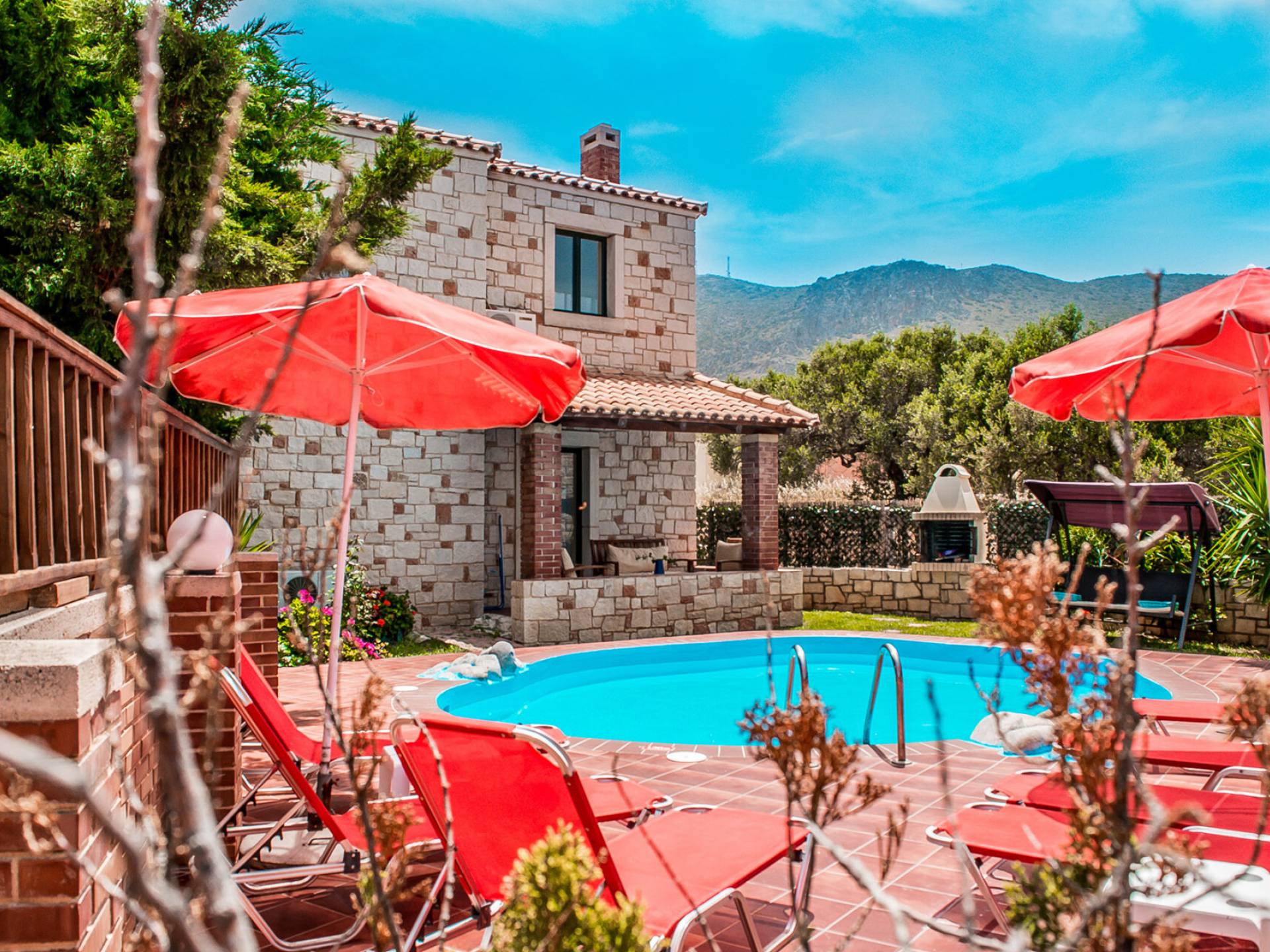 Villa Amfitriti bietet 2 Schlafzimmer mit je einem Doppelbett, 1 Schlafzimmer mit zwei Einzelbetten und ein Badezimmer im ersten Stock und 1 Schlafzimmer mit zwei Einzelbetten, Küche mit offenem Wohnzimmer, WC und Kamin im Erdgeschoss. Amfitriti bietet Platz für bis zu 8 Personen.
