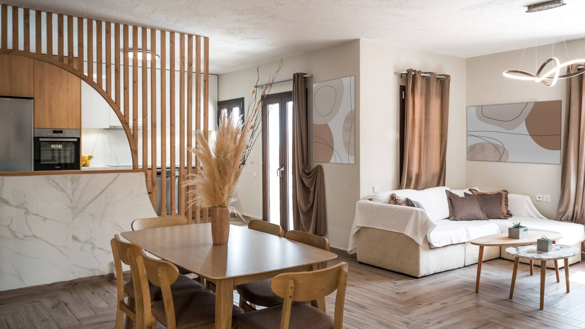 Villa Aktea bietet Platz für bis zu 6 Personen. Es besteht aus 1 Schlafzimmer mit Doppelbett und eigenem Bad, 1 Schlafzimmer mit 2 Einzelbetten und einem Badezimmer im ersten Stock. Im Erdgeschoss liegt 1 Schlafzimmer mit Doppelbett, Küche mit offenem Wohnzimmer, WC und Kamin. Ein Holzofen wird auch im Garten angeboten.