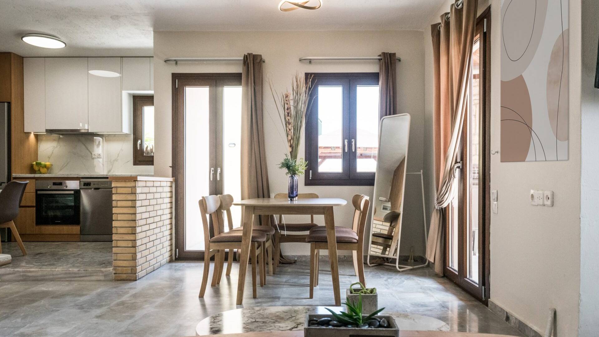 Villa Thetis bietet 1 Schlafzimmer mit Doppelbett und eigenem Bad, 1 Schlafzimmer mit zwei Einzelbetten und ein Badezimmer im ersten Stock und 1 Schlafzimmer mit Doppelbett, Küche mit offenem Wohnzimmer, WC und Kamin im Erdgeschoss. Thetis bietet Platz für bis zu 6 Personen.